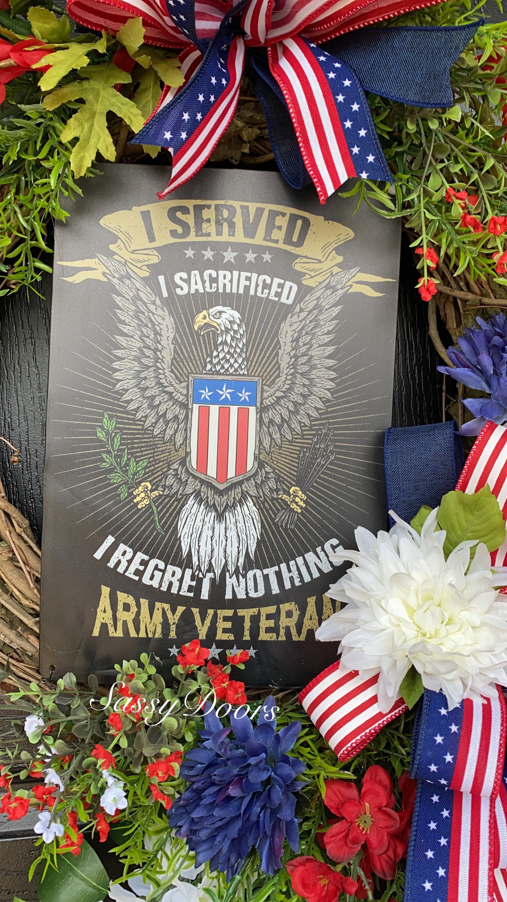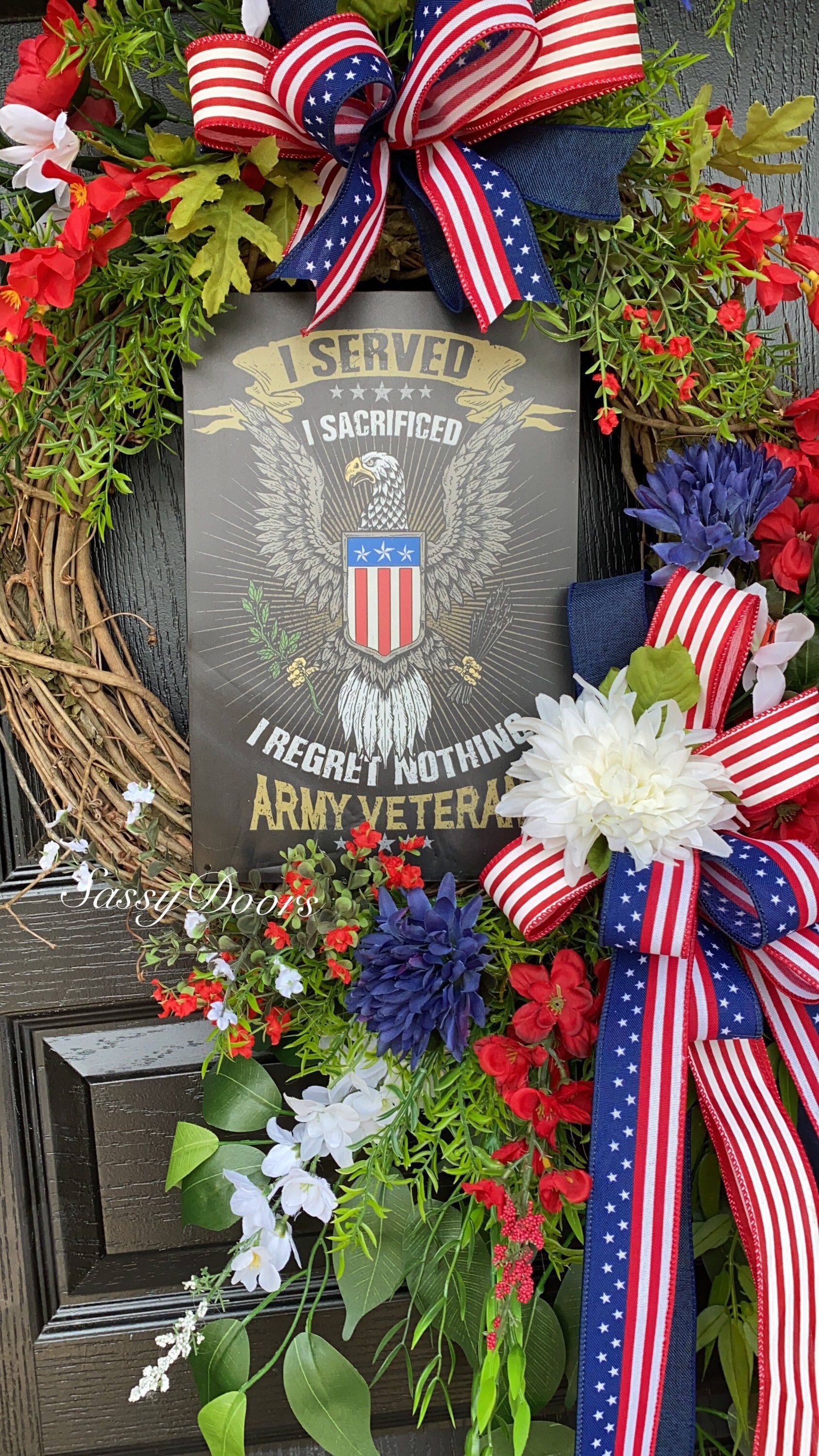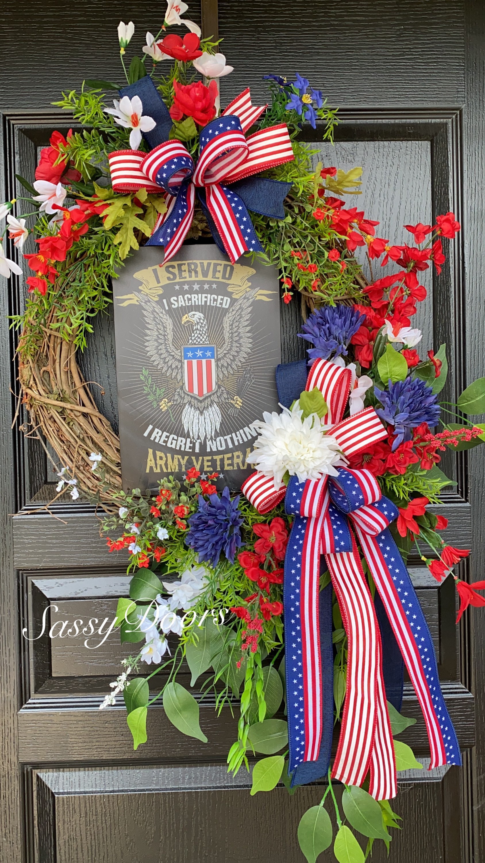 Designed on a 18” grapevine twig wreath Accented with a metal veteran sign. Nestled in lush greenery and tiny white flowers. Layer with beautiful patriotic ribbons which will make it pop off your door! This wreath is sure to please your guest.
