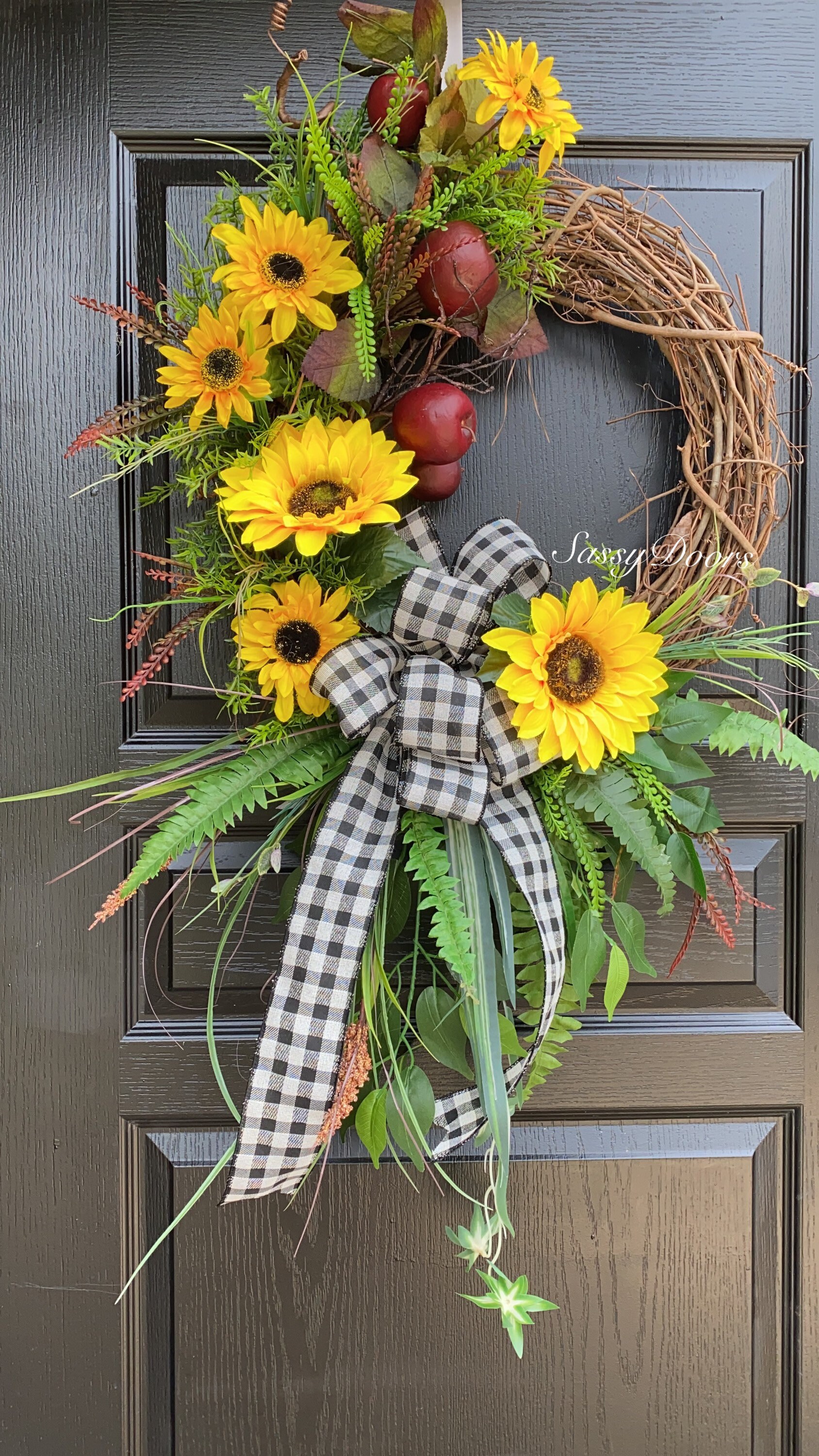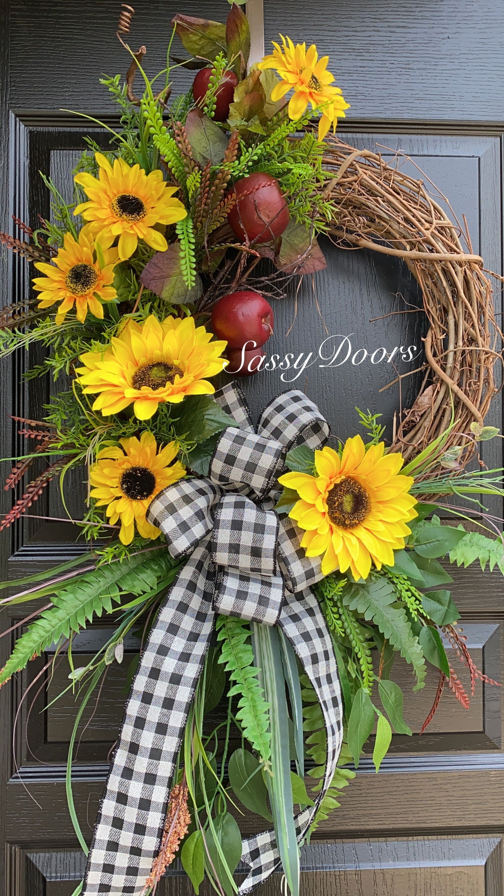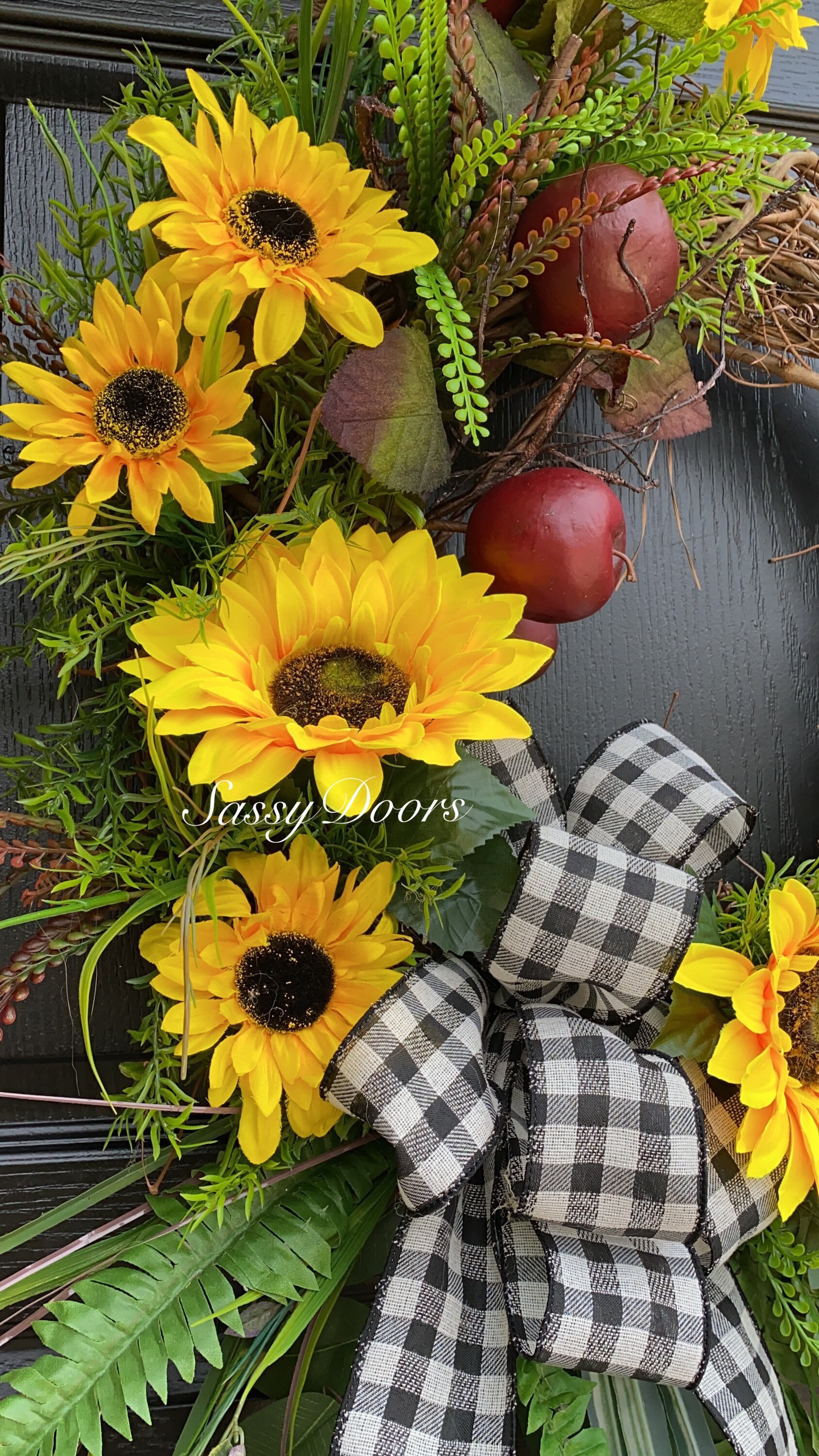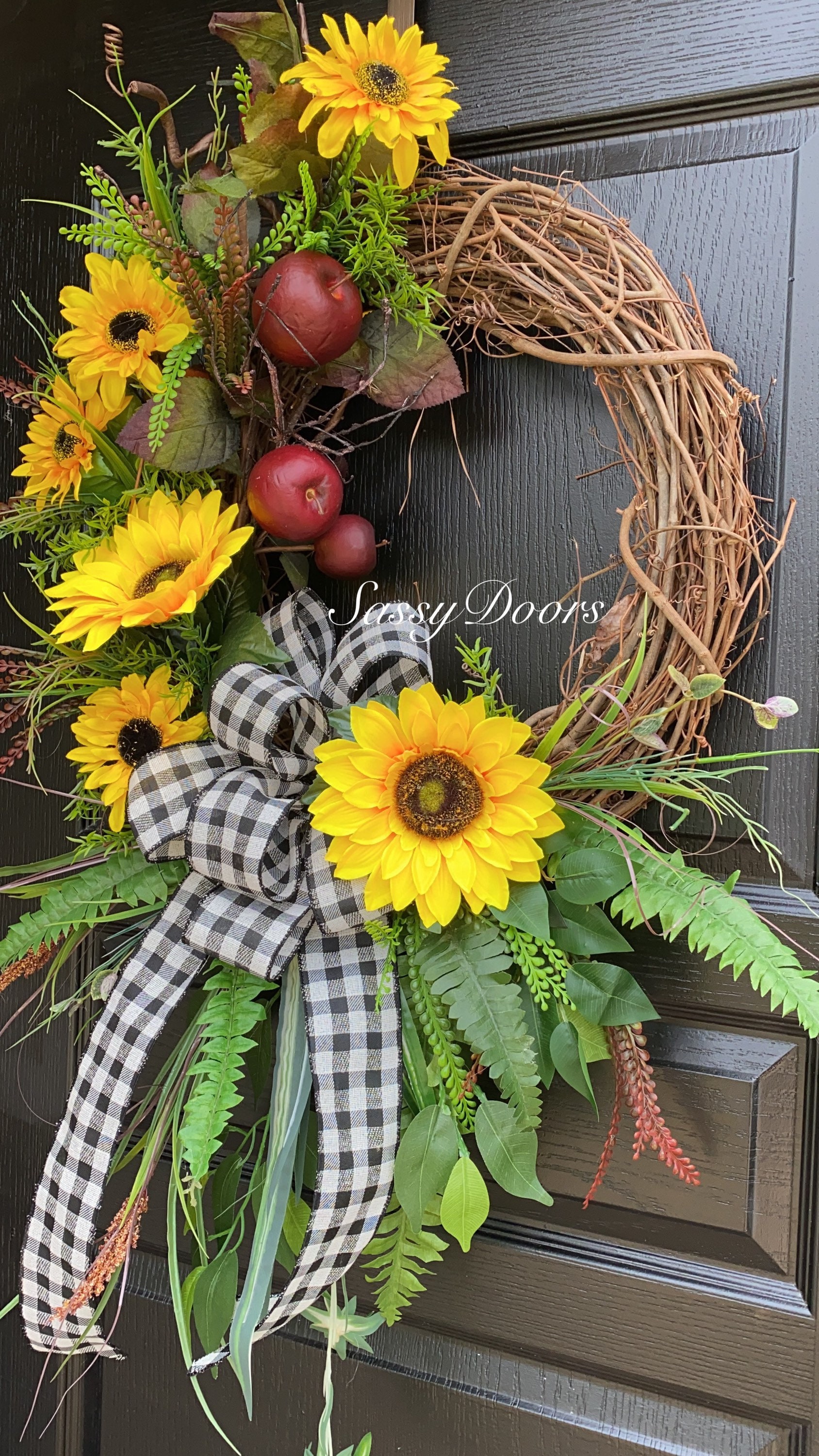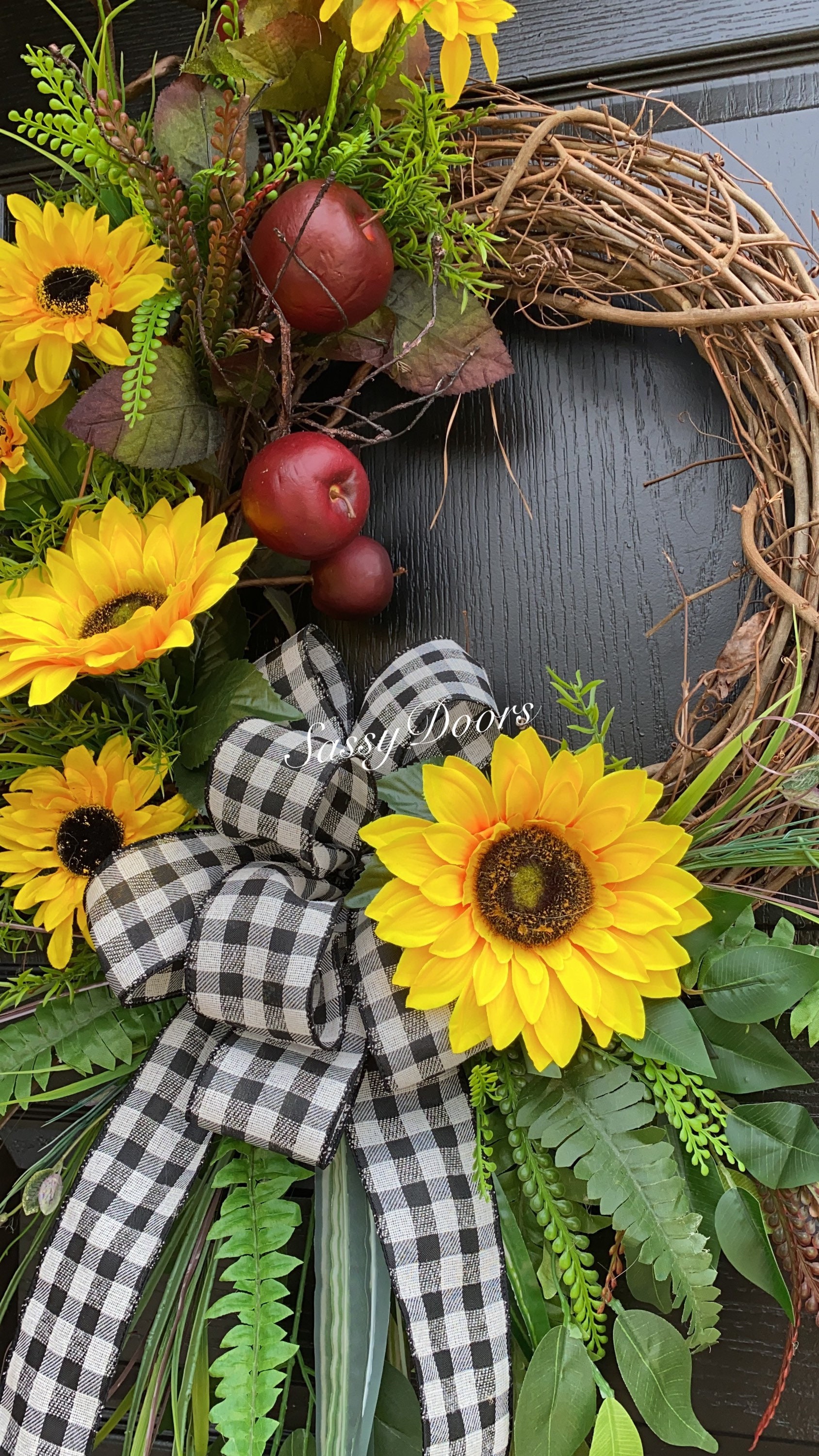 Designed on a 18" grapevine wreath and adorned with red apples. Accented with a assortment of greenery, sunflowers and so much more.