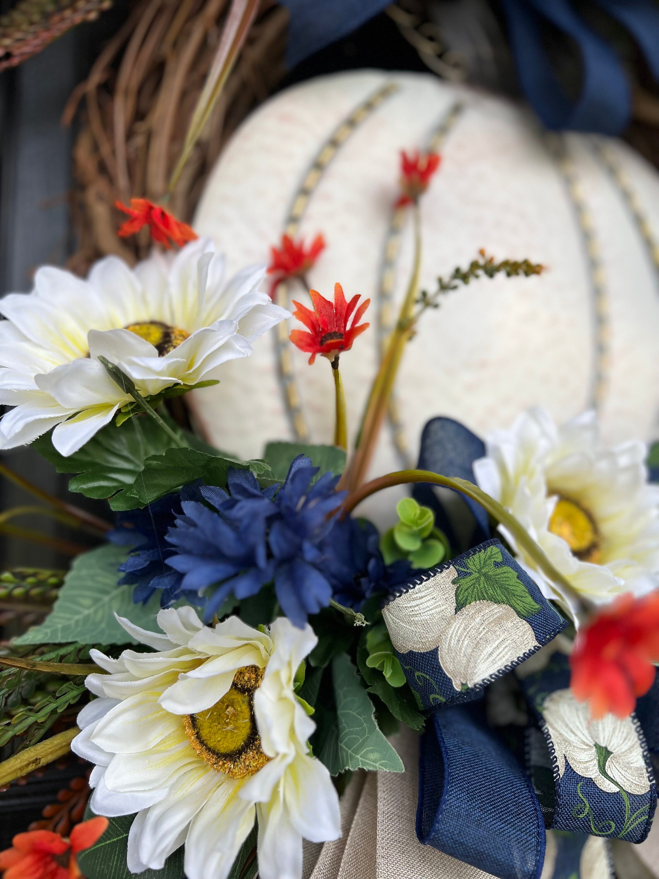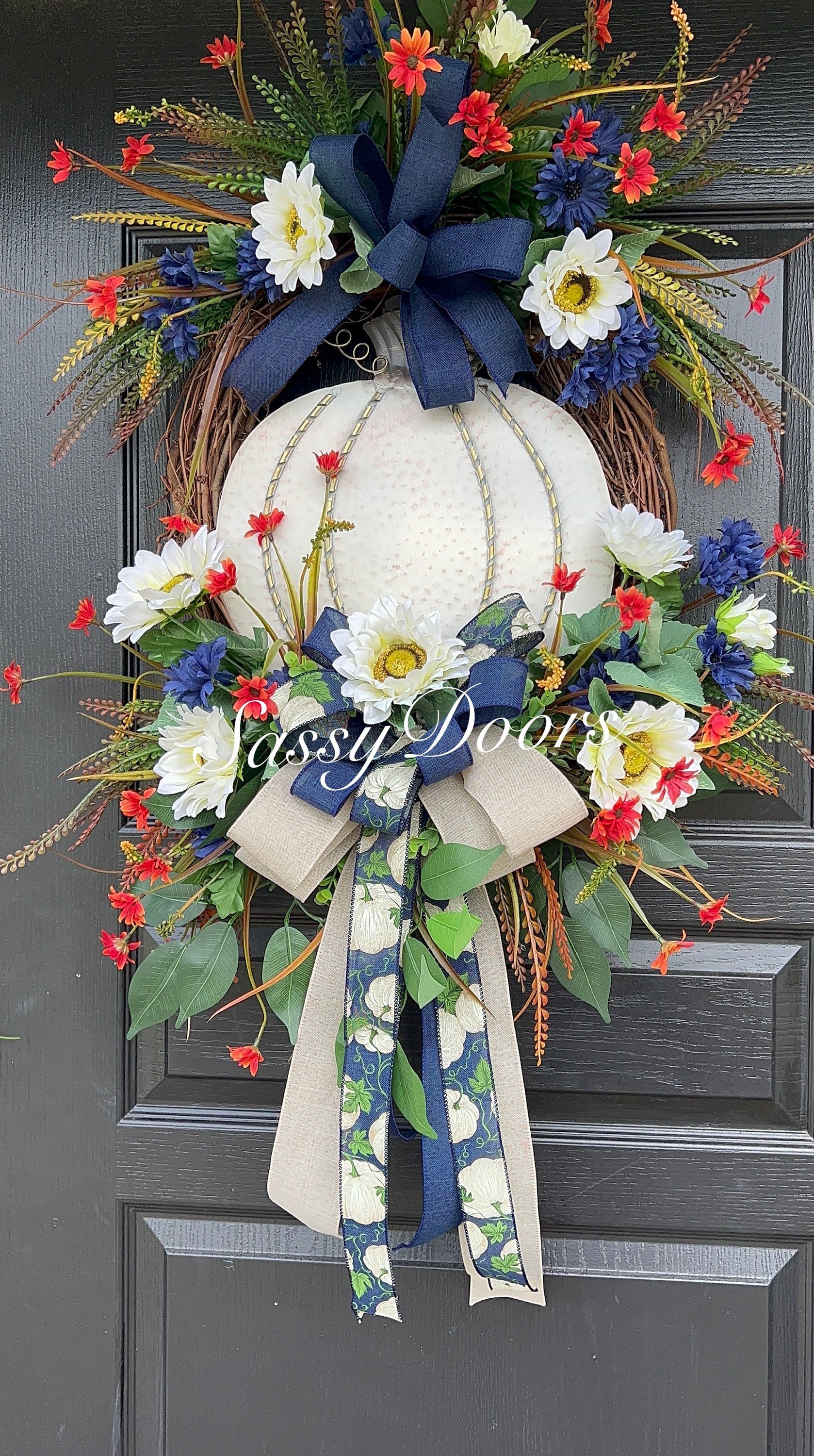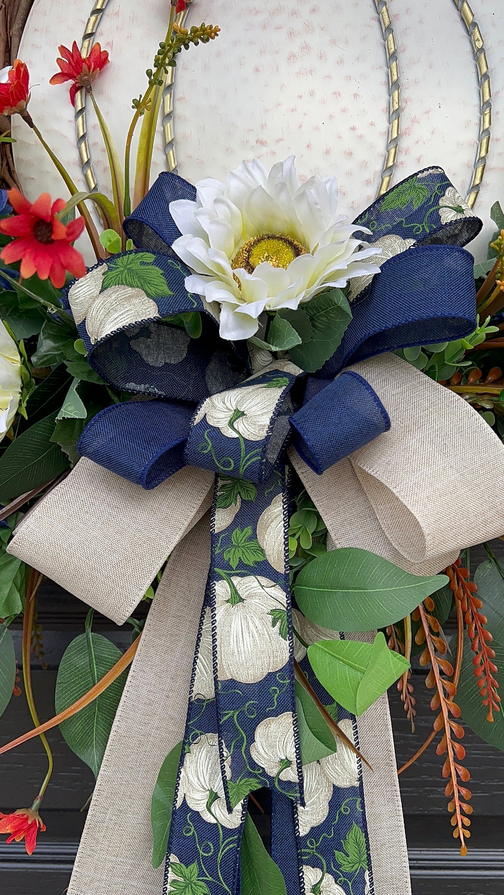 The variety of navy blue ribbon accented with cream pumpkins is so striking!