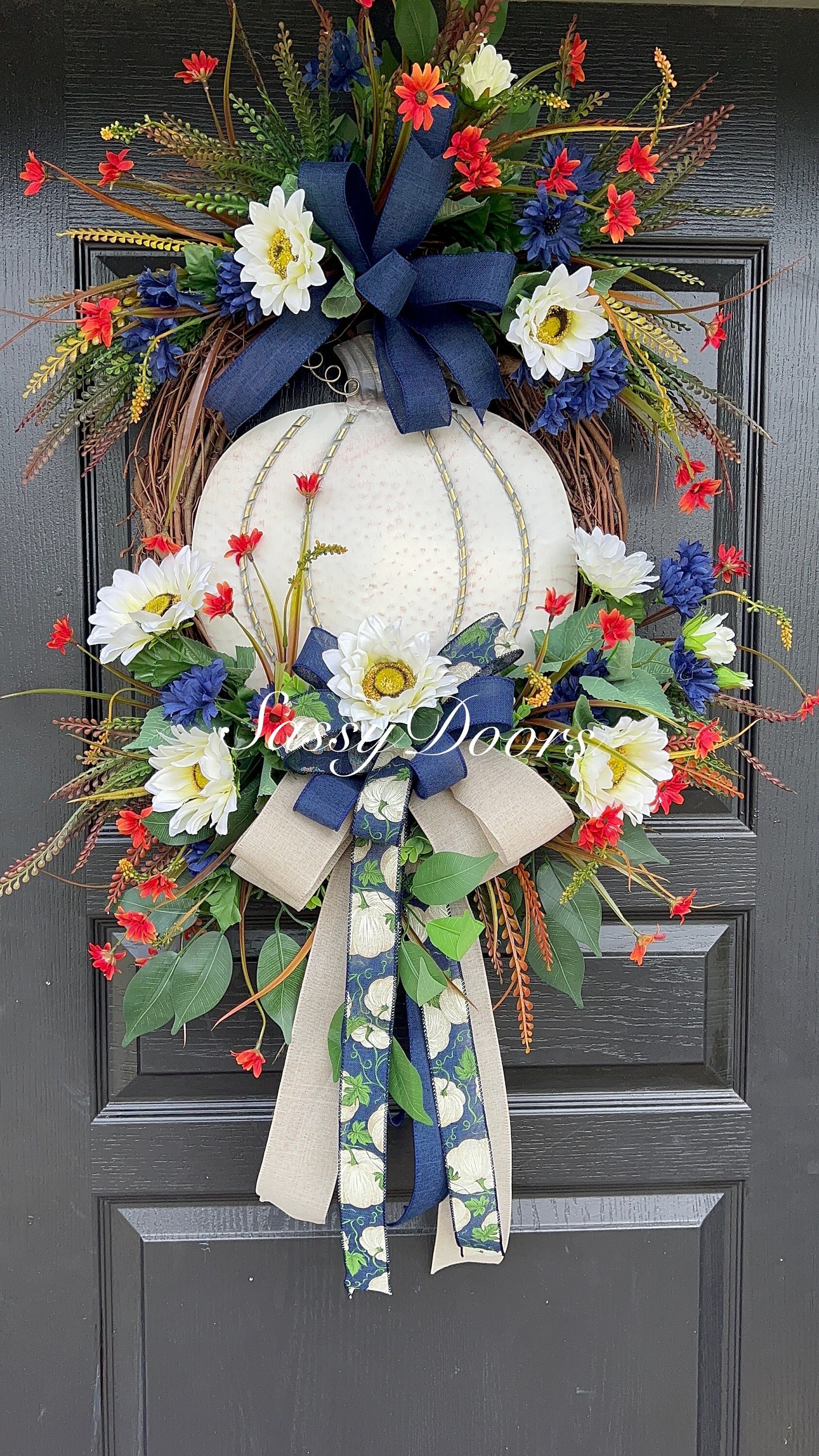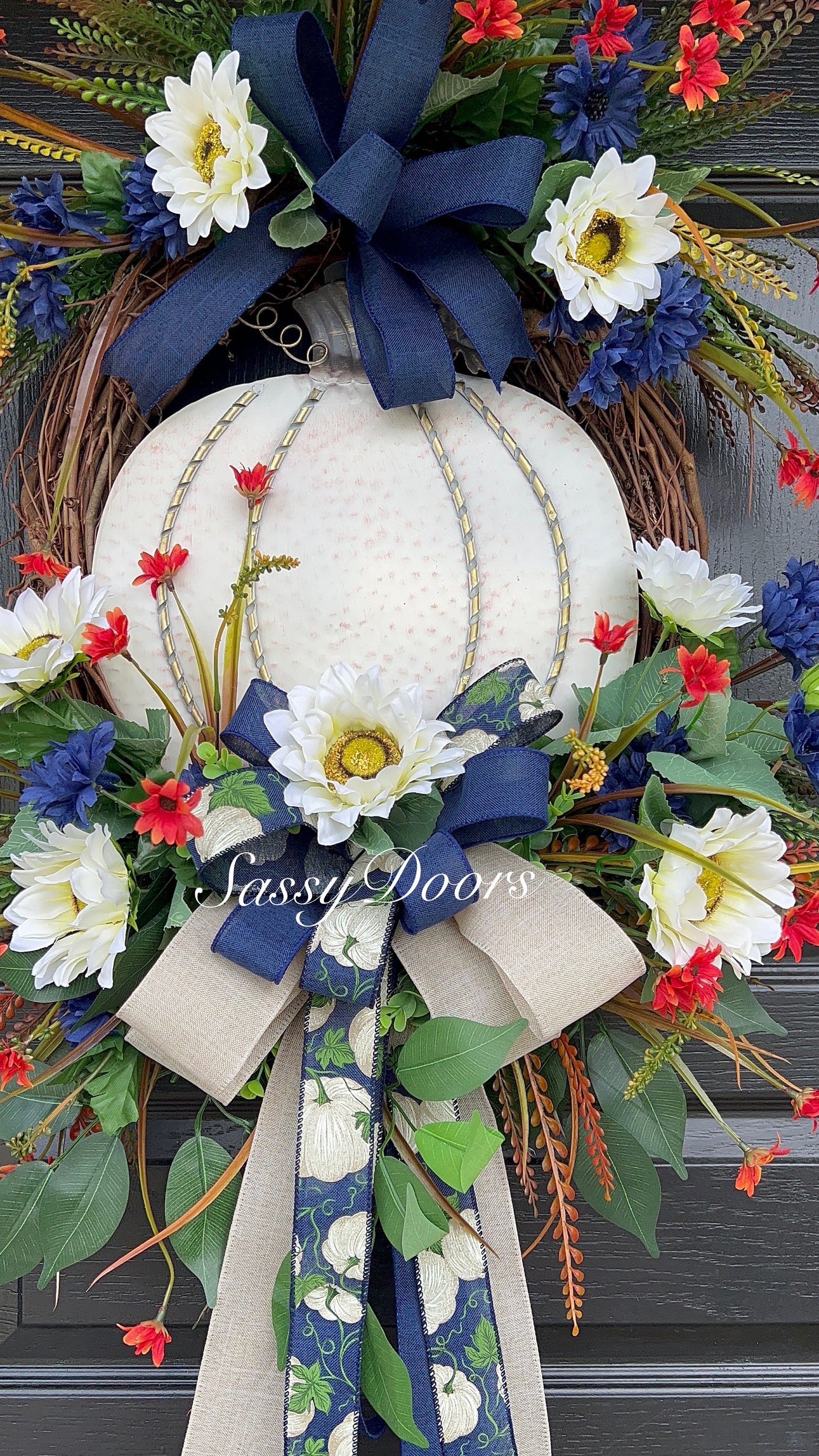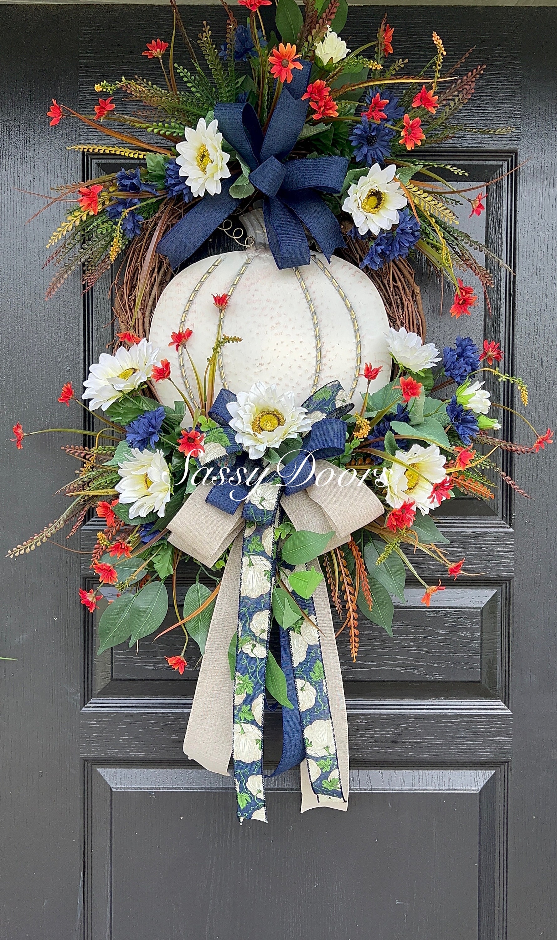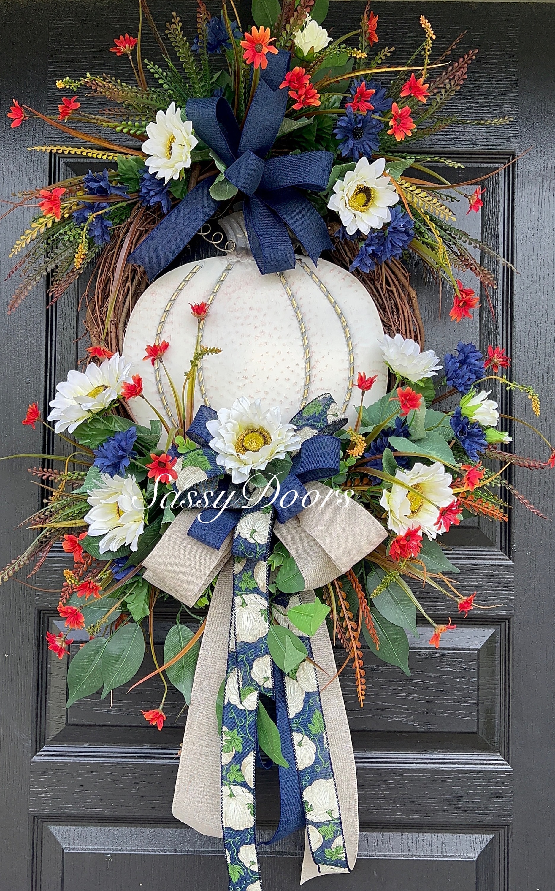 The variety of navy blue ribbon accented with cream pumpkins is so striking!