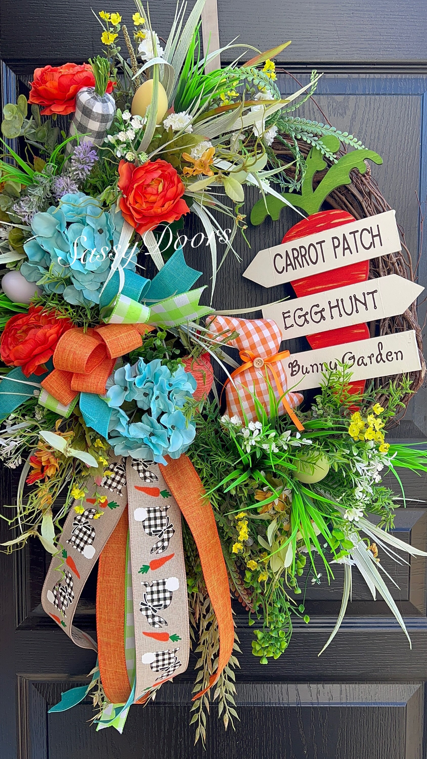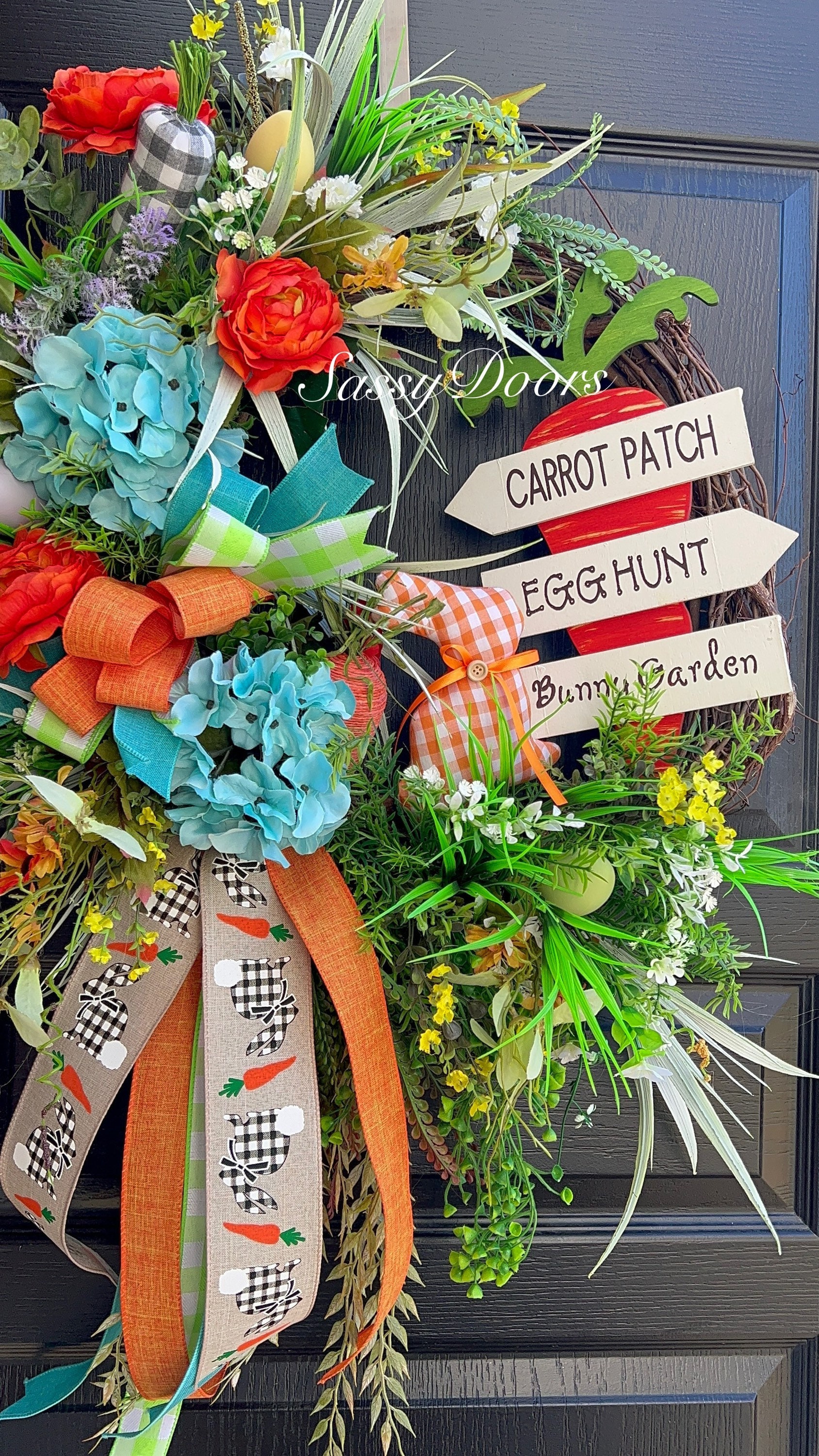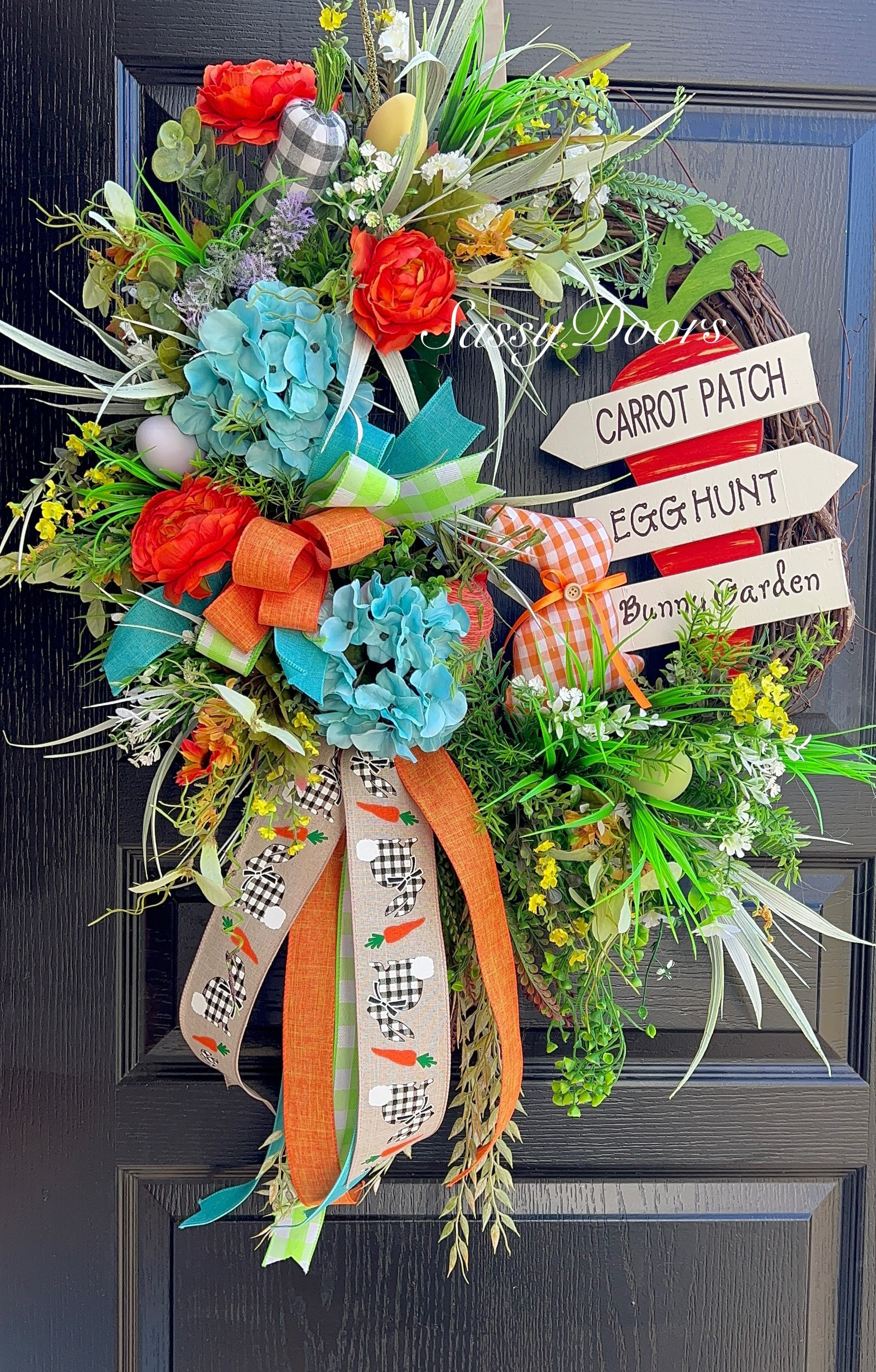 Accented with a variety of greenery and a tiny bit of blue hydrangea for a bit of color, plaid Easter bunny, Easter eggs, carrots and many other seasonal favorites.