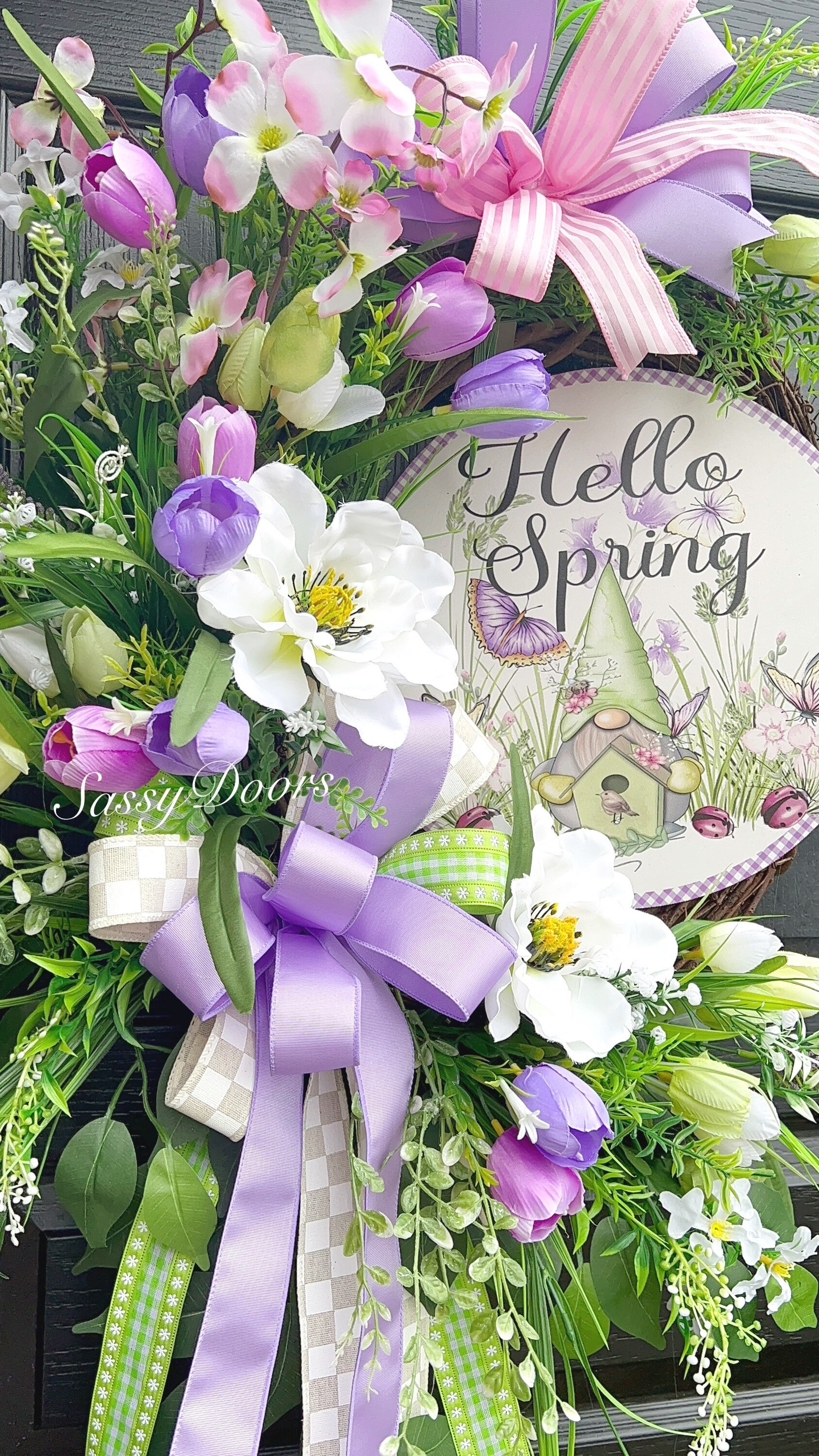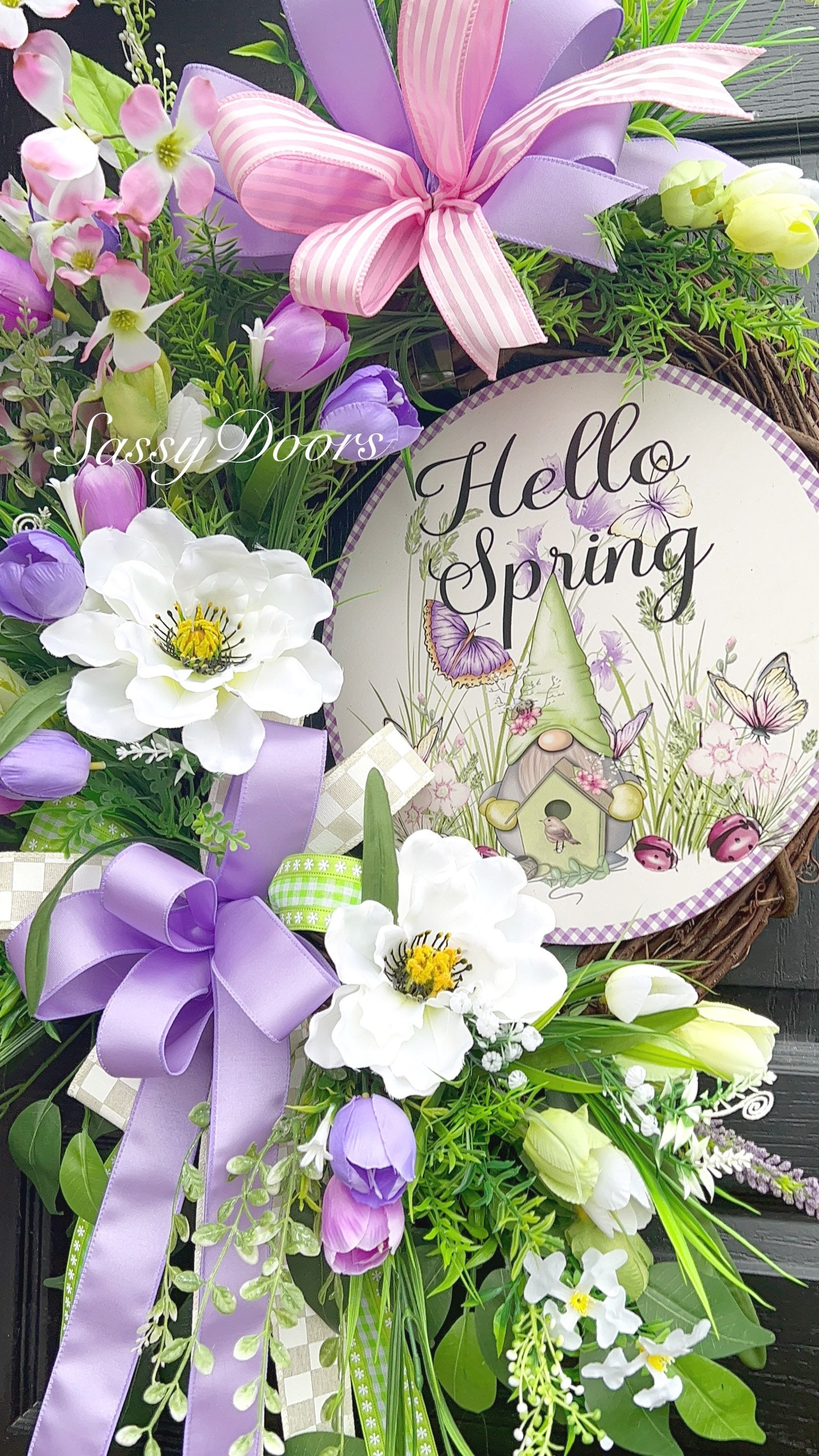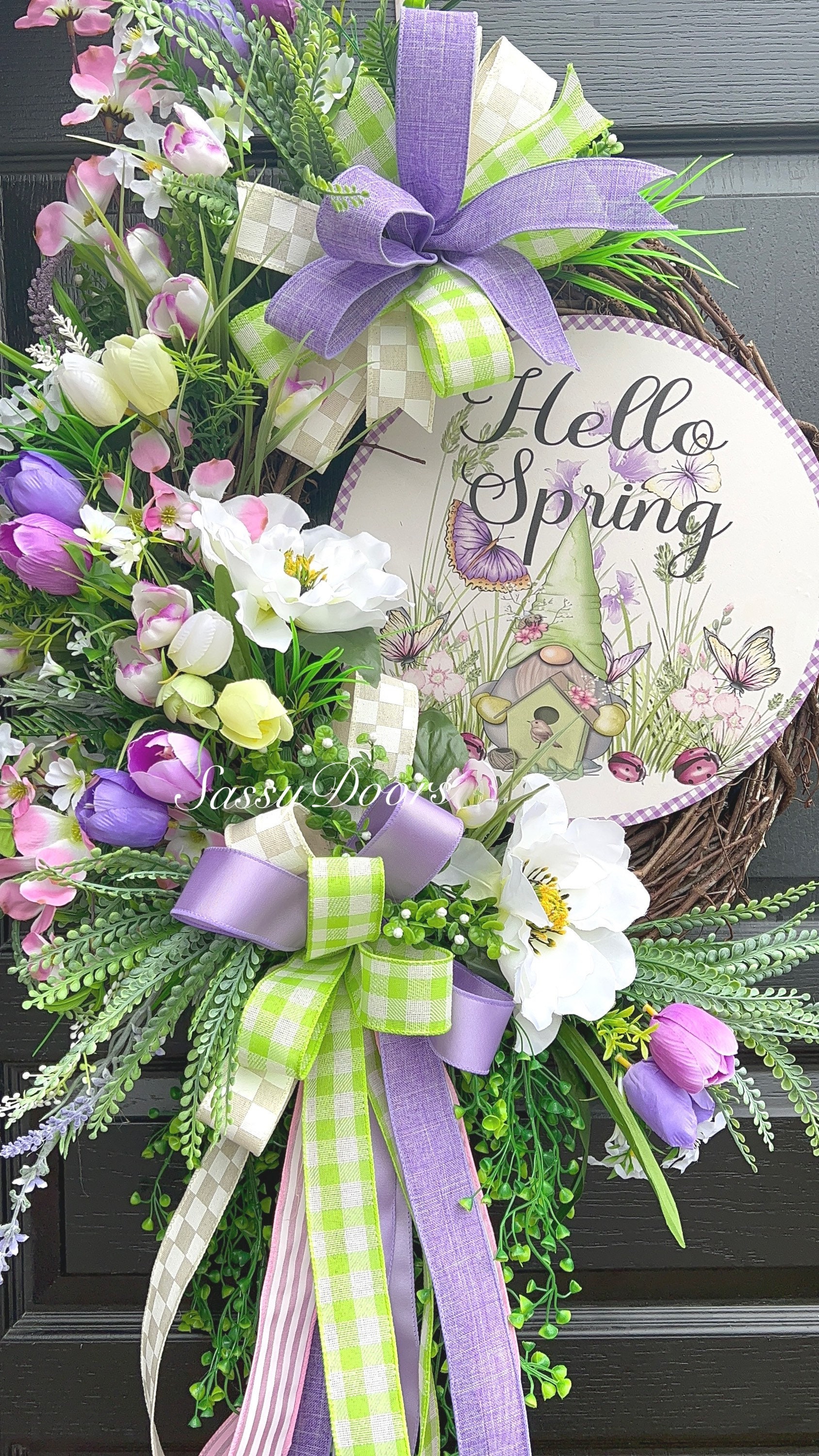 Welcome your family and friends with this stunning and colorful spring gnome tulip Wreath for your Front Door!