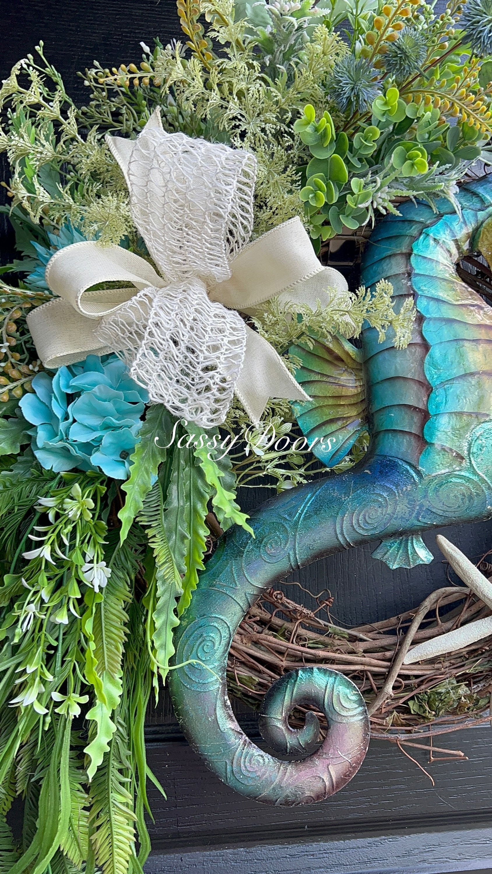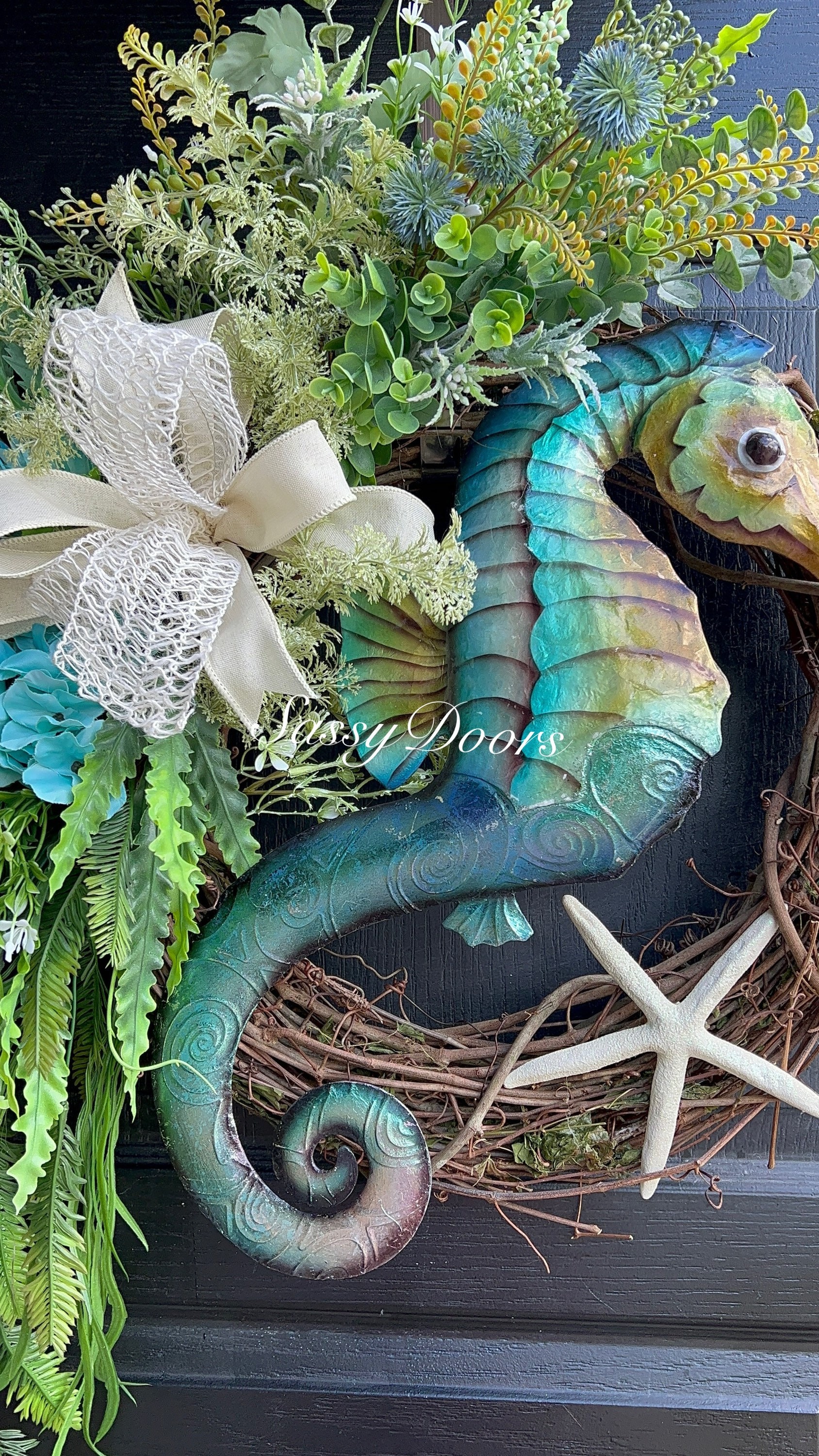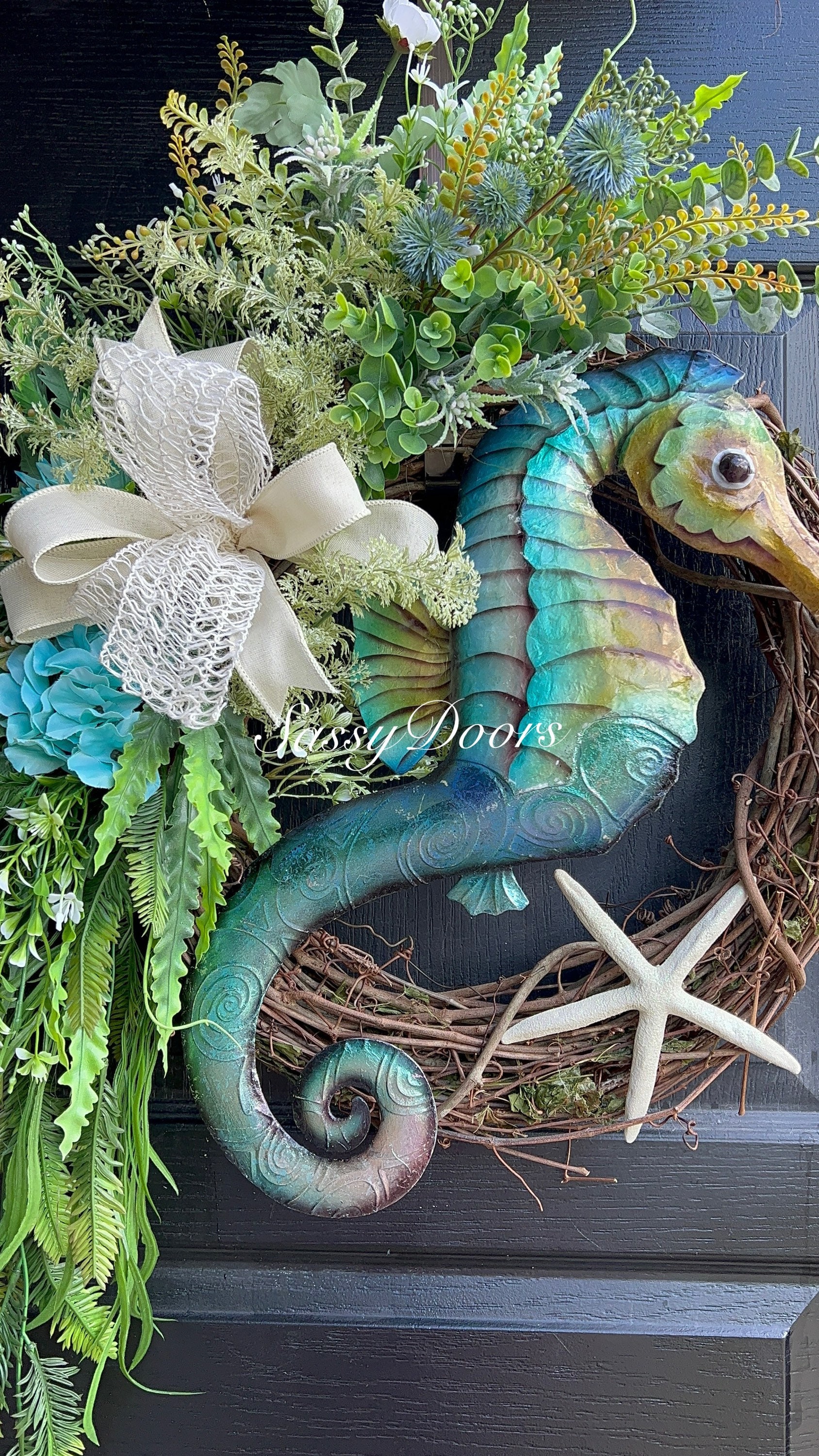 Beautifully designed on a 18” grapevine wreath and accented with a beautiful metal colorful seahorse, a starfish, blue hydrangea and many coastal greenery favorites.