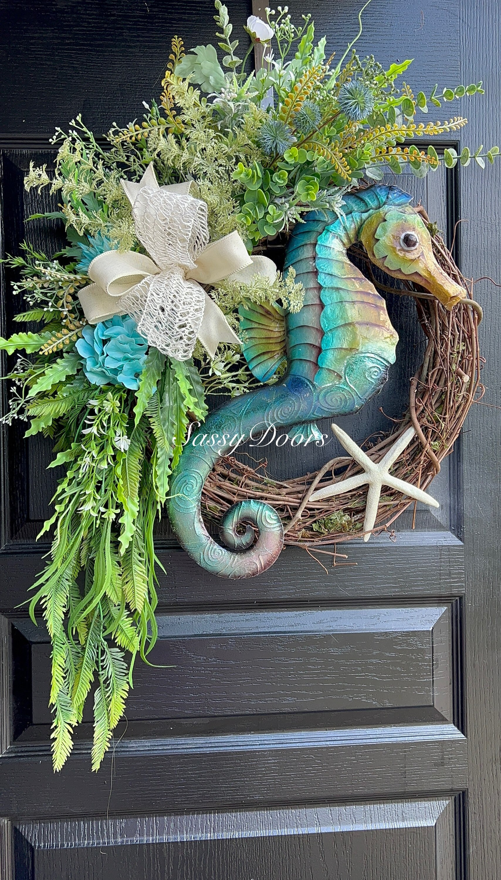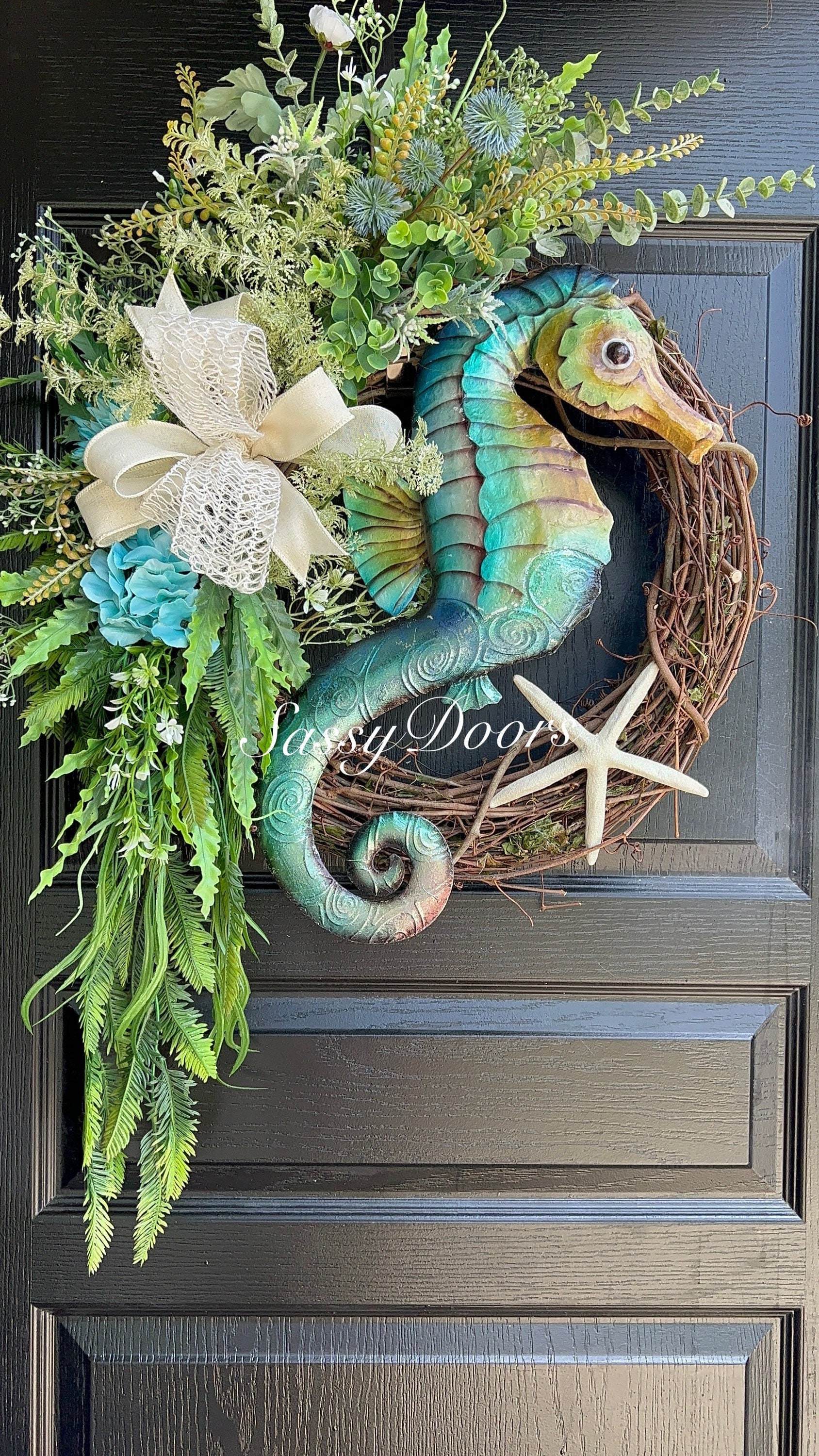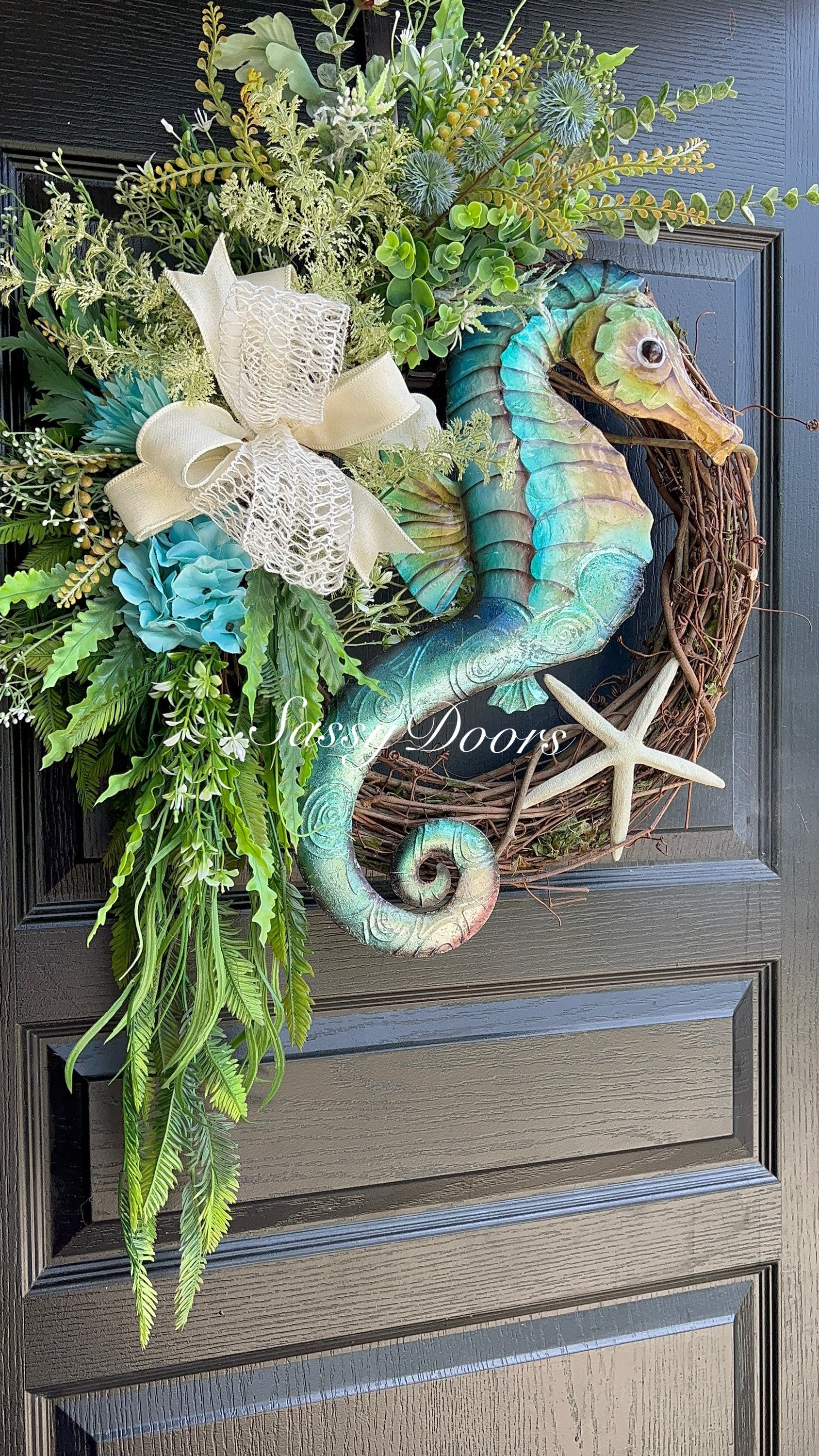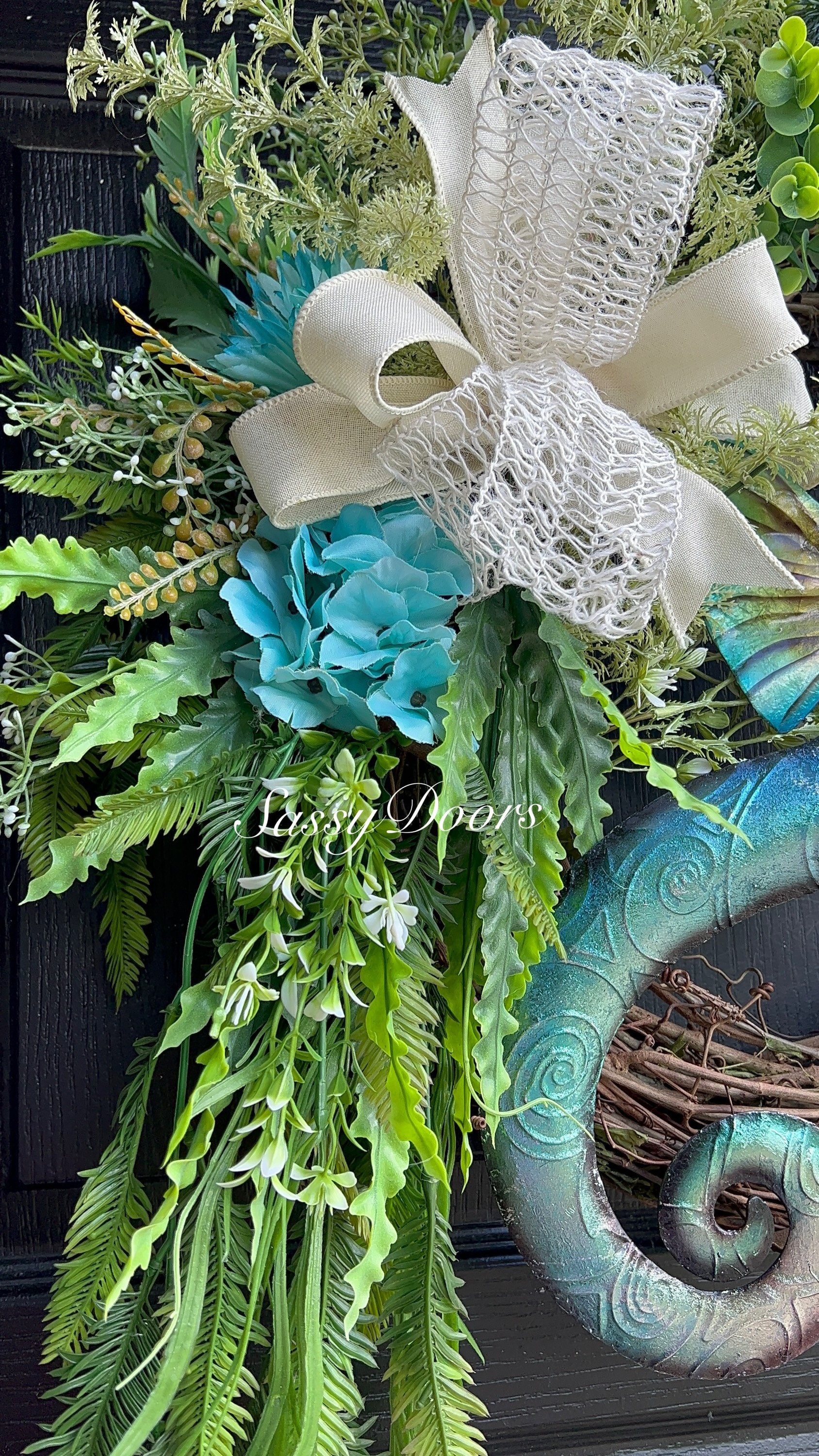 Beautifully designed on a 18” grapevine wreath and accented with a beautiful metal colorful seahorse, a starfish, blue hydrangea and many coastal greenery favorites.