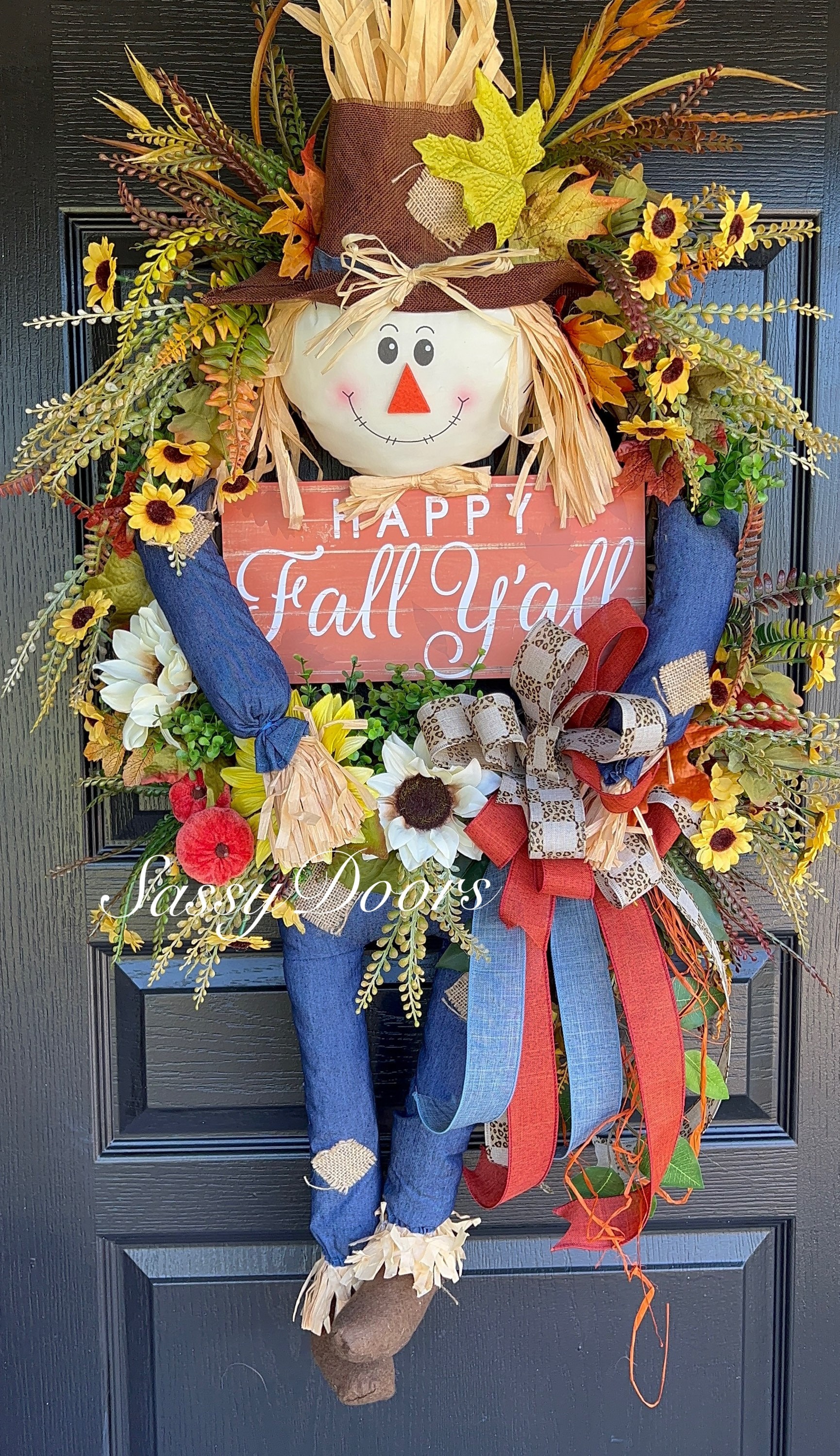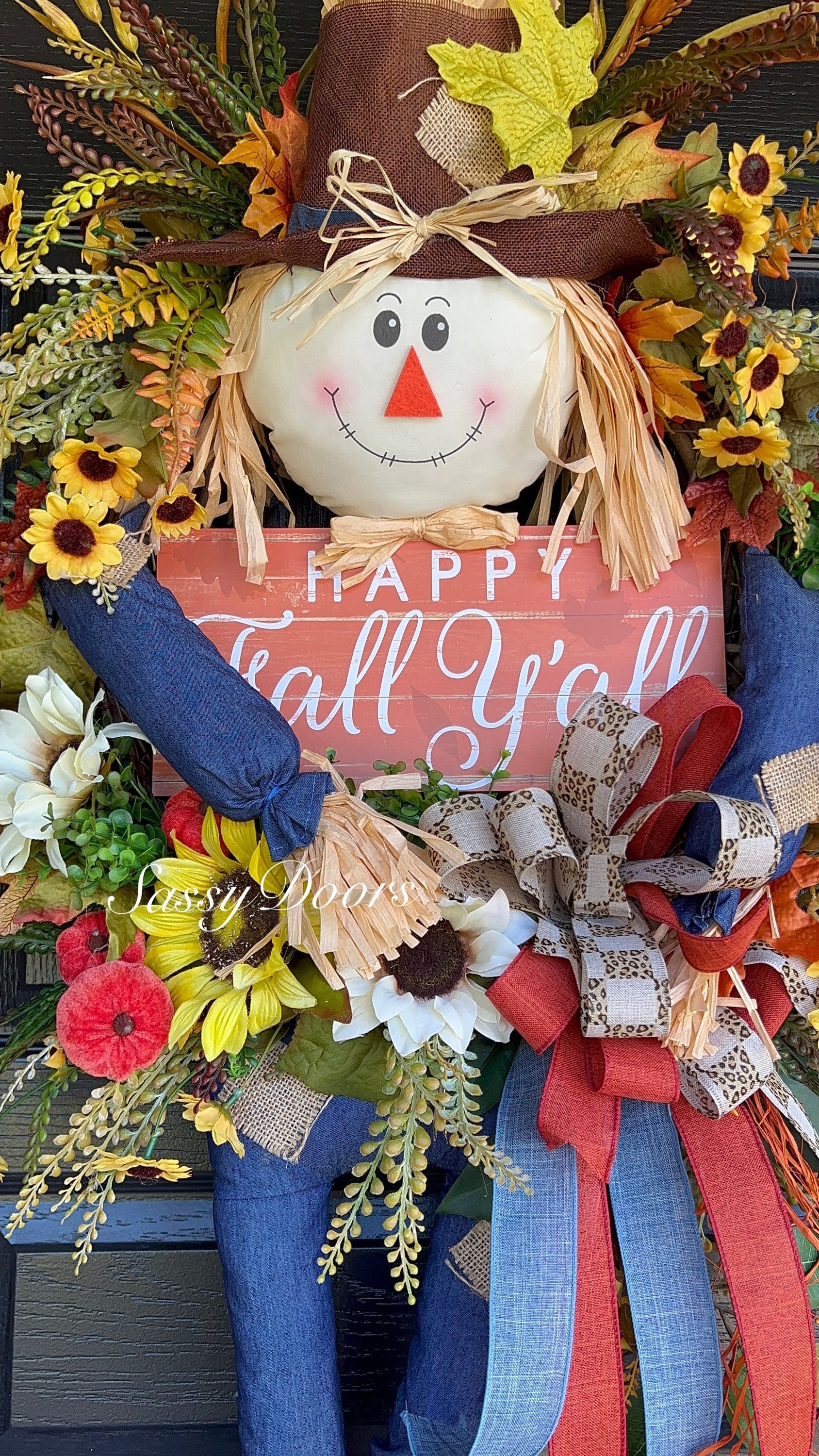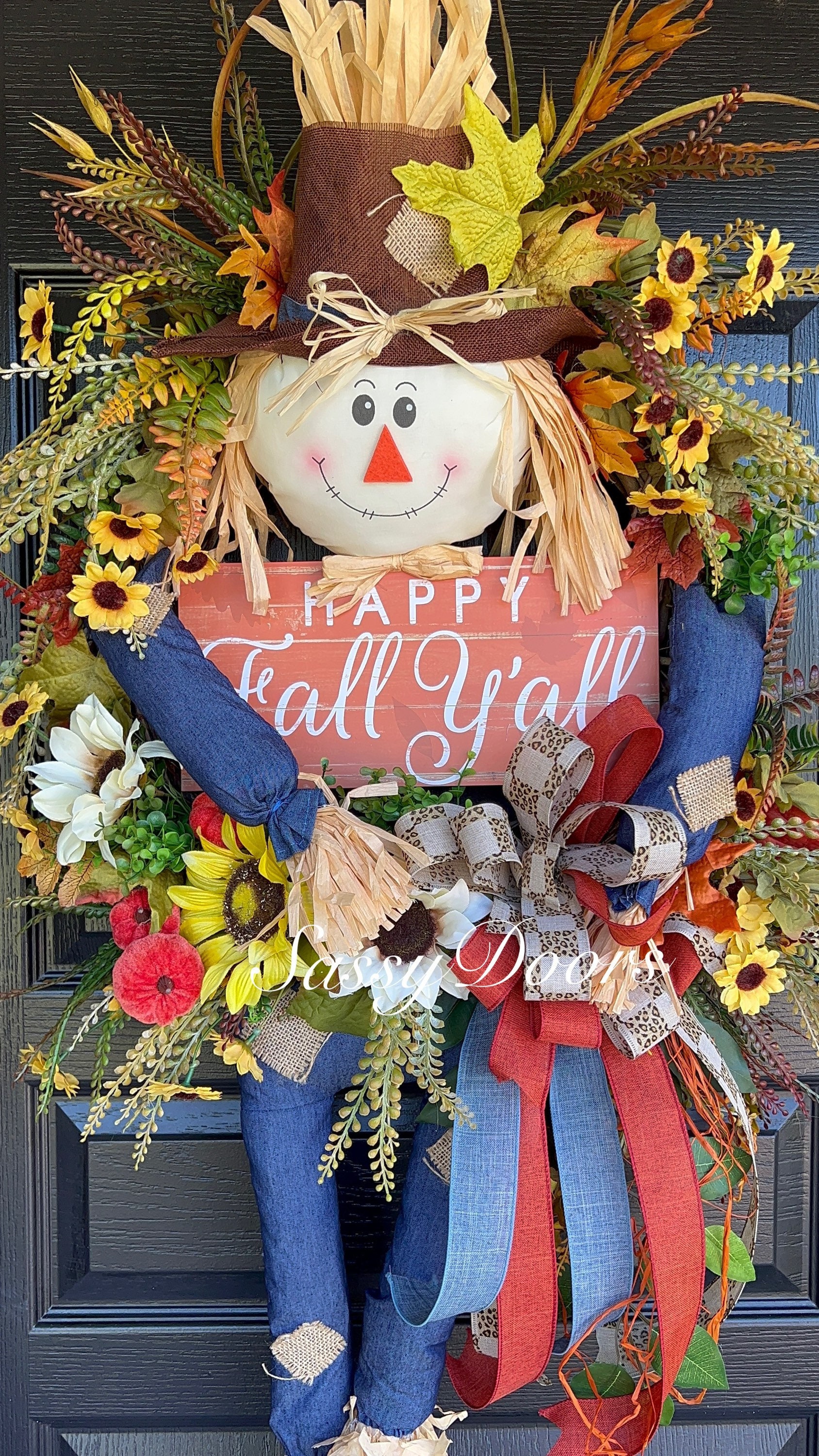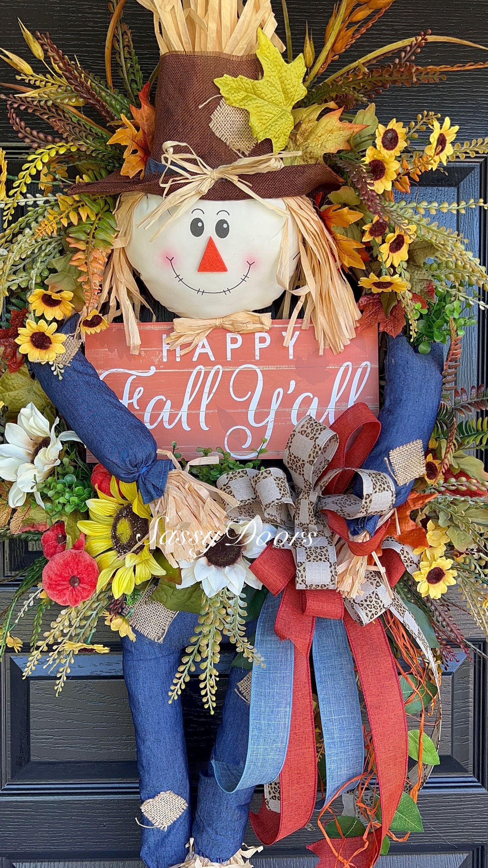 This ever so cute blue Jean denim scarecrow is dressed to impress and anxious to adorn your door!