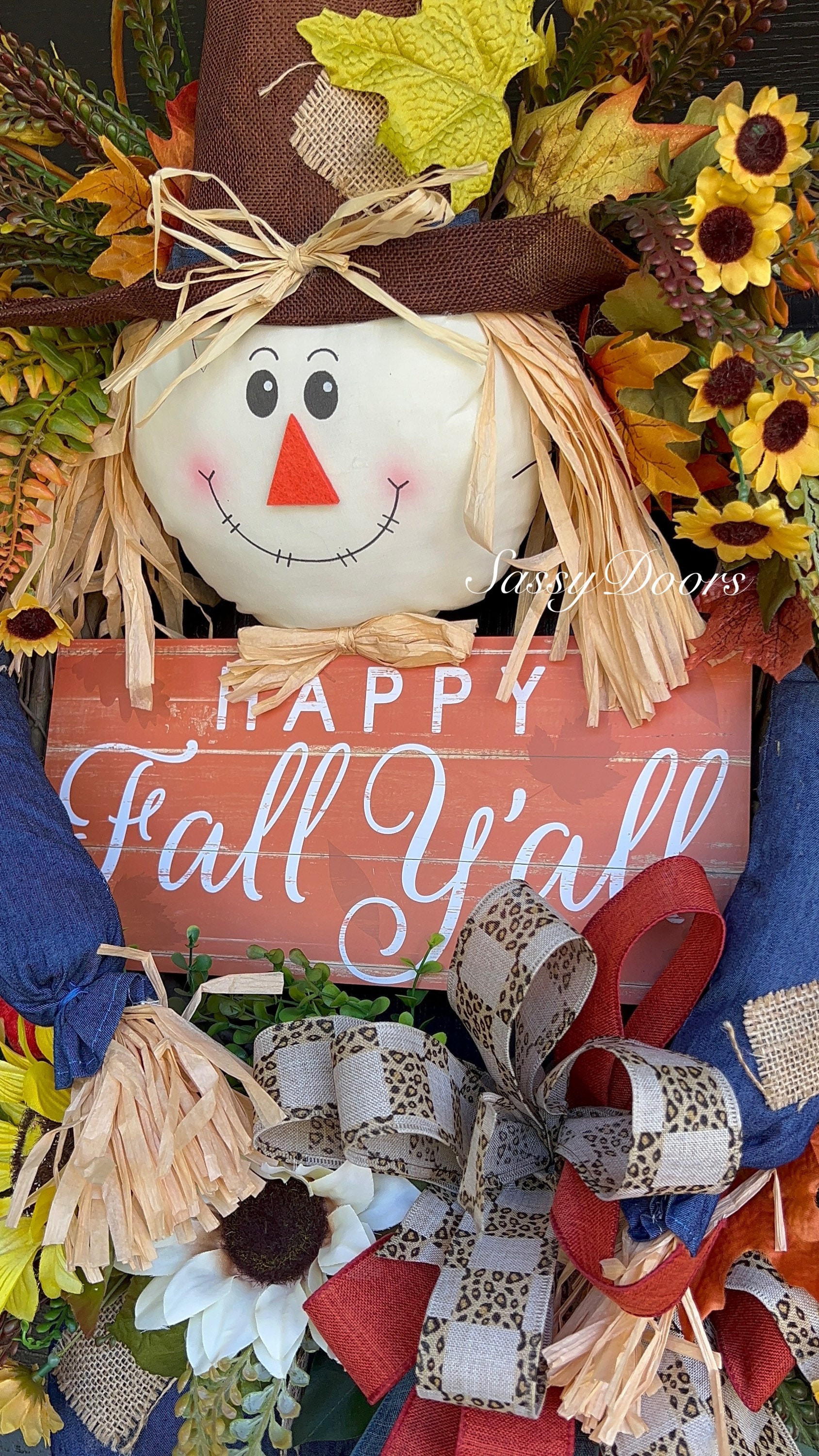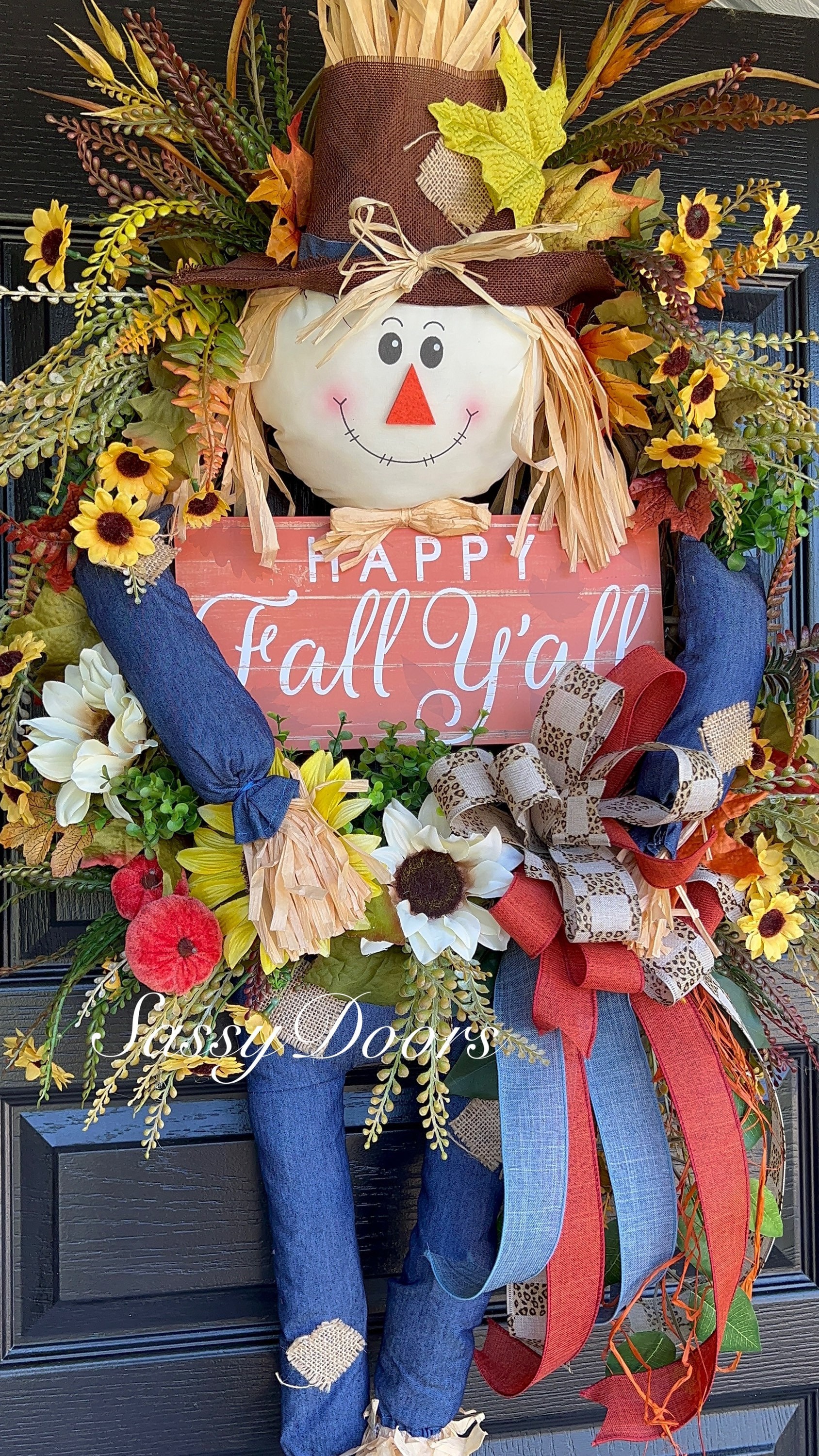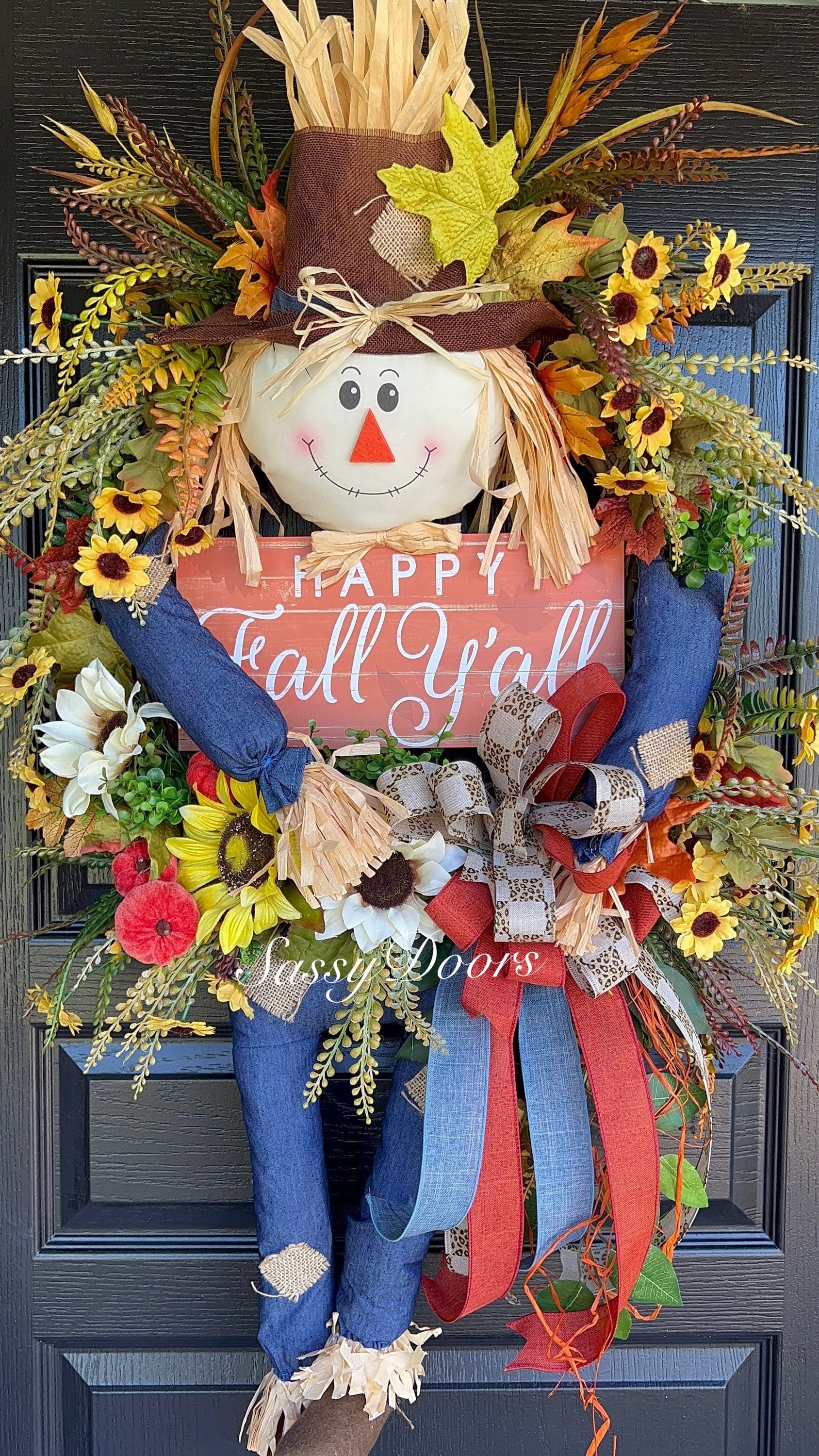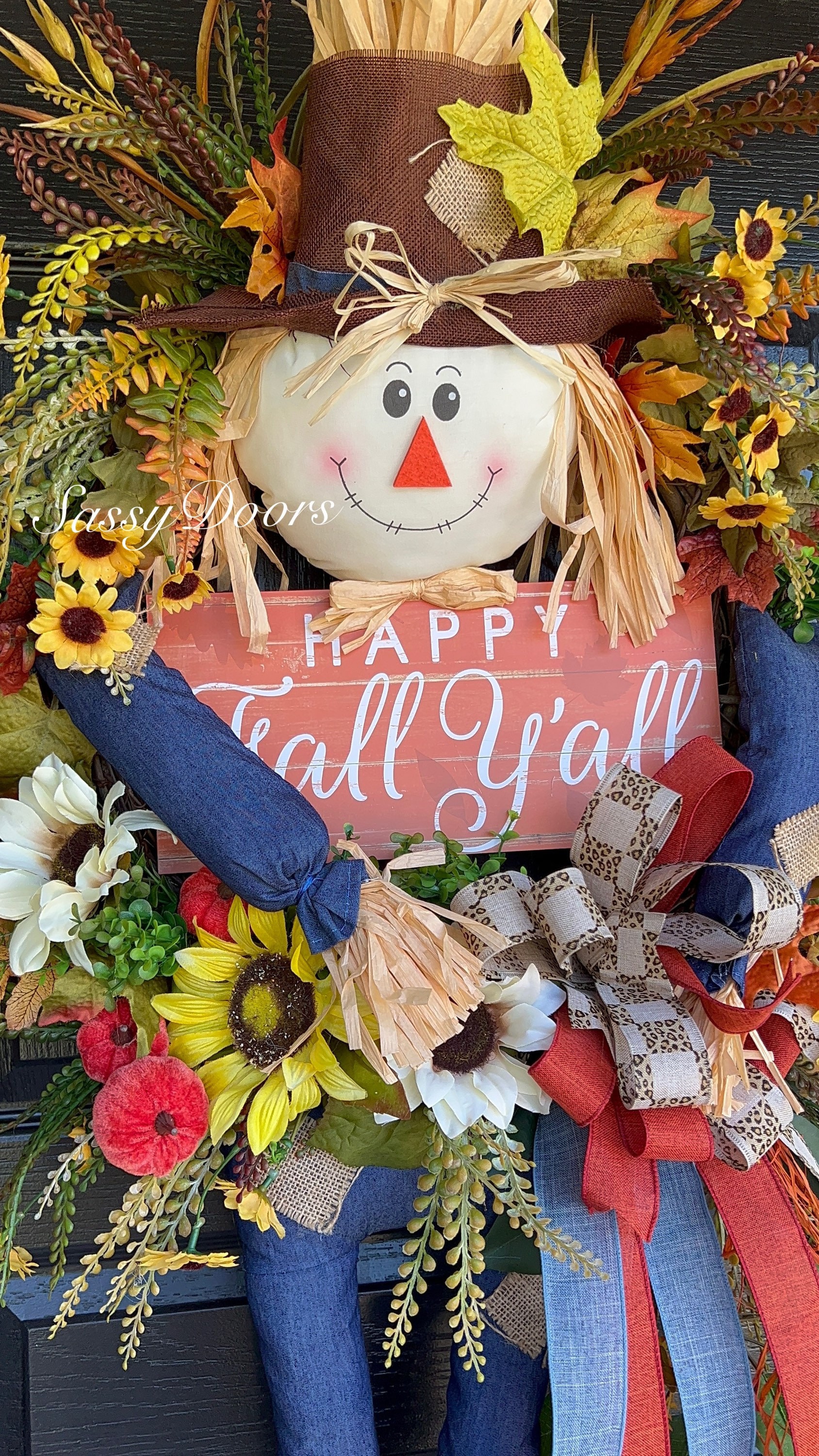 This ever so cute blue Jean denim scarecrow is dressed to impress and anxious to adorn your door!