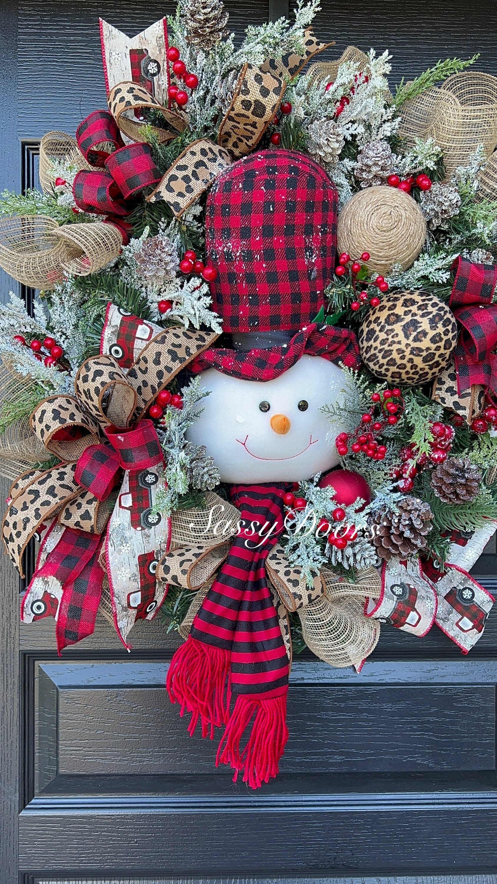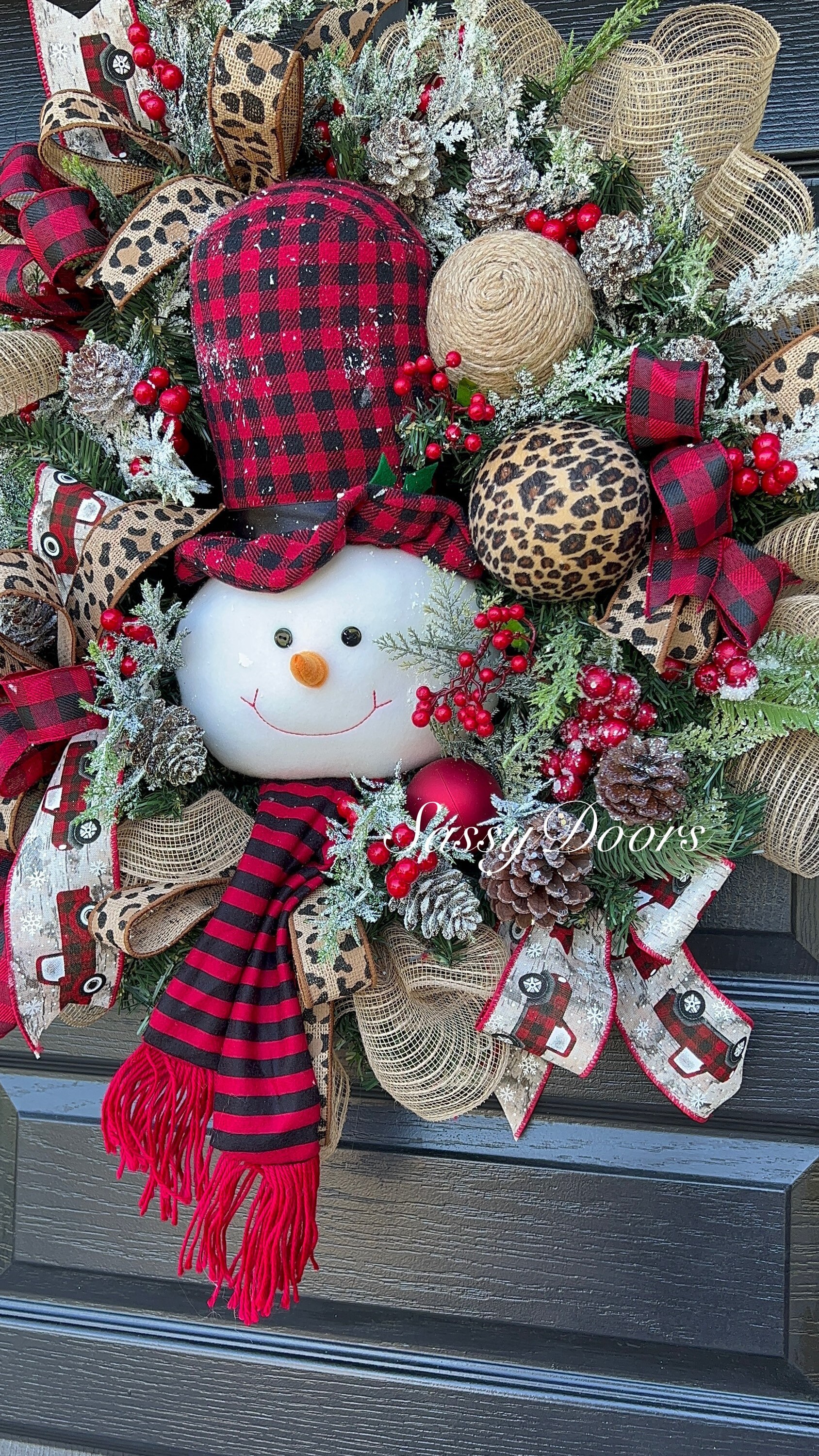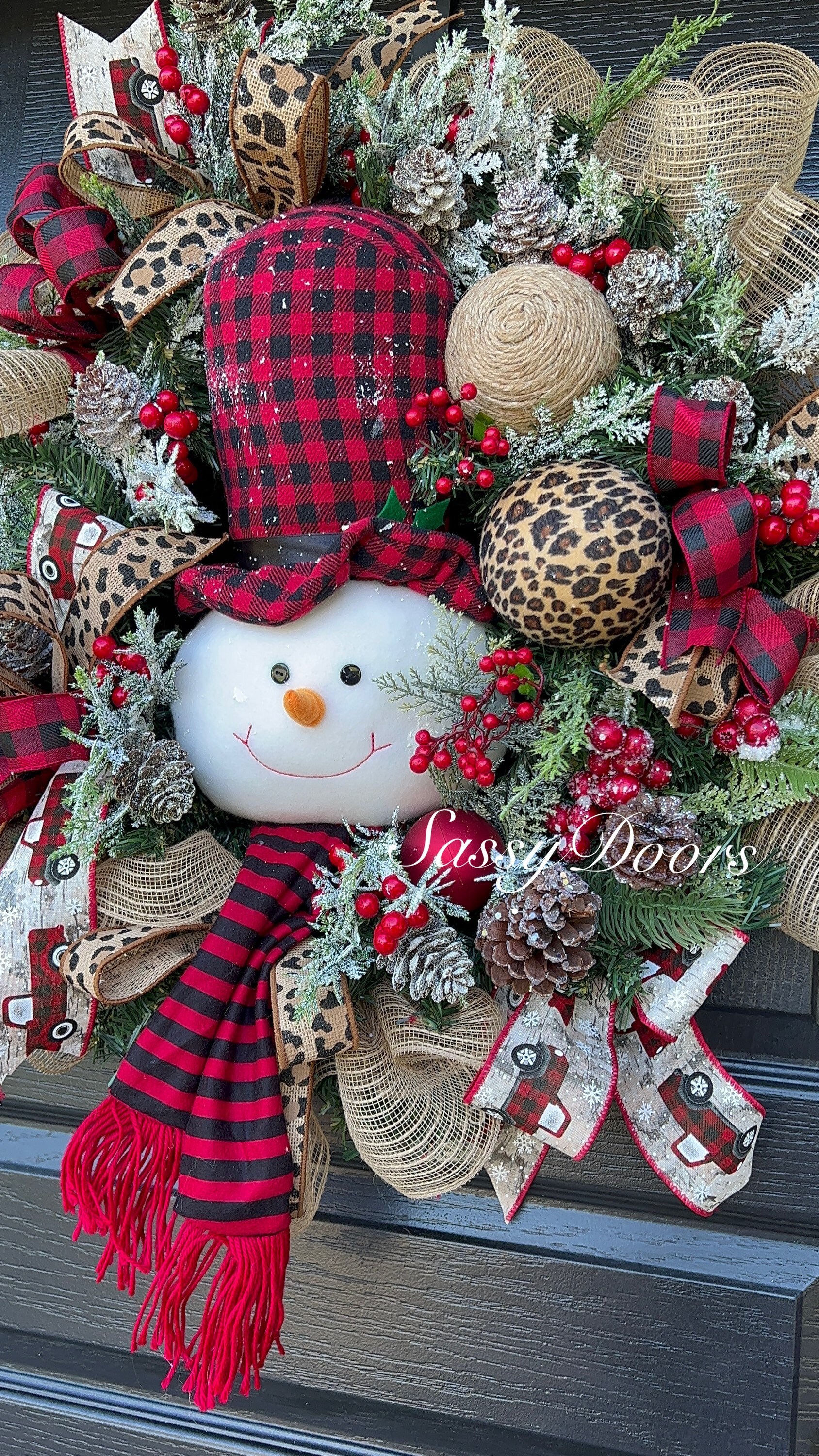 This absolutely adorable snowman is designed on a 24” evergreen wreath base Adorned with pines, berries, ornaments, deco and so much more.