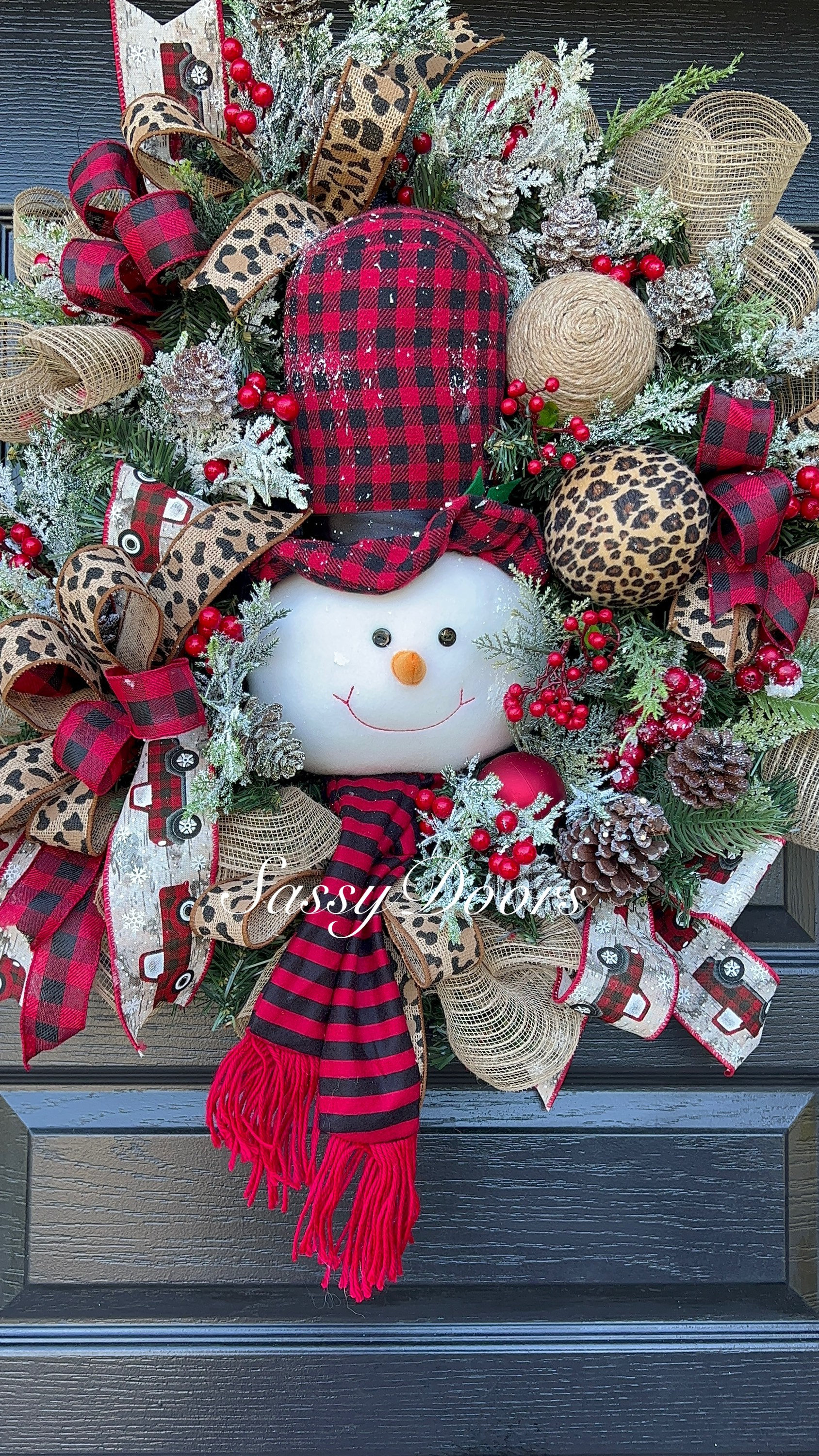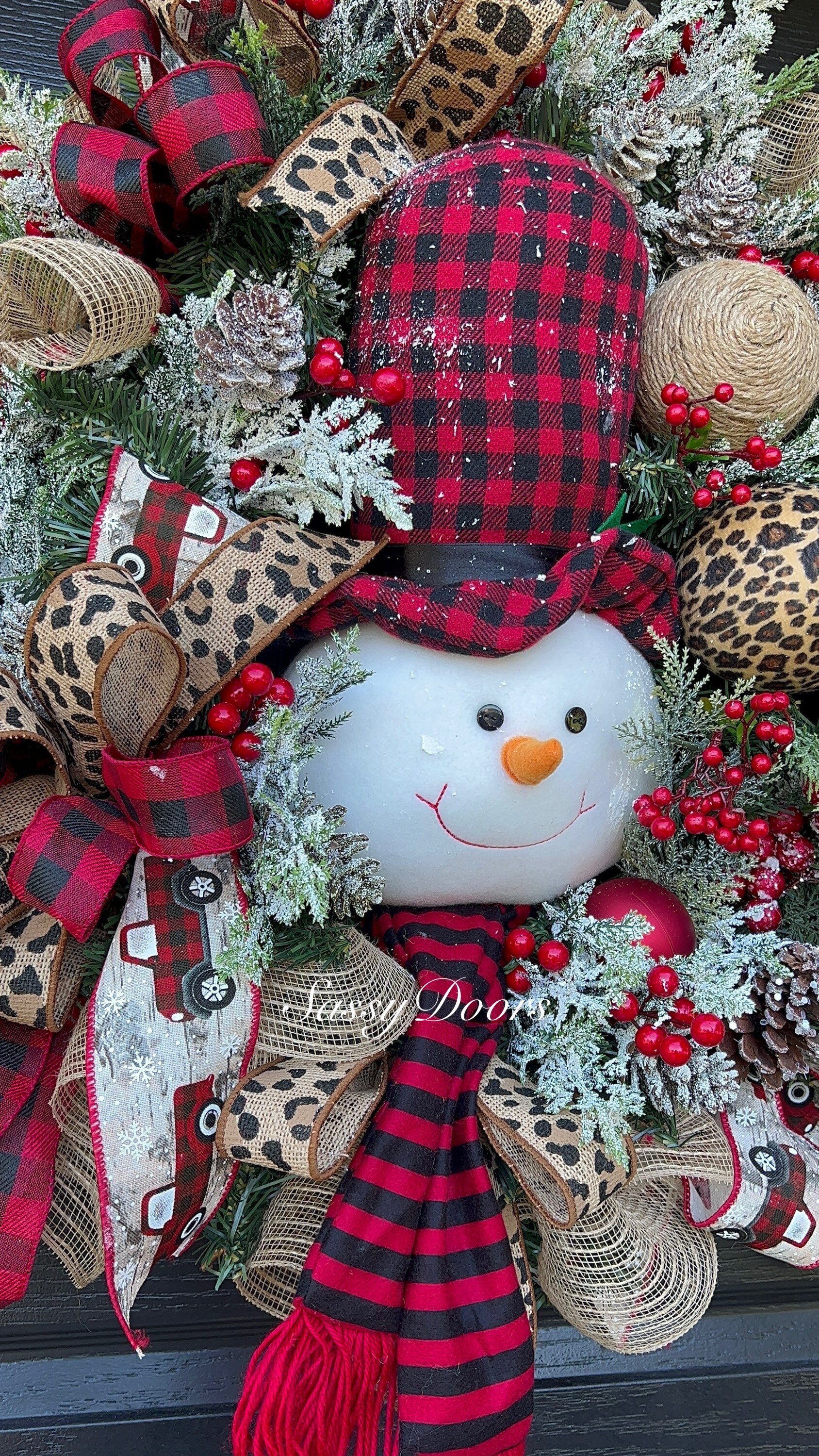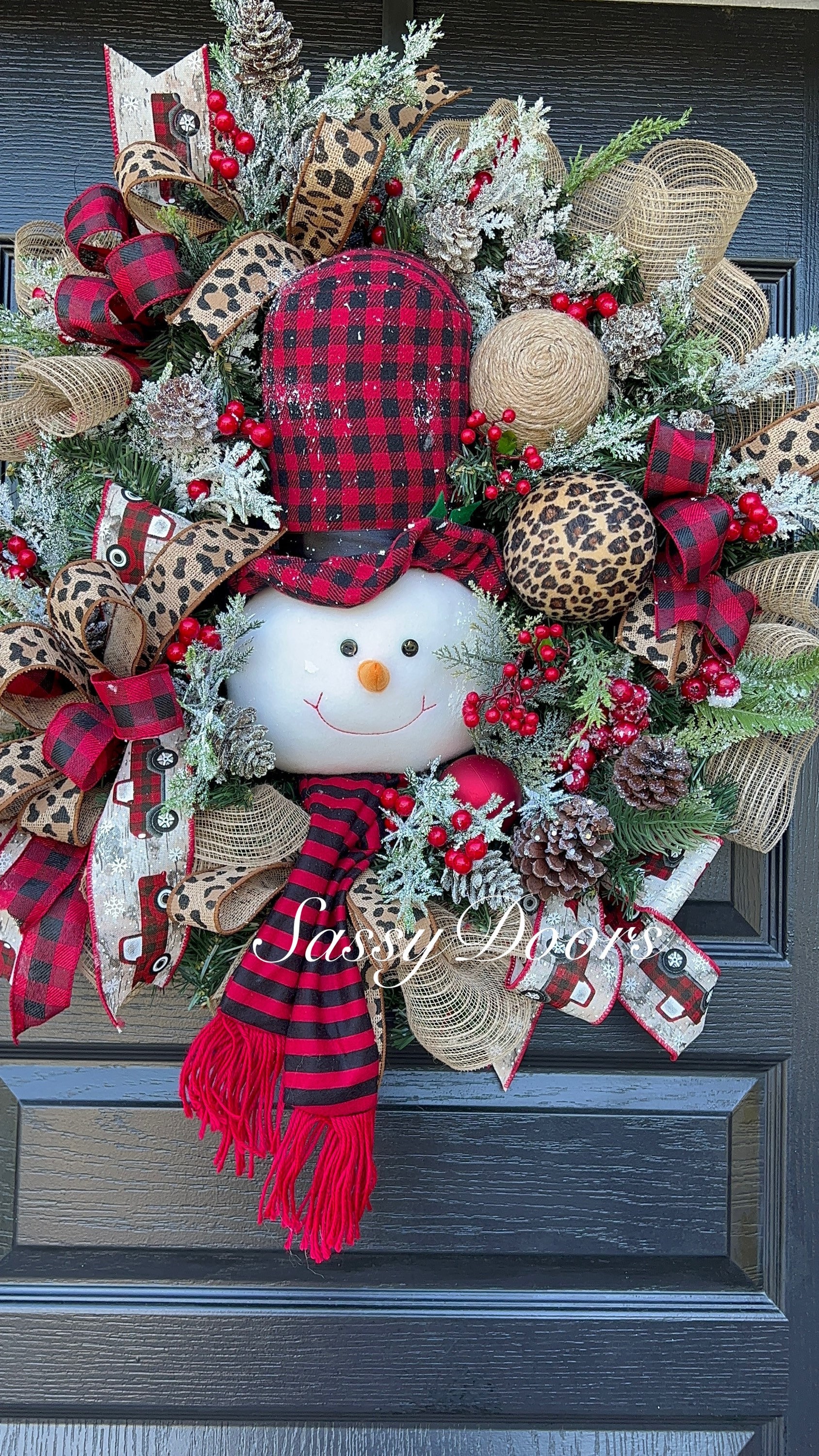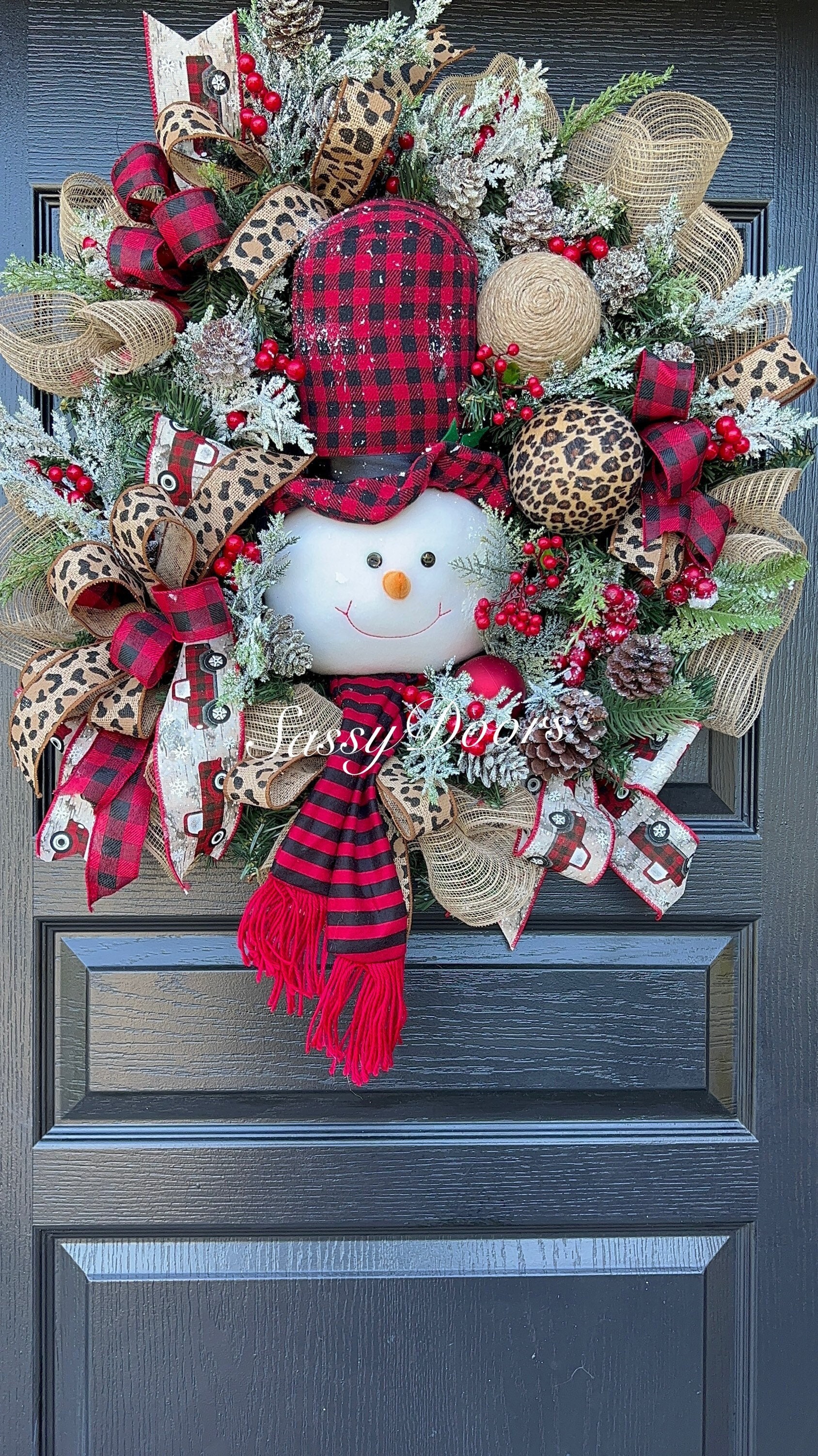 This absolutely adorable snowman is designed on a 24” evergreen wreath base Adorned with pines, berries, ornaments, deco and so much more.