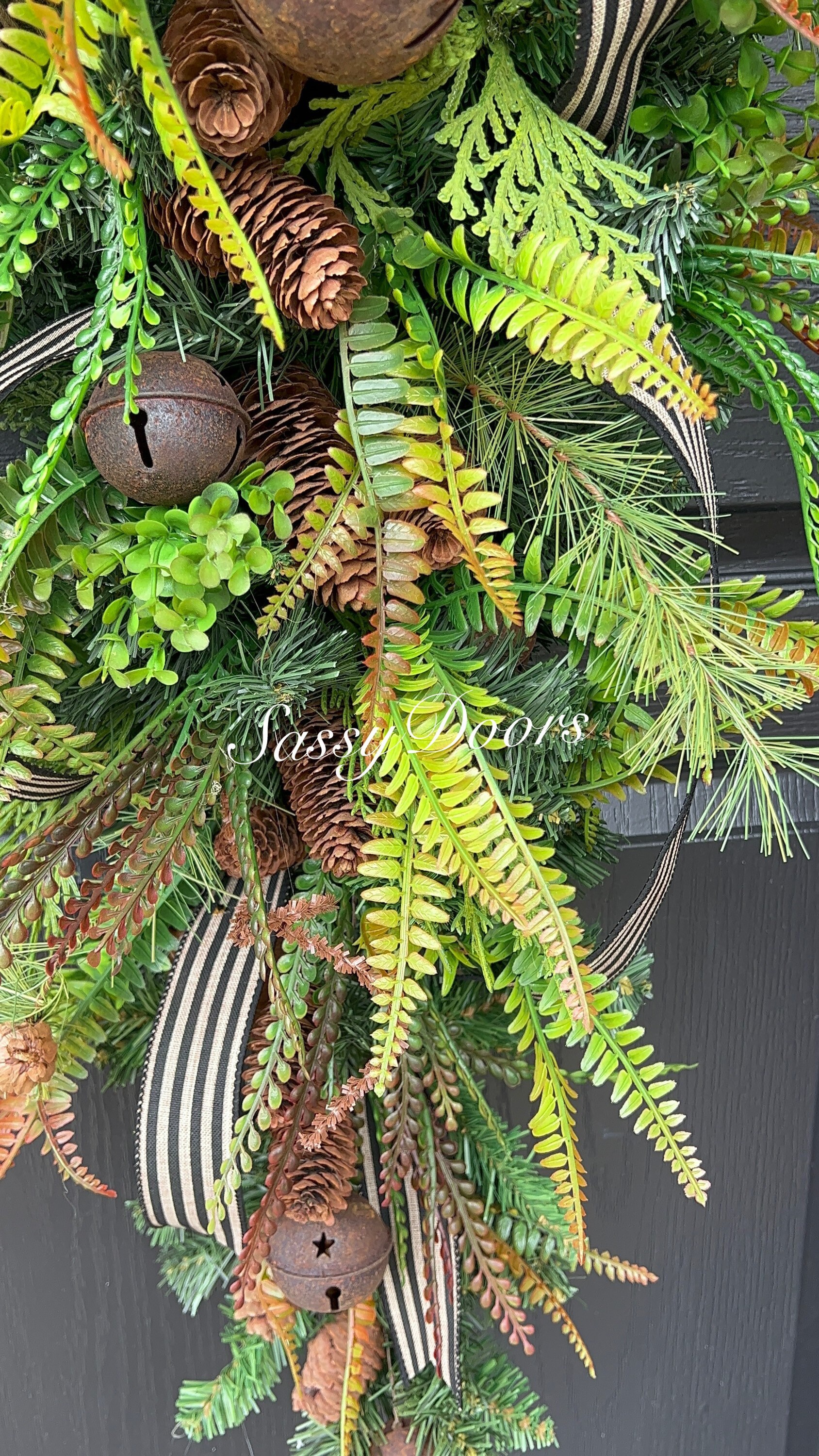 Adorned with rustic bells and loads of greenery, pinecones and so much more.