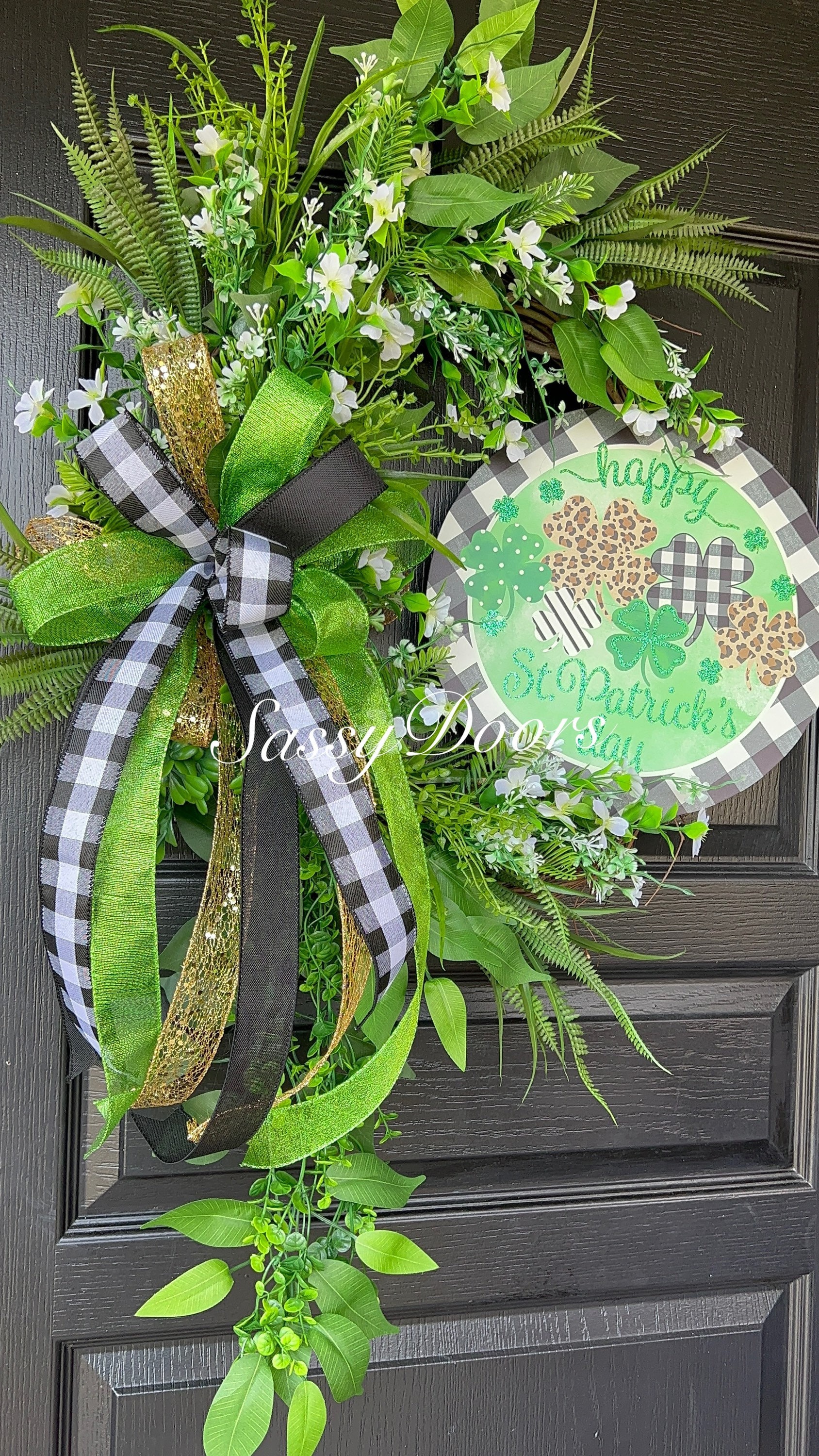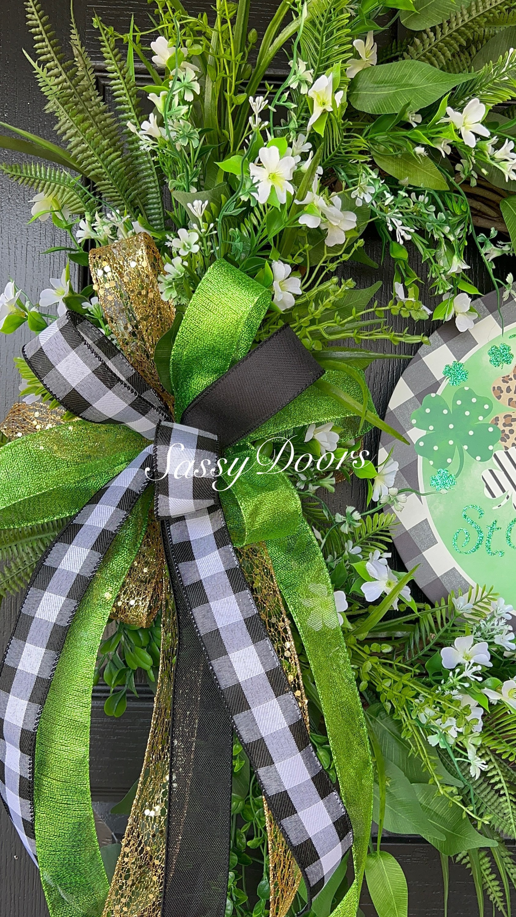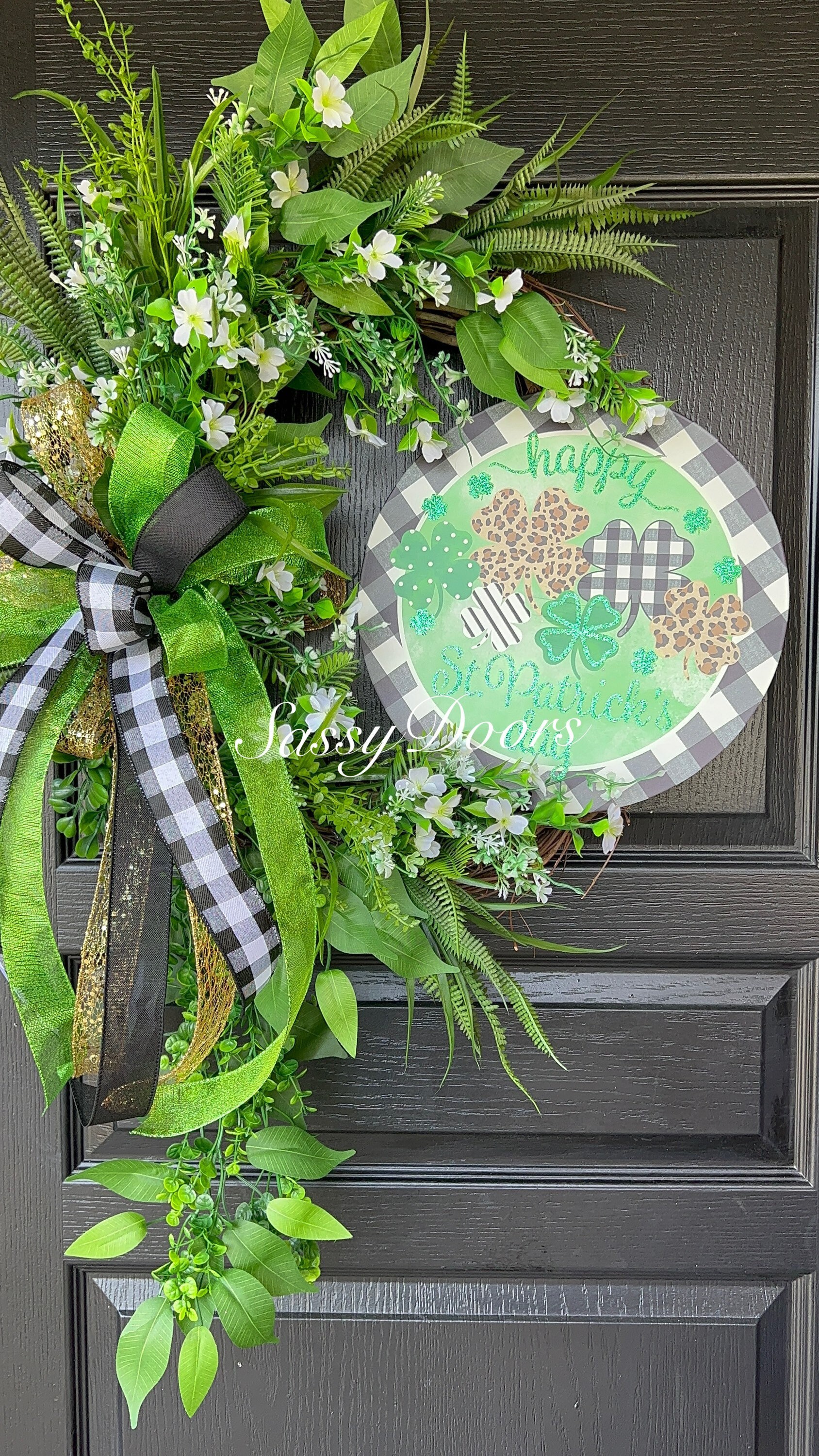 Adorned with a metal St.Patrick’ Day sign which is focal point of this beautiful wreath design.