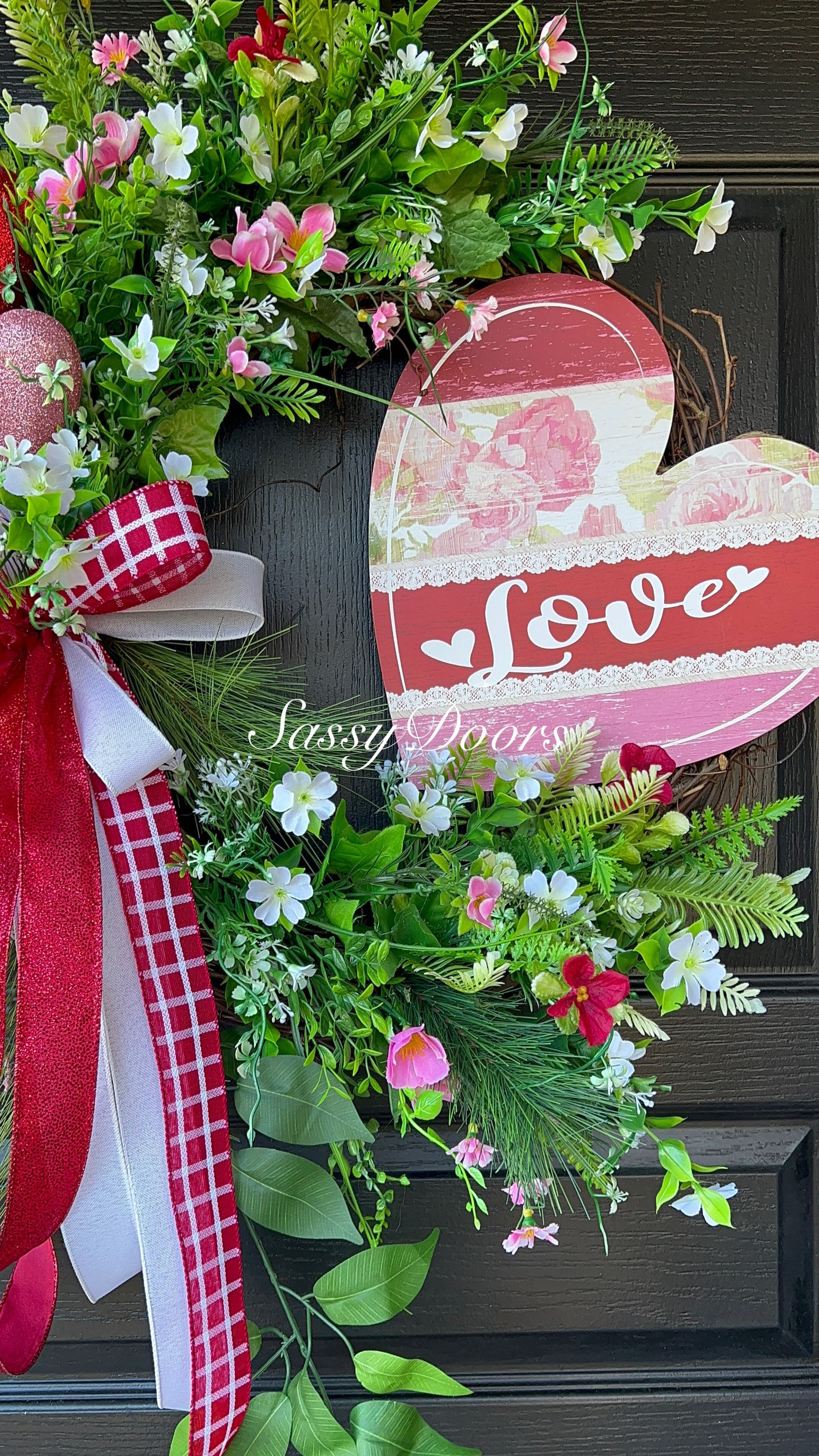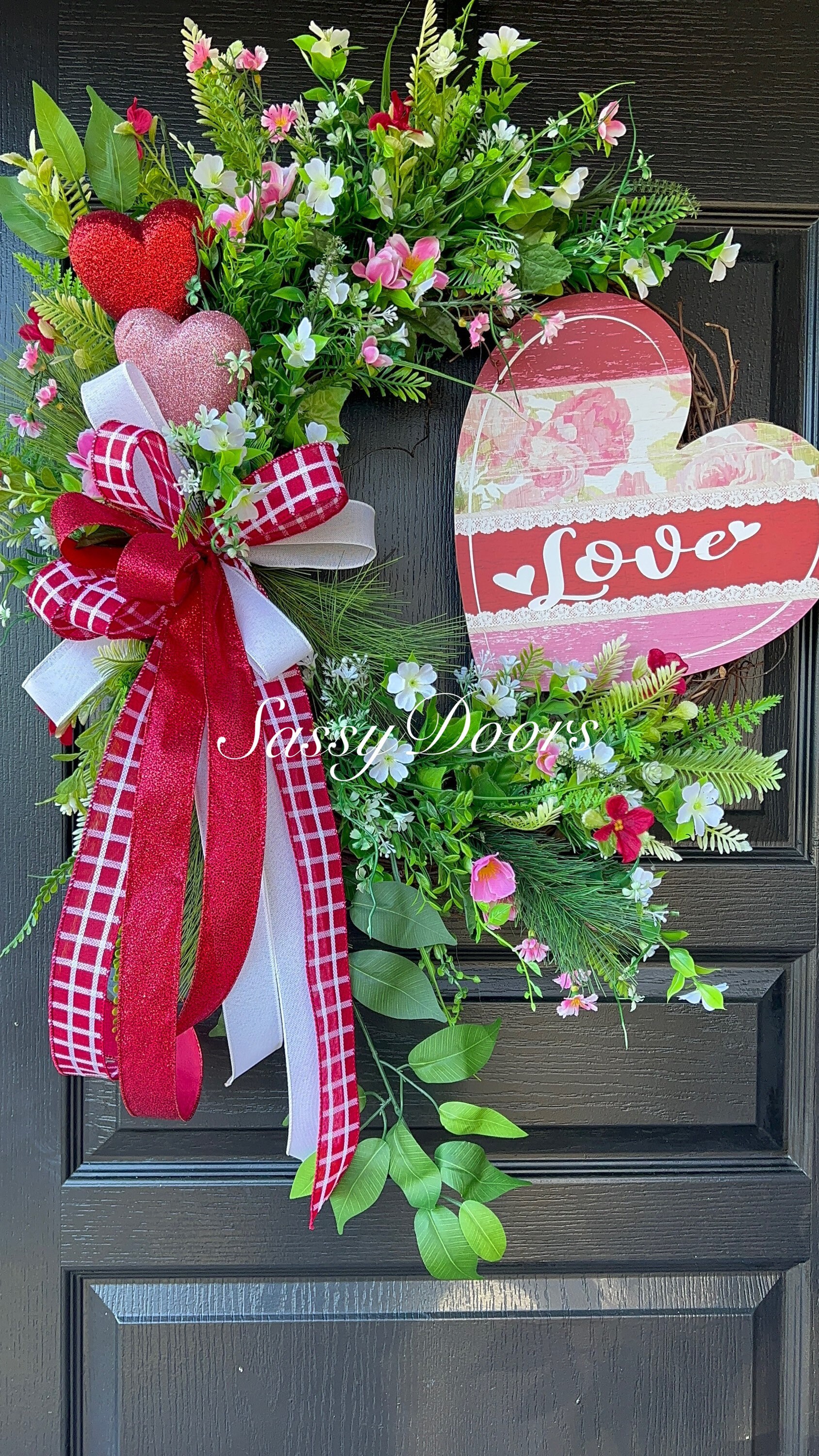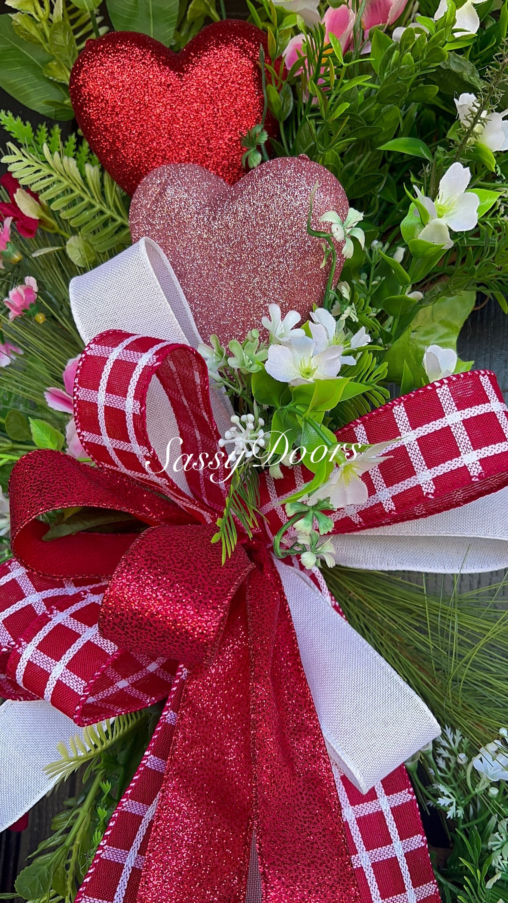 This stunning wreath is adorned with evergreen pines, leaves, tiny white and pink flowers, glitter pink and red hearts and so much more.