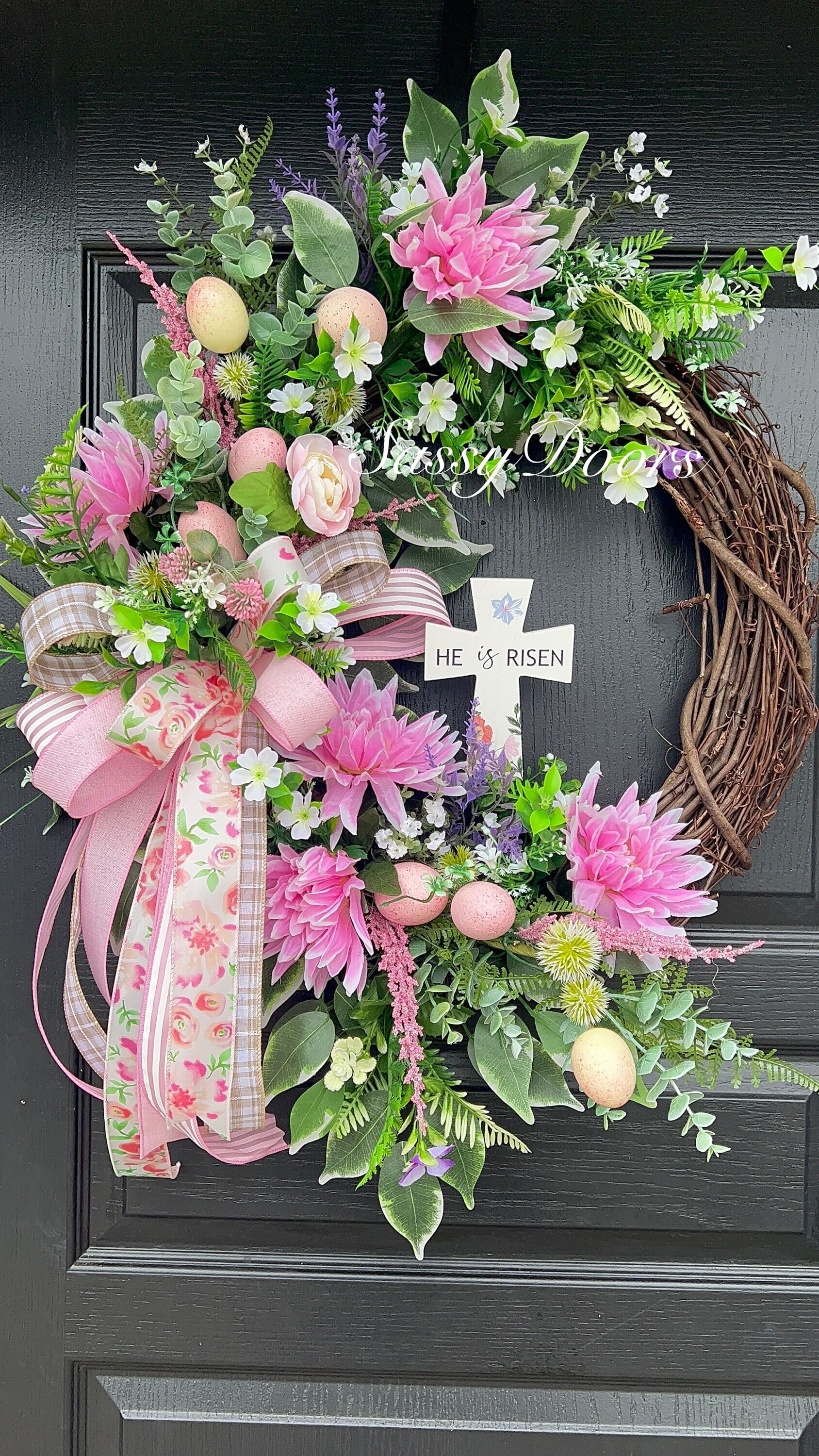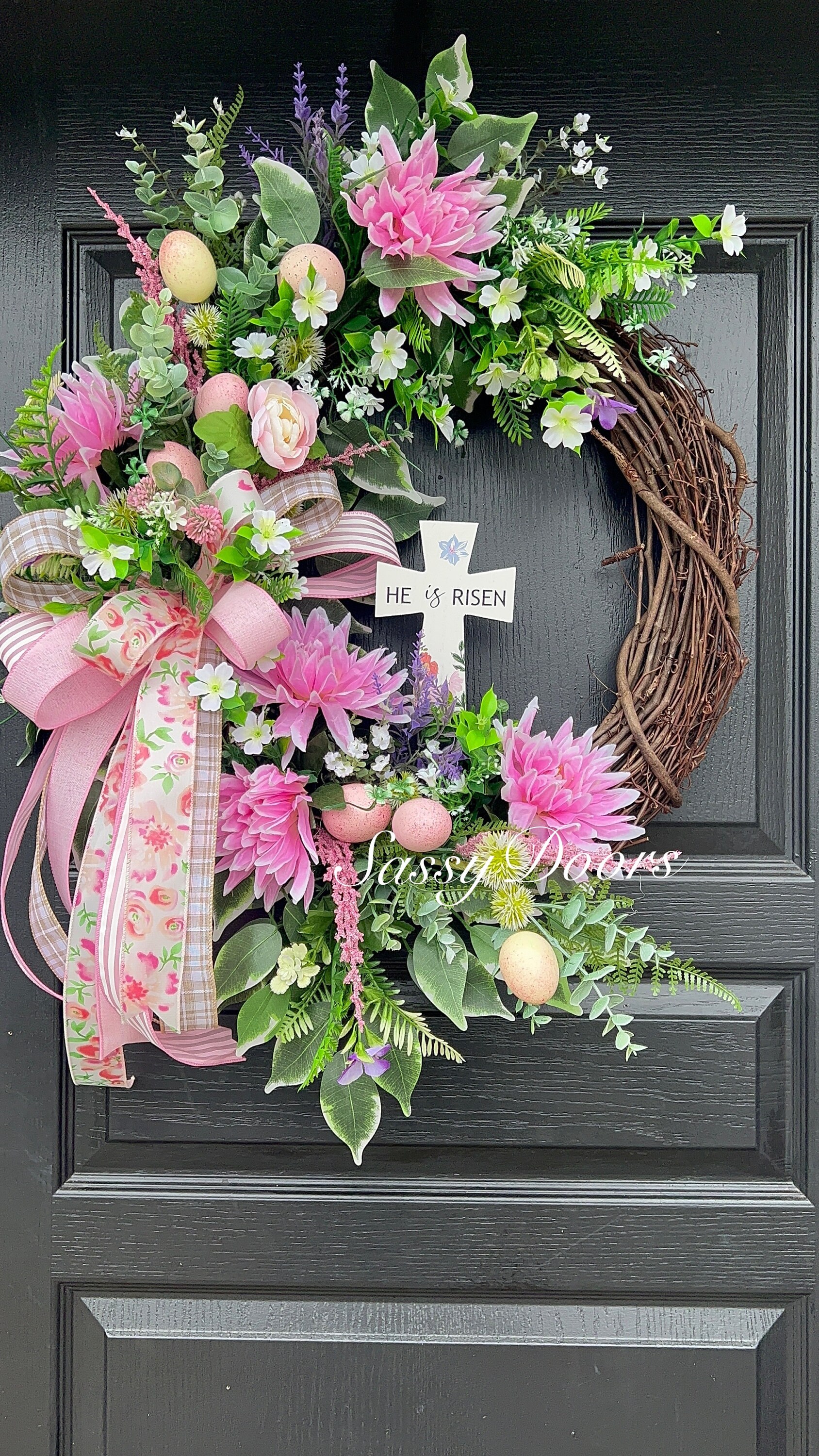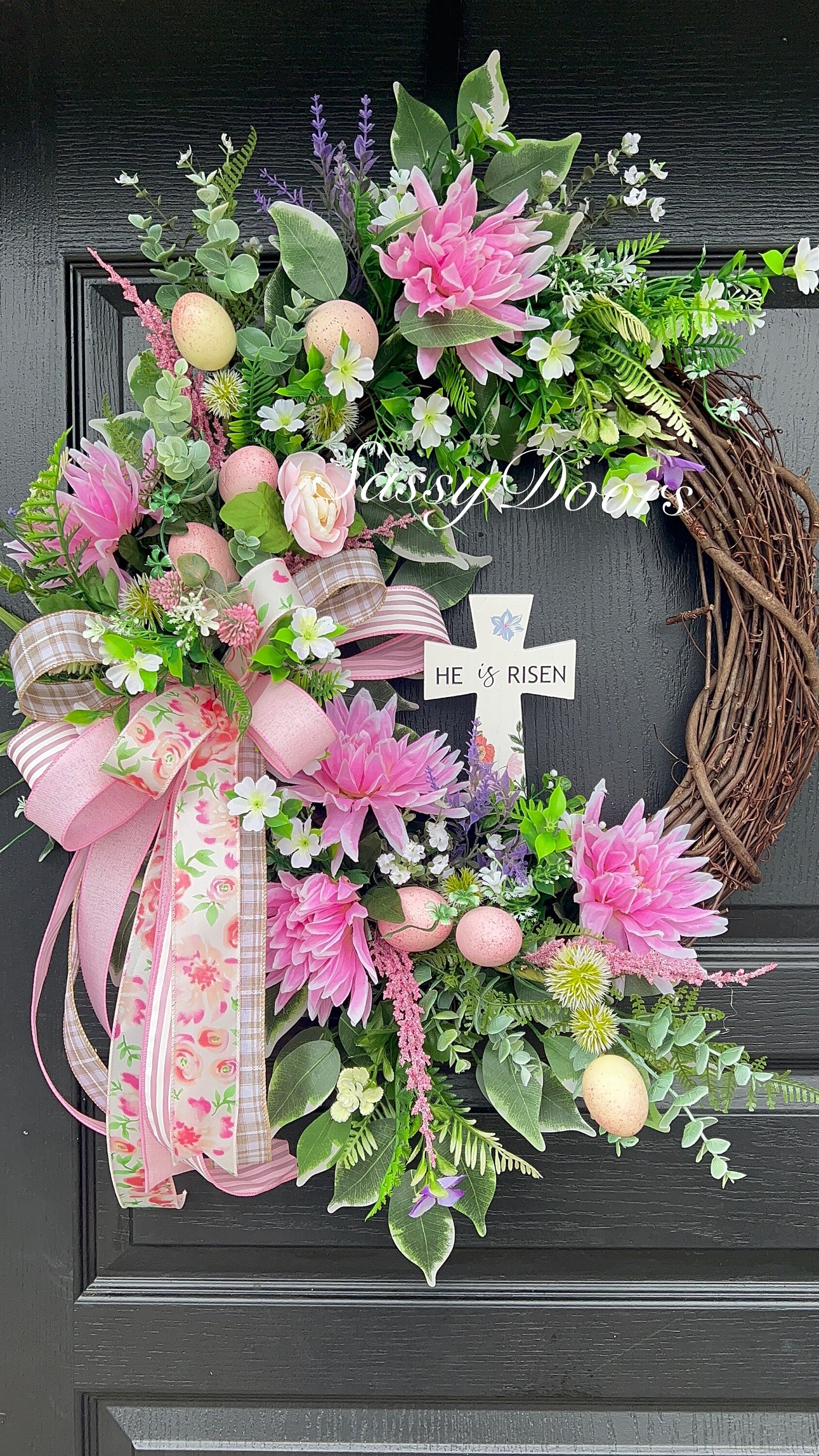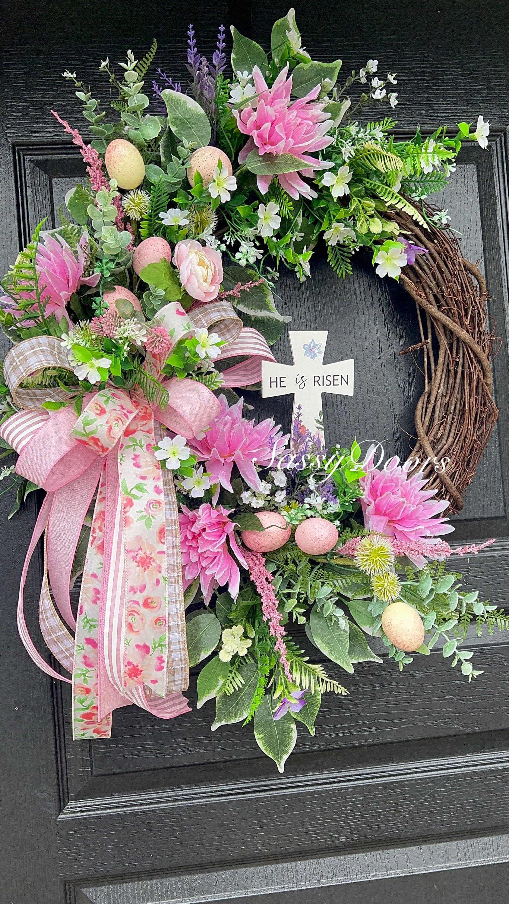 This beautiful large Easter wreath is designed on a 18” grapevine wreath. It is accented with a beautiful variety of pink florals, eggs, sign, eucalyptus and many other all time spring favorites.