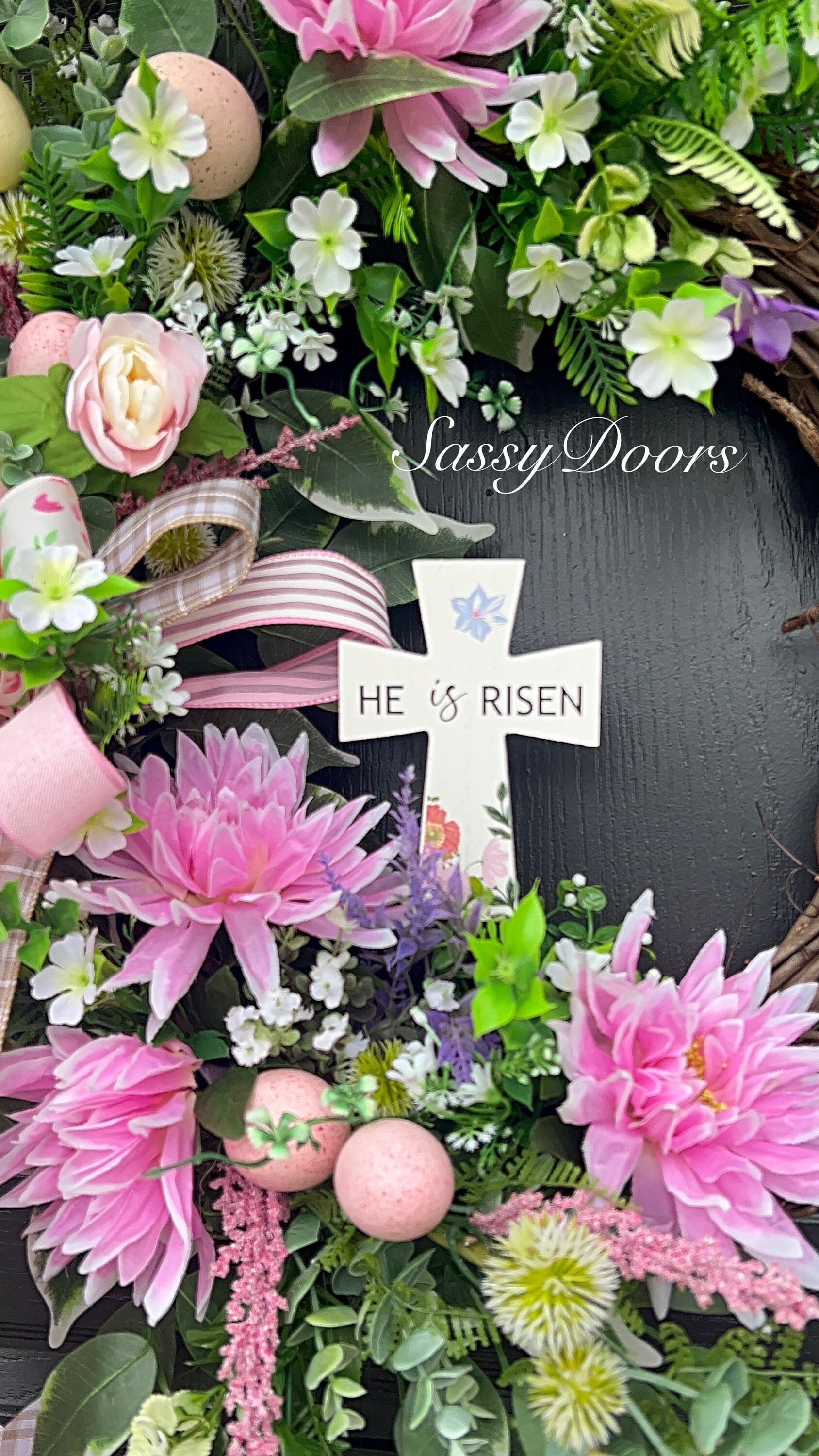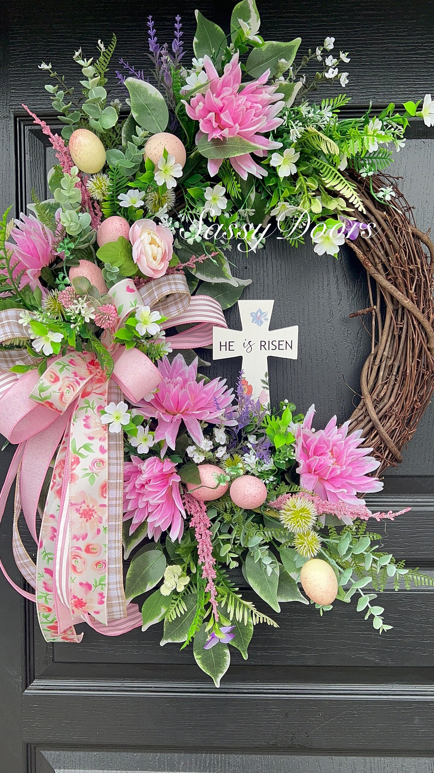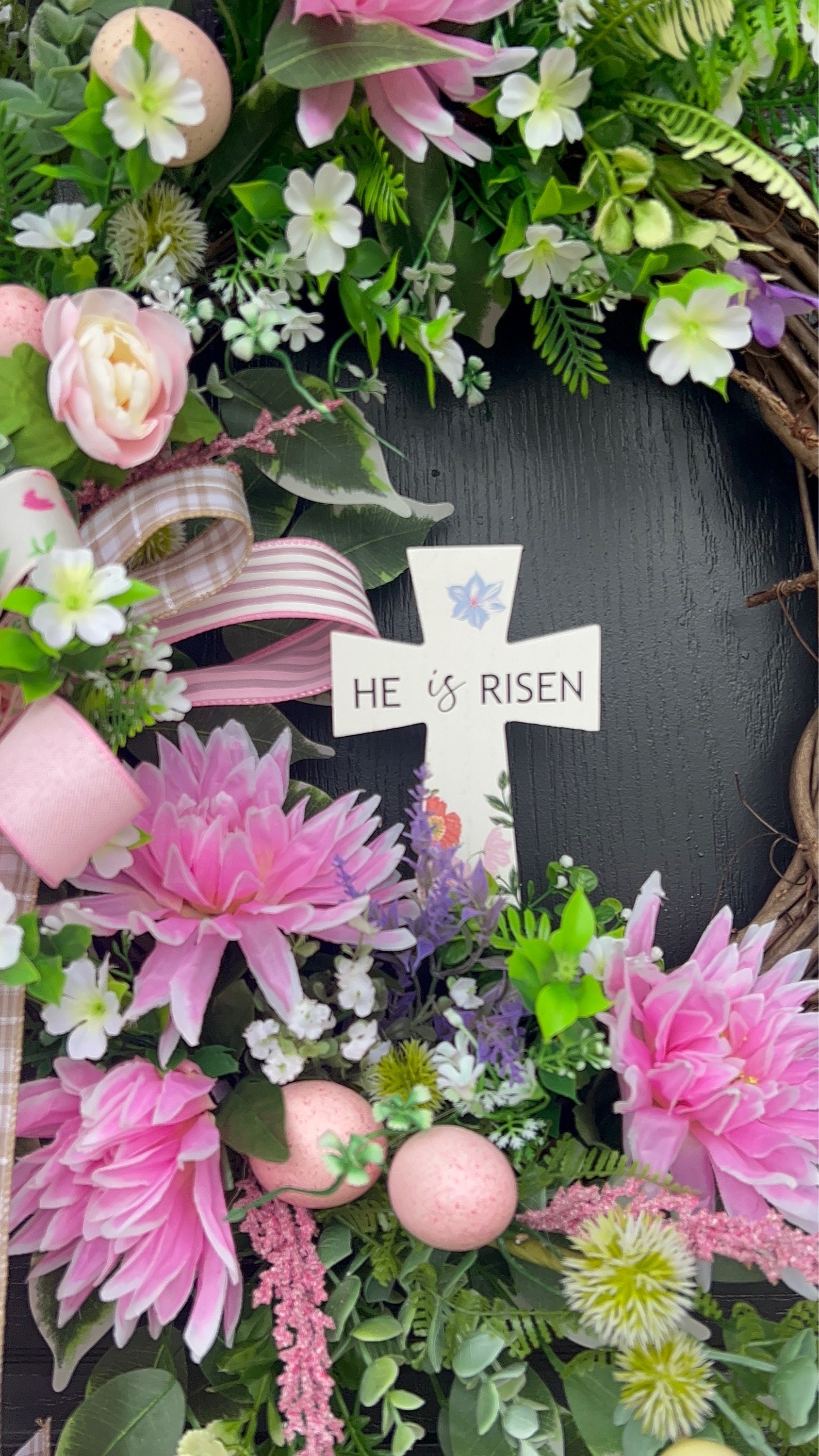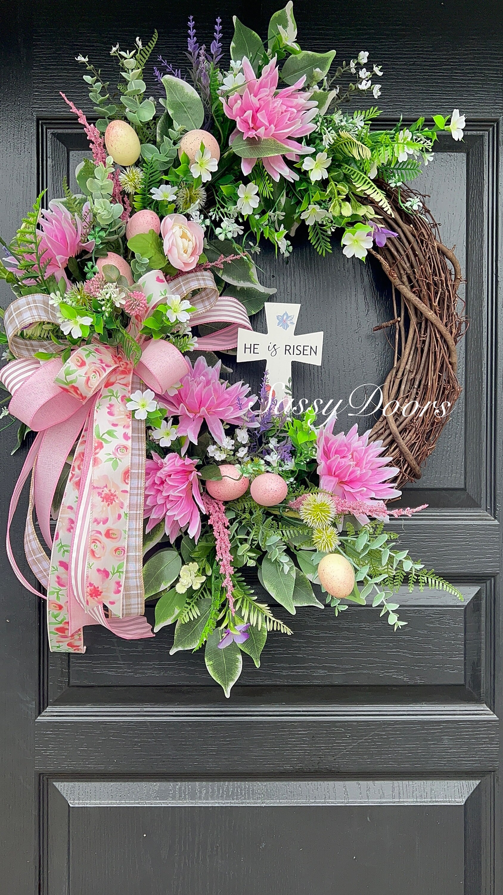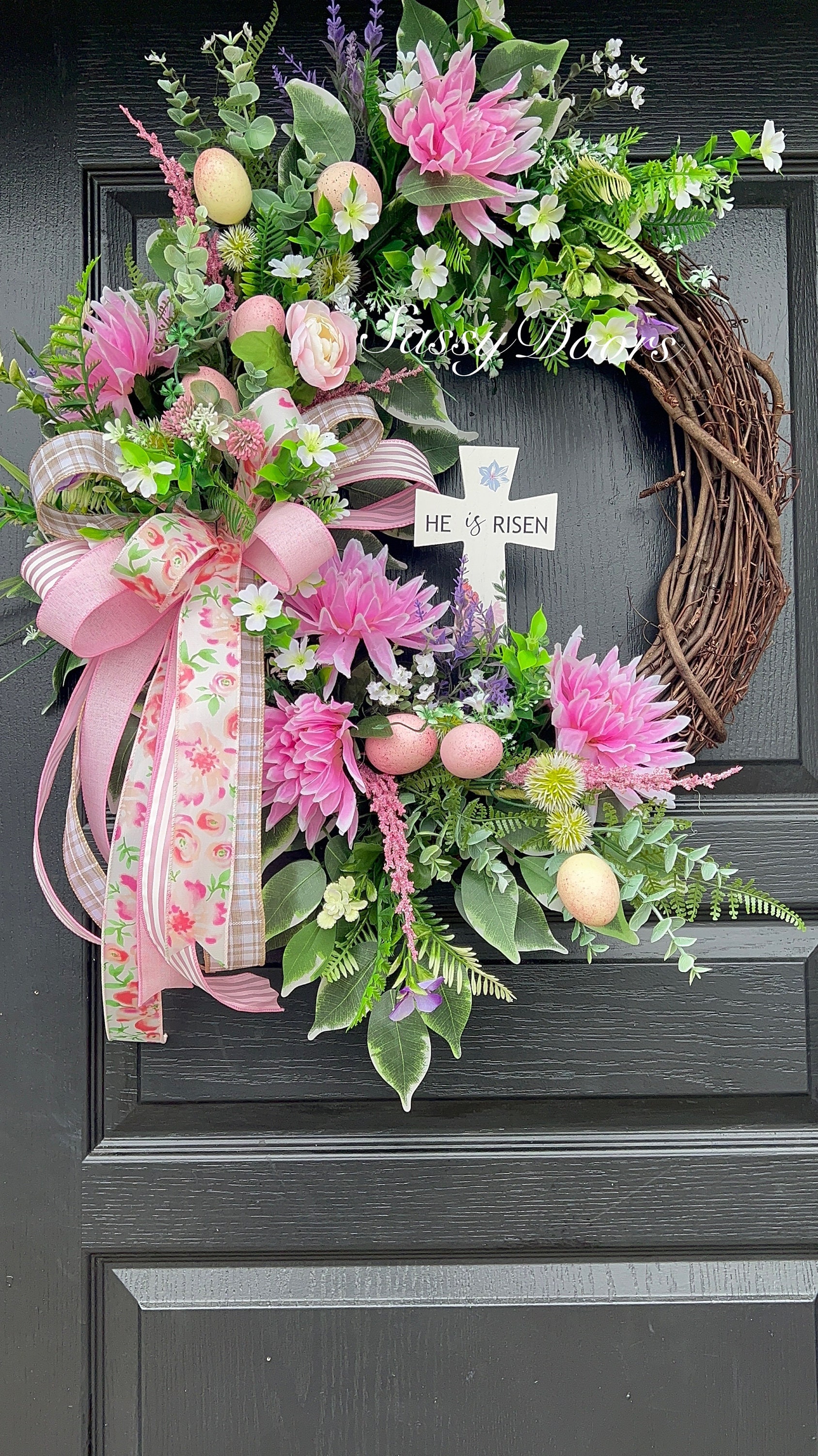 This beautiful large Easter wreath is designed on a 18” grapevine wreath. It is accented with a beautiful variety of pink florals, eggs, sign, eucalyptus and many other all time spring favorites.