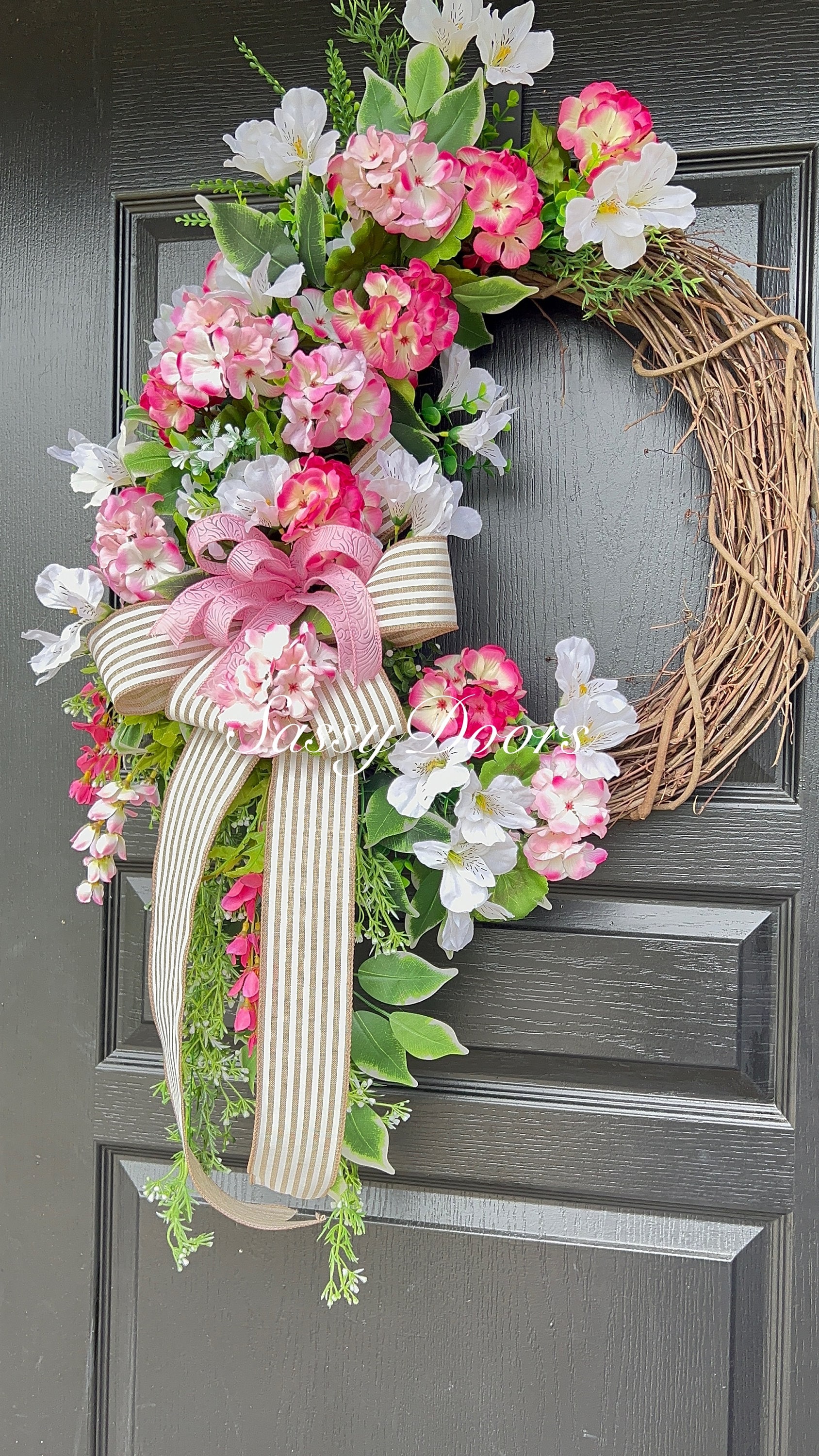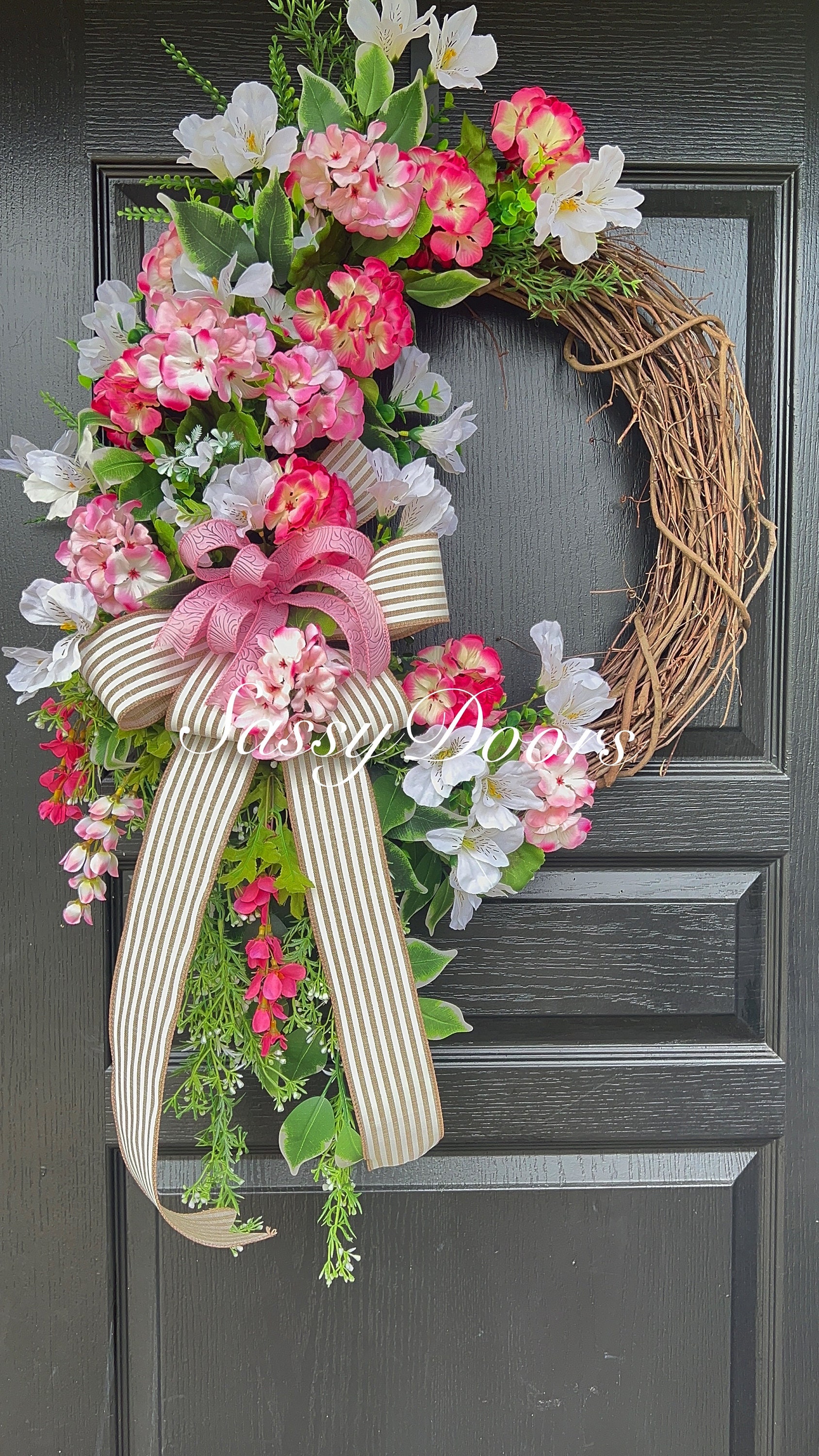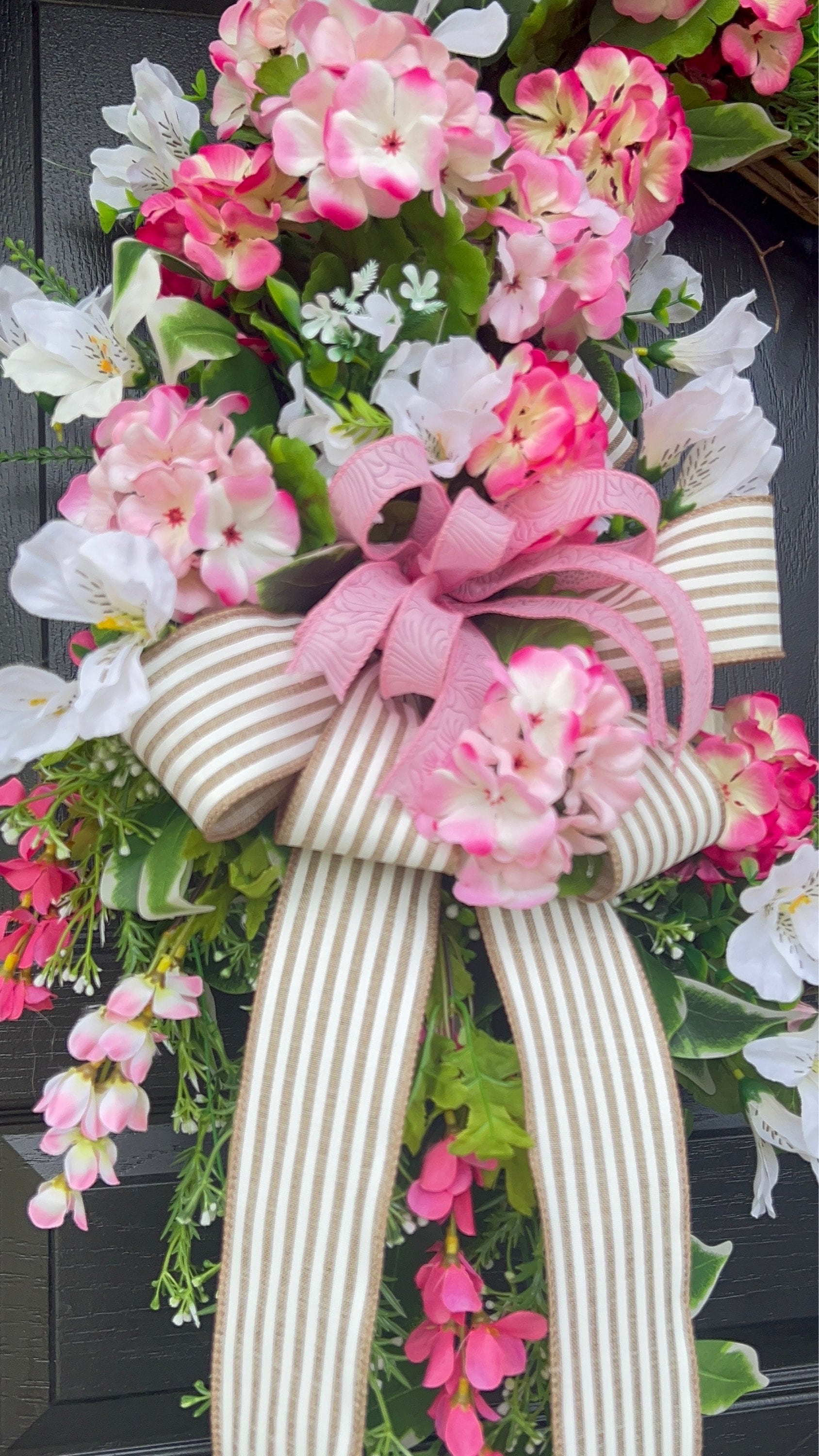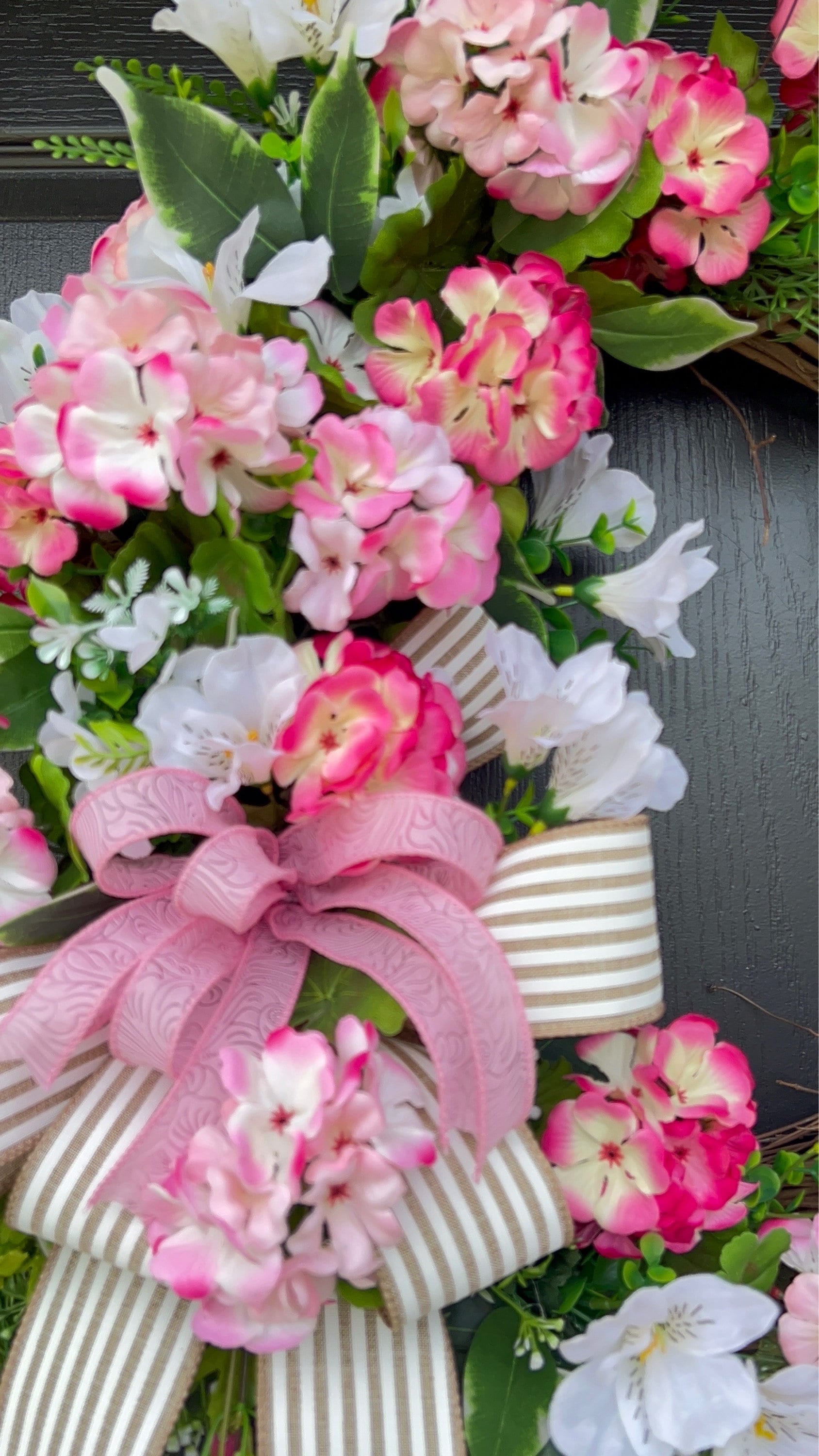 These lovely pink geranium wreath is designed on a 18" grapevine. Adorned with a beautiful array flowing greenery. The stripe ribbon and bows are sure to make it pop on your door!