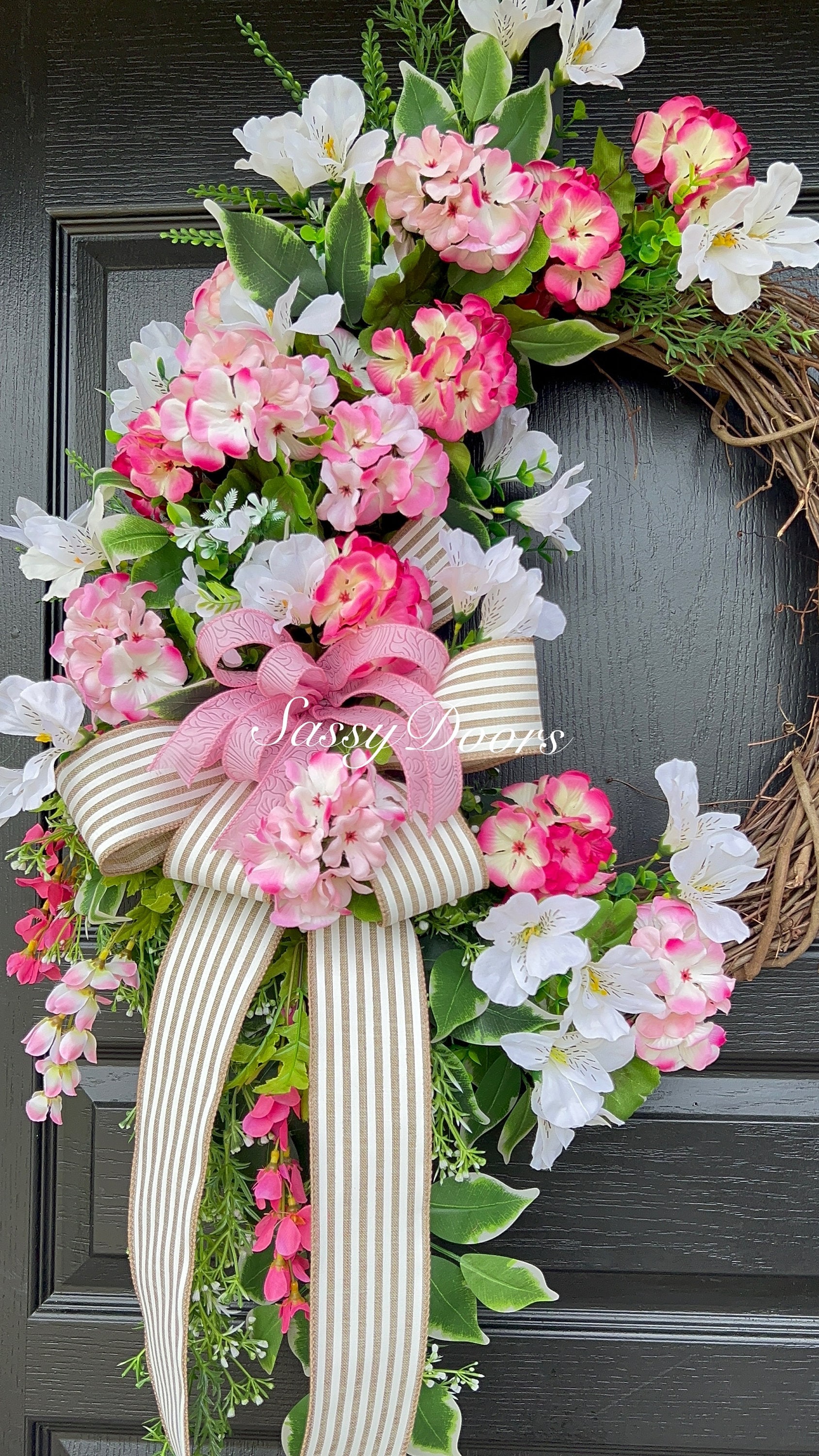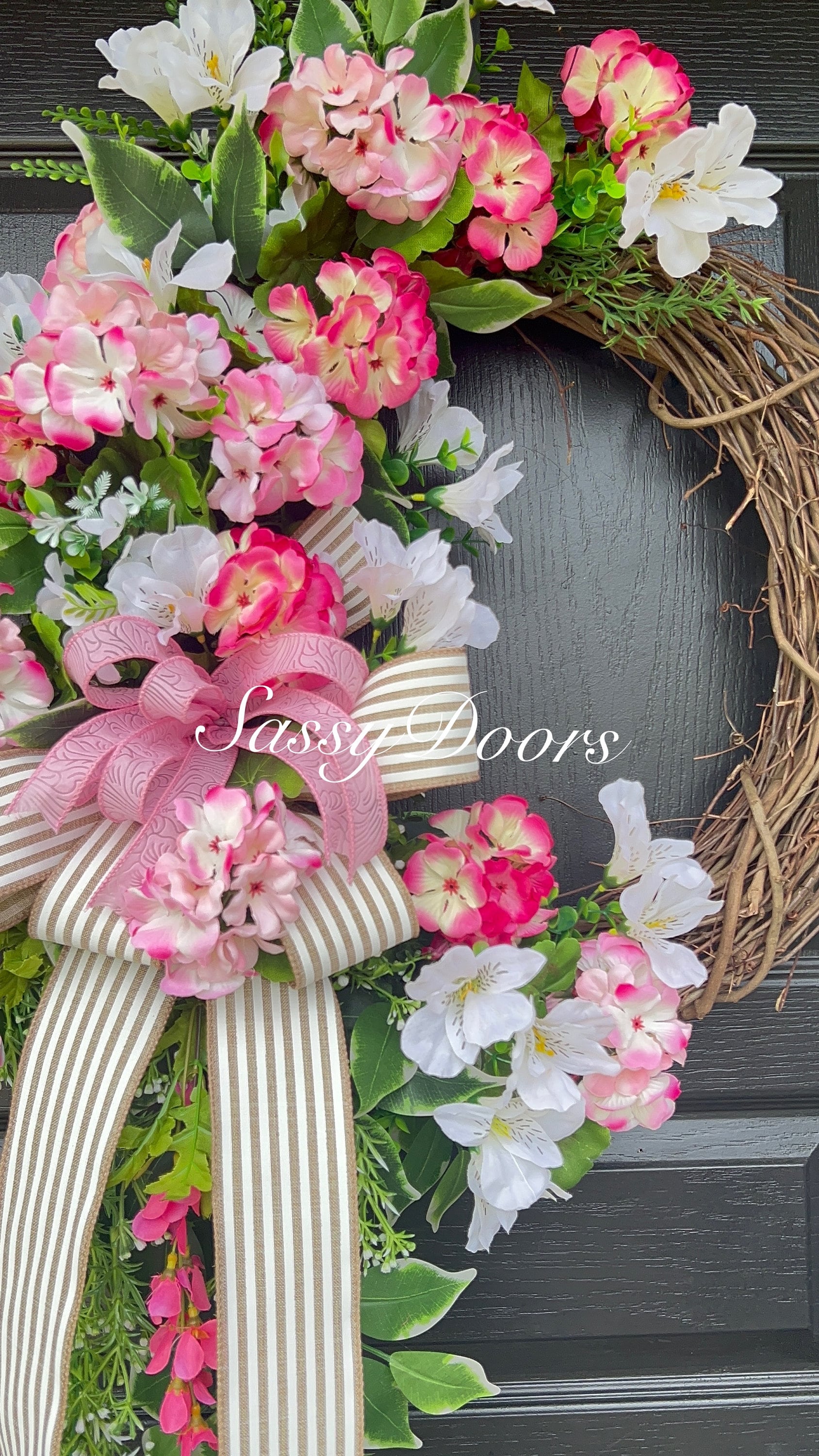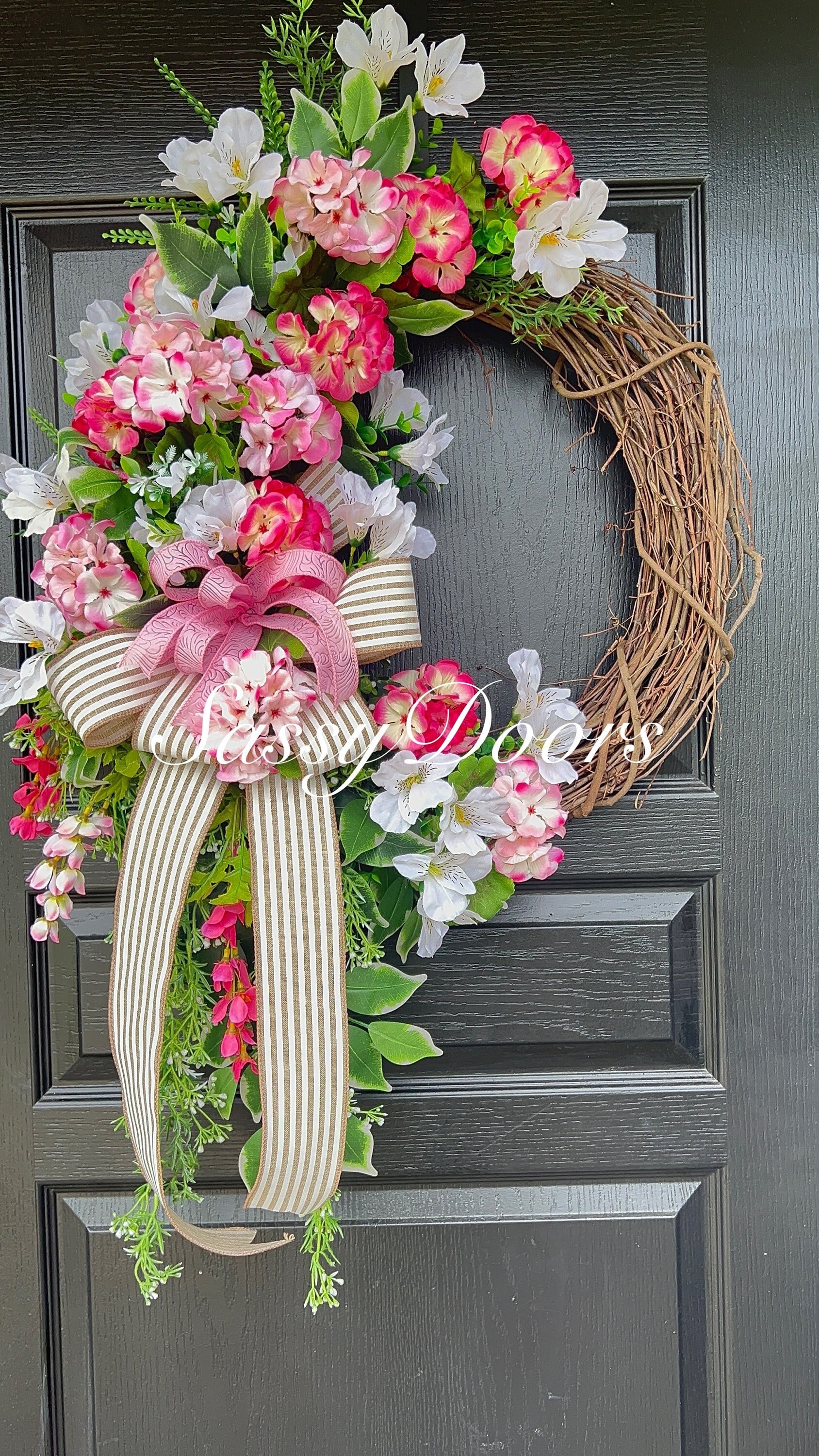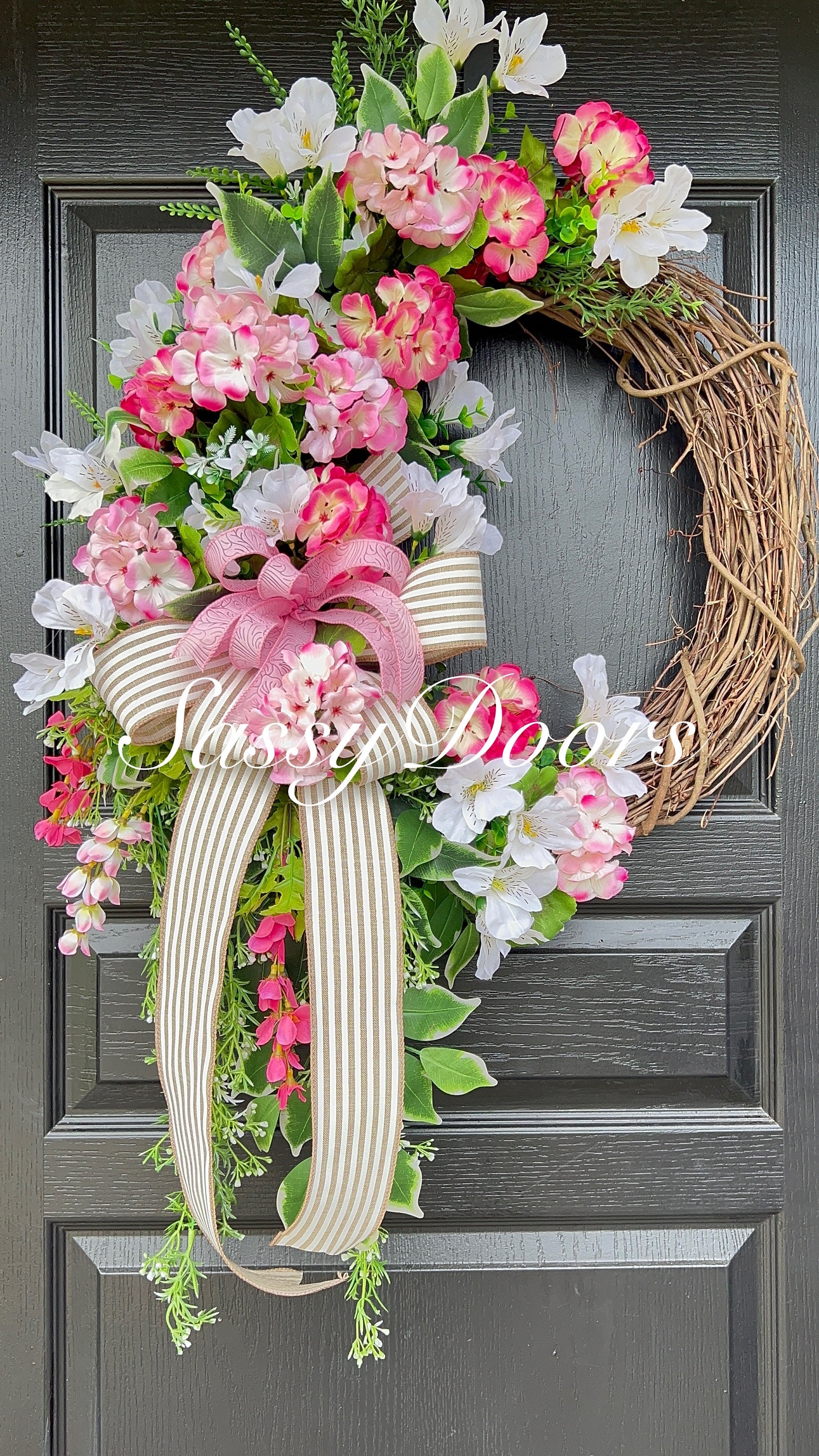 These lovely pink geranium wreath is designed on a 18" grapevine. Adorned with a beautiful array flowing greenery. The stripe ribbon and bows are sure to make it pop on your door!