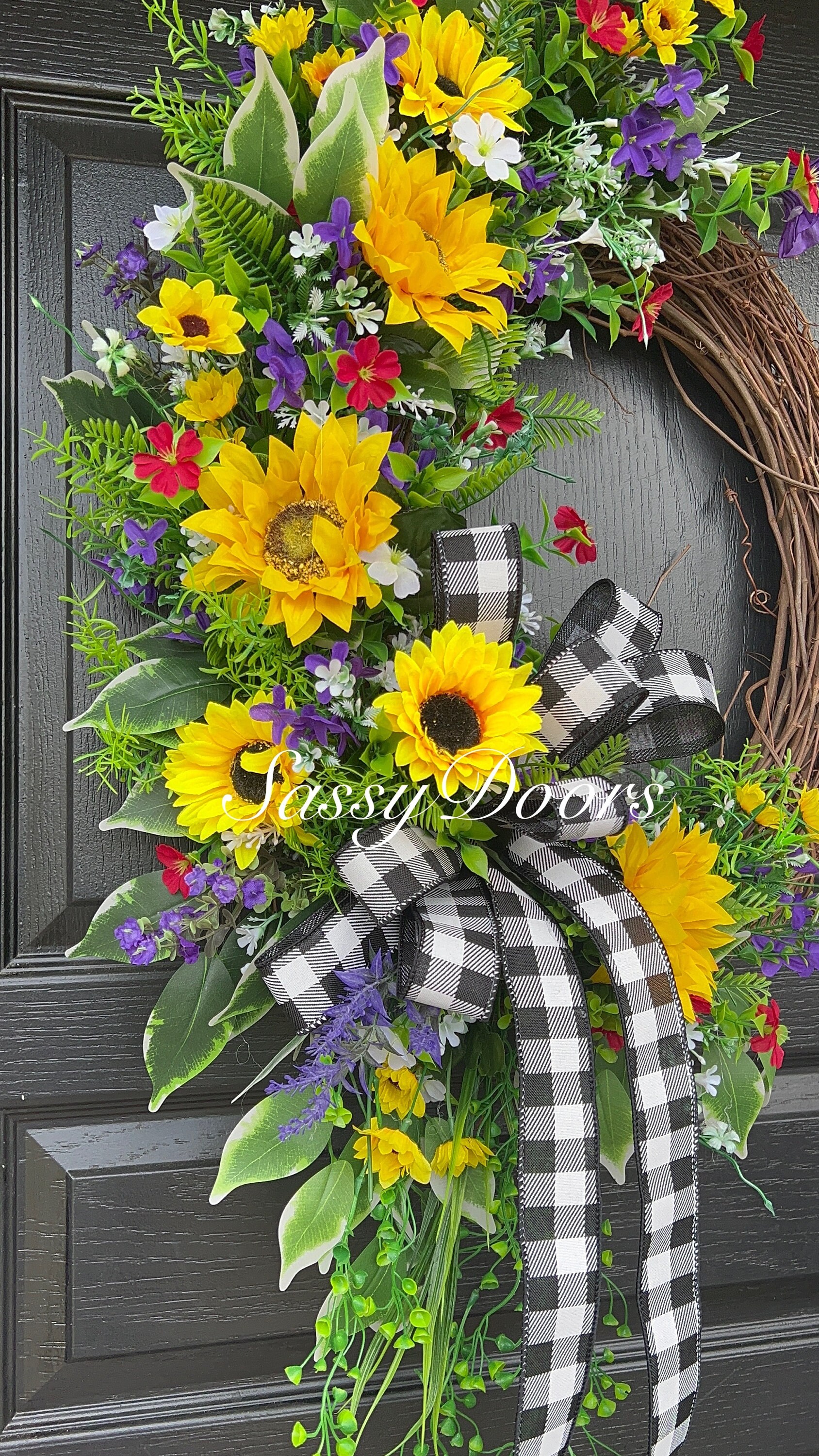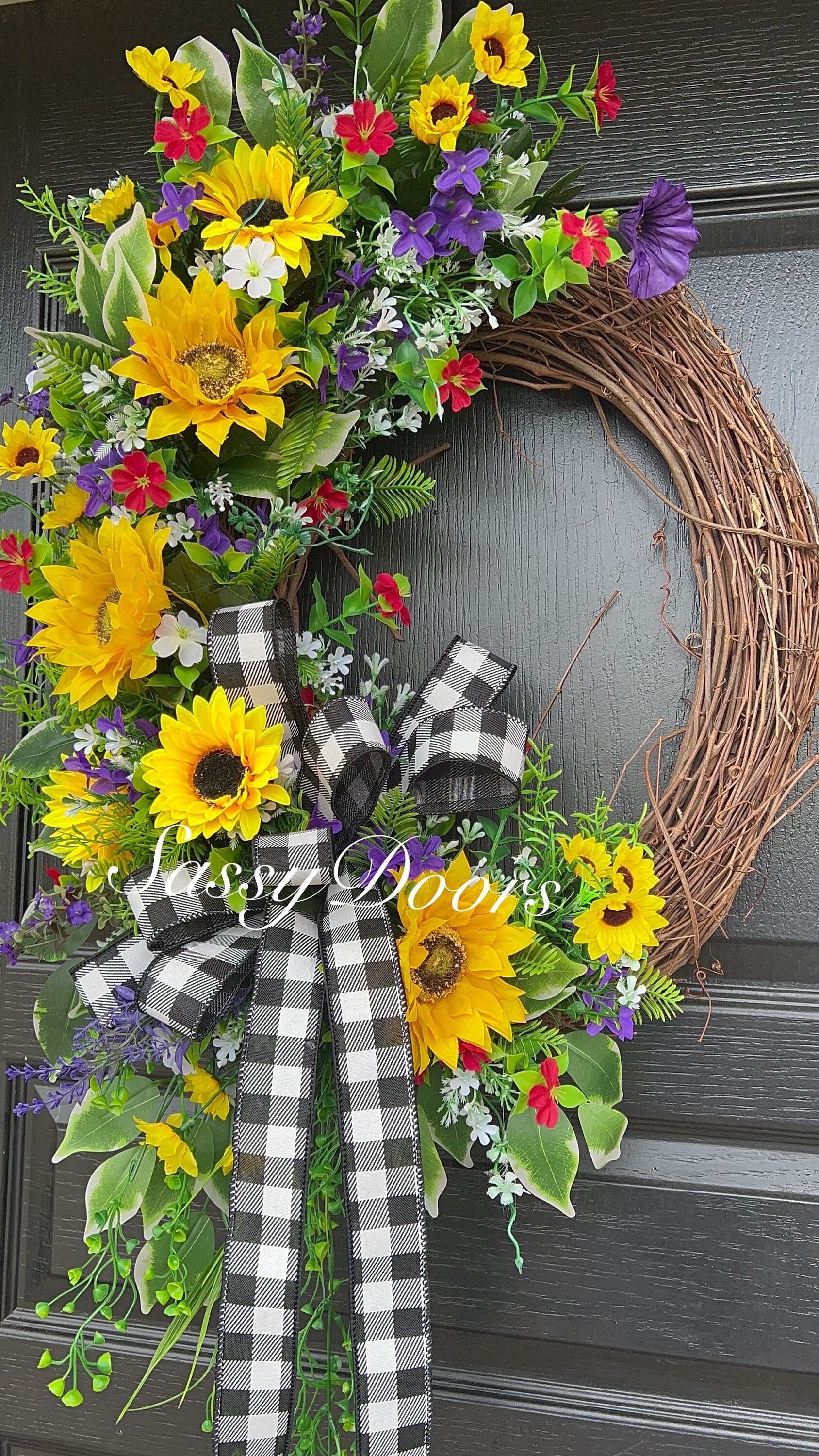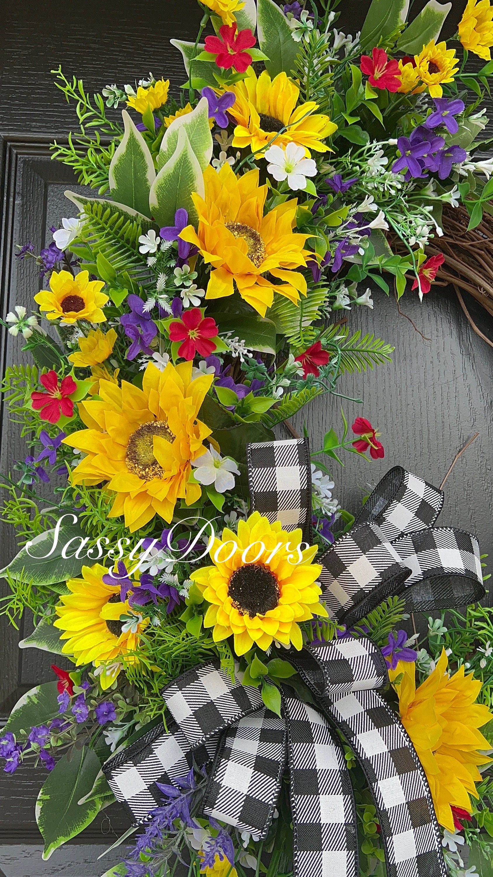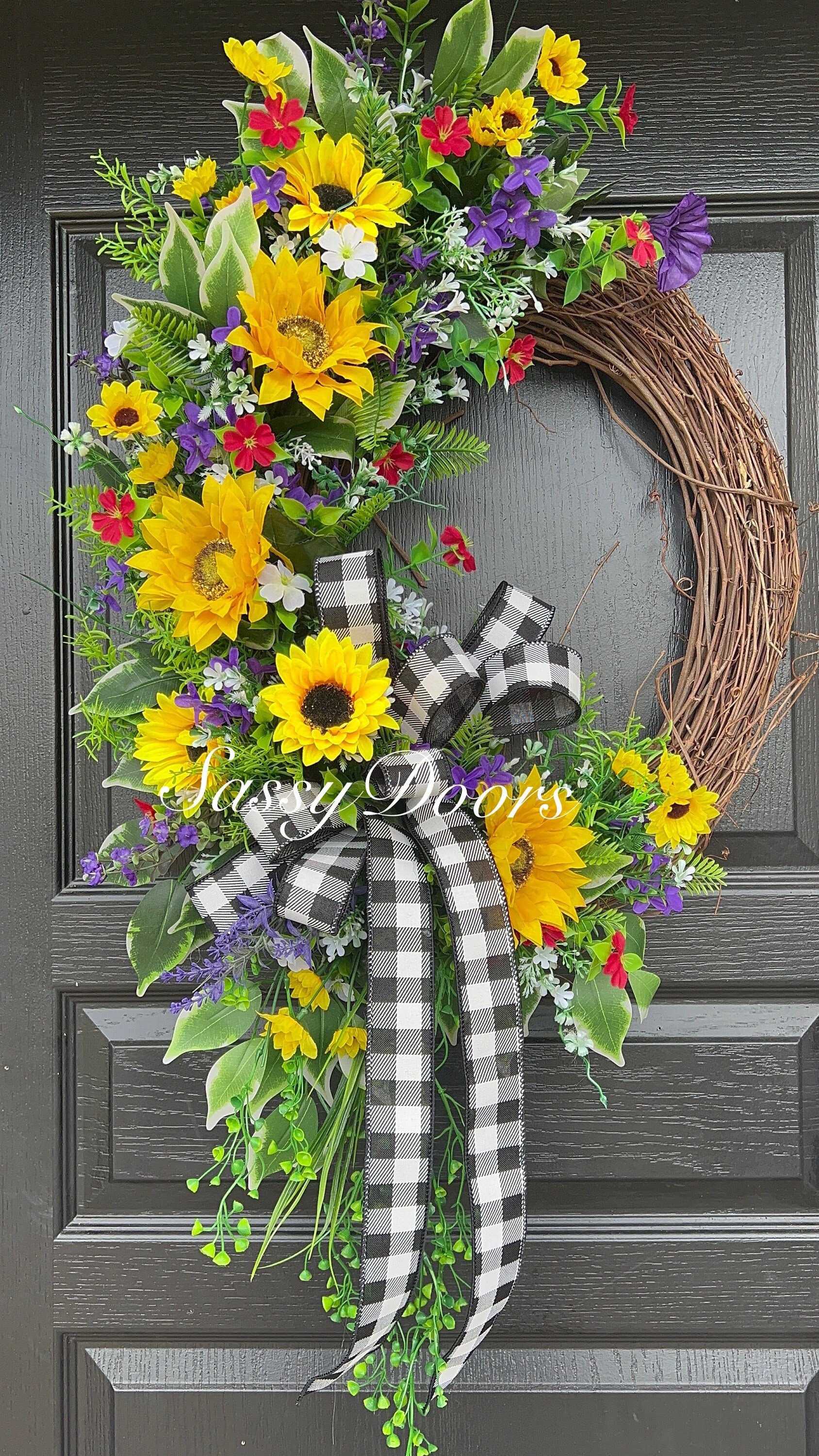 Designed on a natural grapevine wreath filled with a variety of beautiful sunflowers, a variety of silk purple and red silk flowers that just make it pop on your door! 🌻 Accented with lots of flowing greenery. The trendy buffalo plaid ribbons and bows will make it pop on your door!