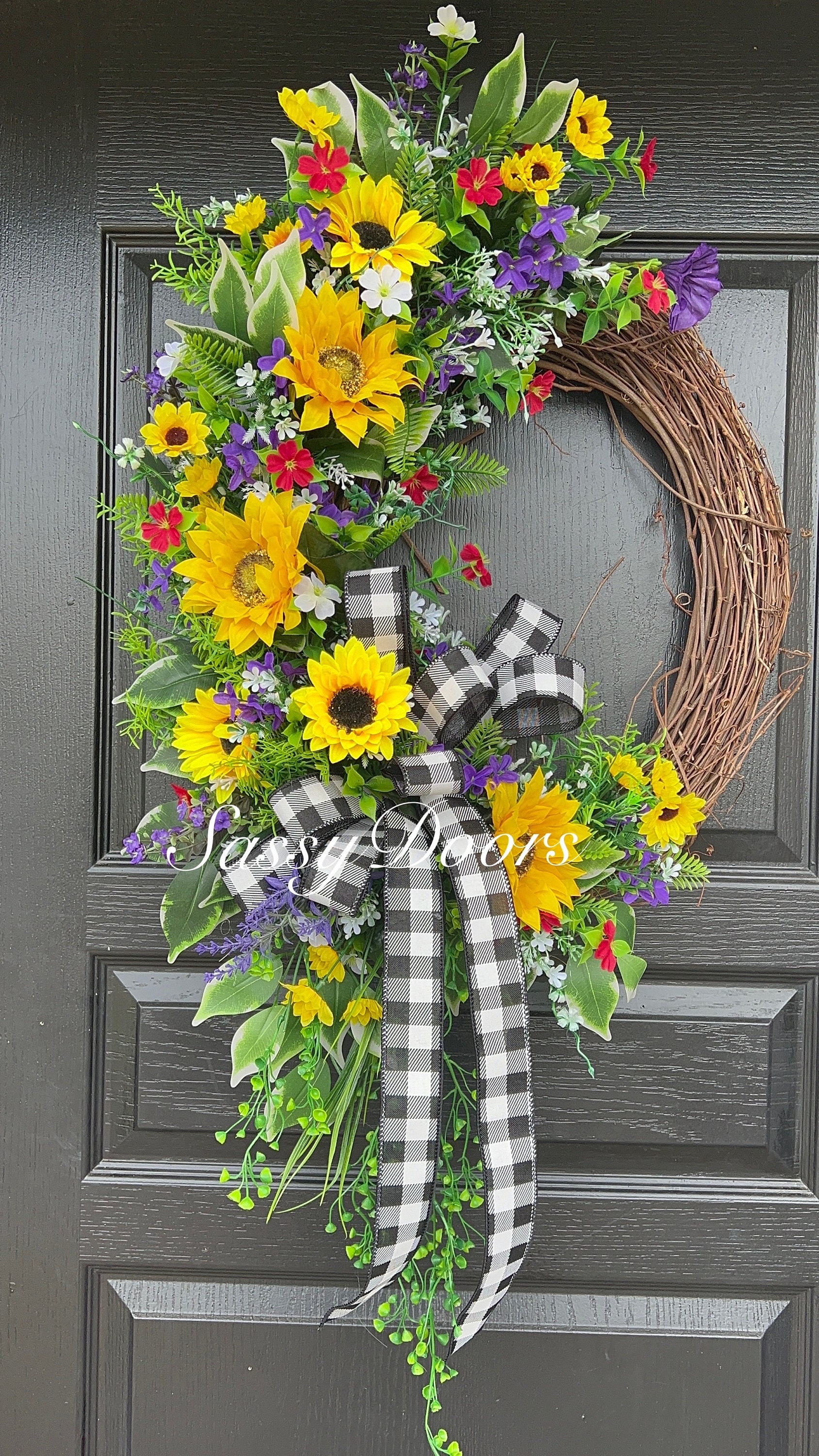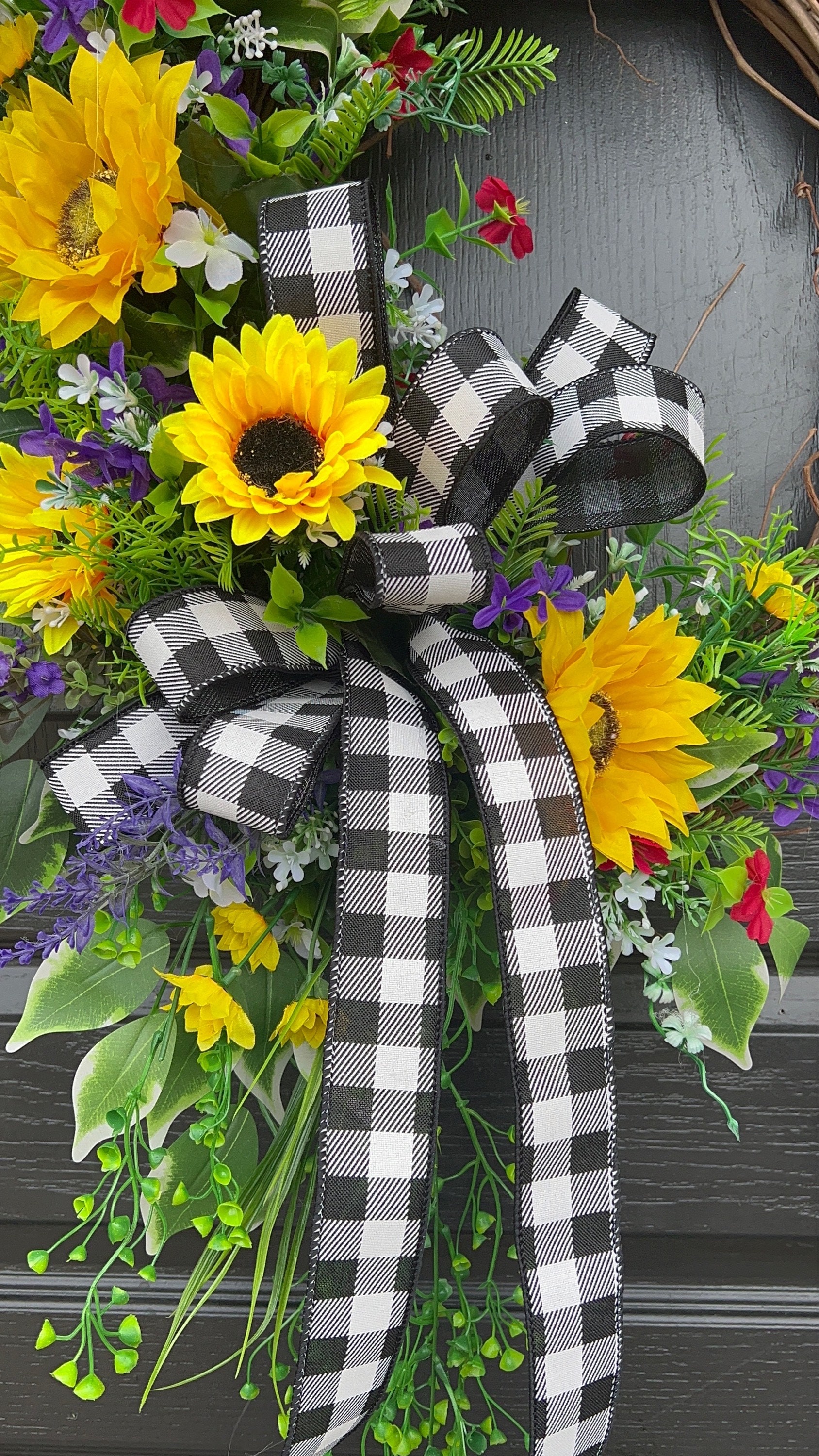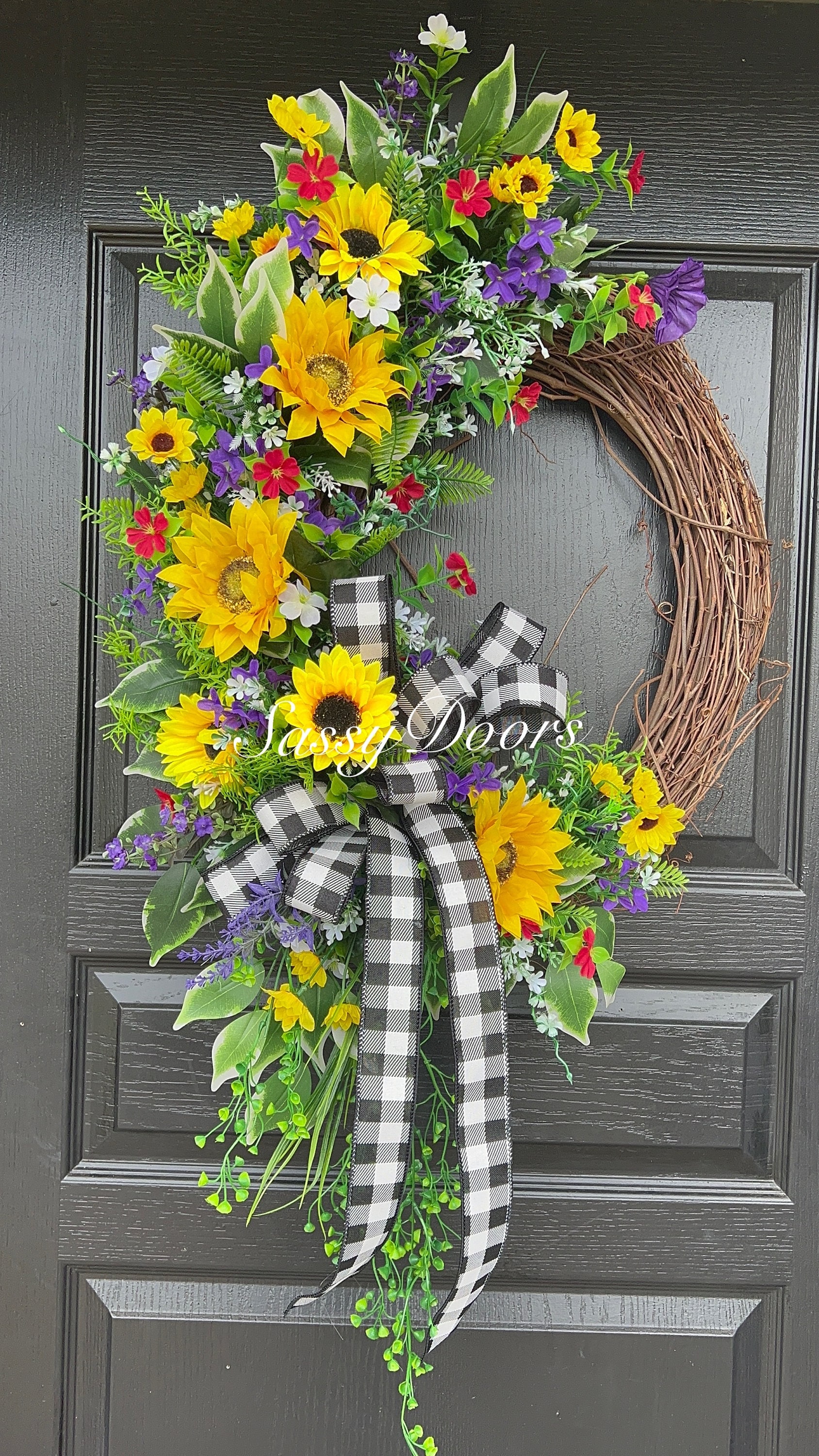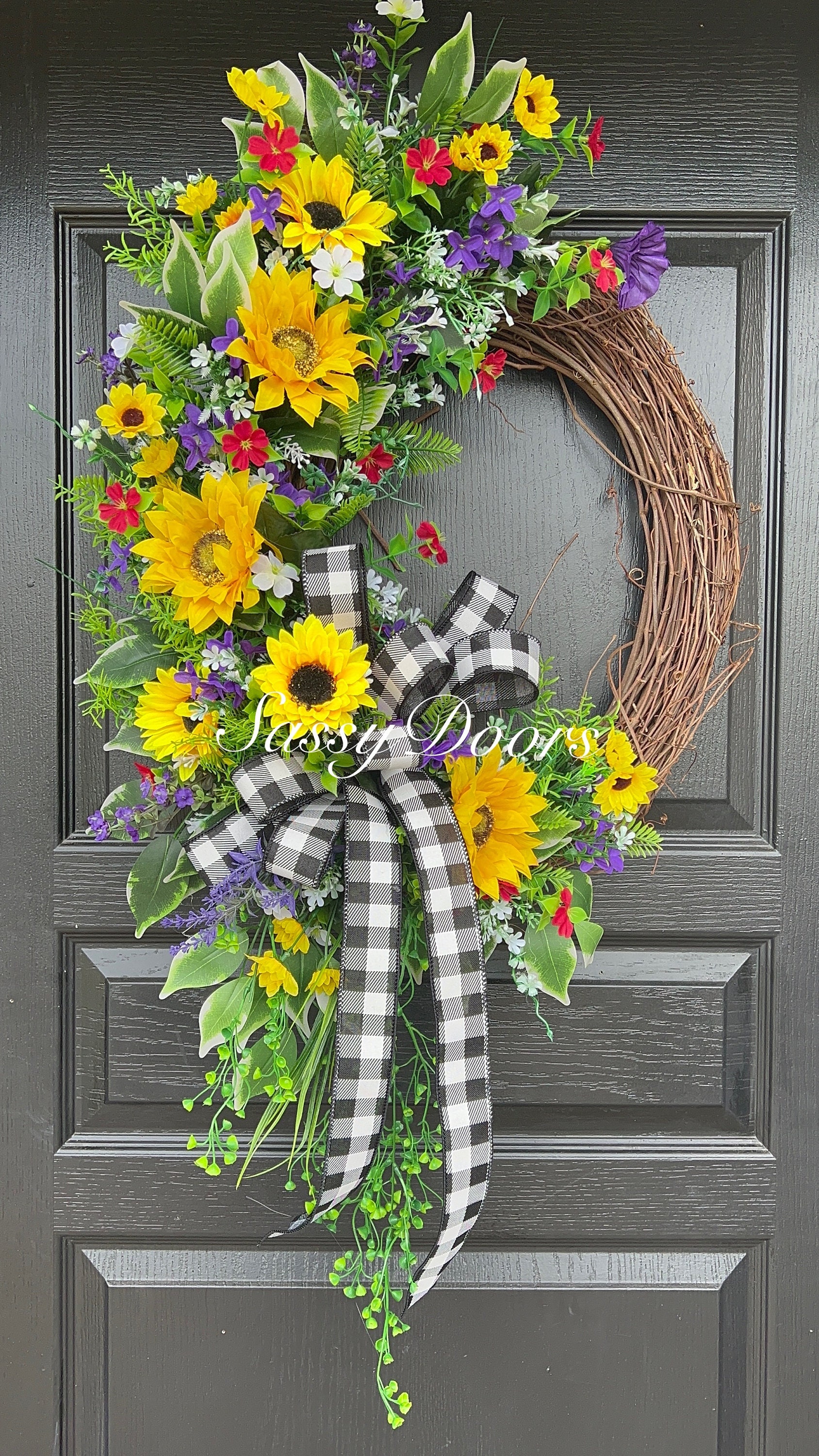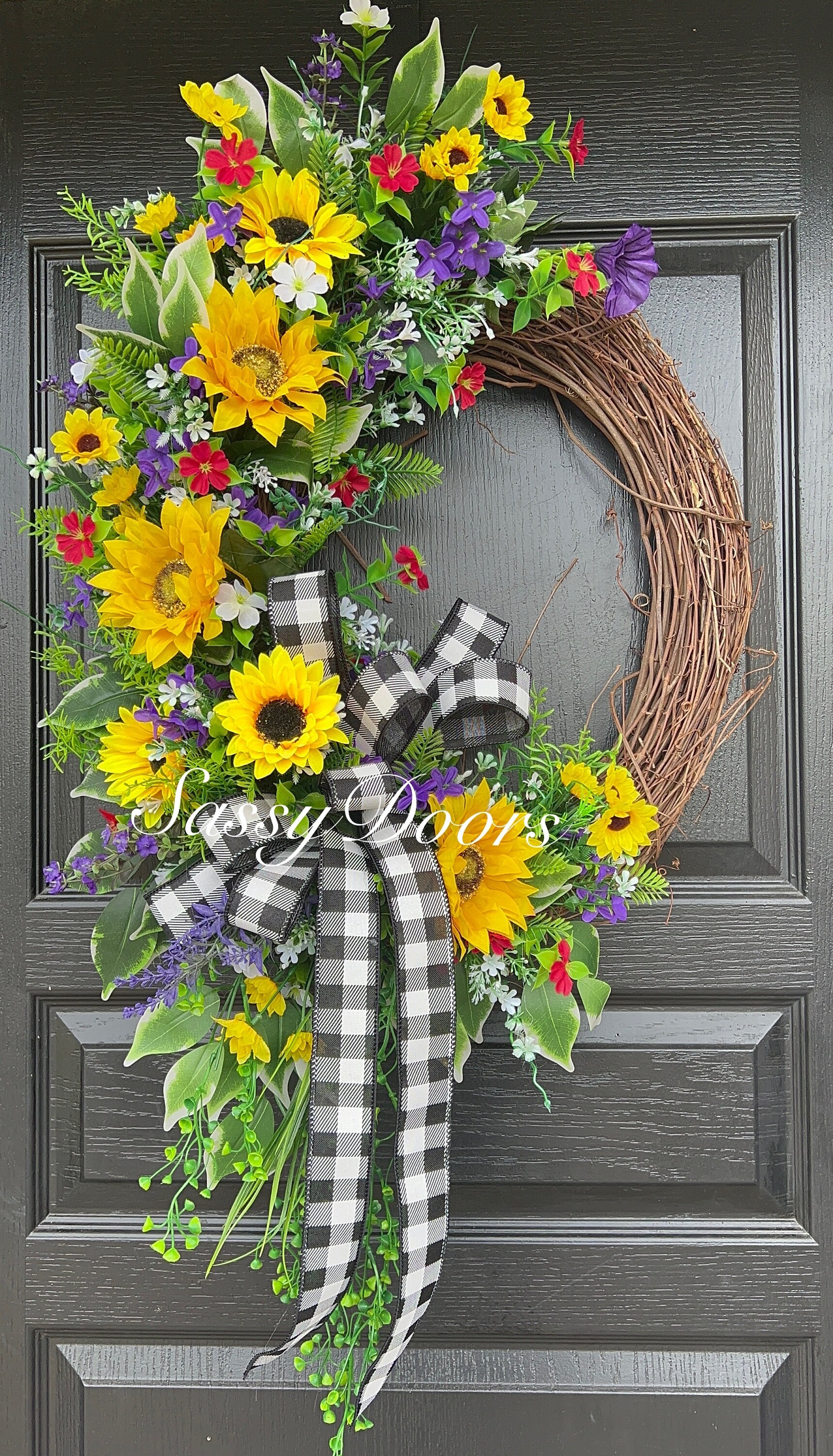 Designed on a natural grapevine wreath filled with a variety of beautiful sunflowers, a variety of silk purple and red silk flowers that just make it pop on your door! 🌻 Accented with lots of flowing greenery. The trendy buffalo plaid ribbons and bows will make it pop on your door!