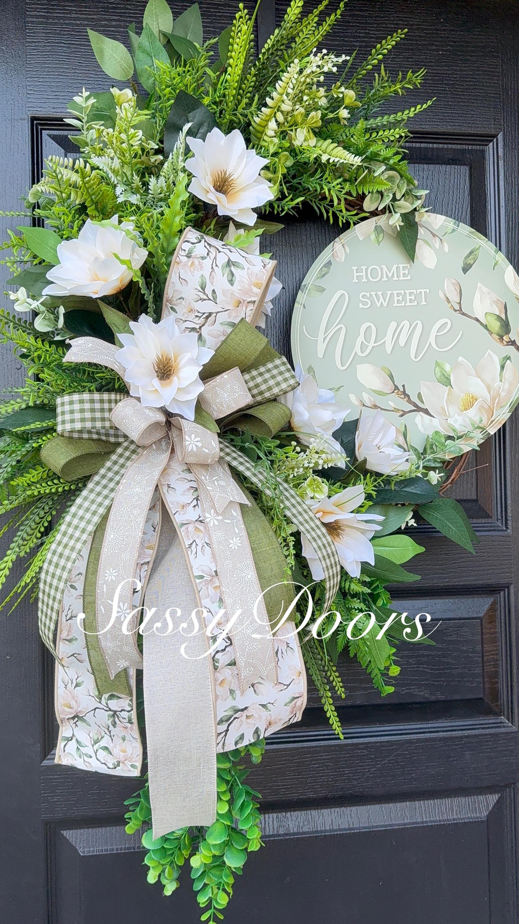 Designed on a natural grapevine wreath and adorned with stunning cream silk magnolias, grass and greenery. Perfect to display when transitioning into other seasons or you can display this wreath everyday.