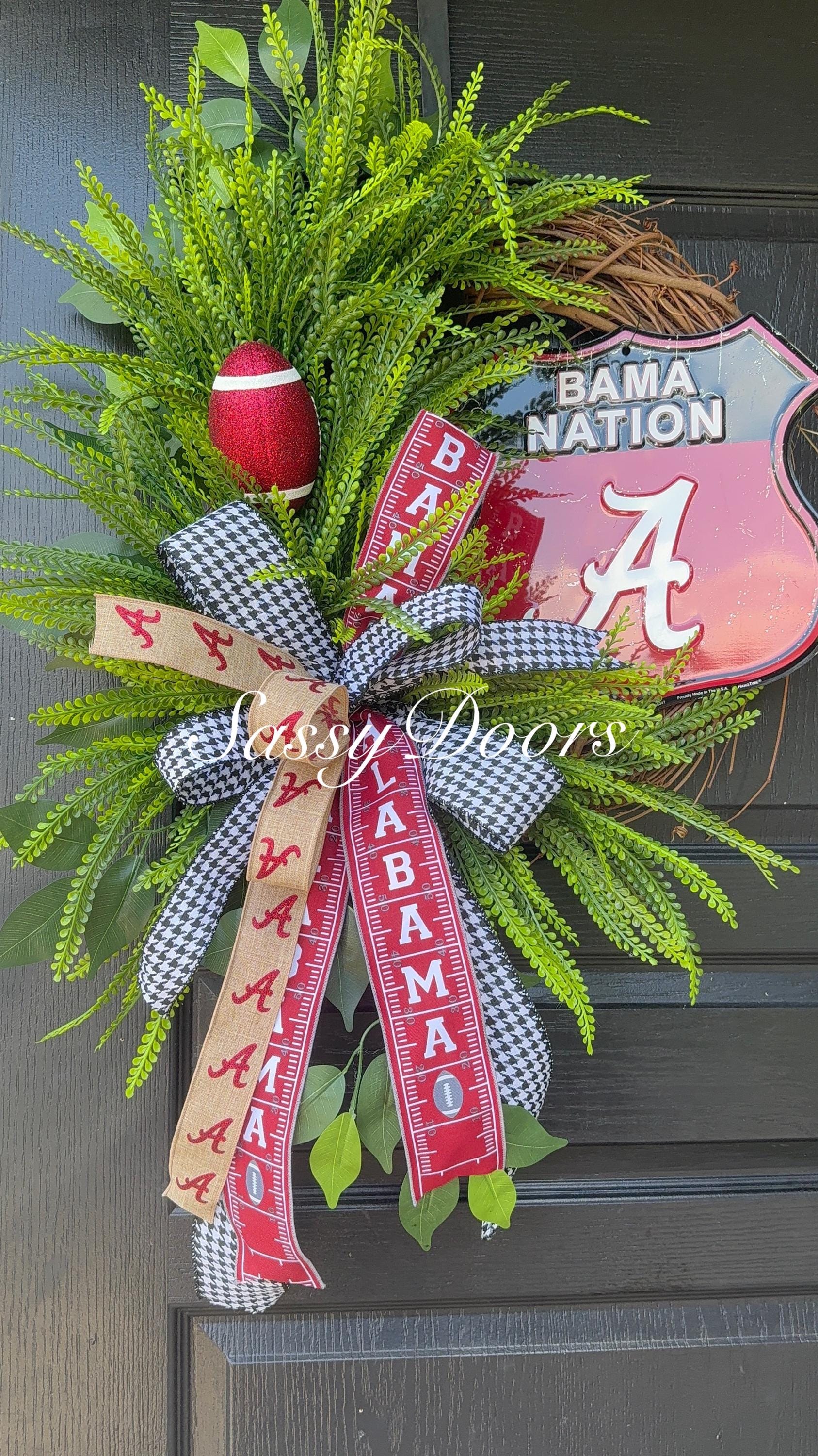 Designed on a natural grapevine wreath. A fully licensed metal sign is centered as the focal point and makes a statement as to who your favorite team is !! (No infringement is intended.) …just the love of college sports fans. Accented with lots of grasses and greenery and multi ribbons and bows. This wreath is the perfect for game day! Sure to make a bold statement on your door as it greets you and your guest.