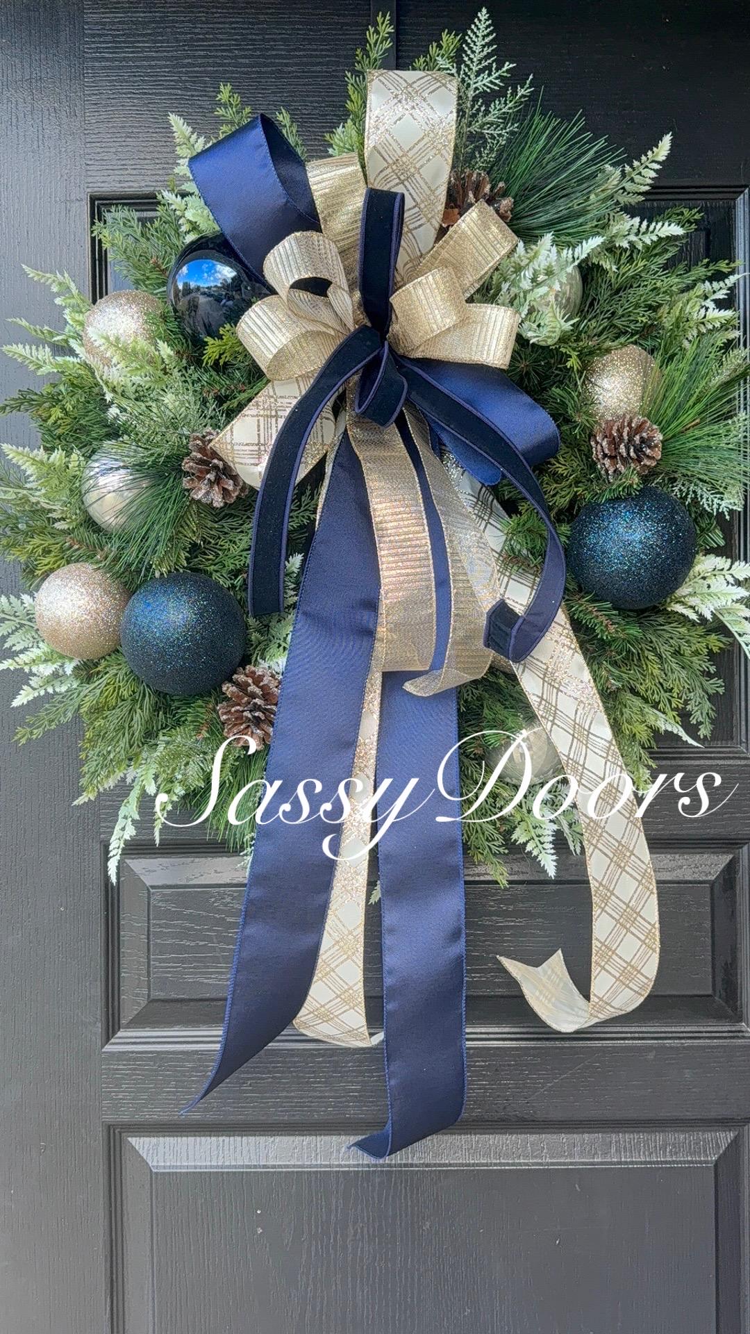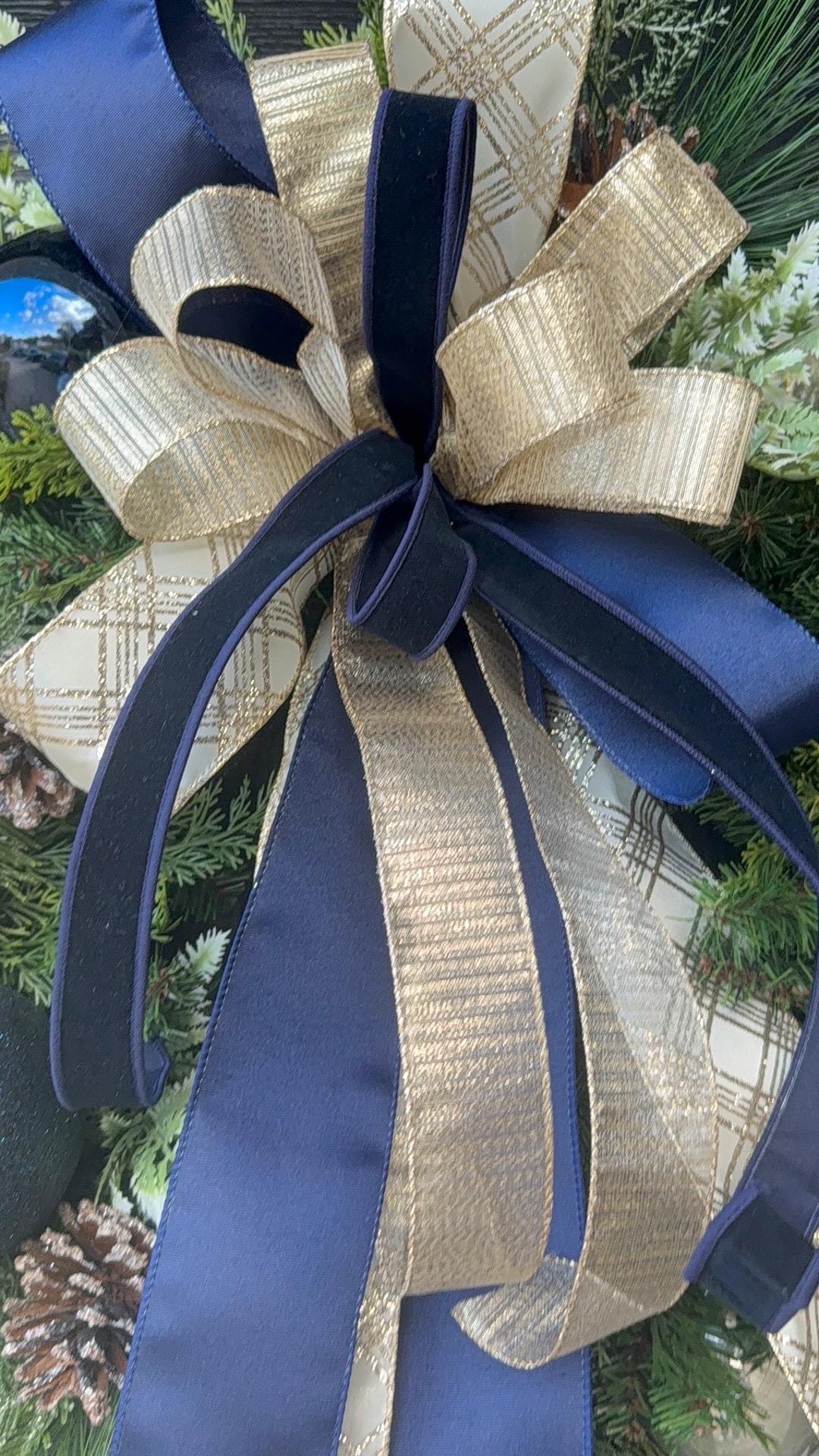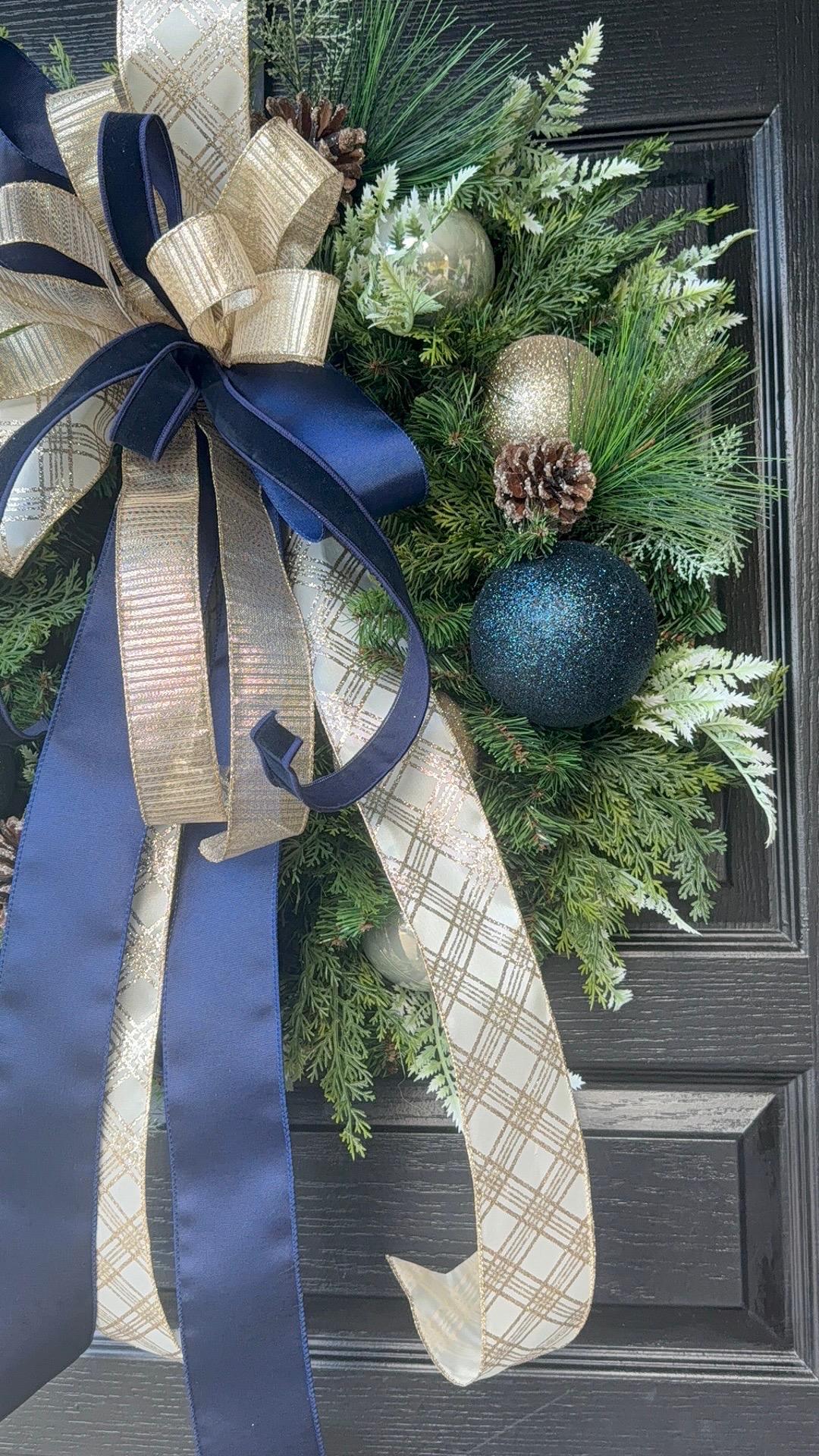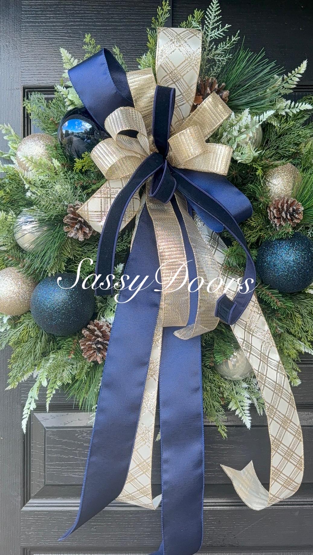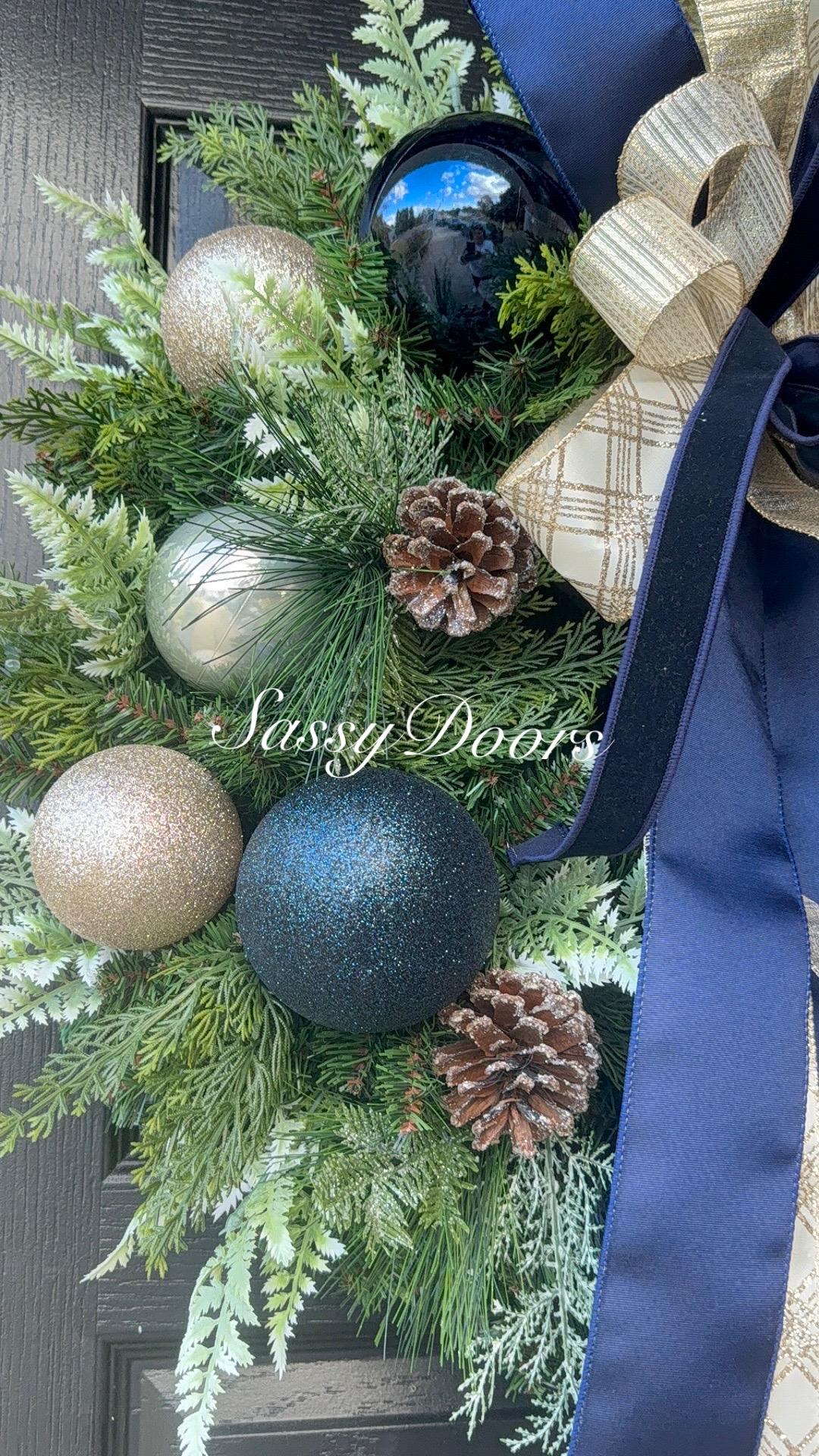 This amazing navy blue and gold Christmas Wreath is Designed on a 24” evergreen pine base.