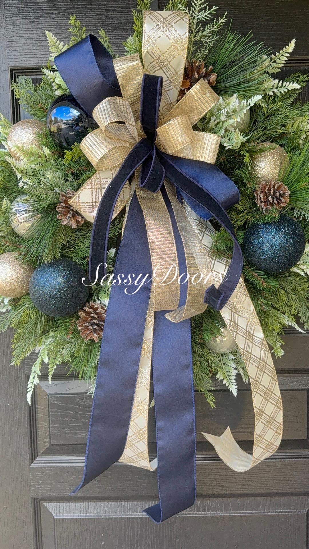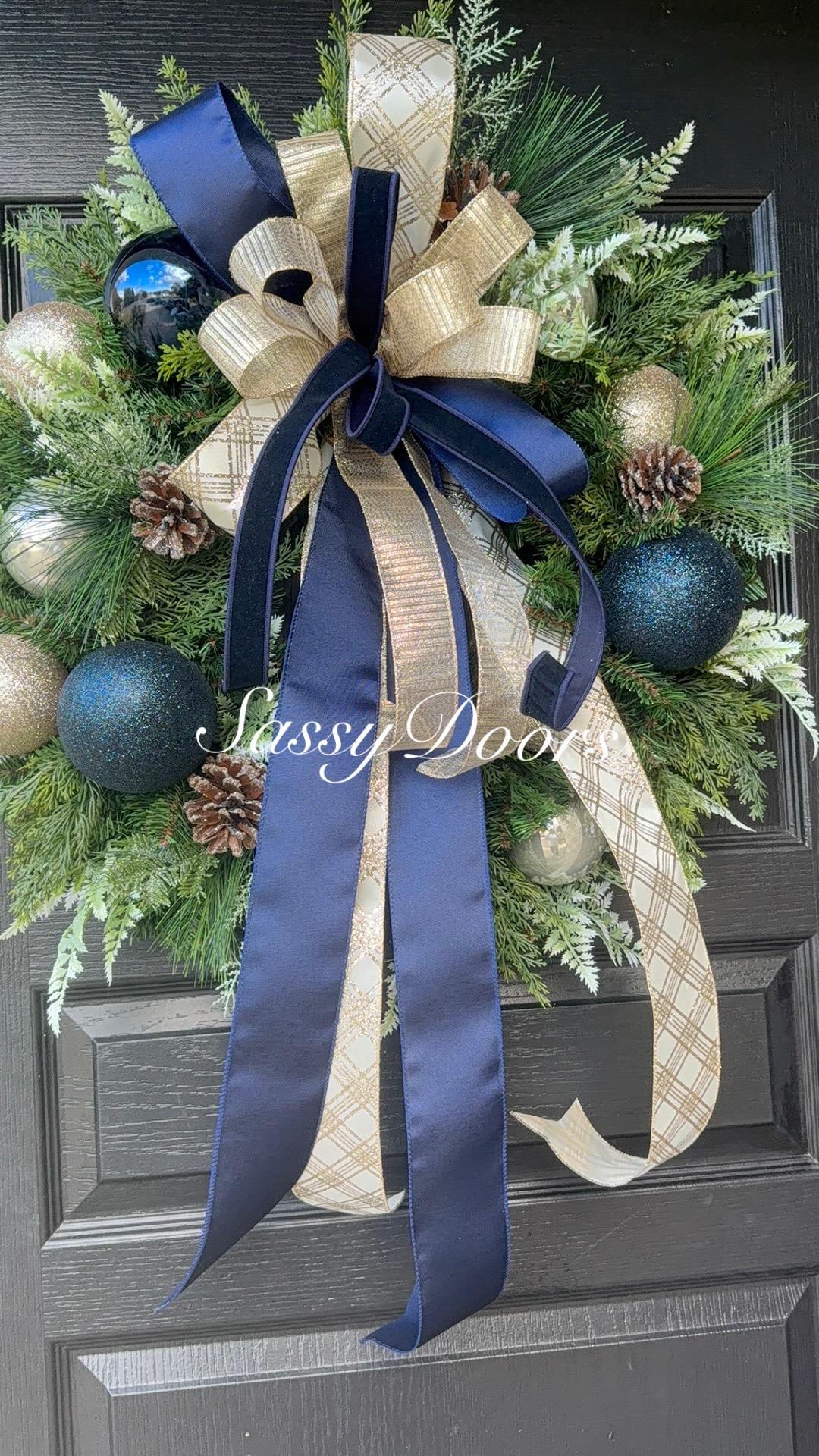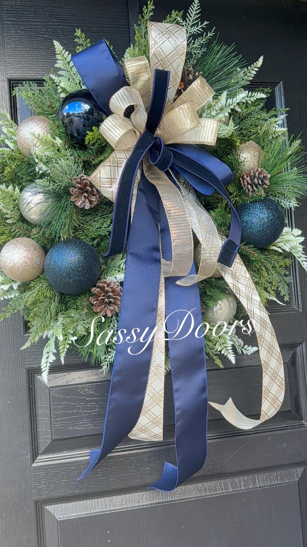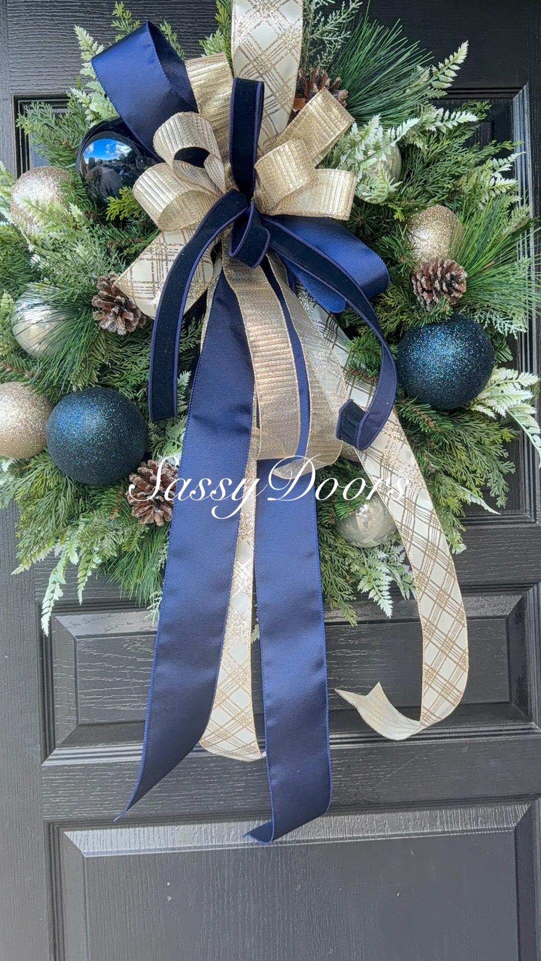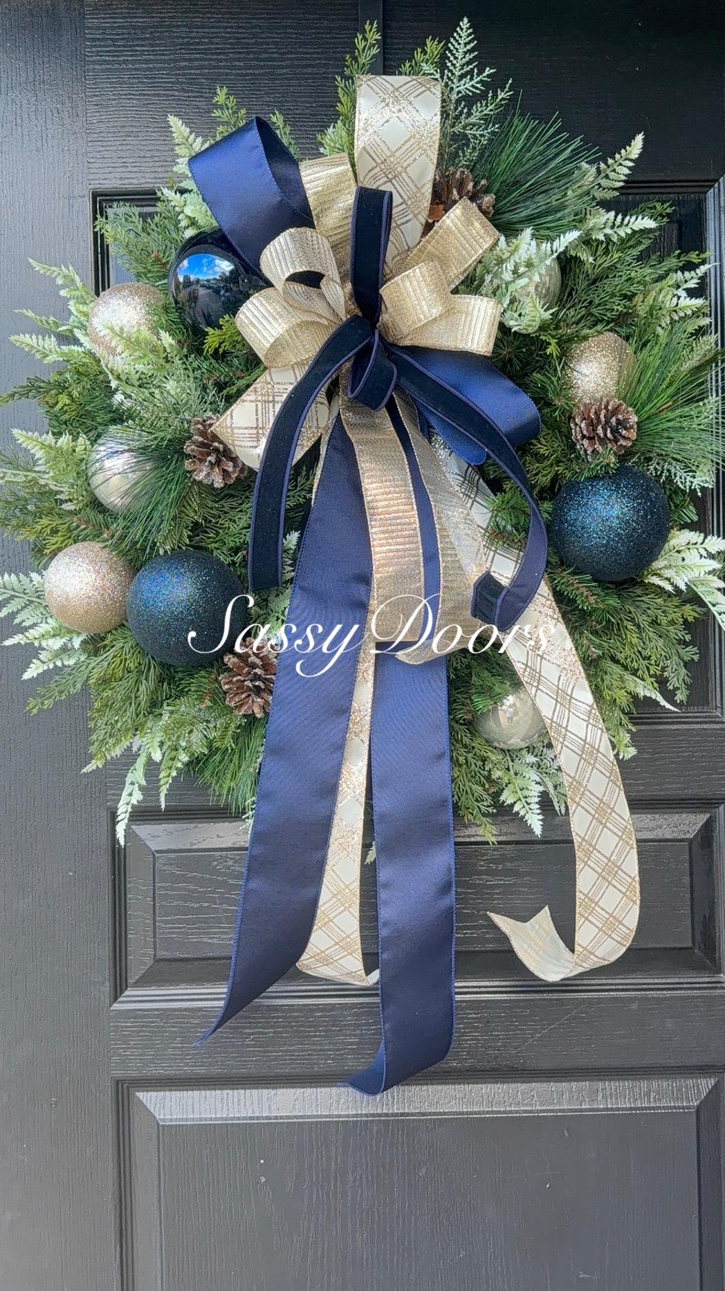 This amazing navy blue and gold Christmas Wreath is Designed on a 24” evergreen pine base.