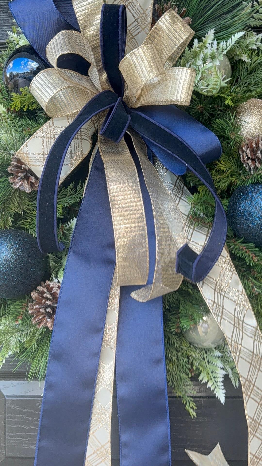 Accented with  stunning navy blue and gold ribbons and bows. The huge bow and long steamers gives this design its wow effect