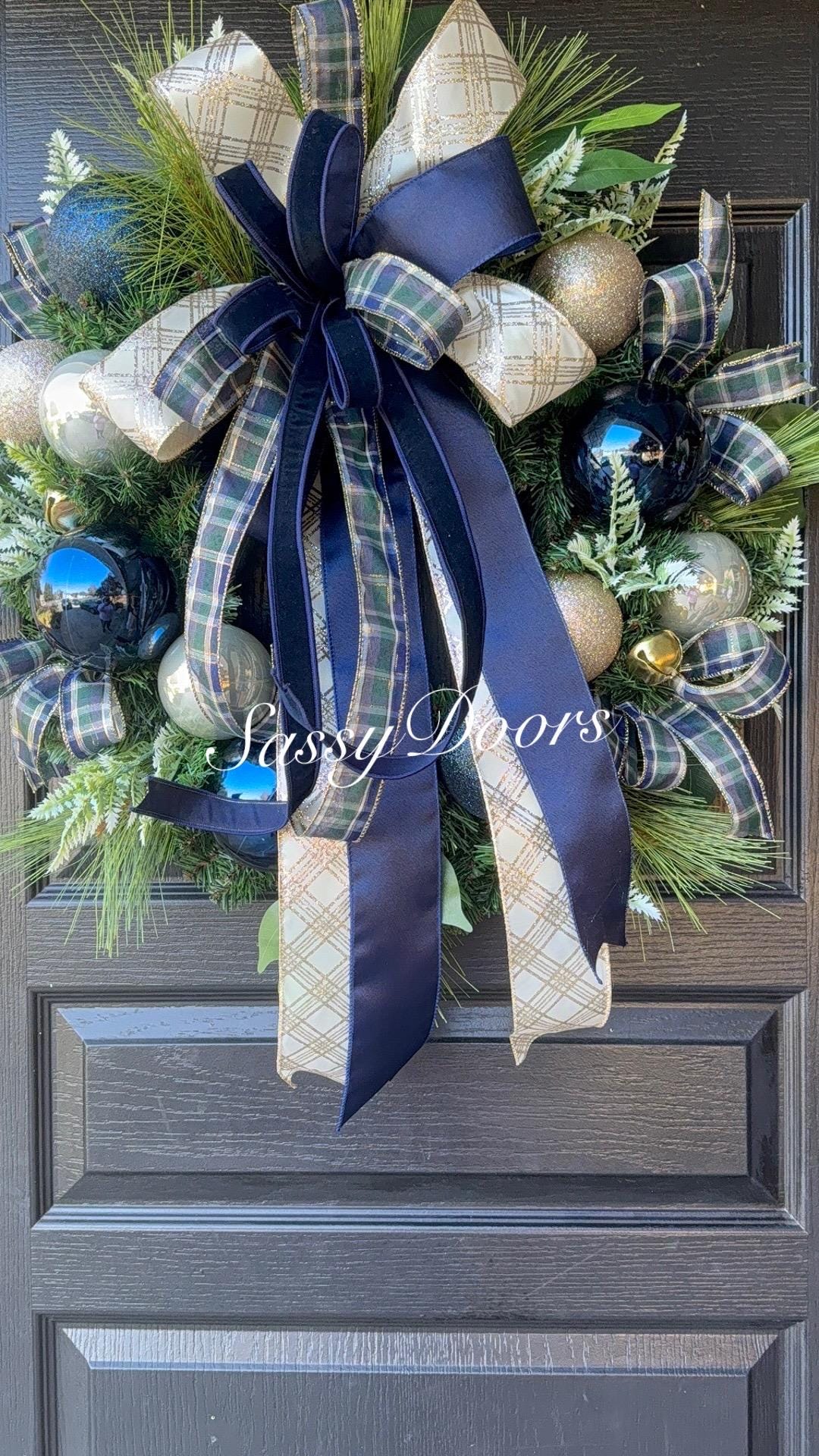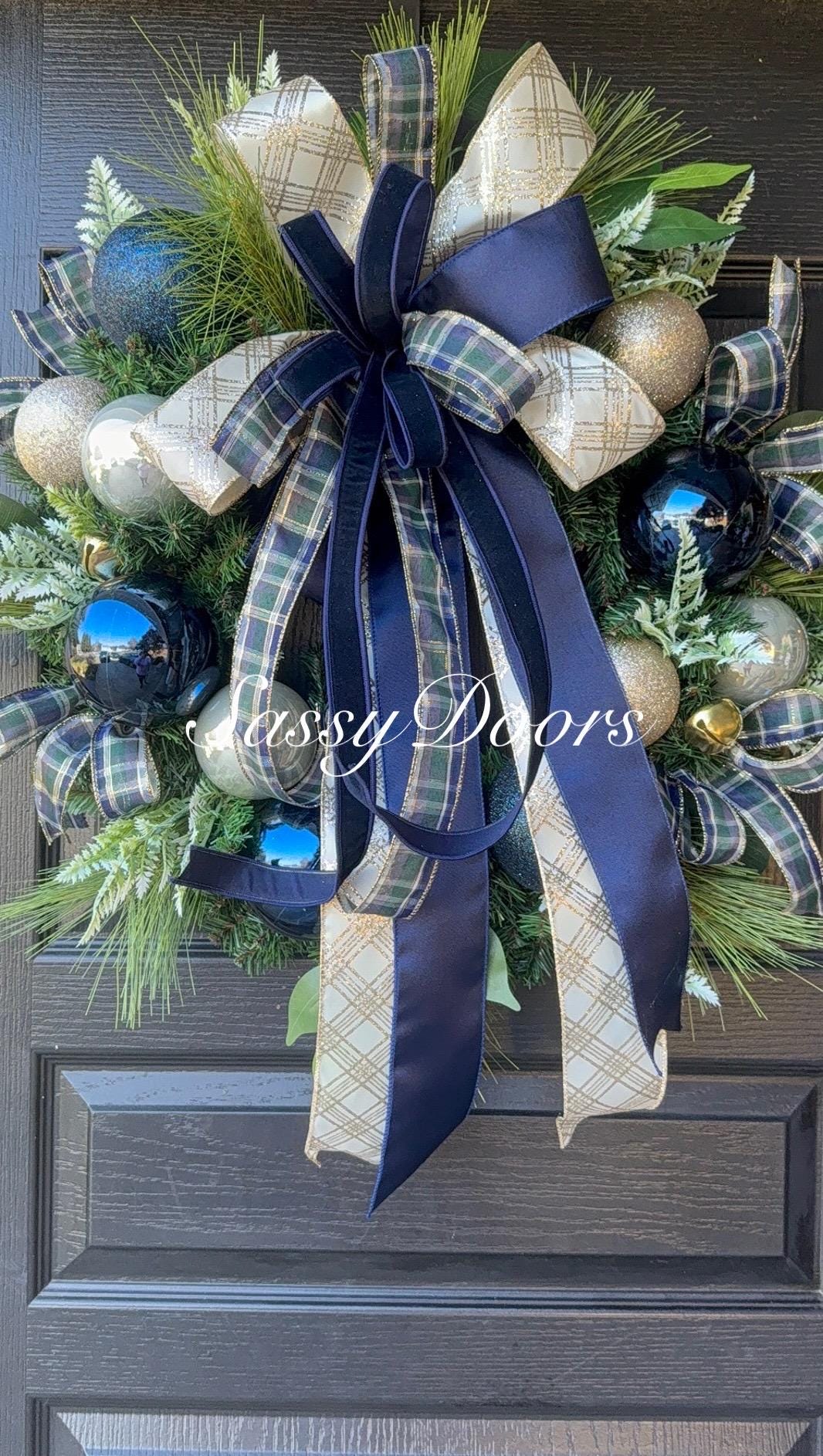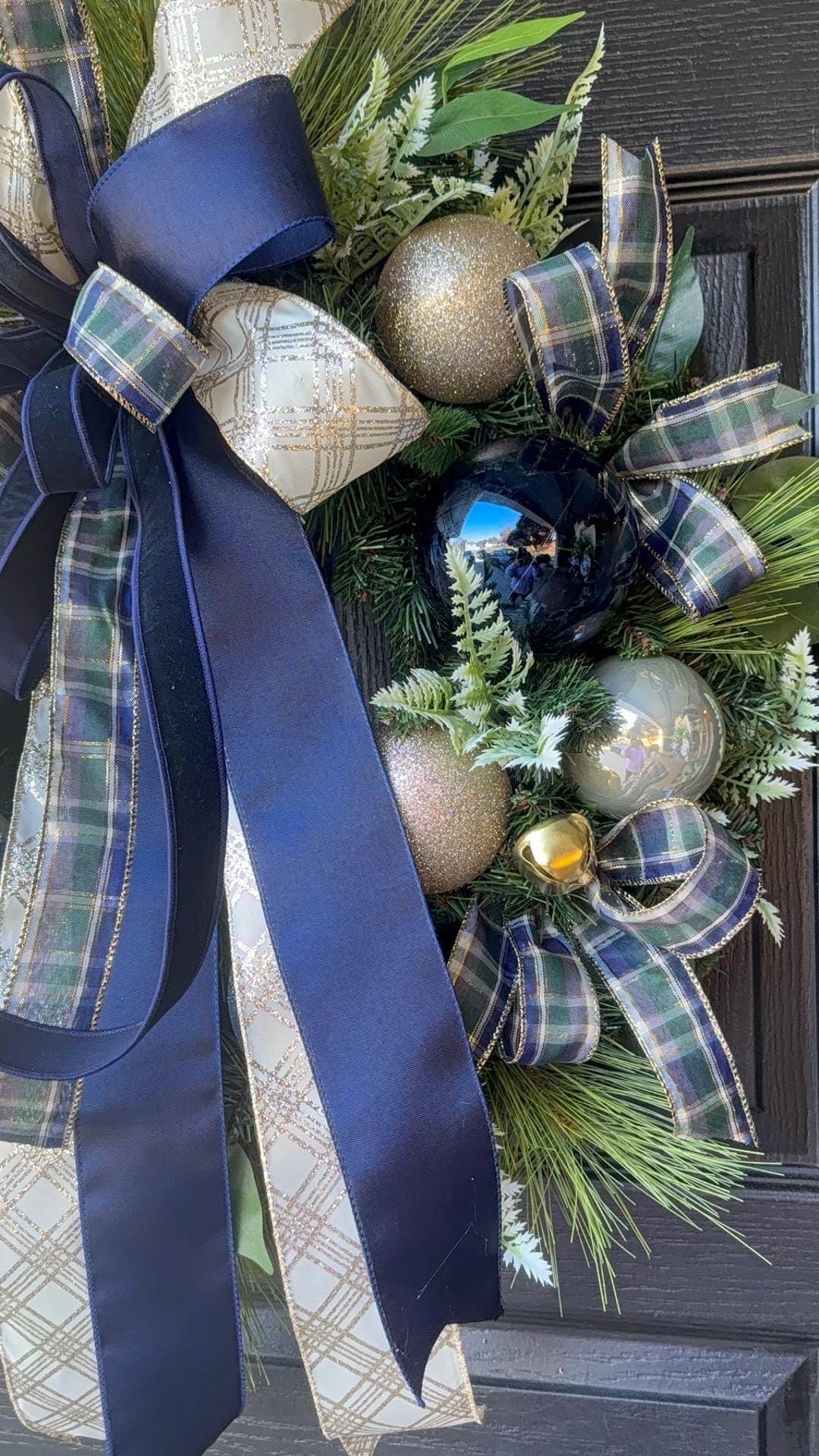 This amazing navy blue and gold Christmas Wreath is Designed on a 24” evergreen pine base.