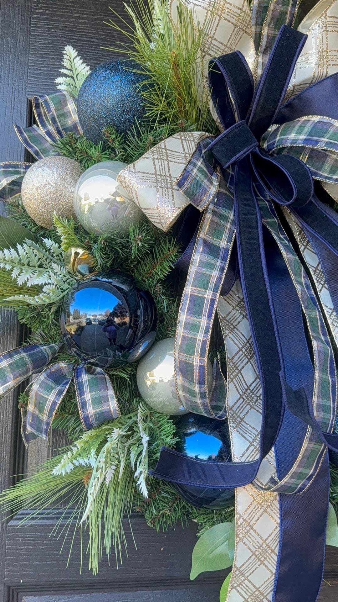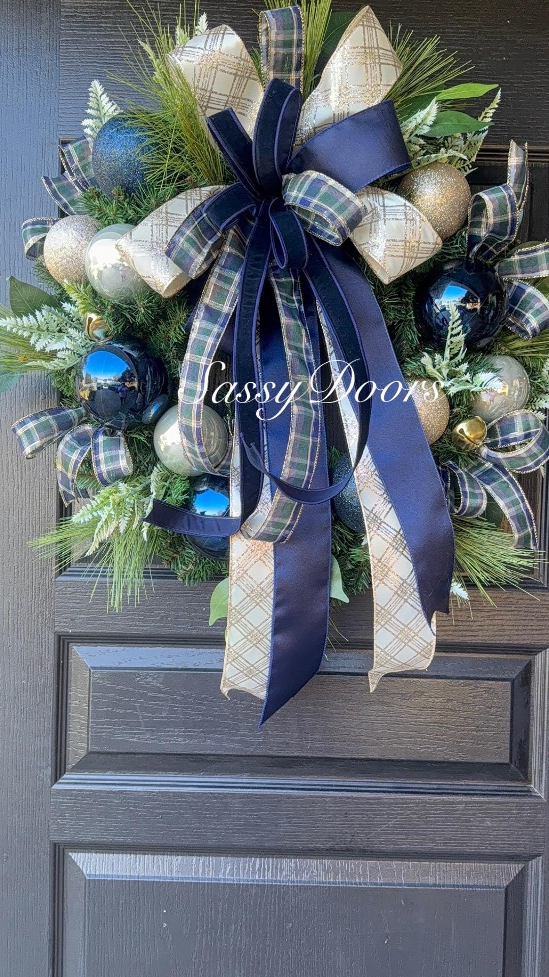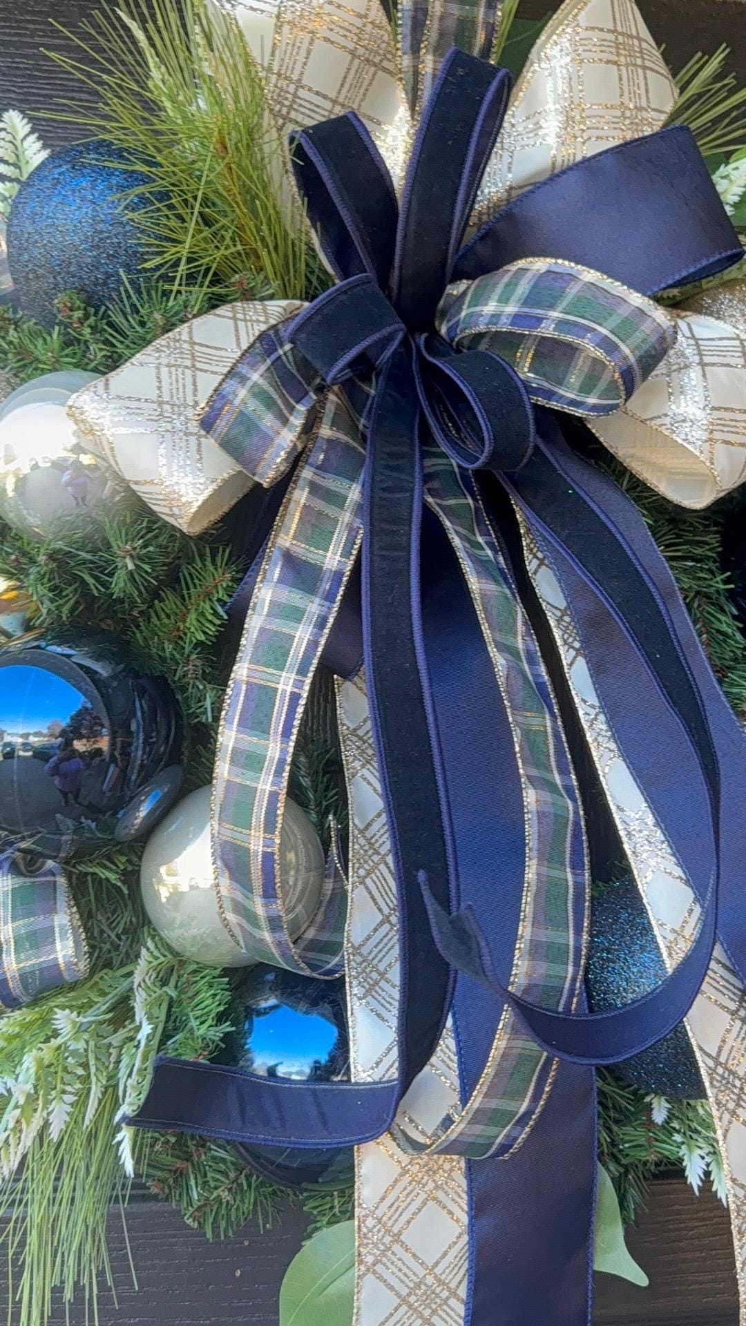 This amazing navy blue and gold Christmas Wreath is Designed on a 24” evergreen pine base.