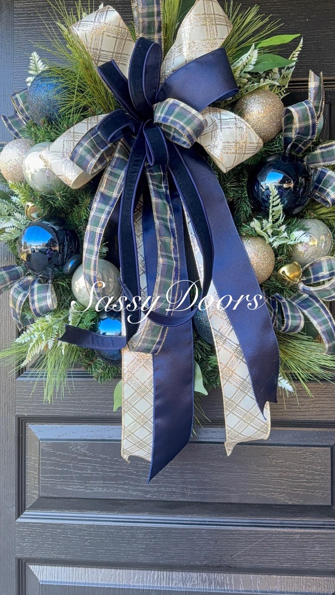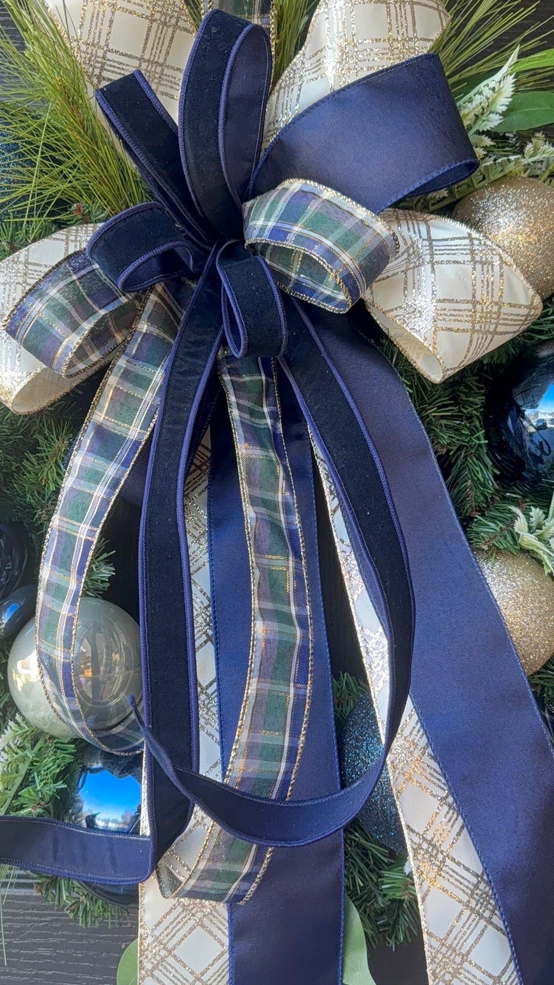 Accented with stunning navy blue, green and gold ribbons and bows. The huge bow and long steamers gives this design its wow effect