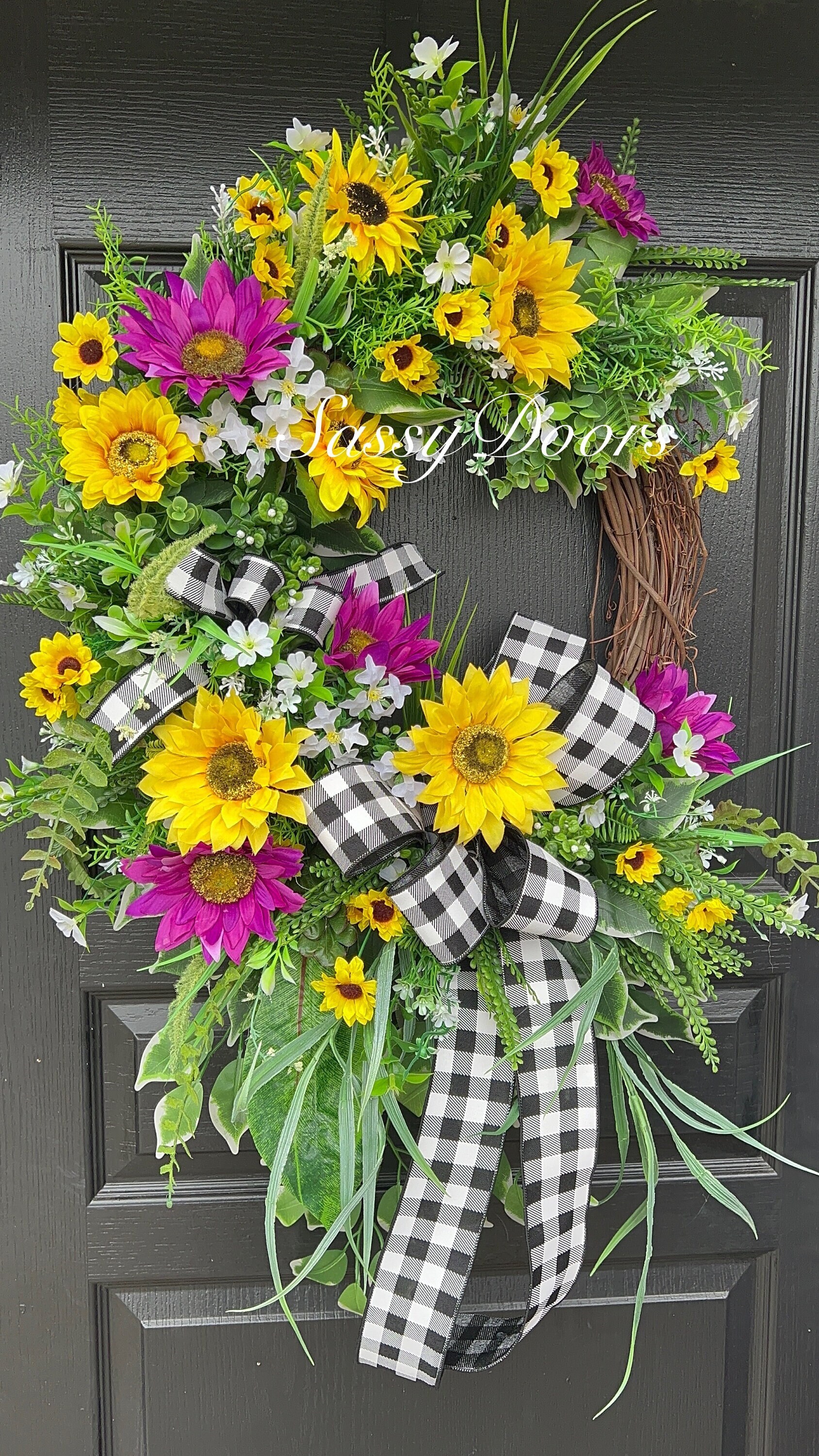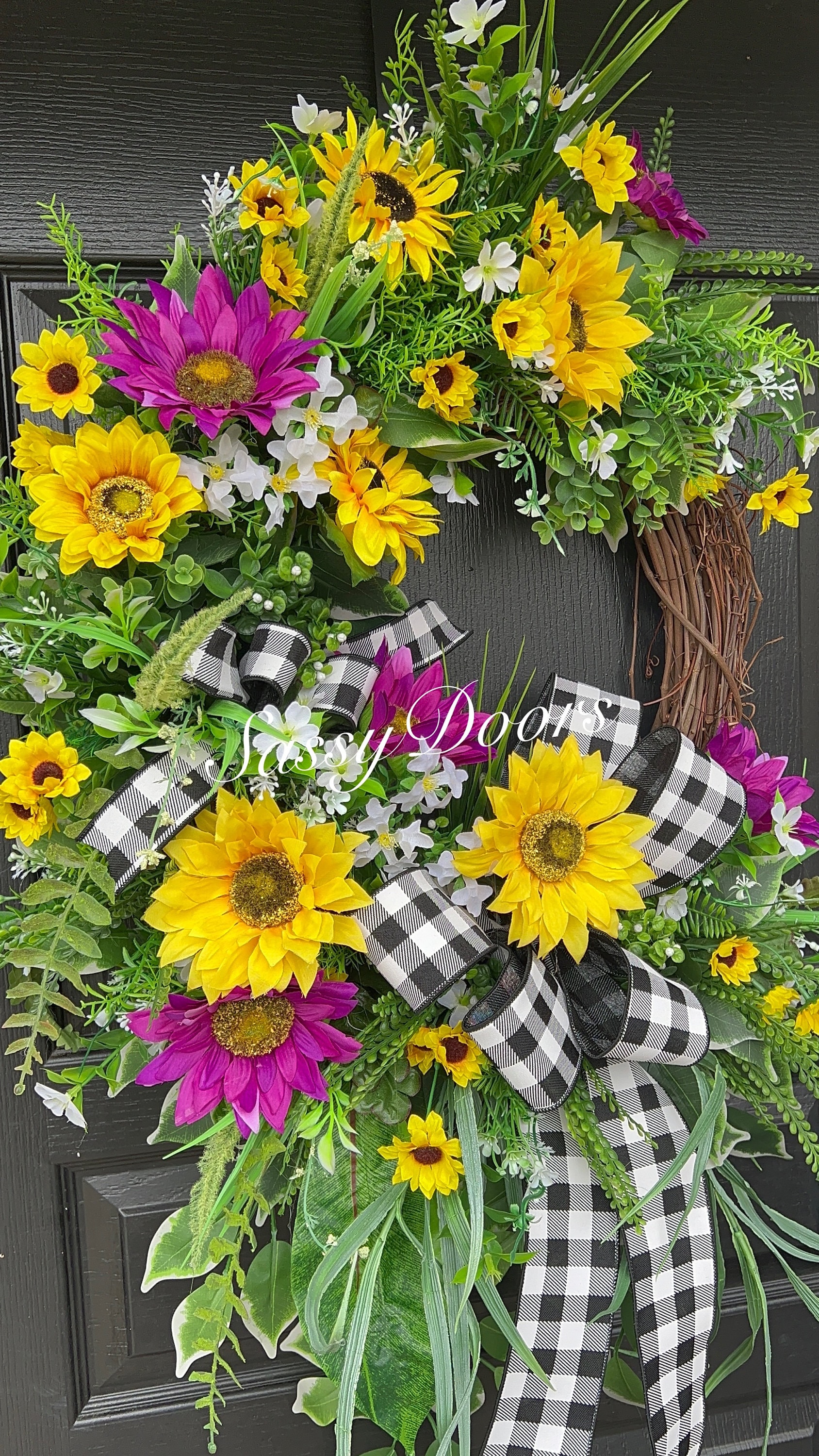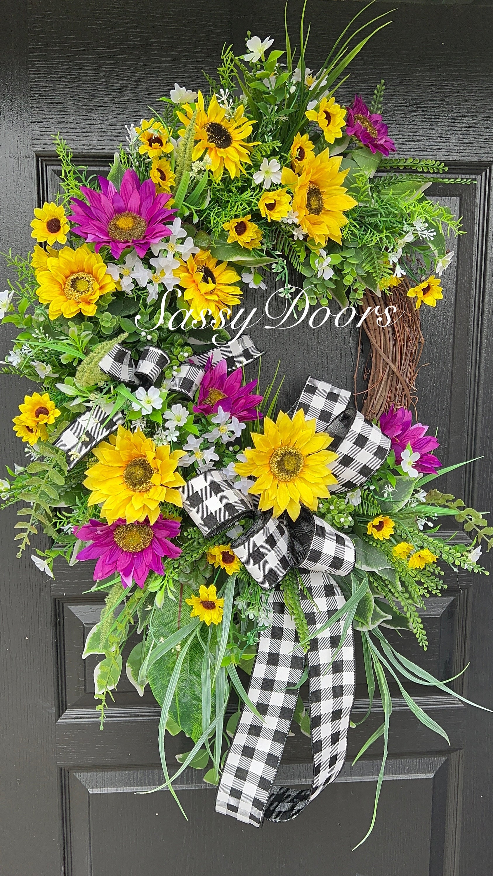 Designed on a 18' grapevine wreath filled with a variety of beautiful sunflowers 🌻 and flowing greenery. The trendy buffalo plaid ribbons and bows will make it pop on your door!