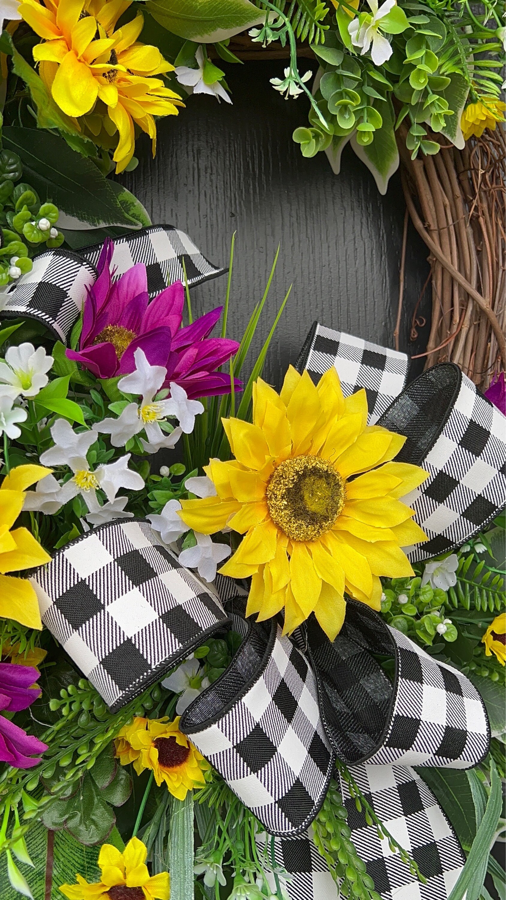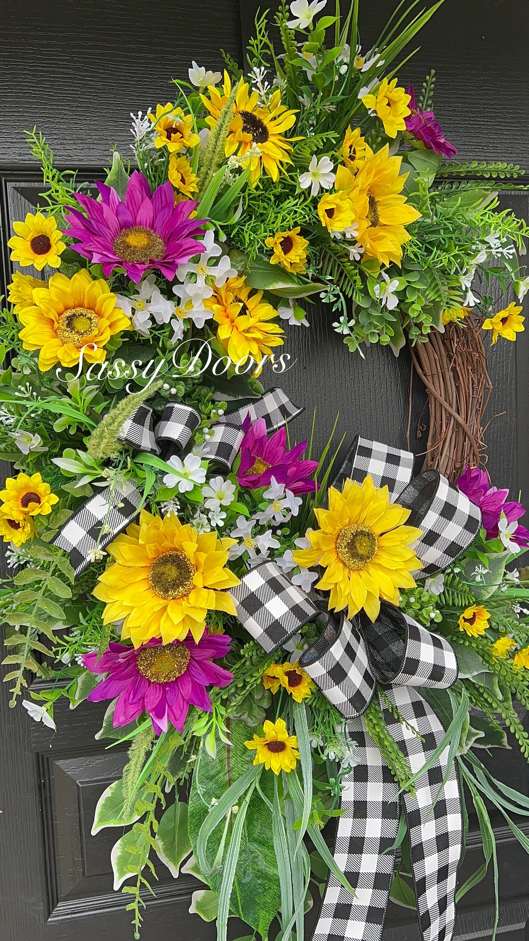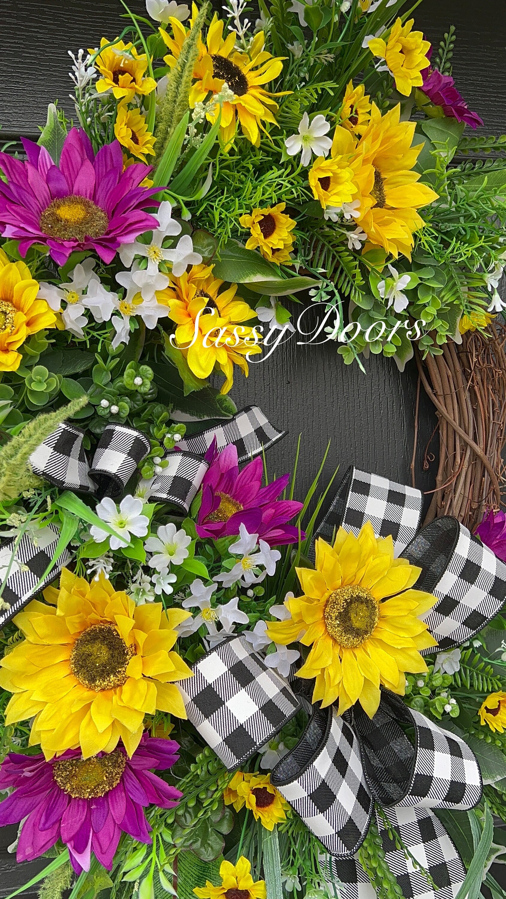 Designed on a 18' grapevine wreath filled with a variety of beautiful sunflowers 🌻 and flowing greenery. The trendy buffalo plaid ribbons and bows will make it pop on your door!