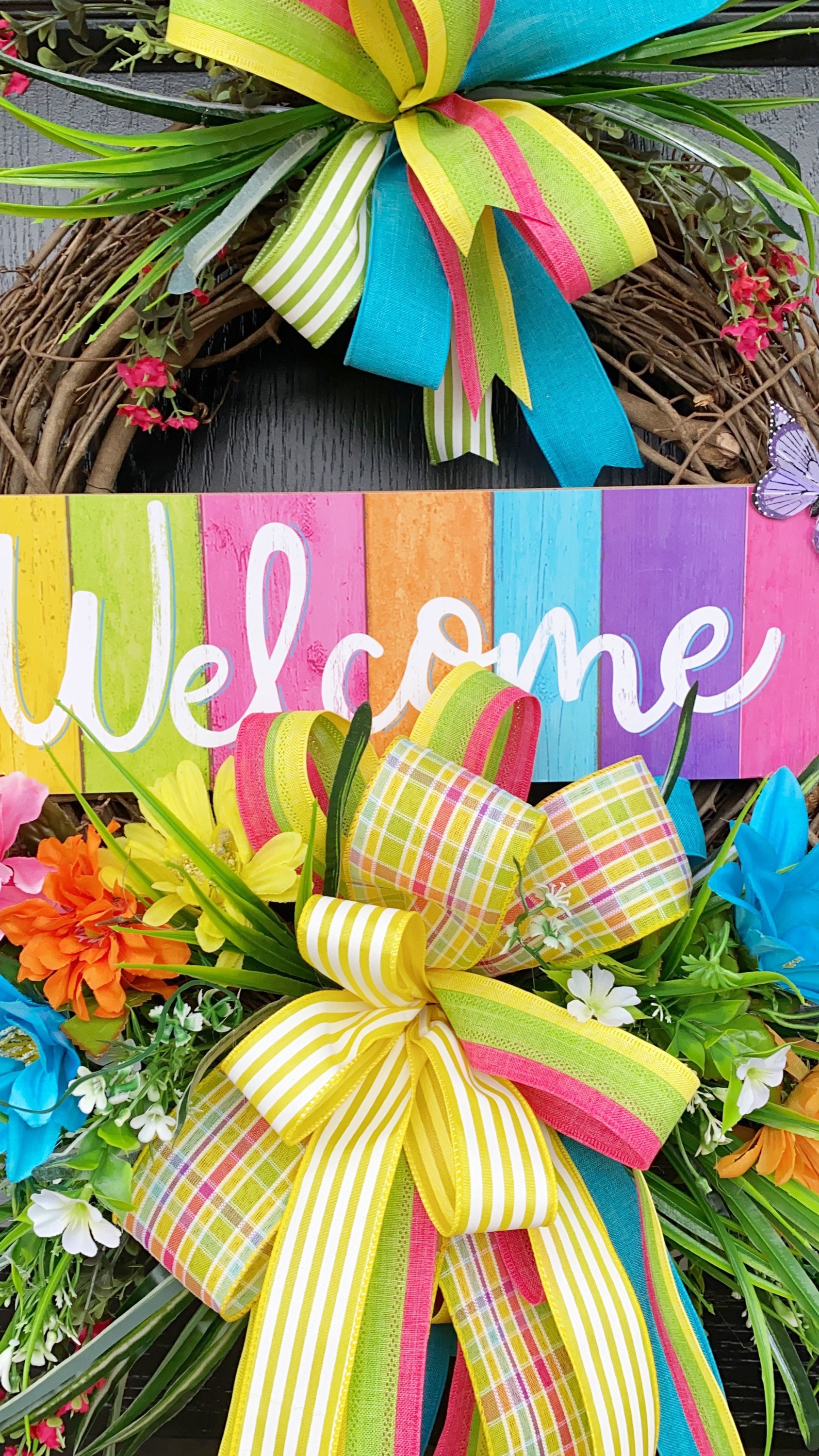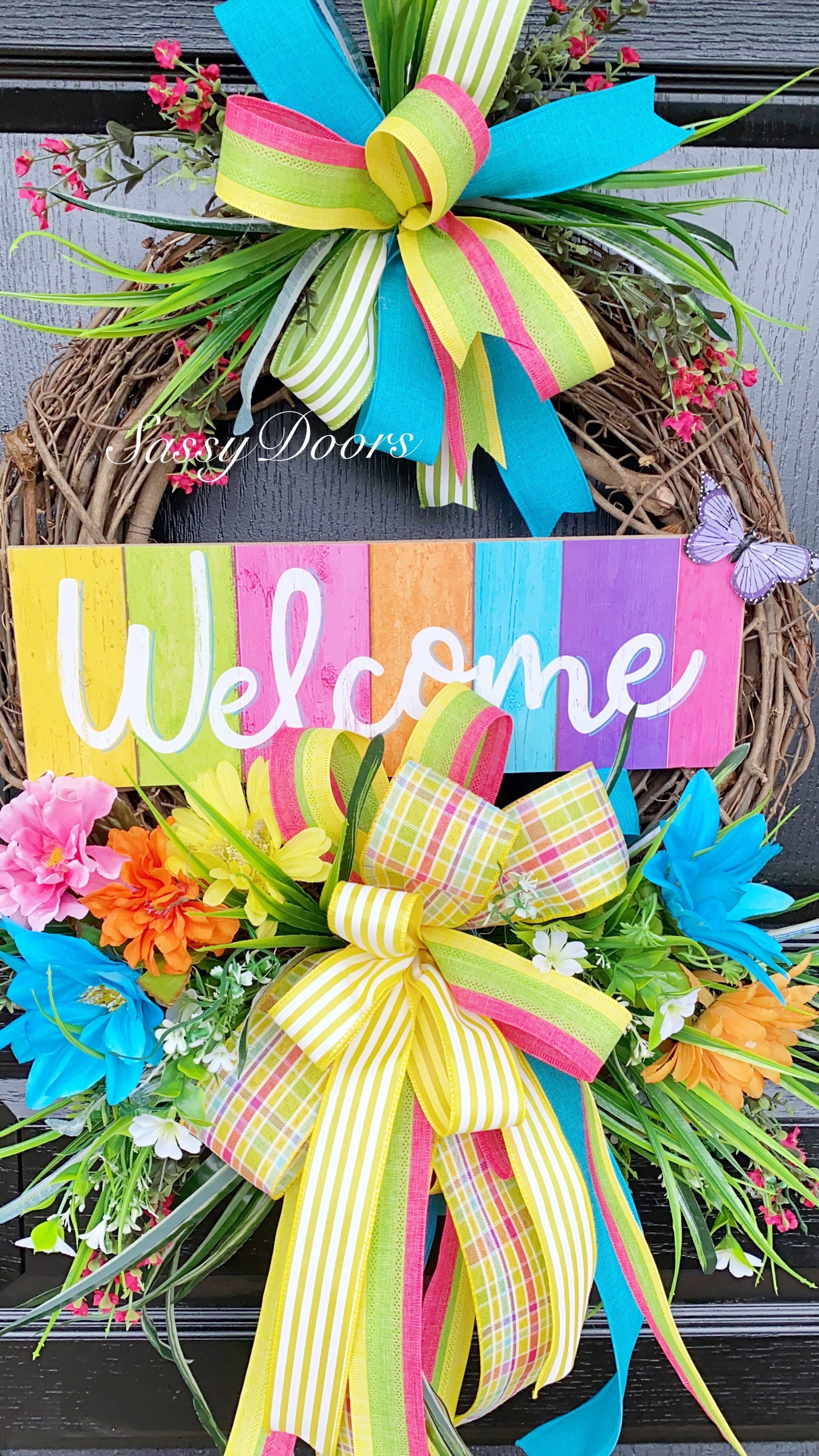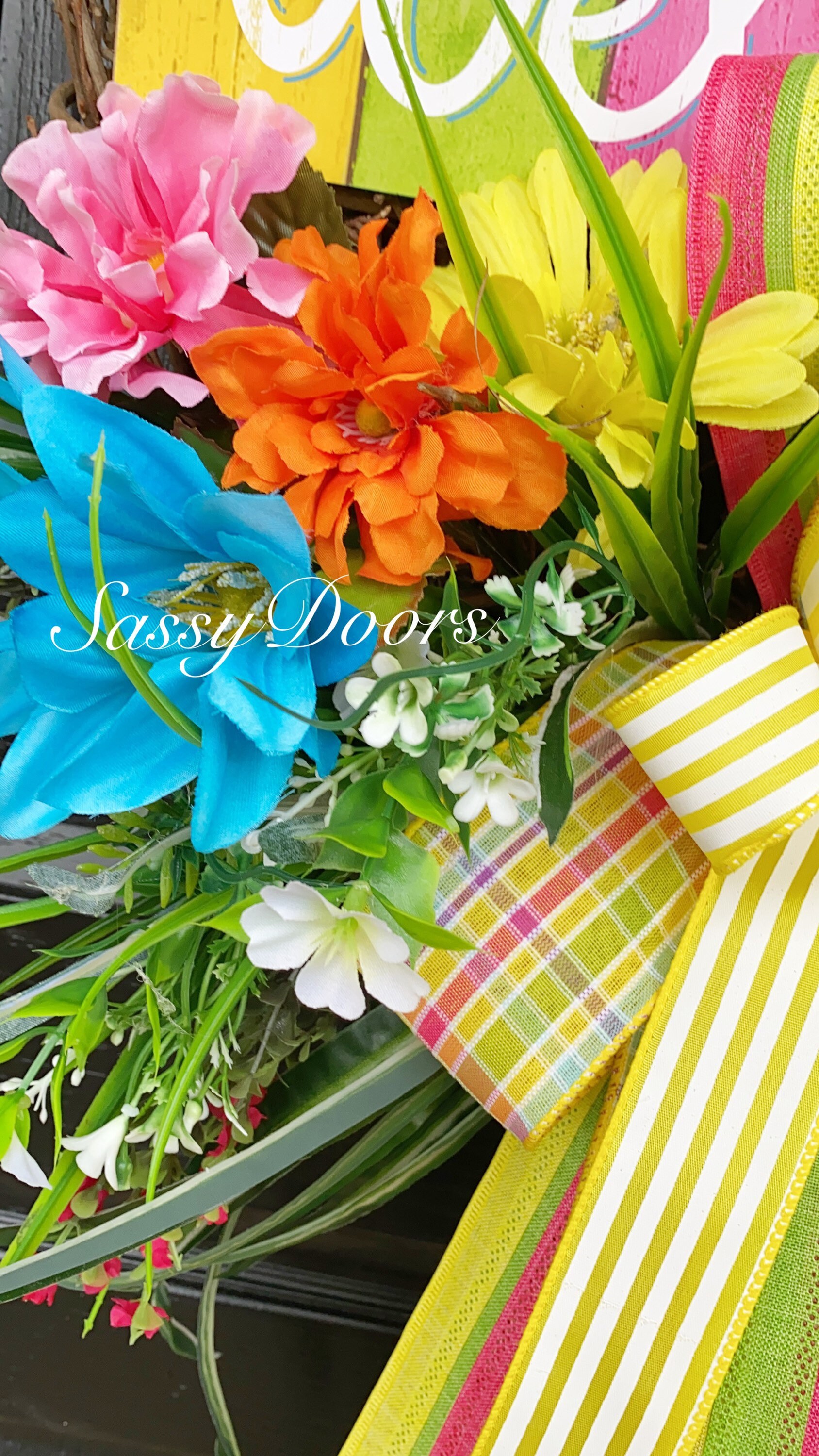 Designed on a 18" grapevine wreath and adorned with beautiful colorful summer flowers. The Welcome Summer sign is the perfect accent for this wreath.