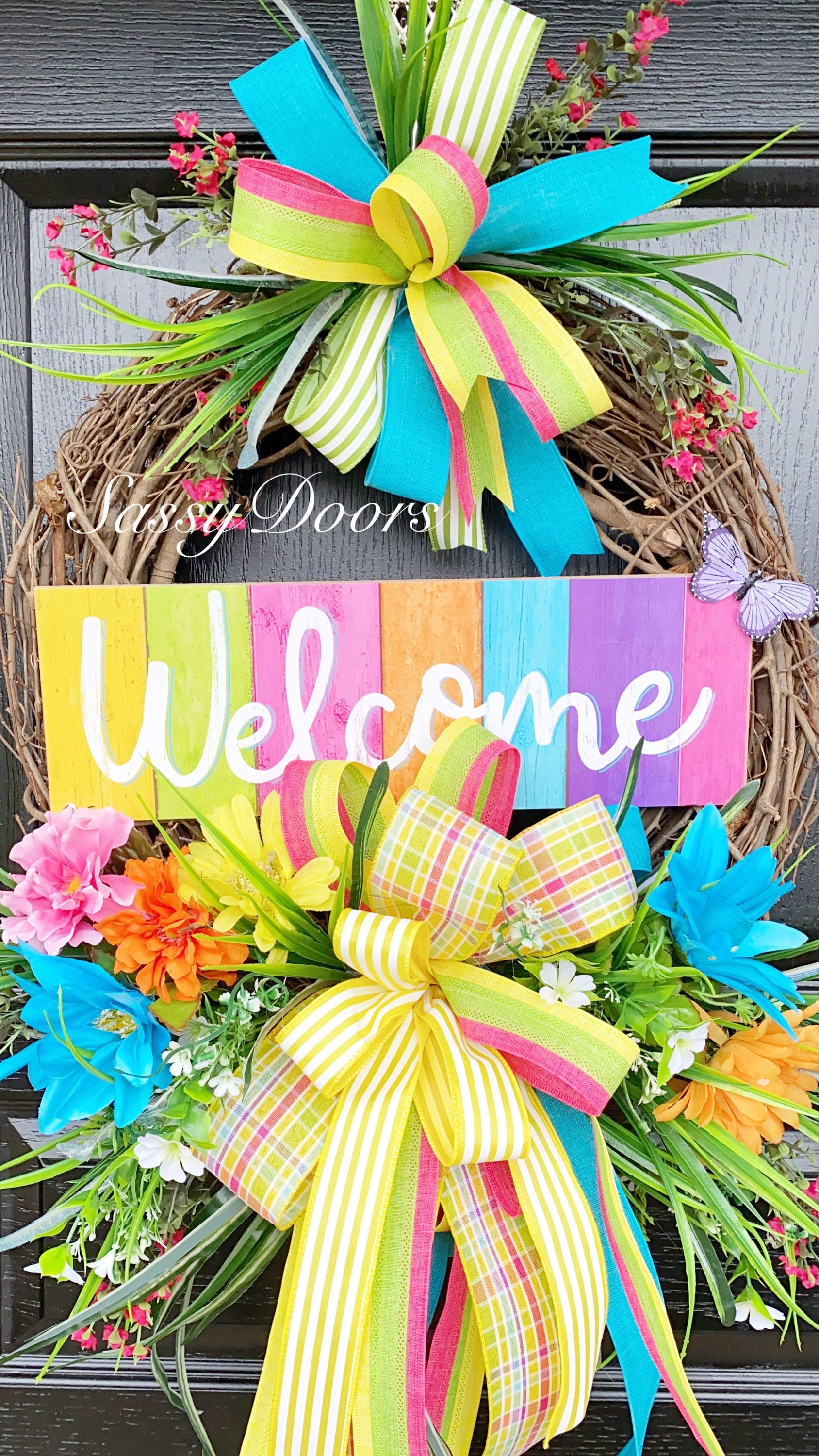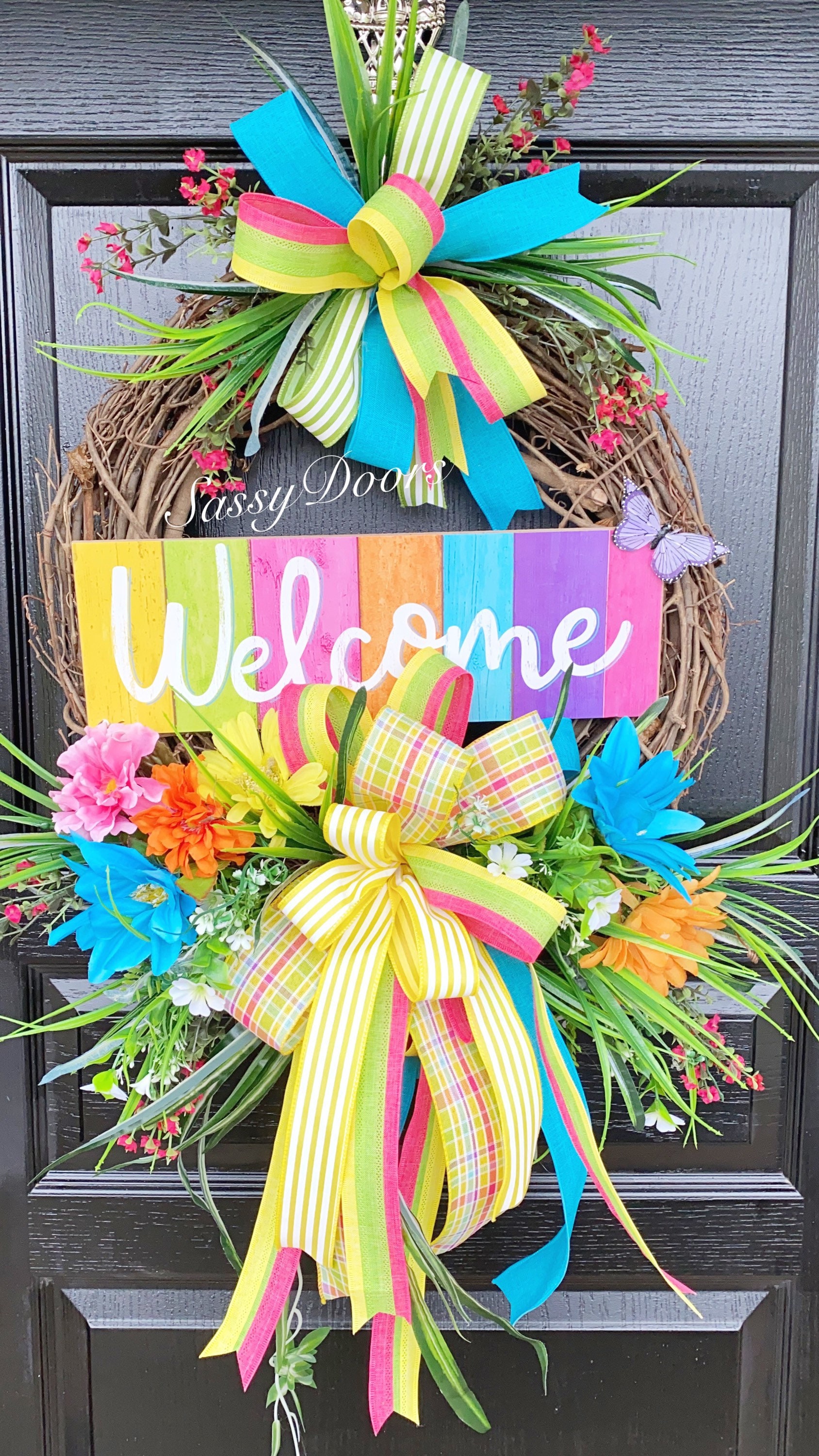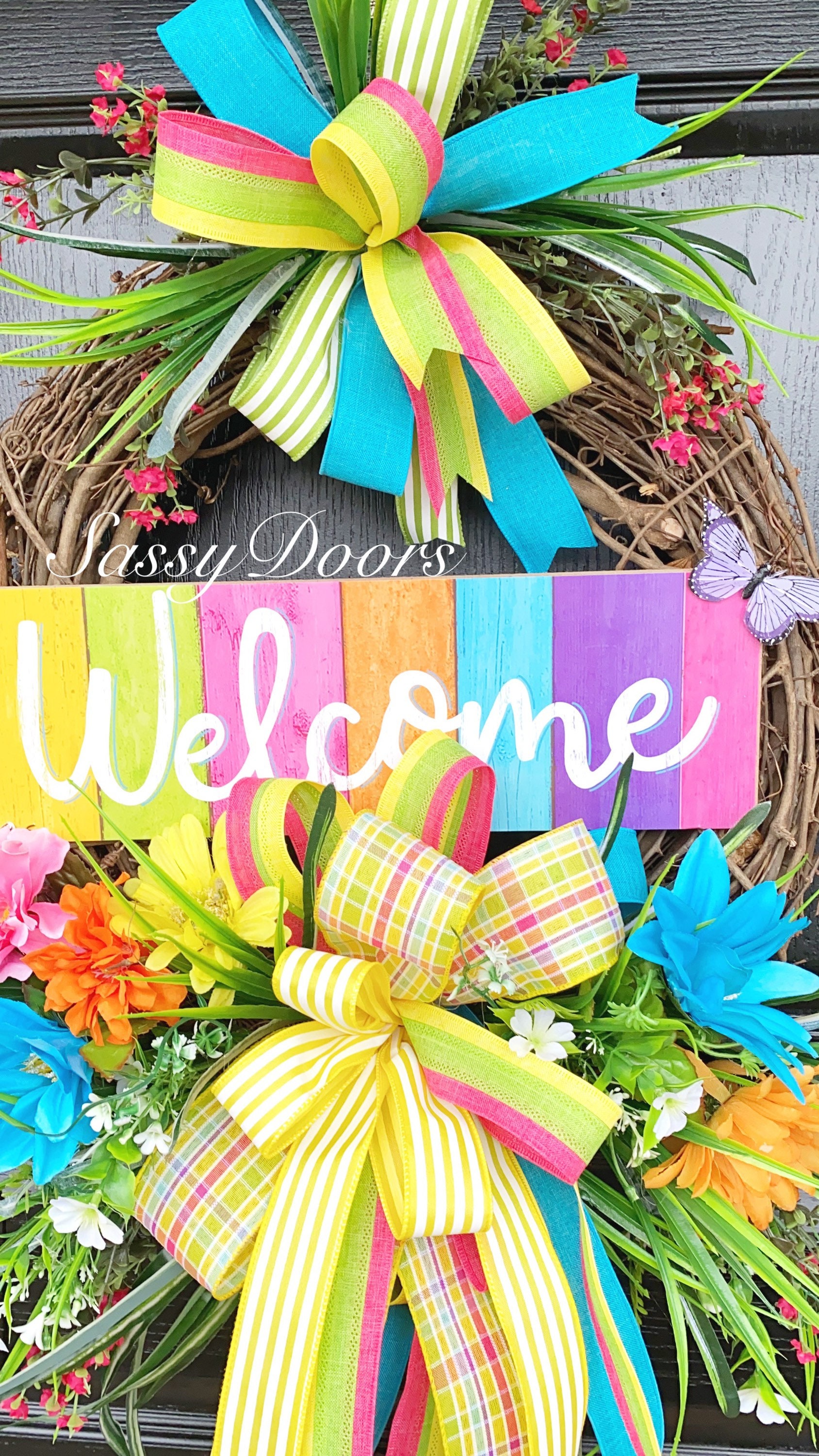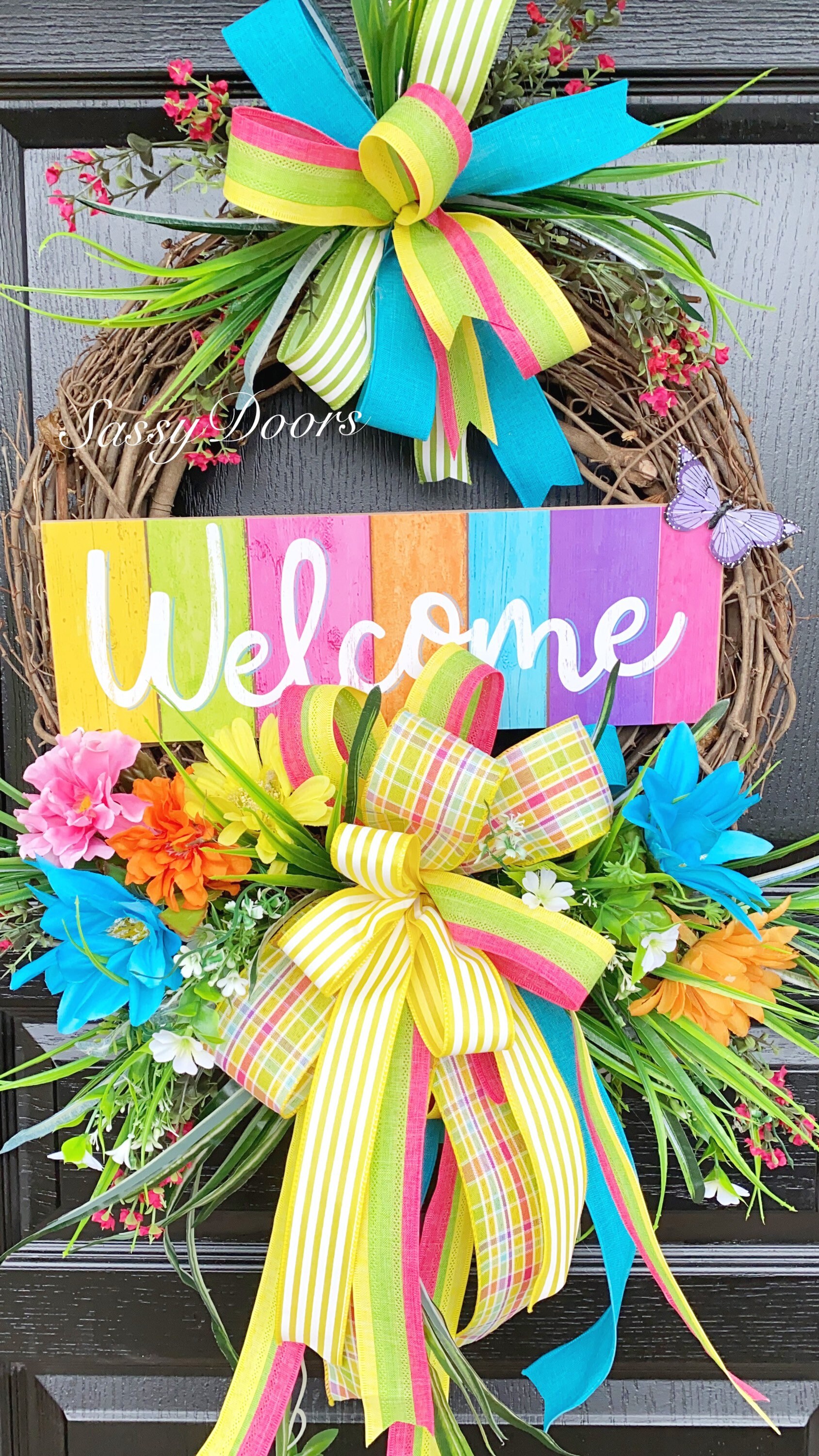 Designed on a 18" grapevine wreath and adorned with beautiful colorful summer flowers. The Welcome Summer sign is the perfect accent for this wreath.