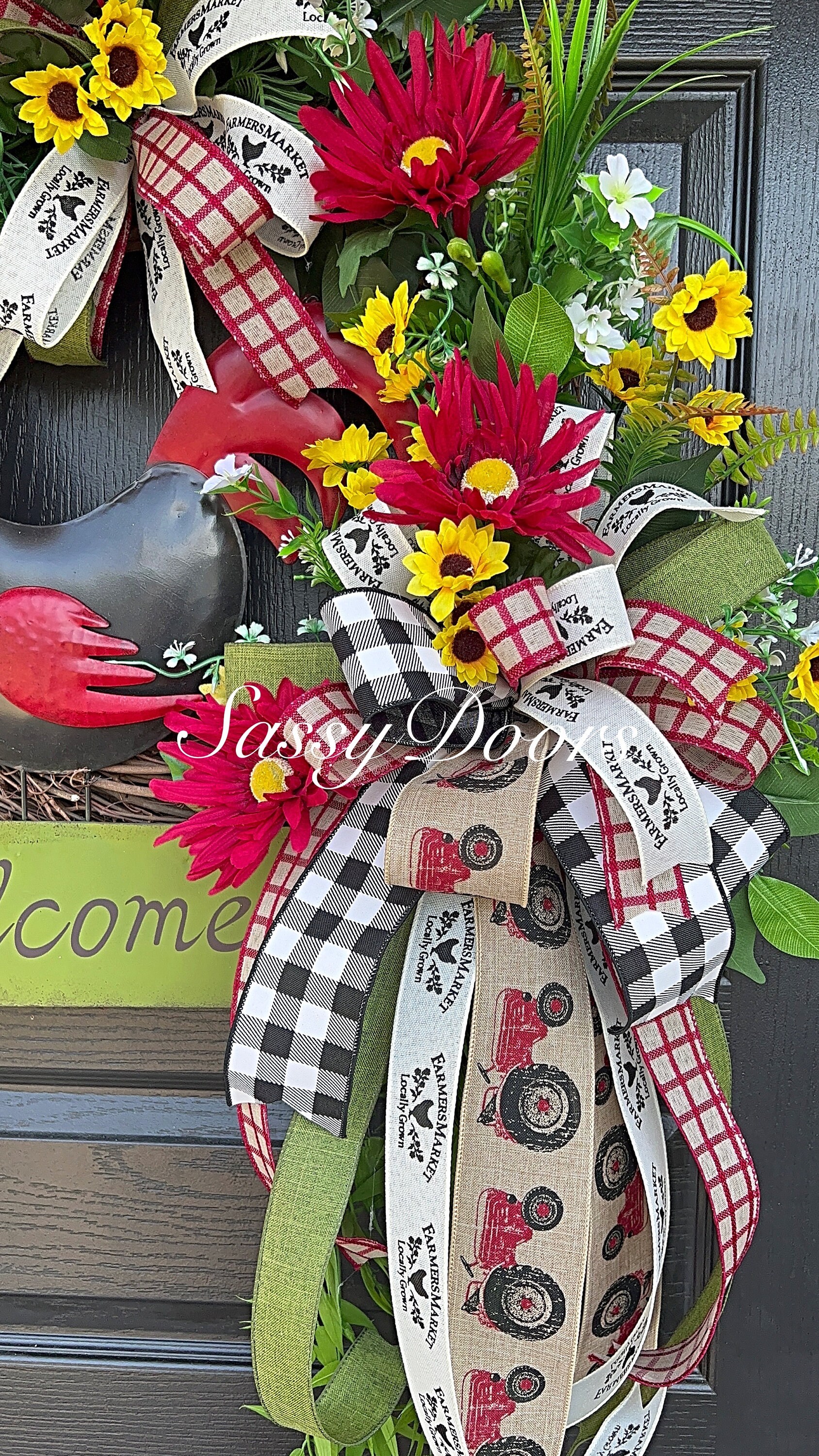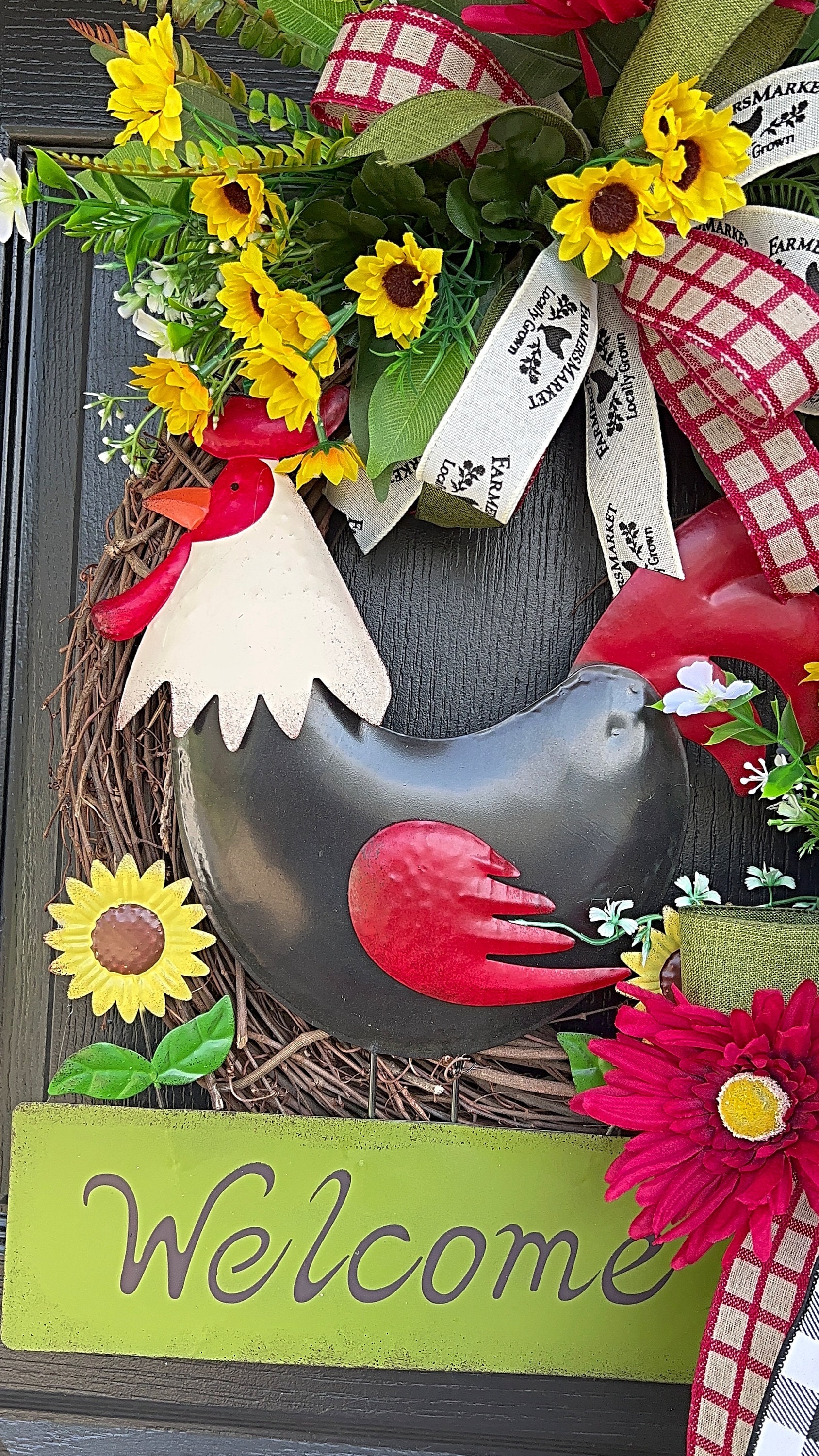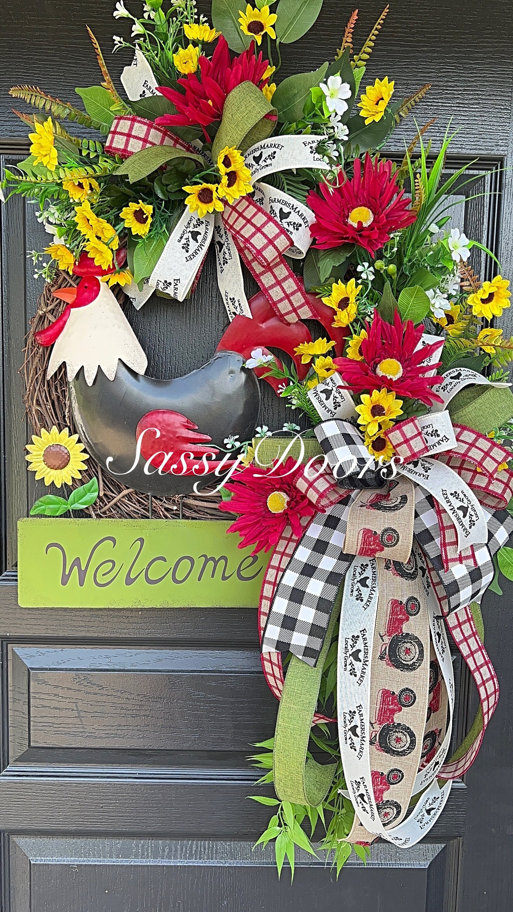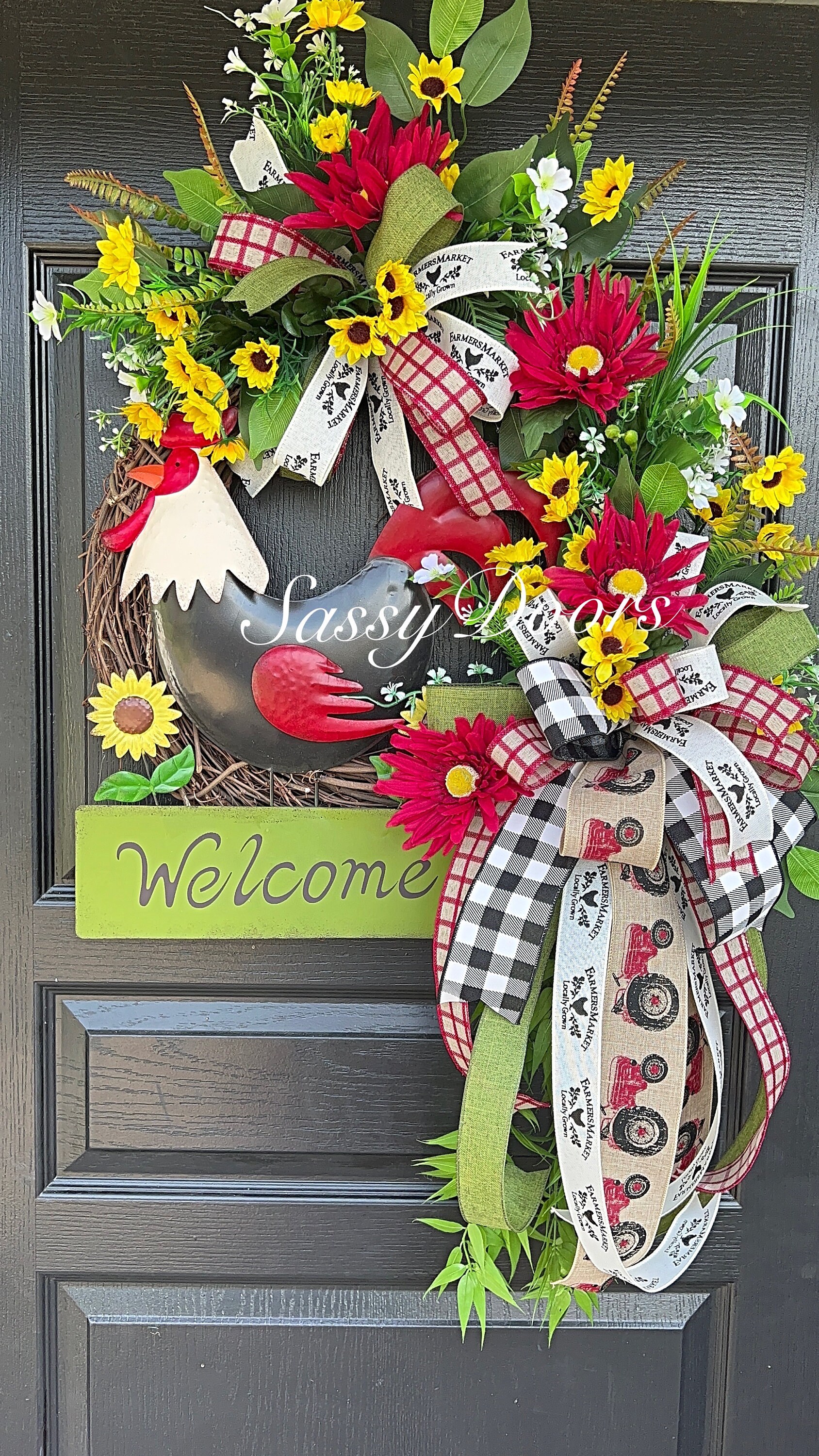 Accented with multi ribbons and bows. Filled with a variety of greenery, sunflowers, grass and many seasonal favorites. The metal rooster sign will welcome your guest in pure country farmhouse style.