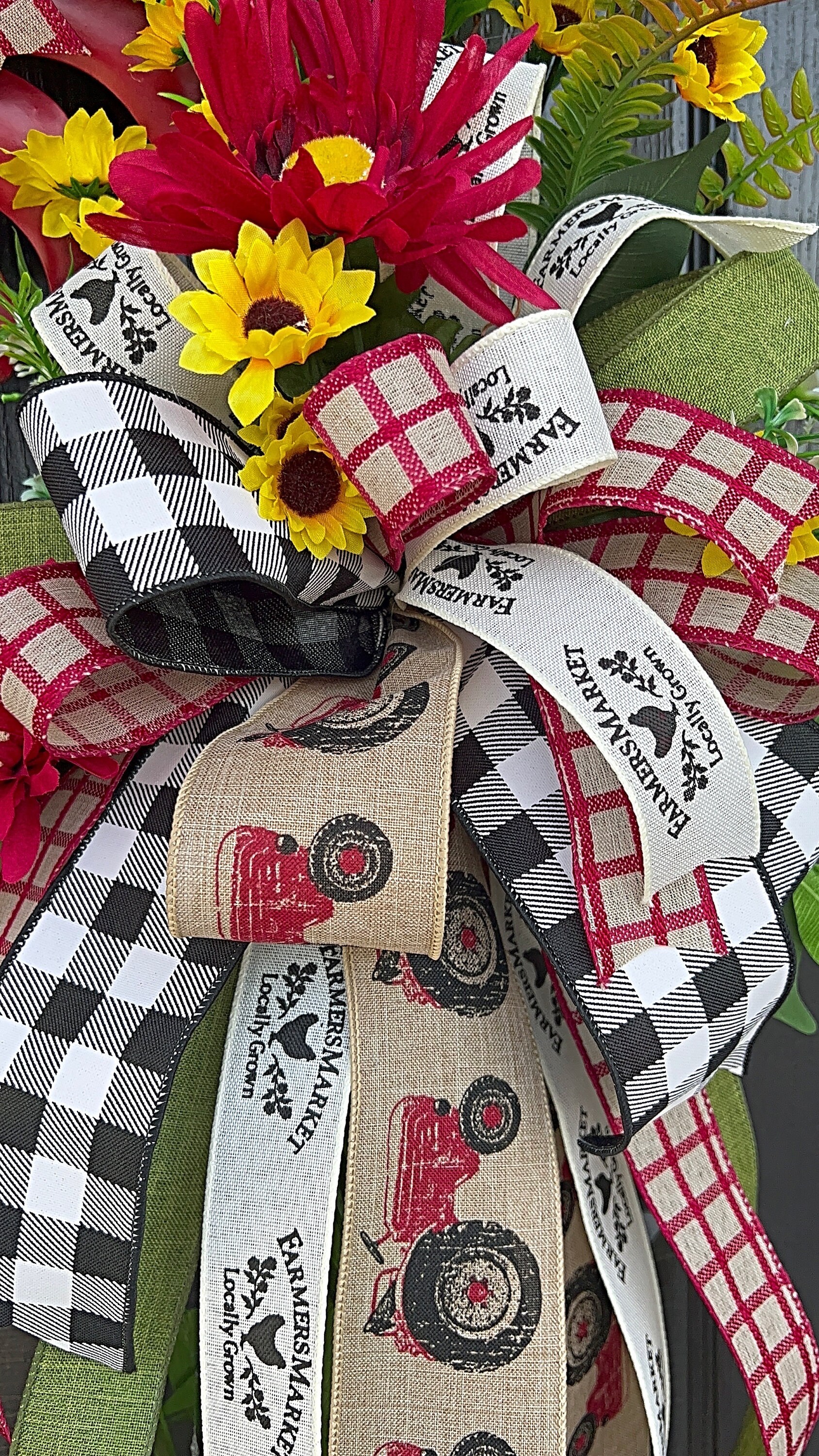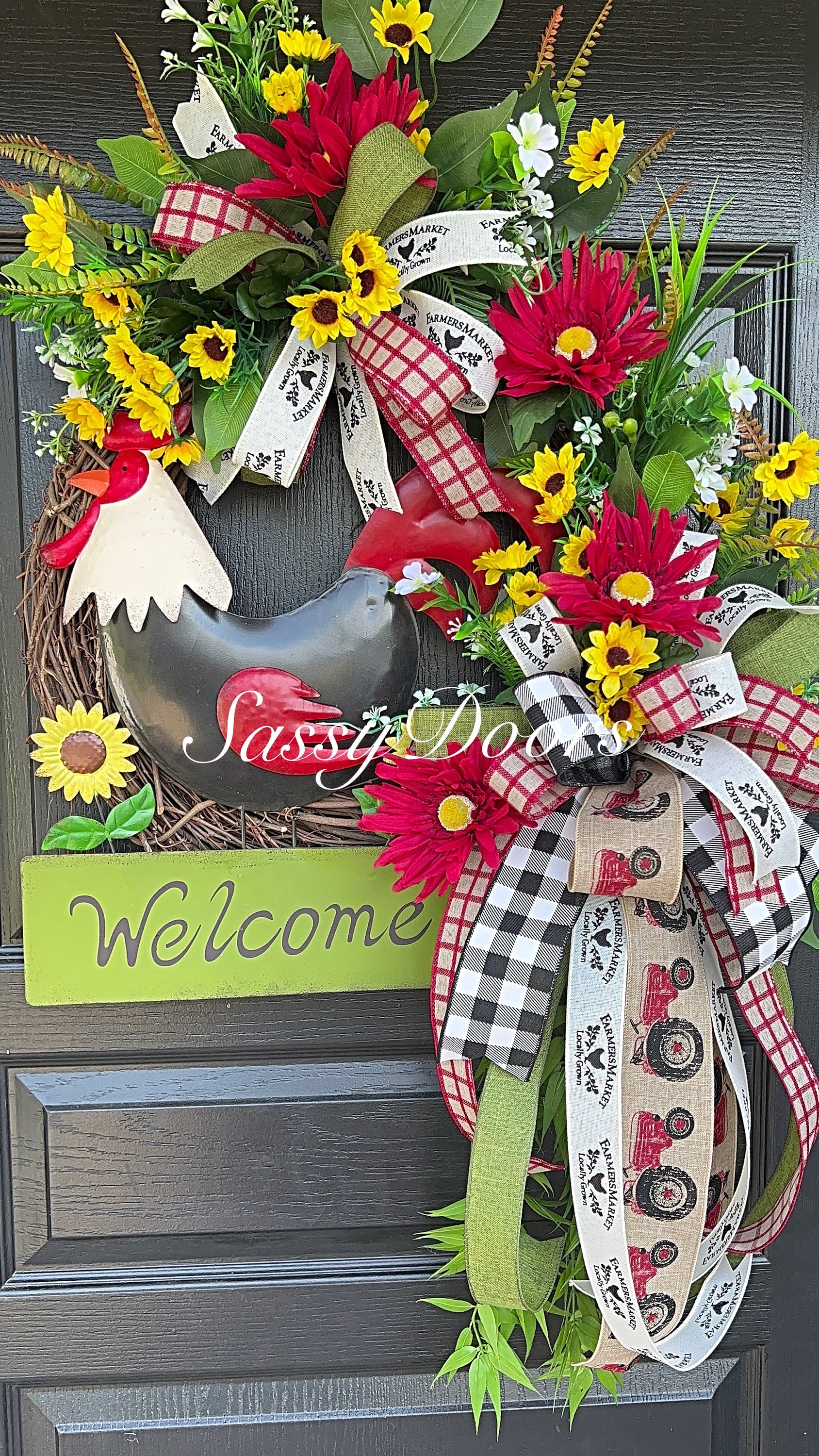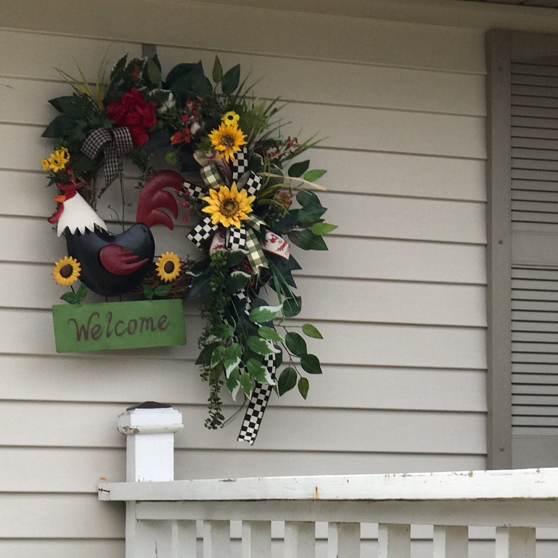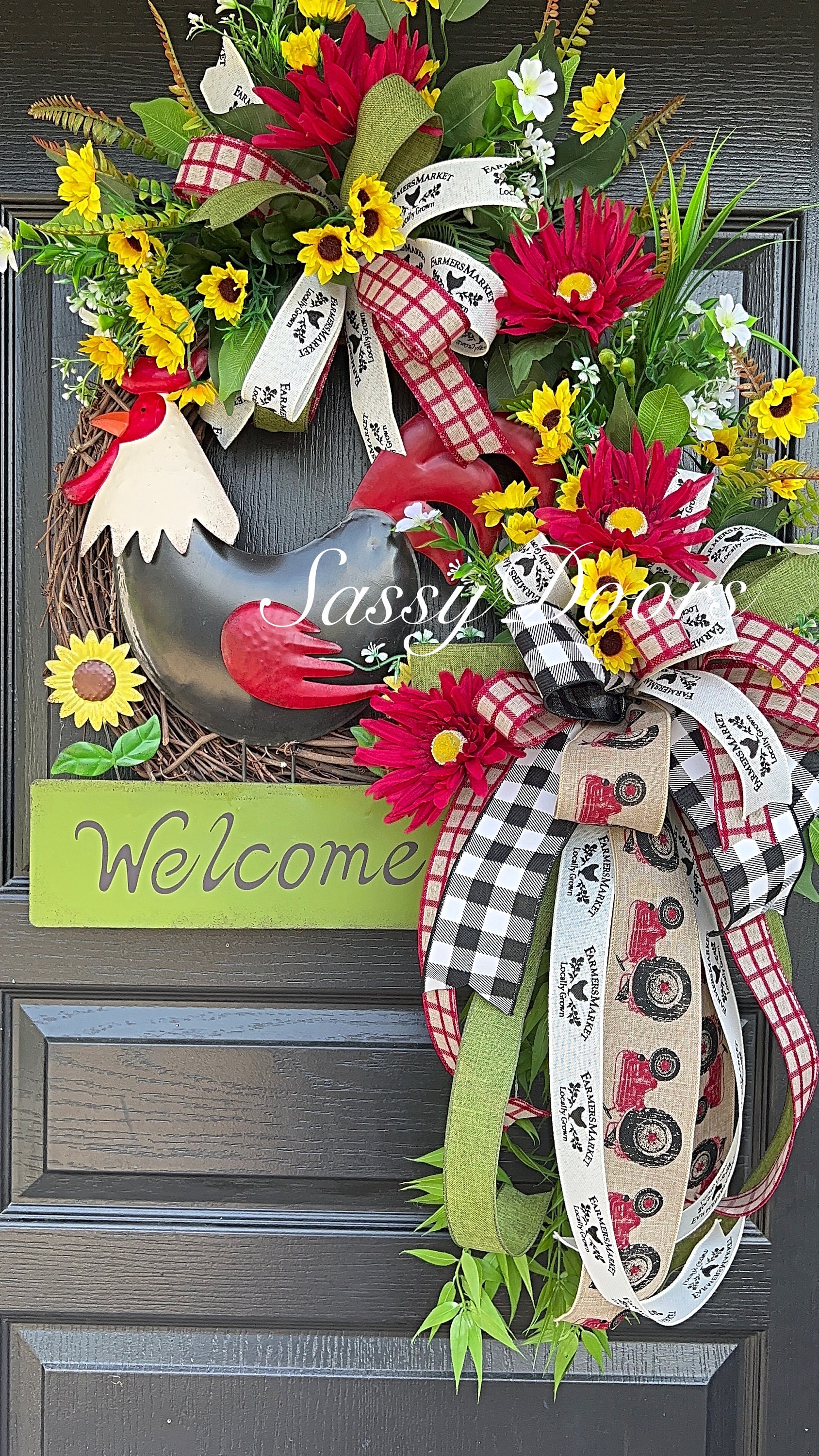 Accented with multi ribbons and bows. Filled with a variety of greenery, sunflowers, grass and many seasonal favorites. The metal rooster sign will welcome your guest in pure country farmhouse style.