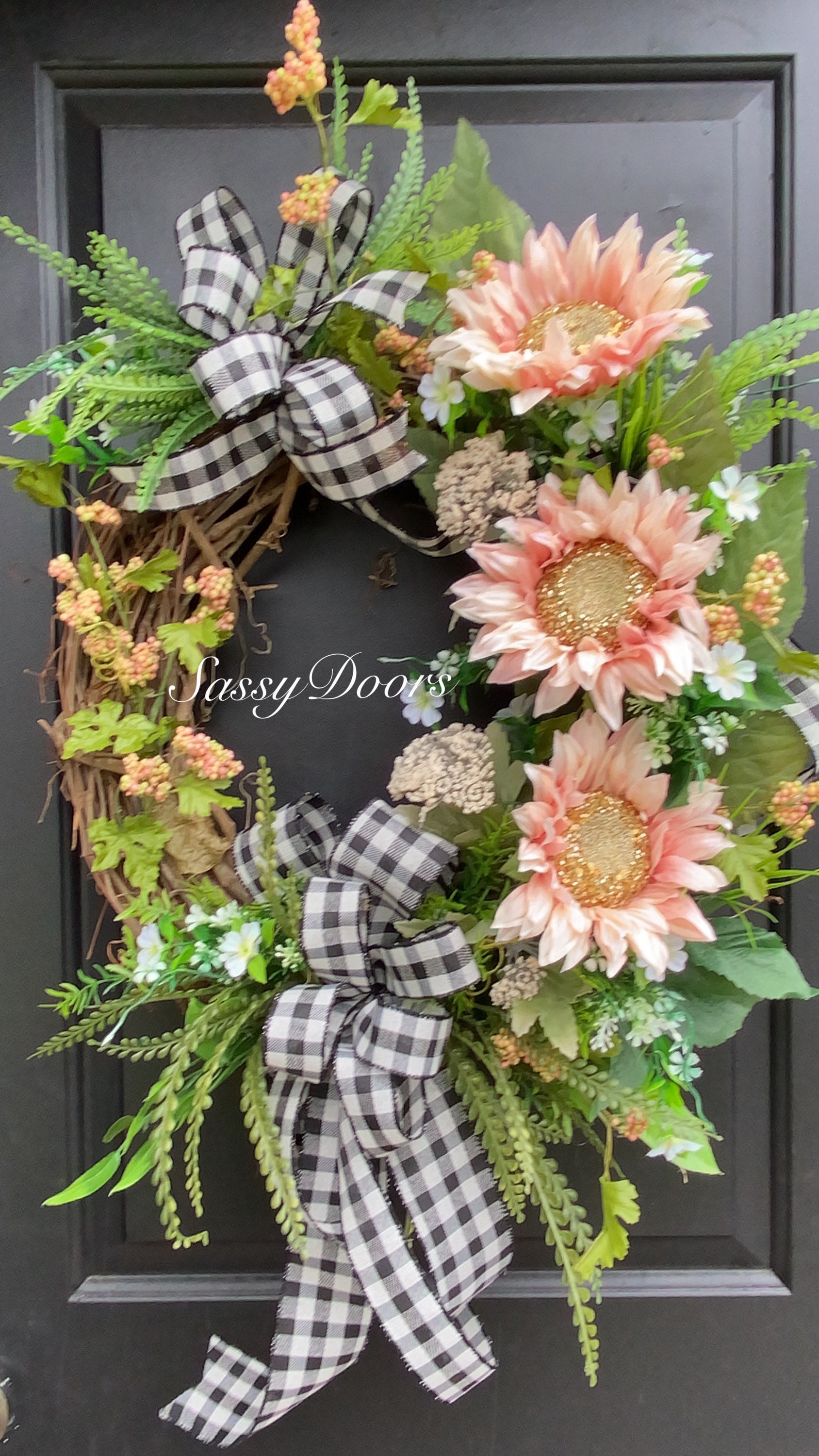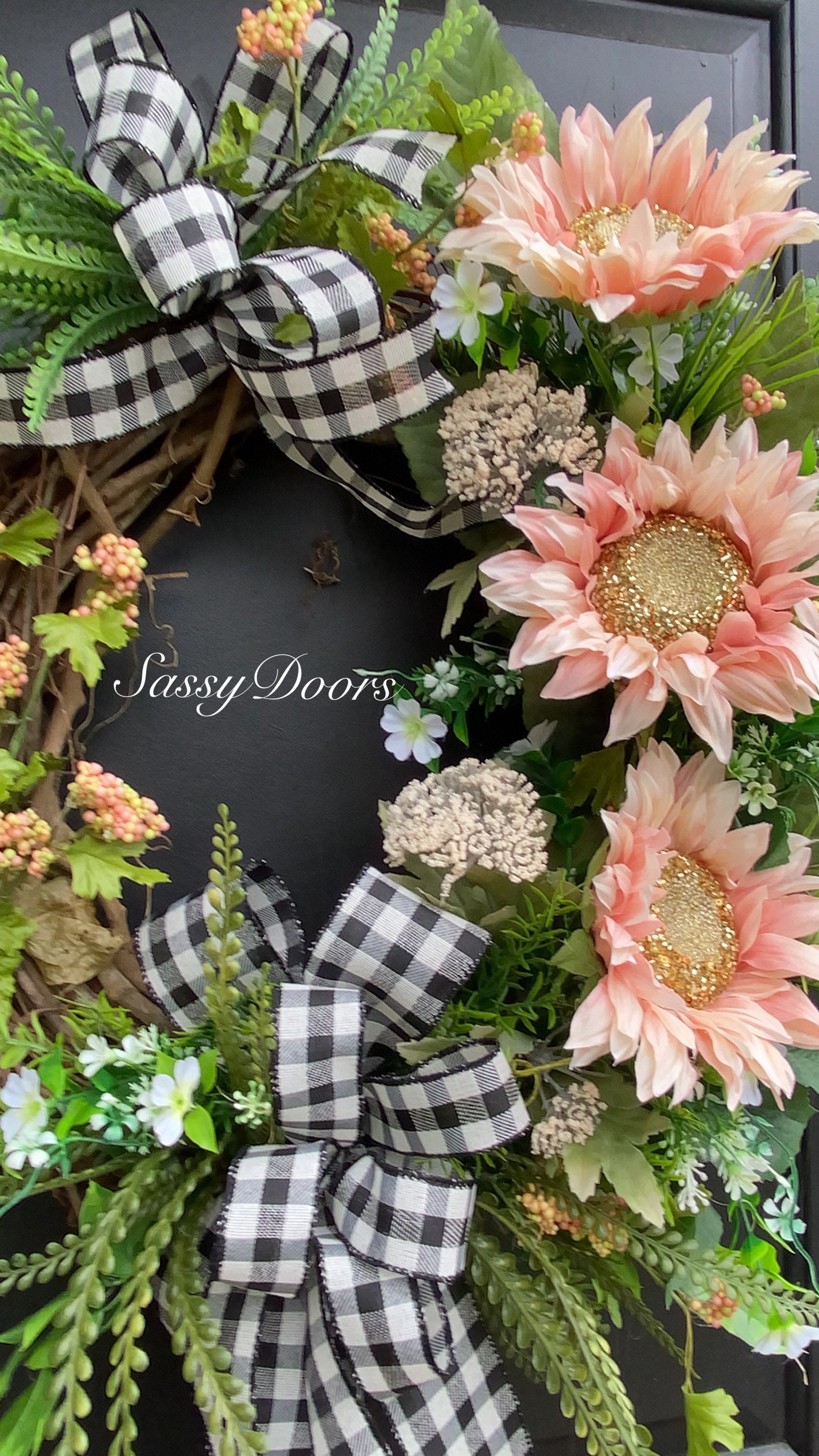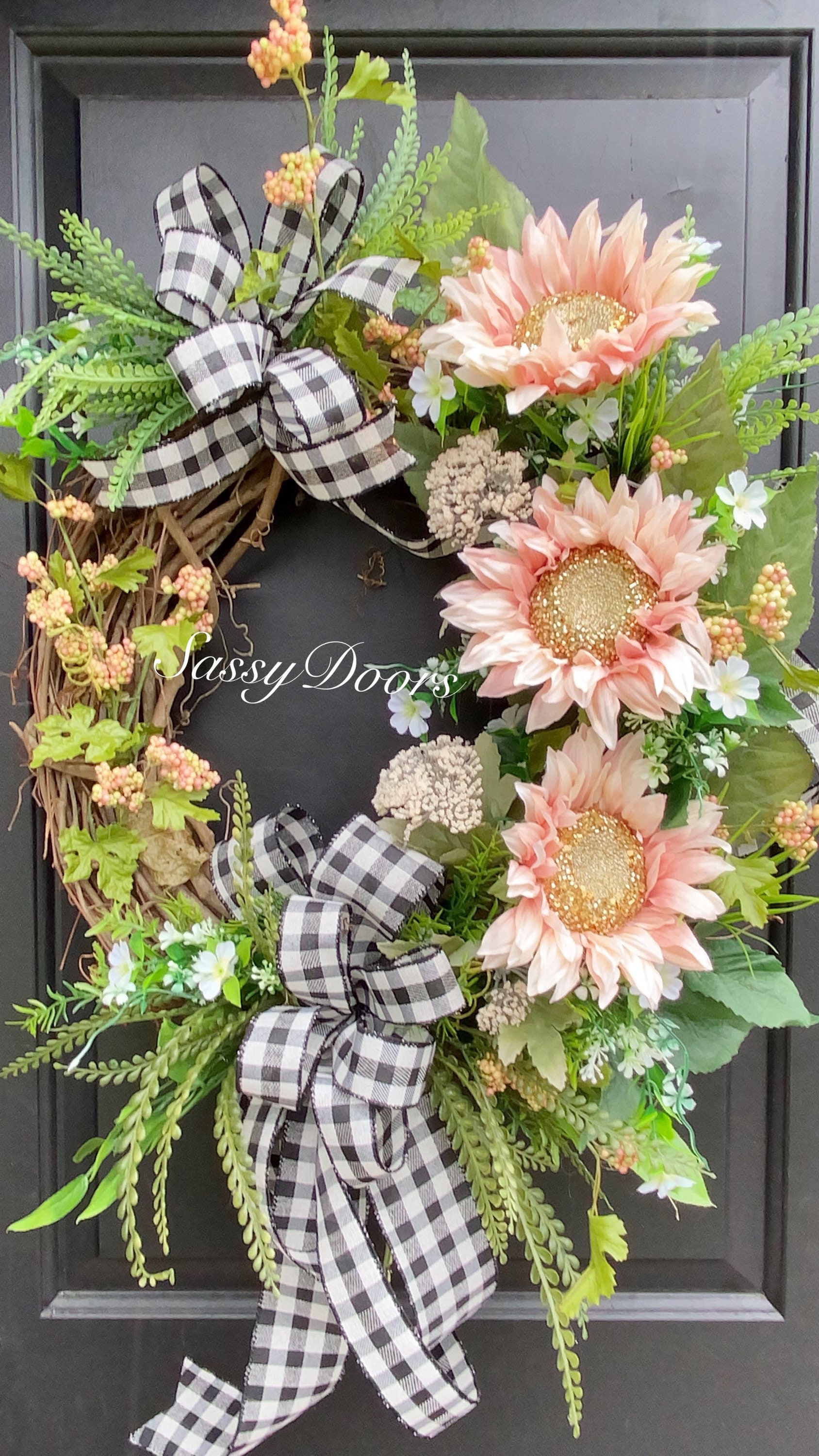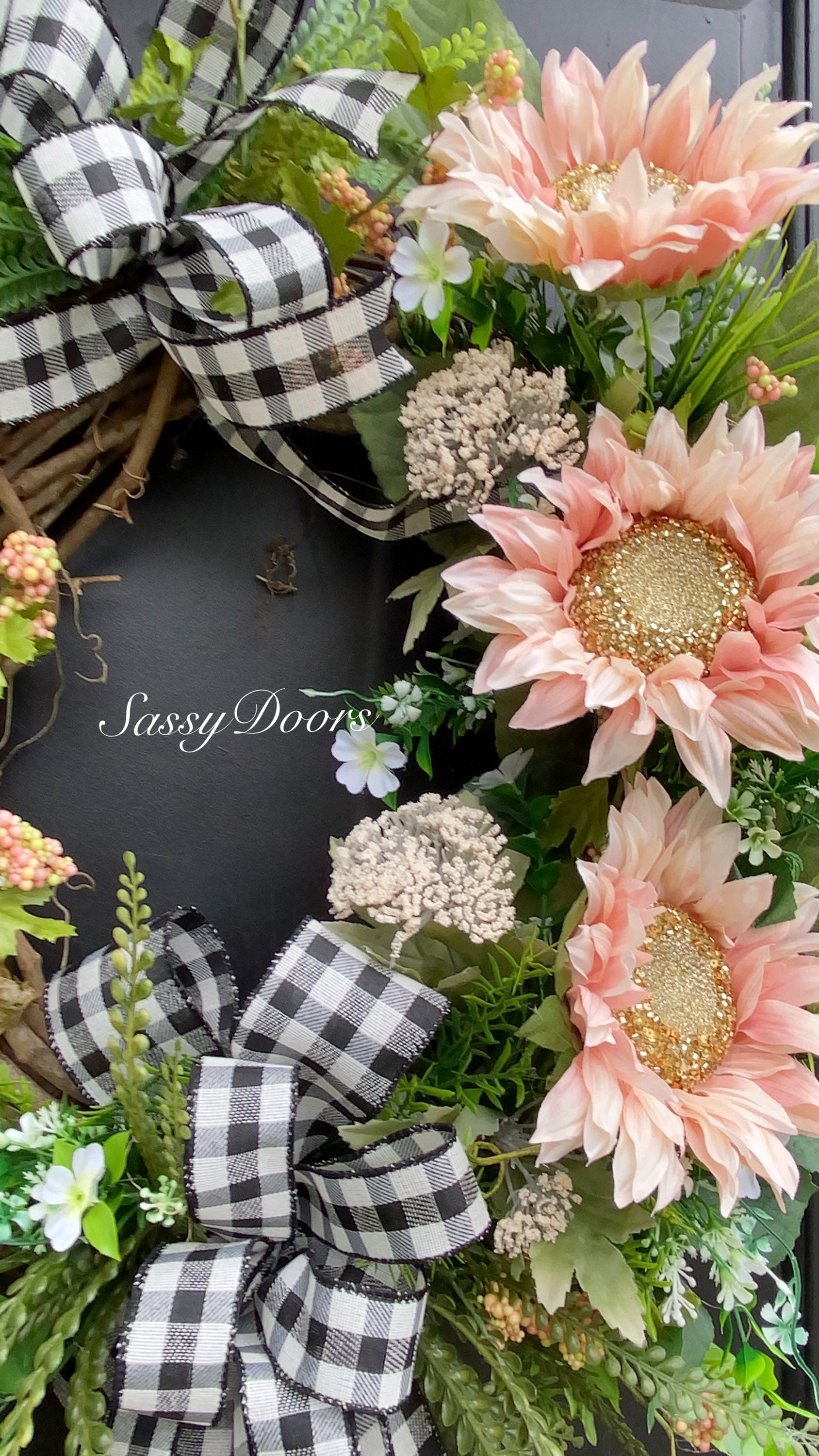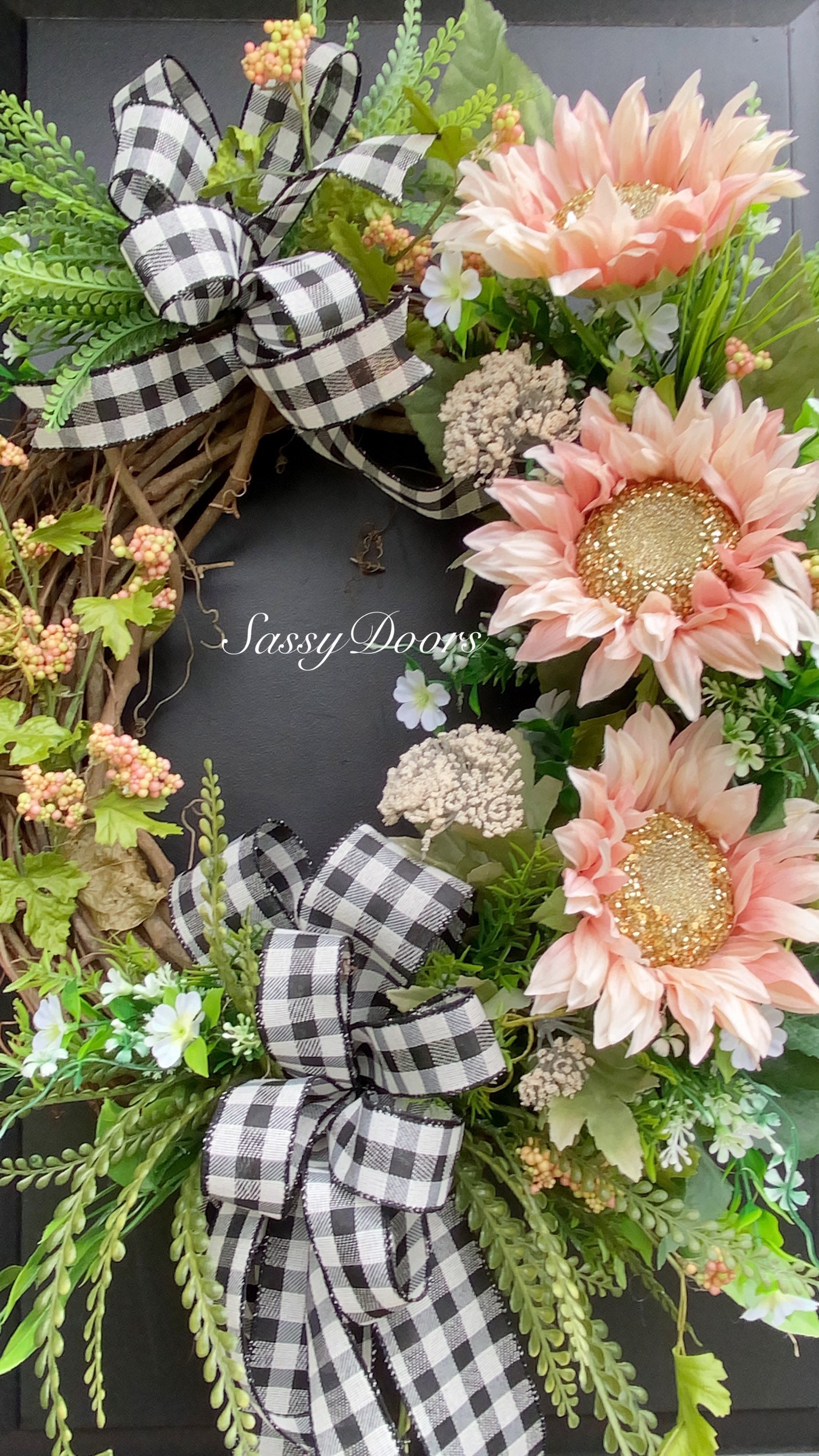 Designed on a 18”grapevine wreath and adorned with absolutely stunning sunflowers! Loaded with a variety of greenery and grasses. The trendy black and white plaid ribbon is the perfect finishing touch to this beauty.