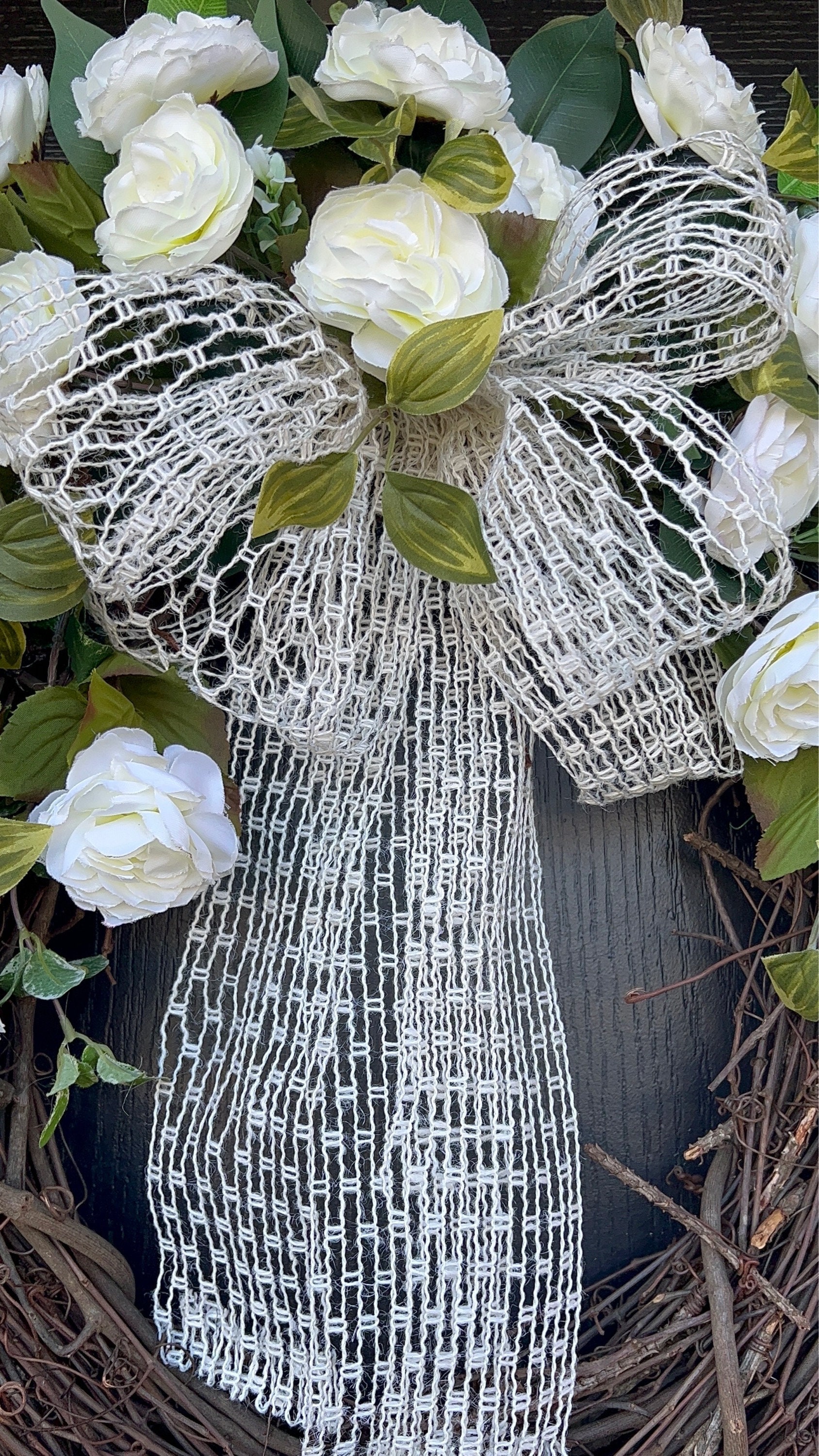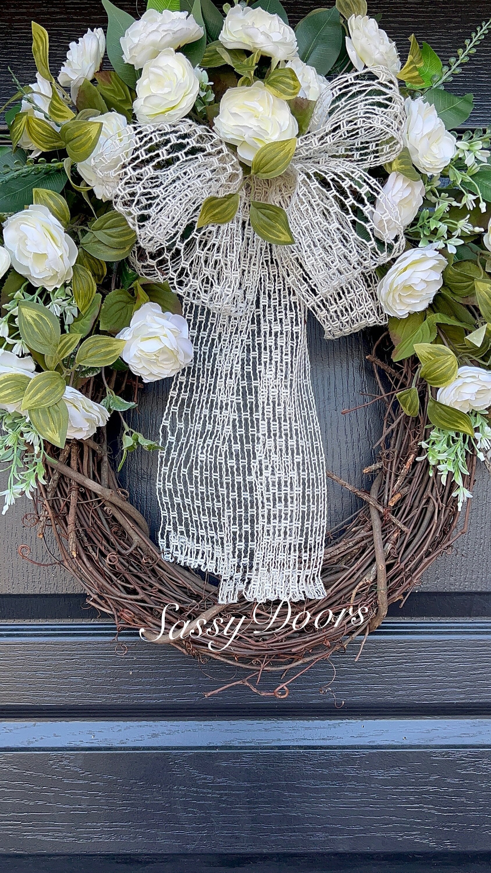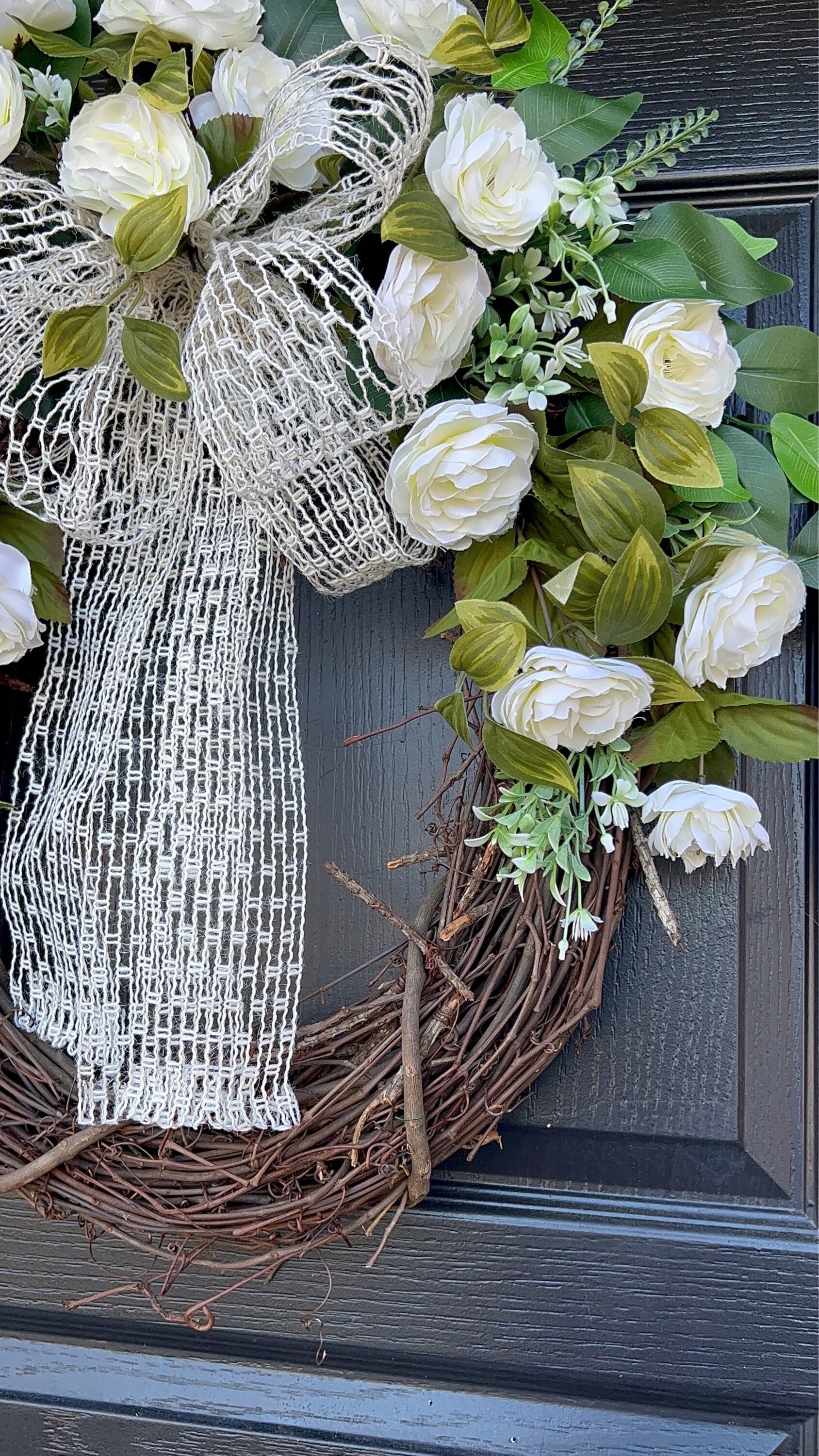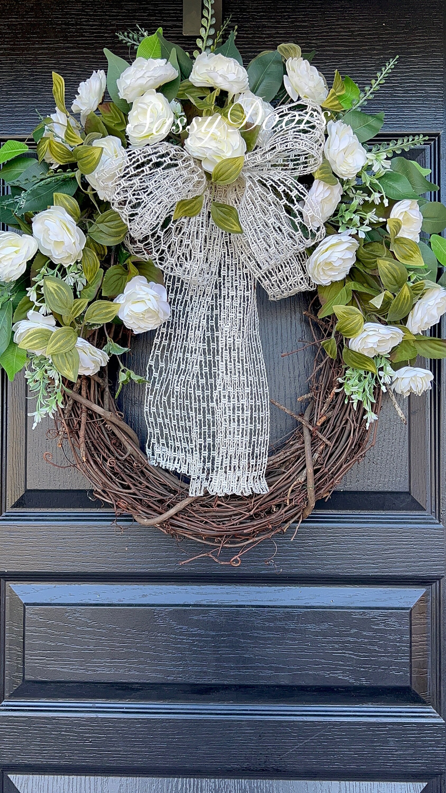Designed on a grapevine wreath and accented stunningly beautiful cream colored ranunculus and tons of greenery. Perfect to display when transitioning into other seasons or you can display this wreath everyday.