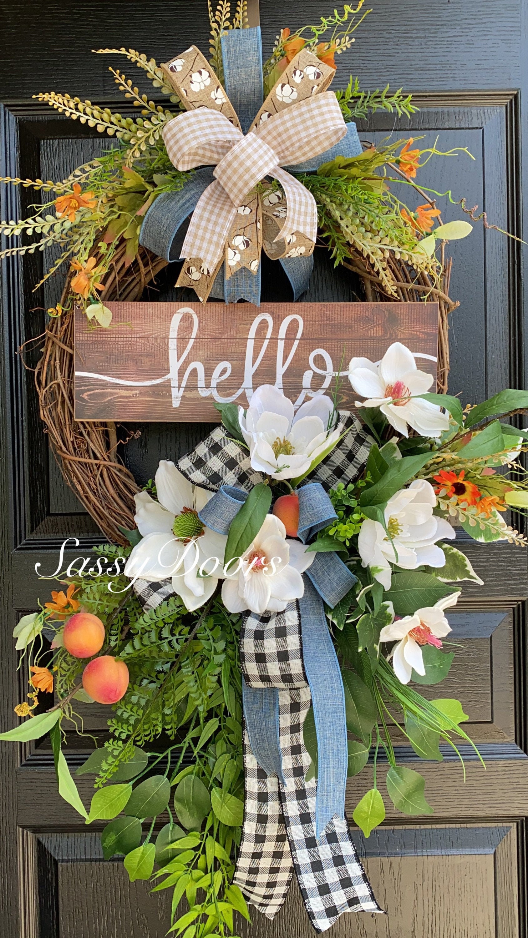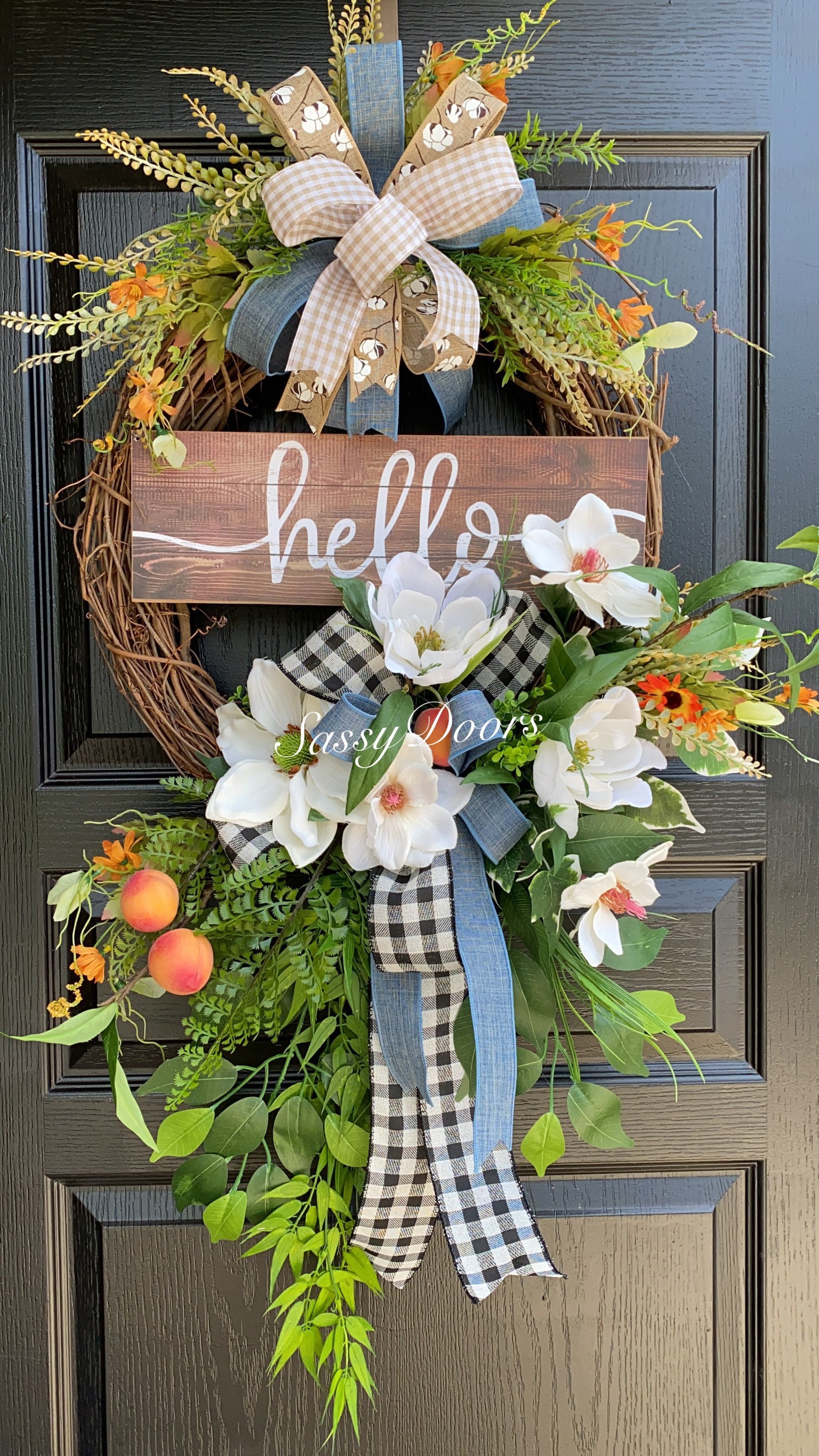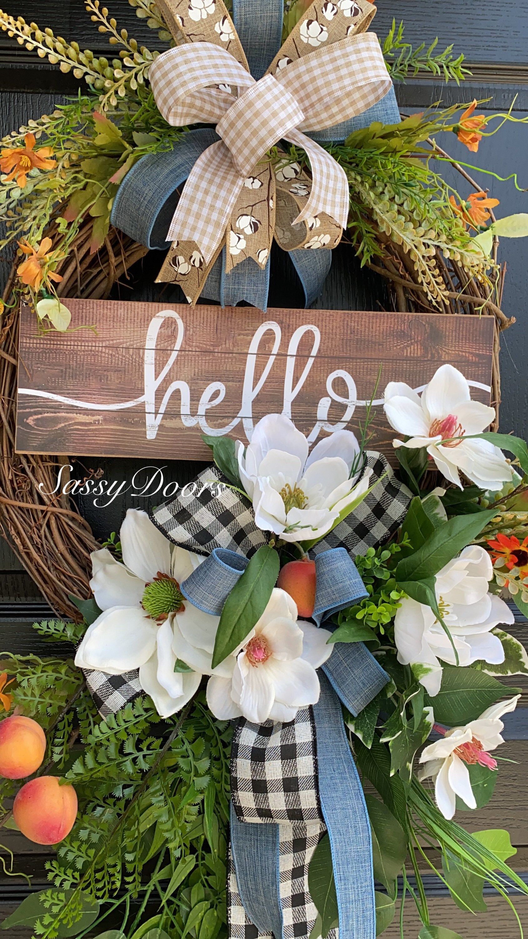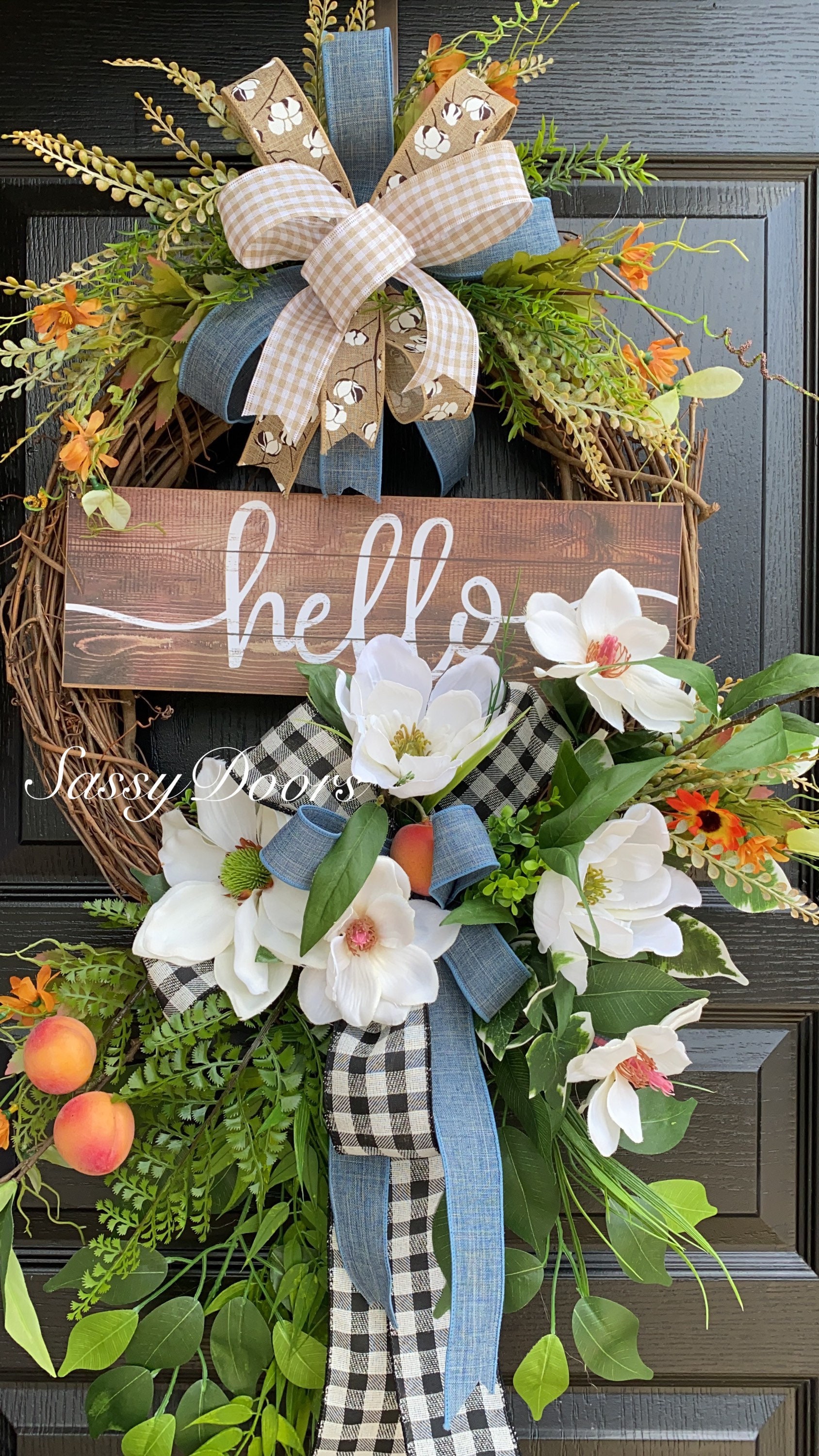 Designed on a grapevine wreath, loaded with beautiful magnolias, greenery, peaches and lots of grass and greenery.