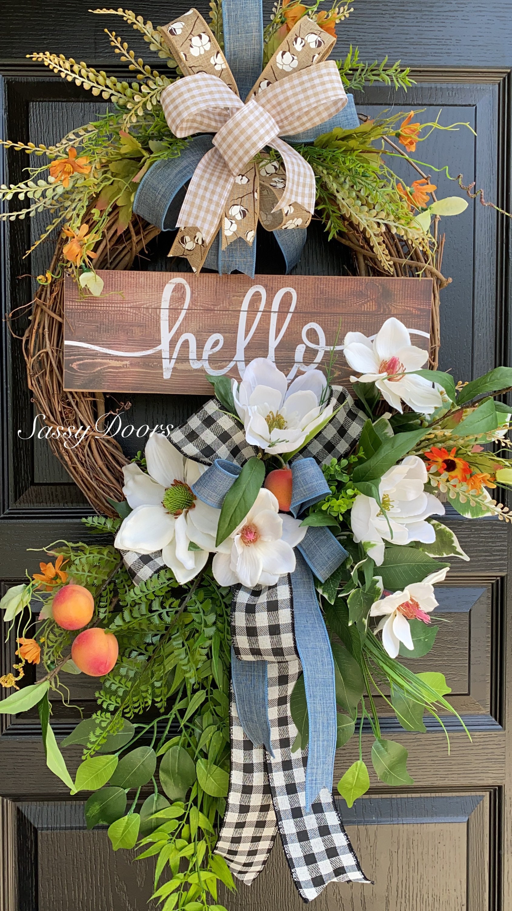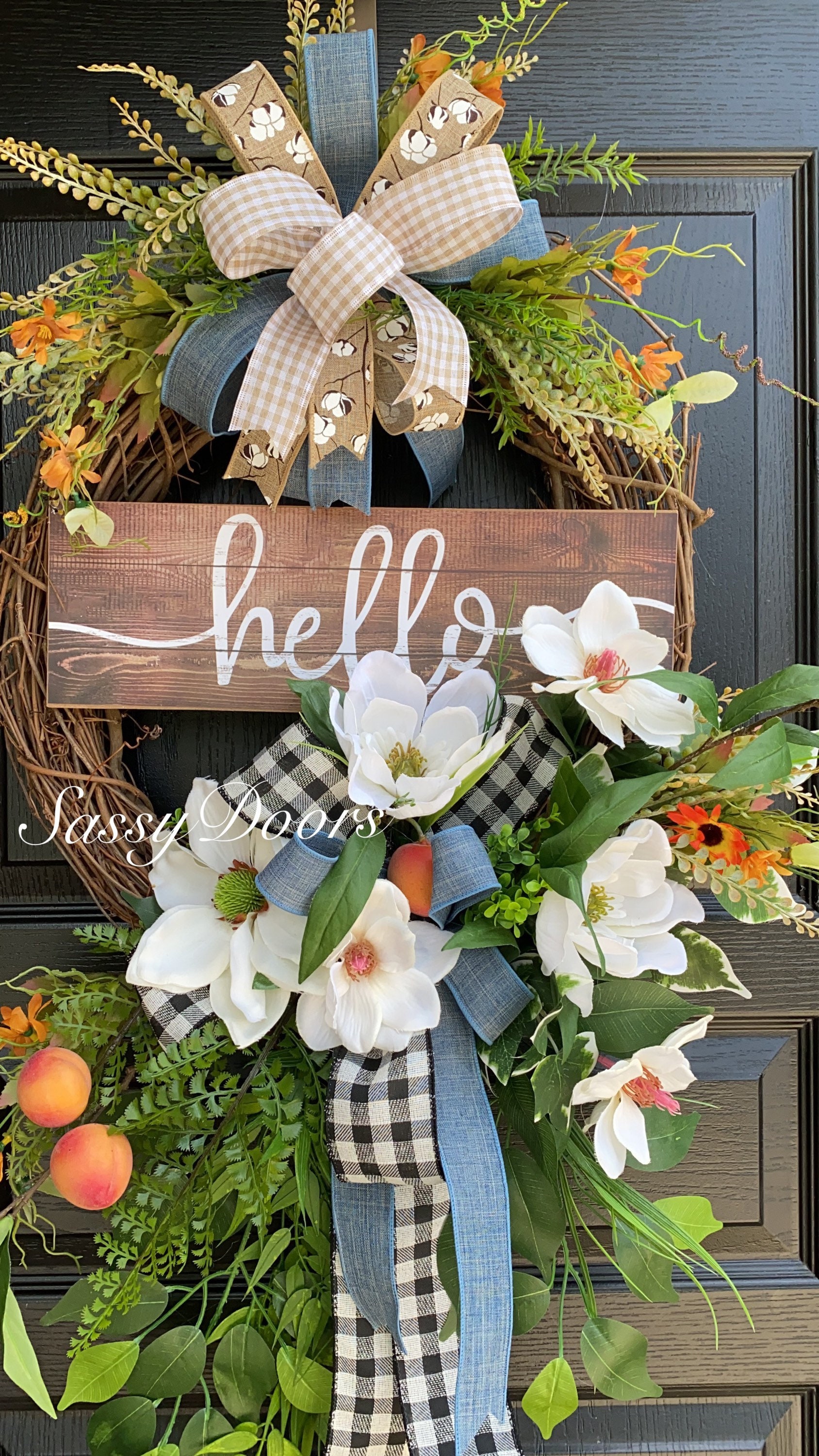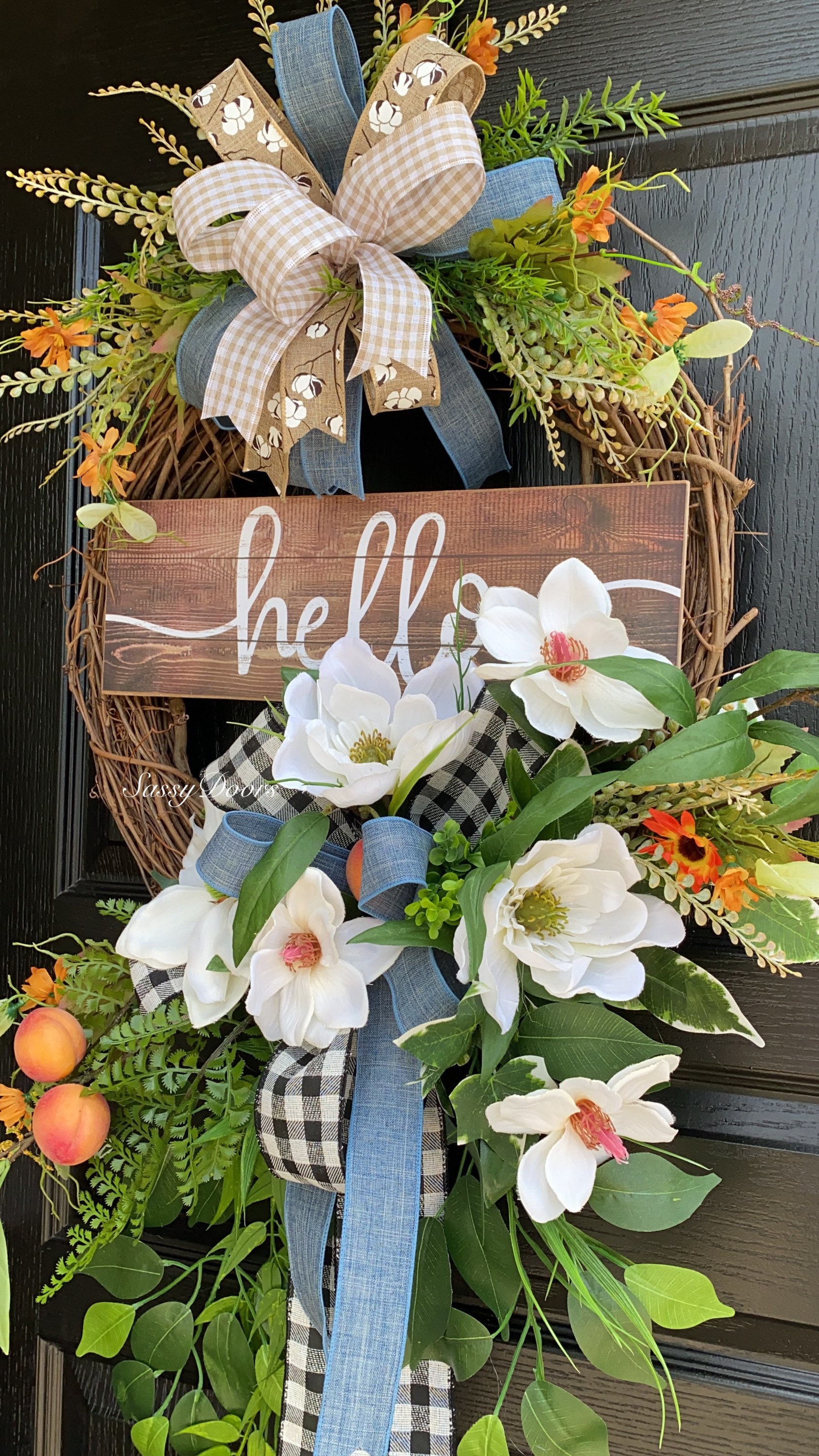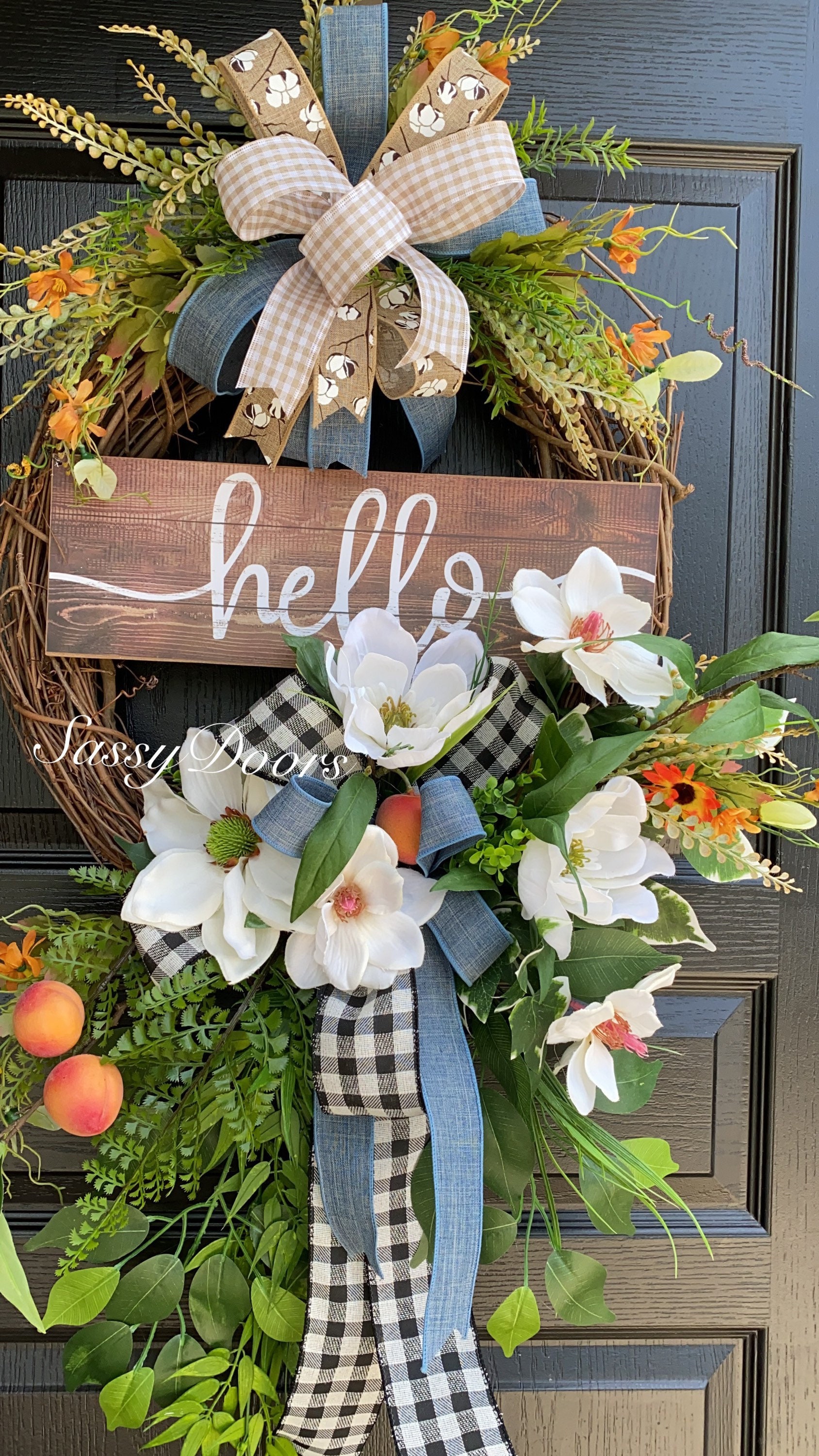 Designed on a grapevine wreath, loaded with beautiful magnolias, greenery, peaches and lots of grass and greenery.