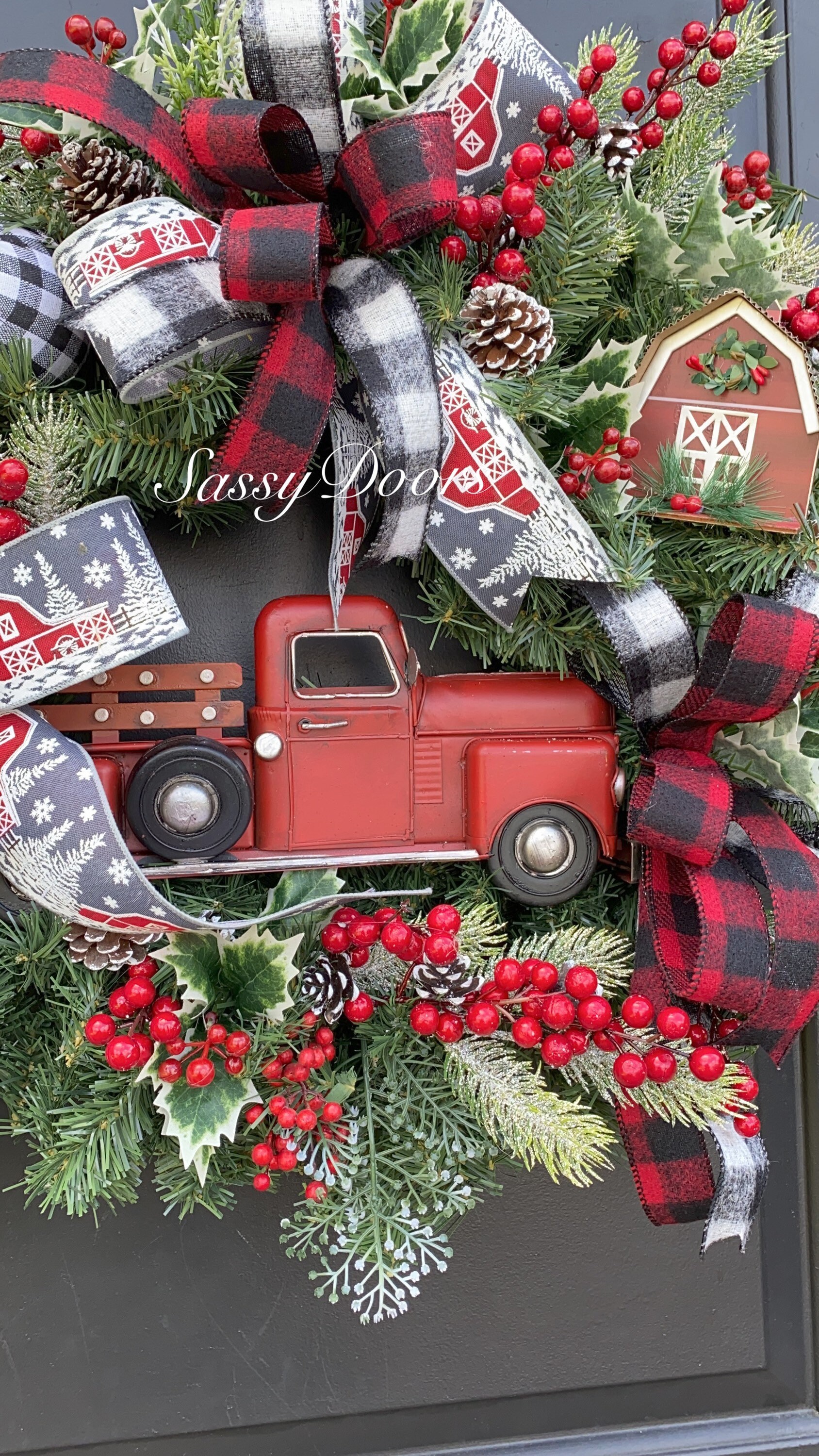 Designed on a 24' designer pine wreath. A beautiful rustic red metal truck is the focal point and the most trending item this Christmas. Accented with red berries, burlap ornaments, pine needles and Farmhouse plaid ribbon, and all the trimmings