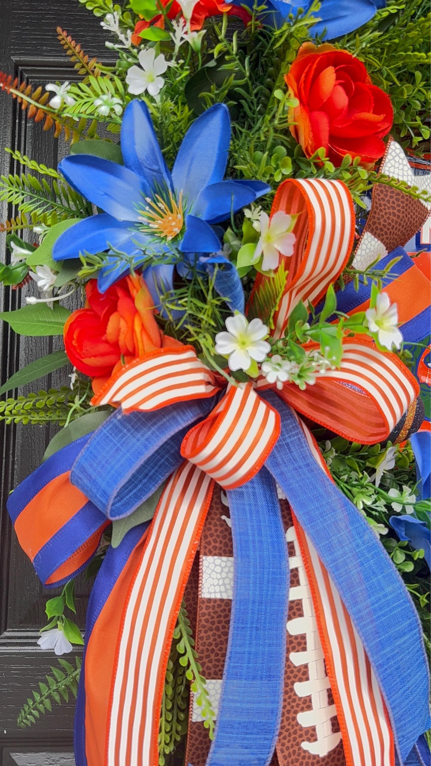 Designed on a natural grapevine wreath and accented with a variety of university colors. Adorned with greenery , grasses and beautiful flowers. Accented with coordinating ribbons and bows that will make this stand out on your door.