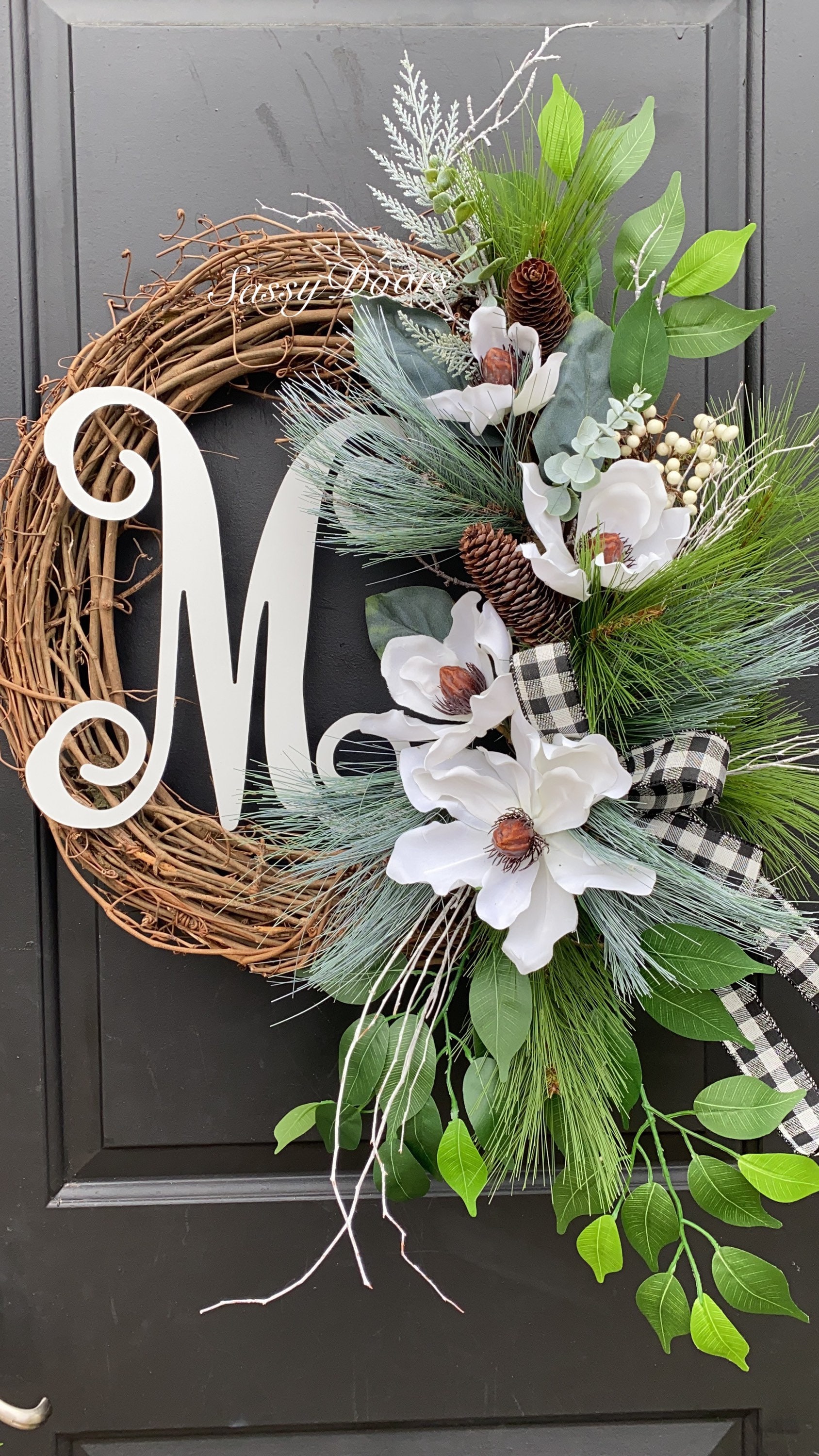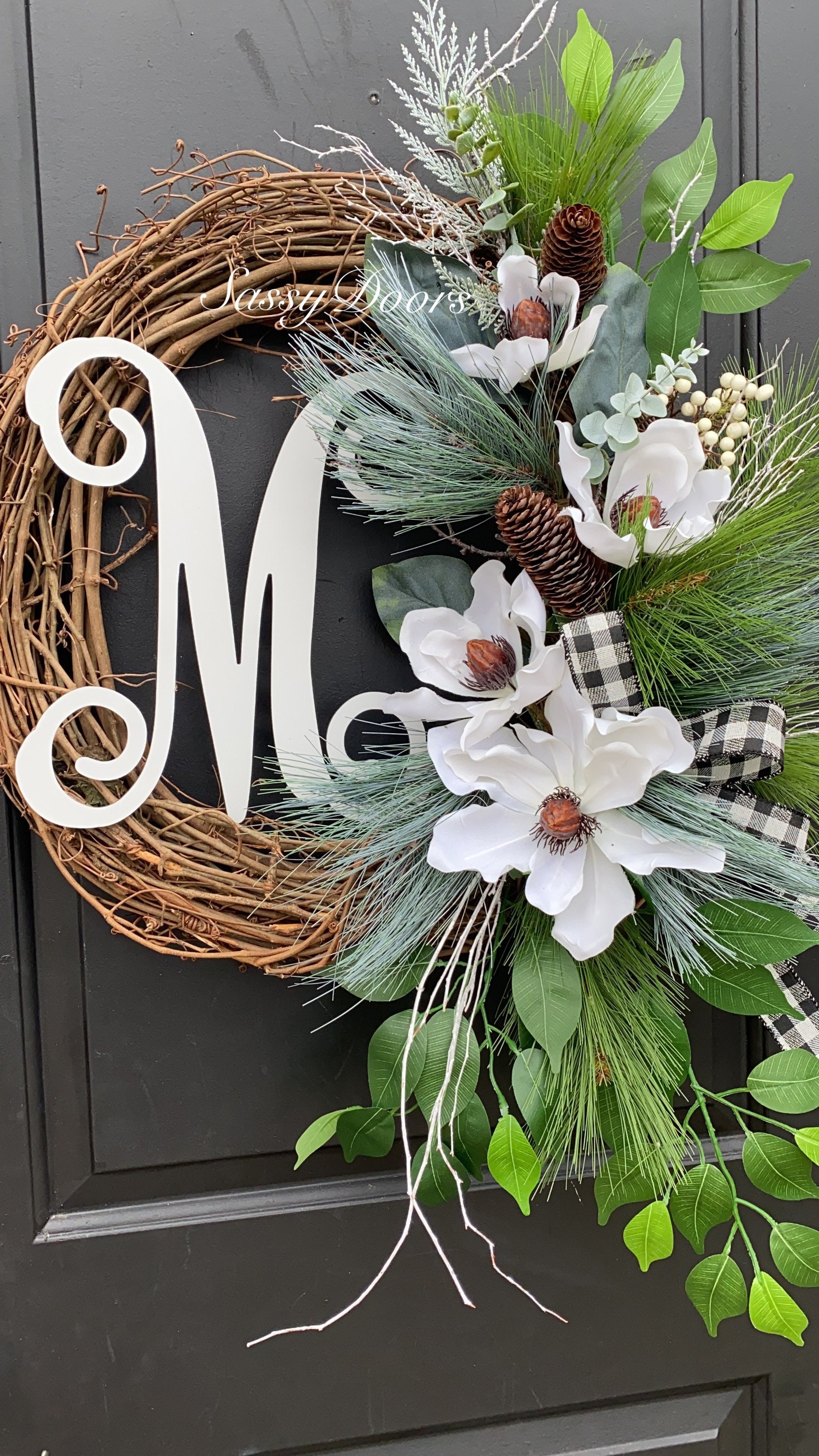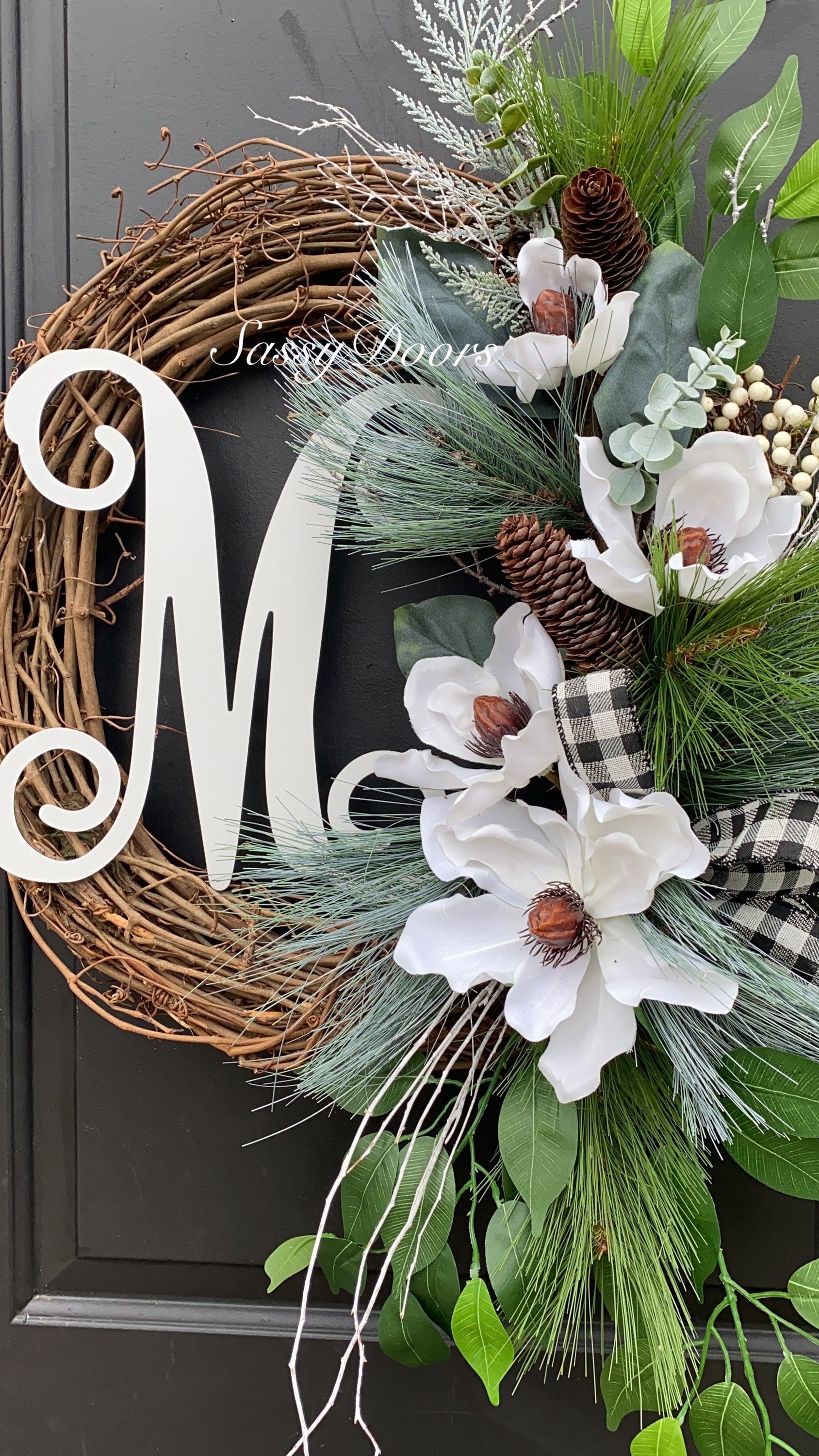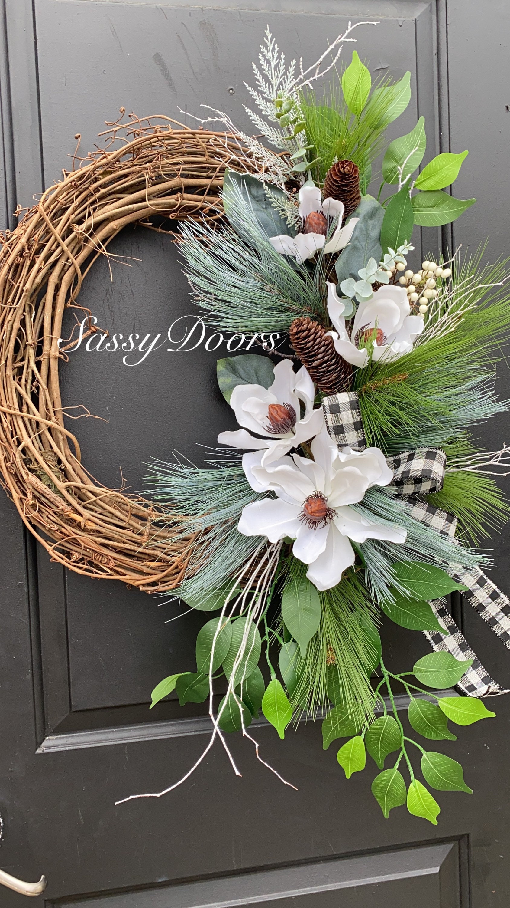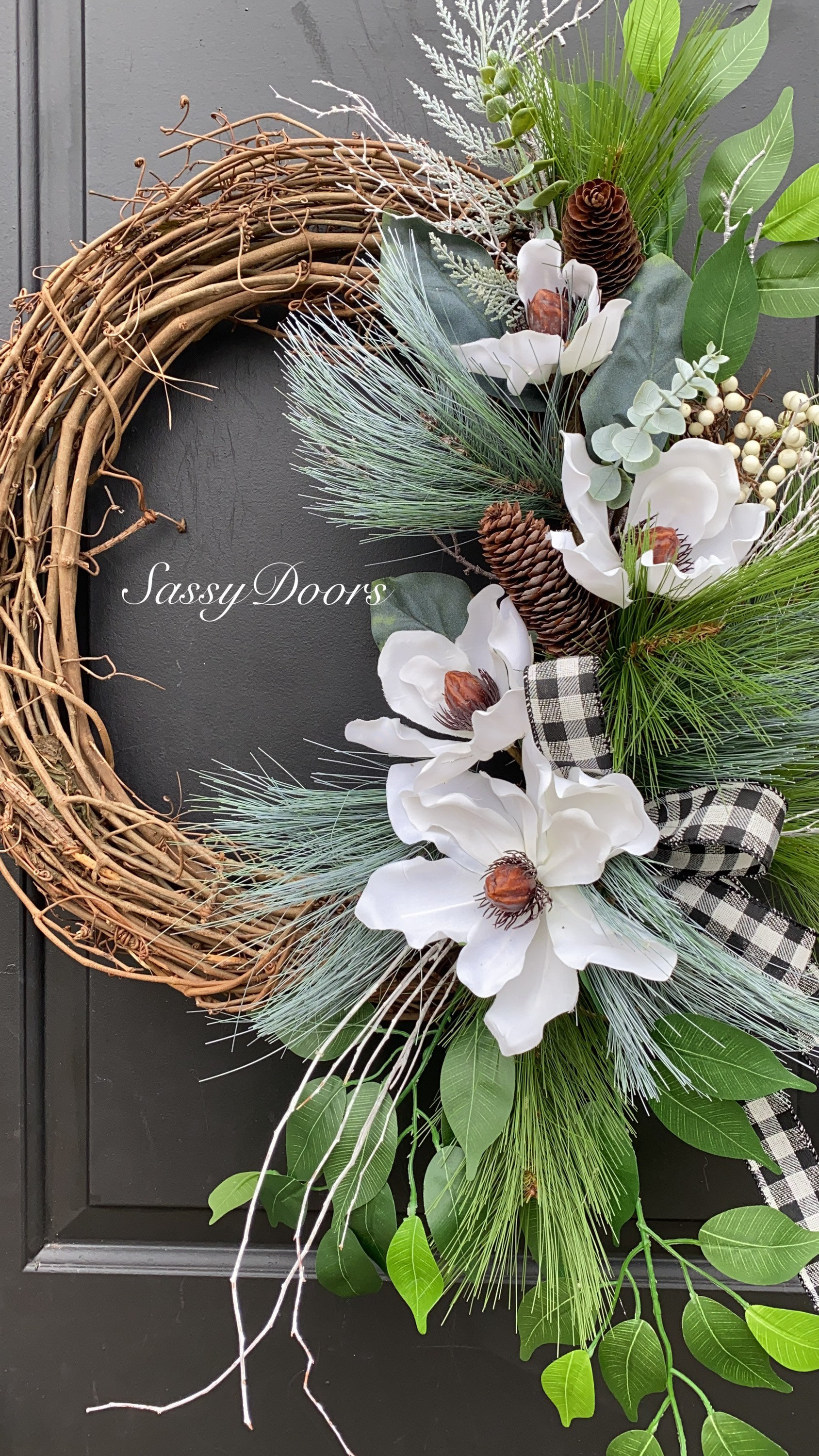 This lovely magnolia winter wreath is the perfect way to dress up your door. What is not to love about these beautiful magnolia and pines winter wreath!