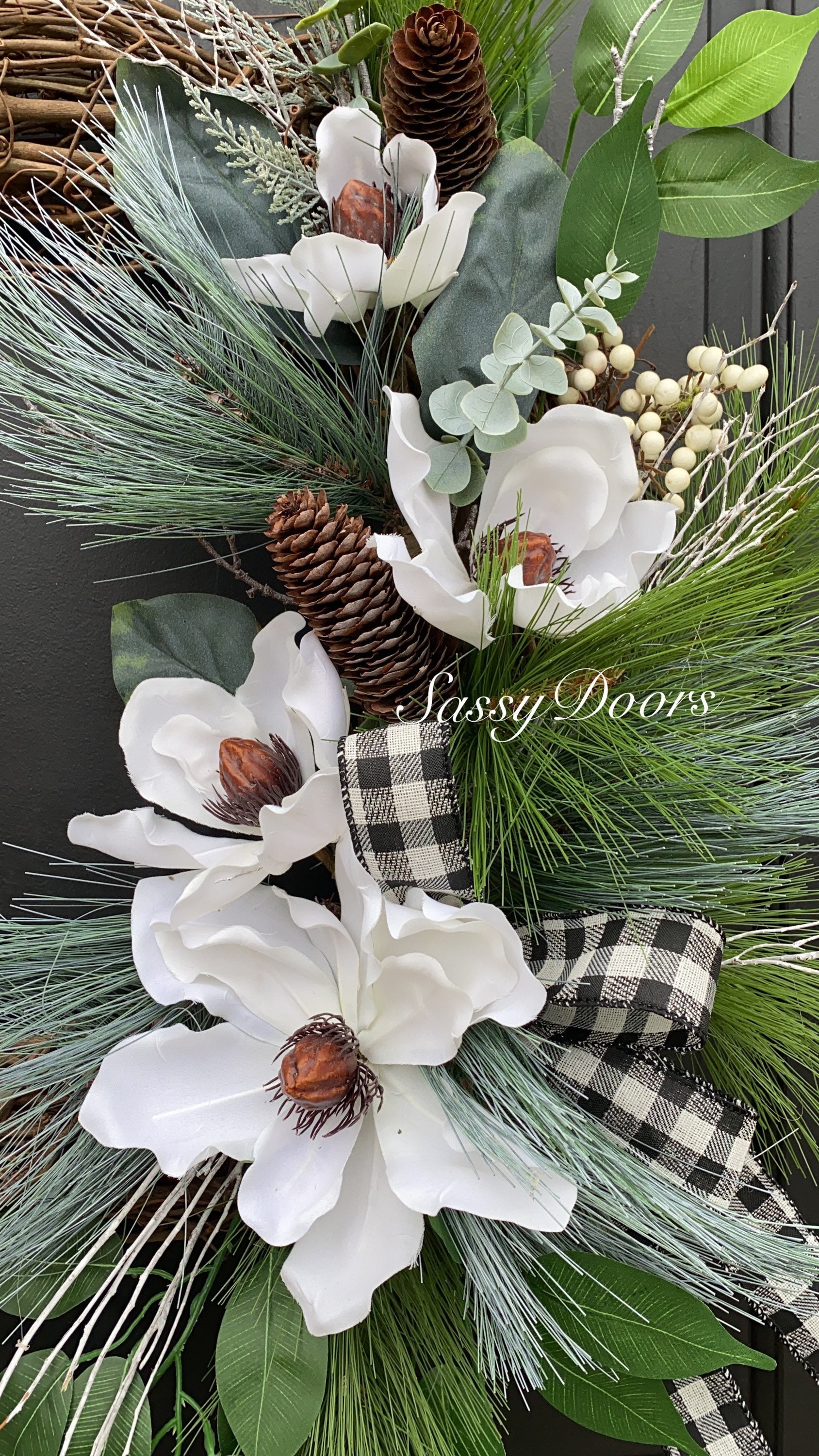 These beautiful magnolias rest among the pines and berries on this 18” Grapevine wreath.
