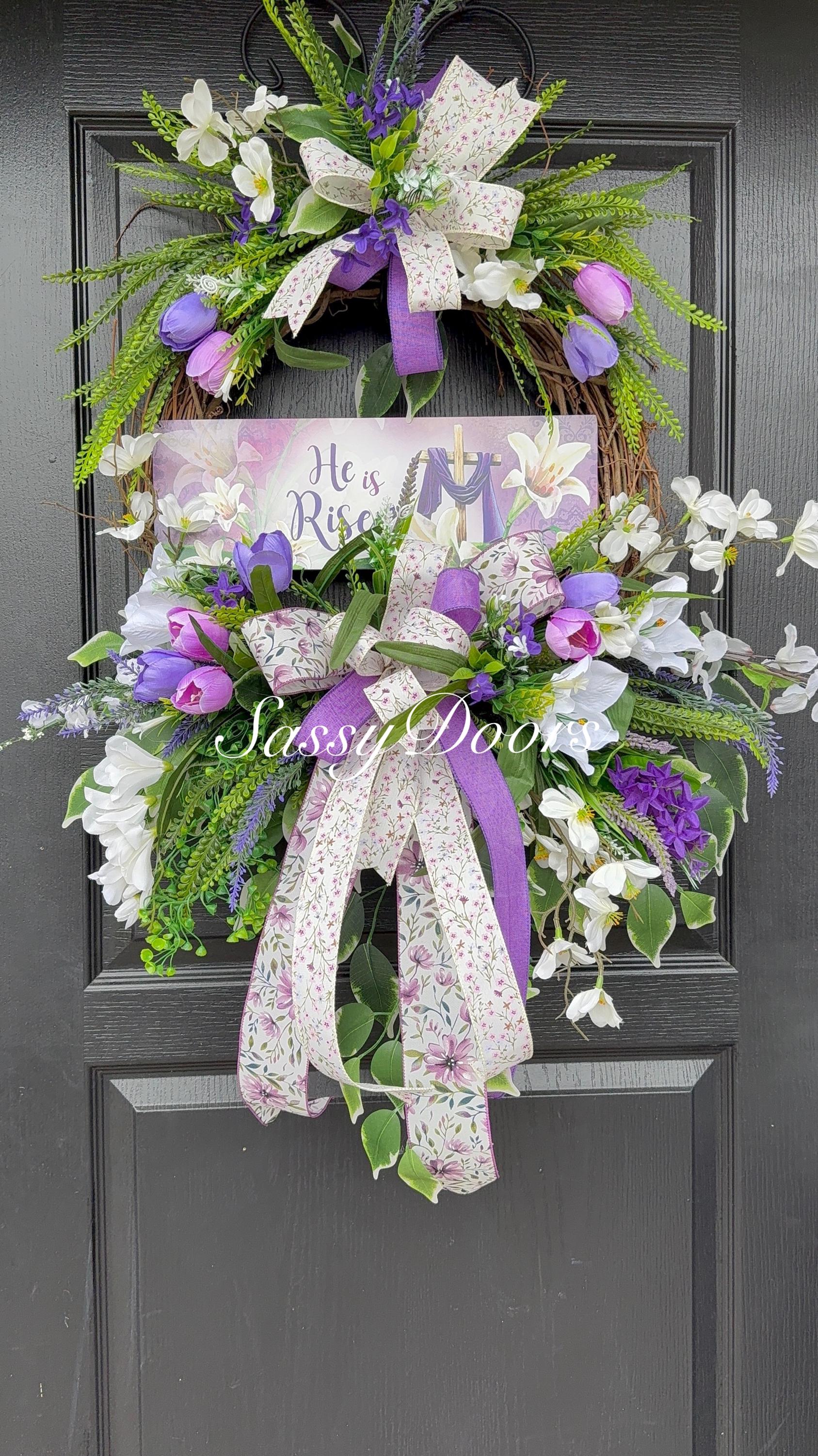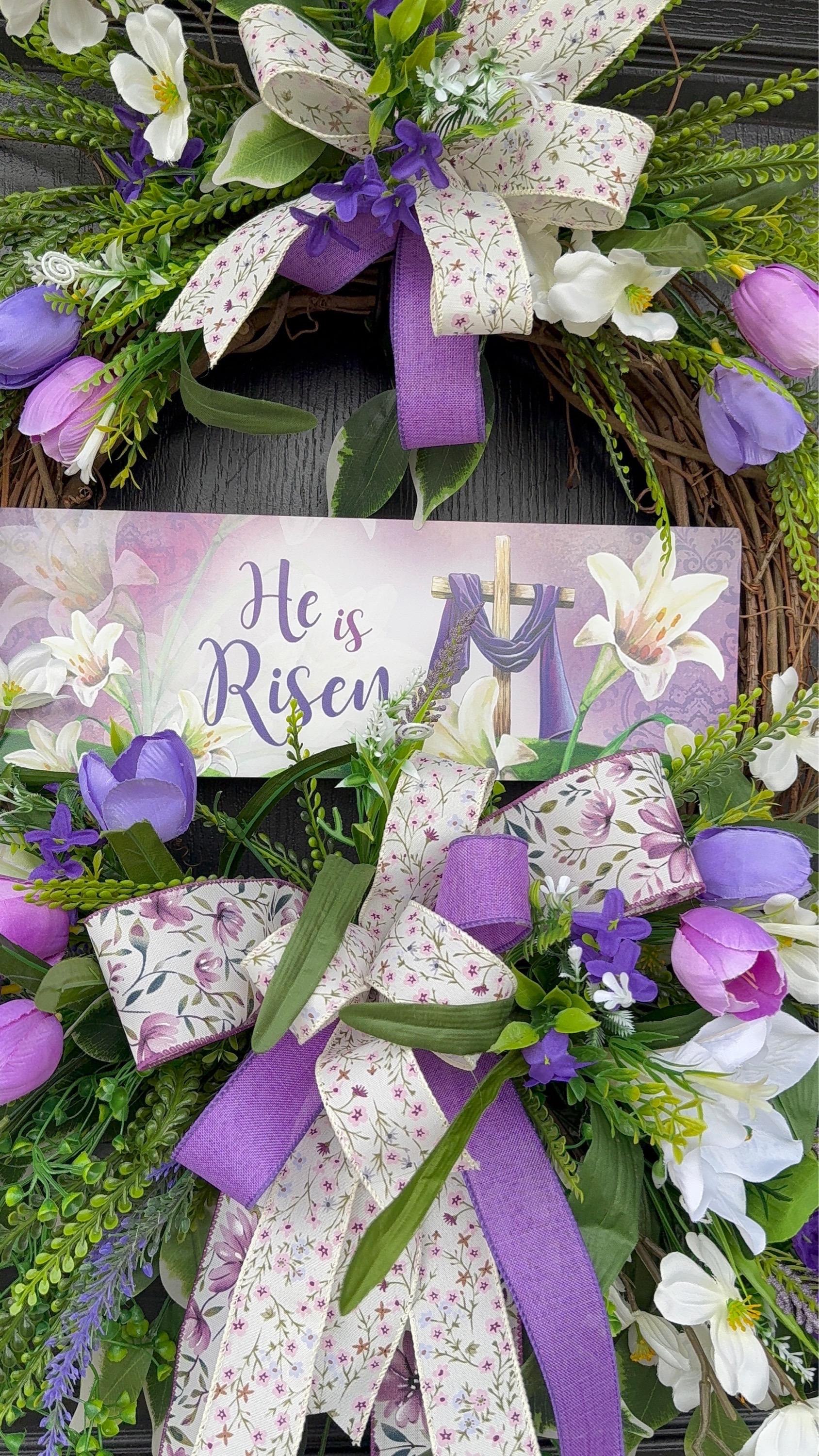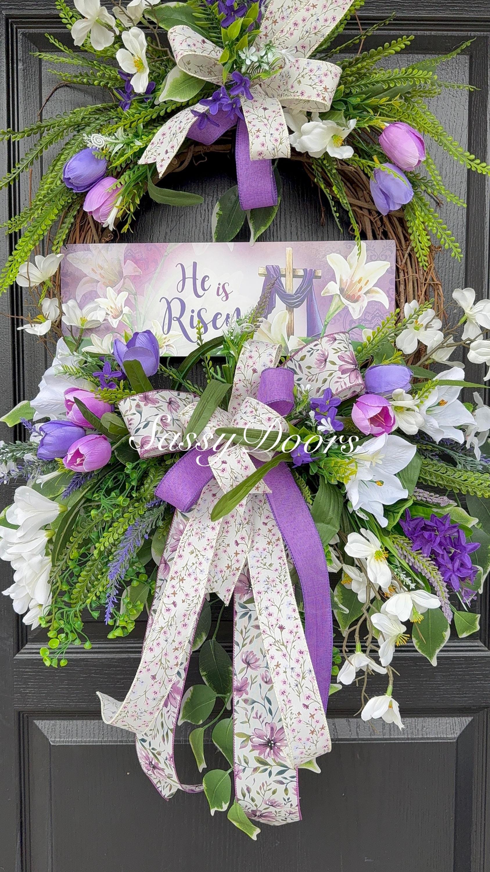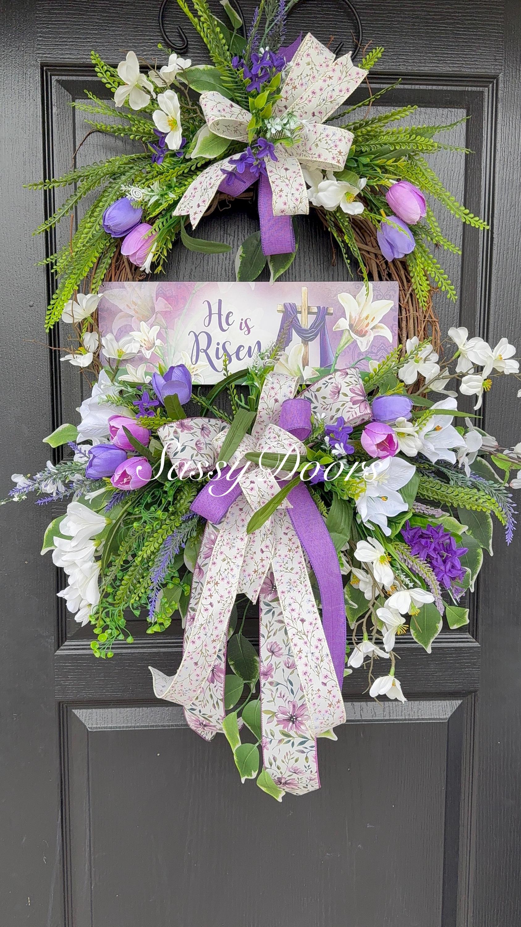 This lovely Religious Easter Wreath was designed on a natural grapevine wreath and adorned with greenery and a variety of purple flowers, Easter lilies, dogwoods and other seasonal flowers. This wreath is stunning!
