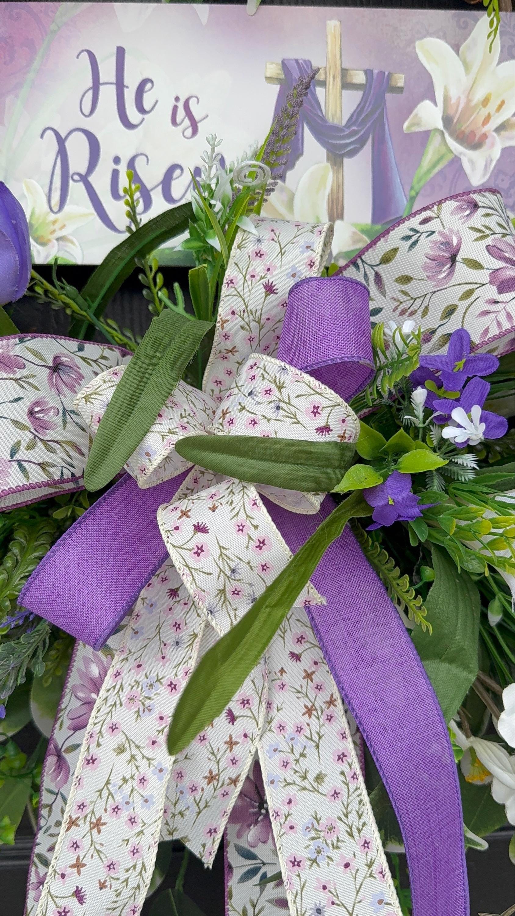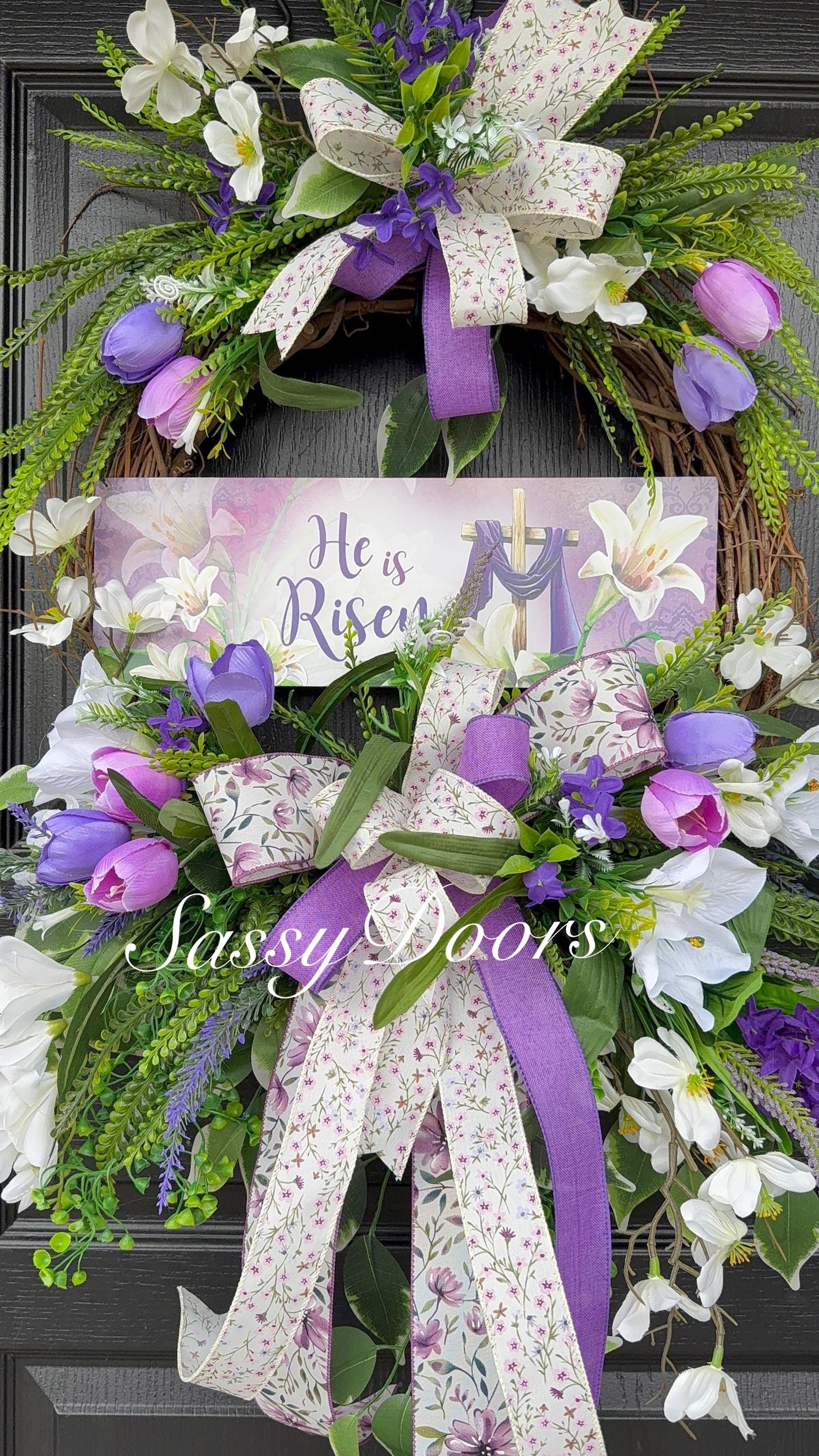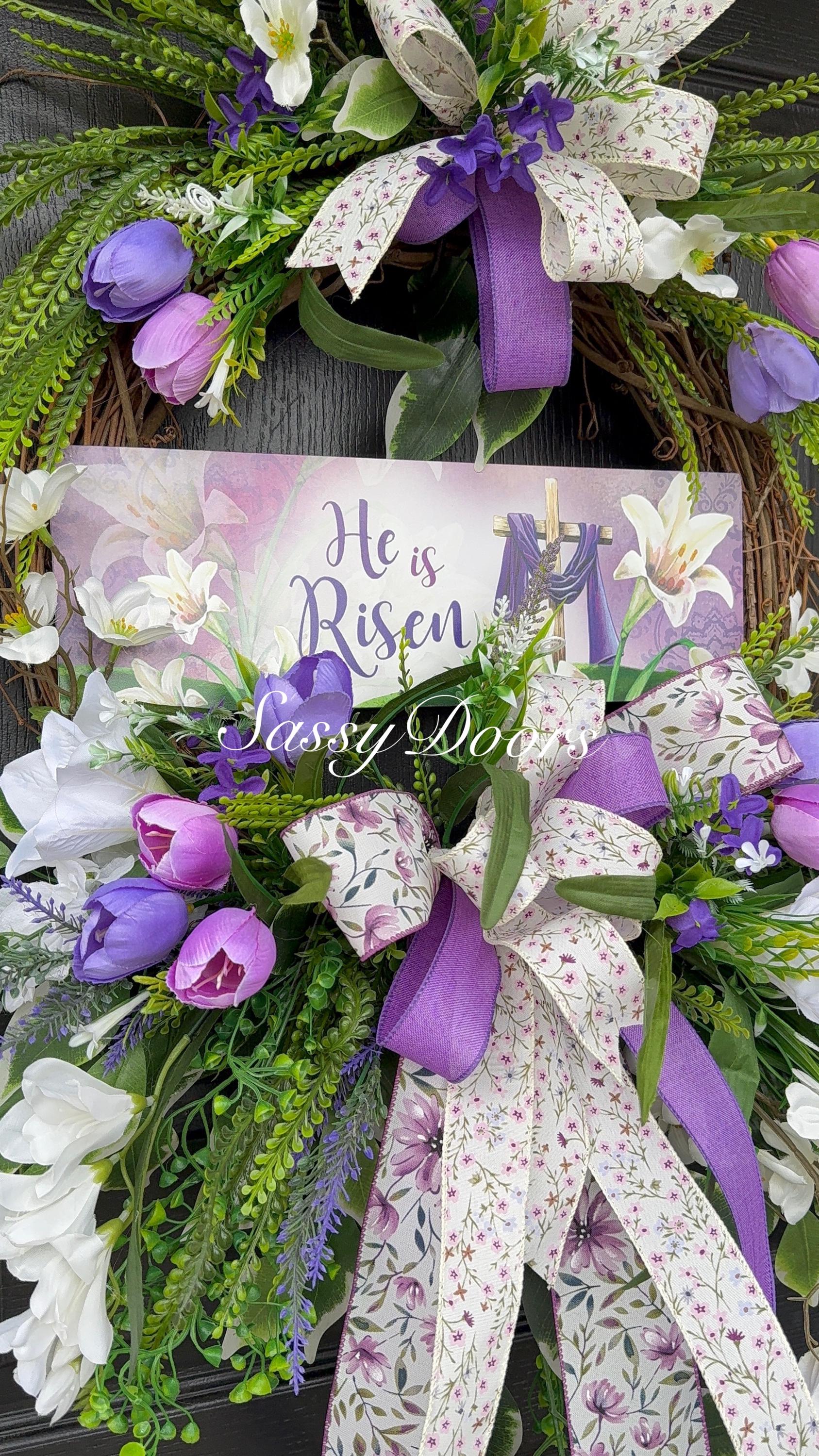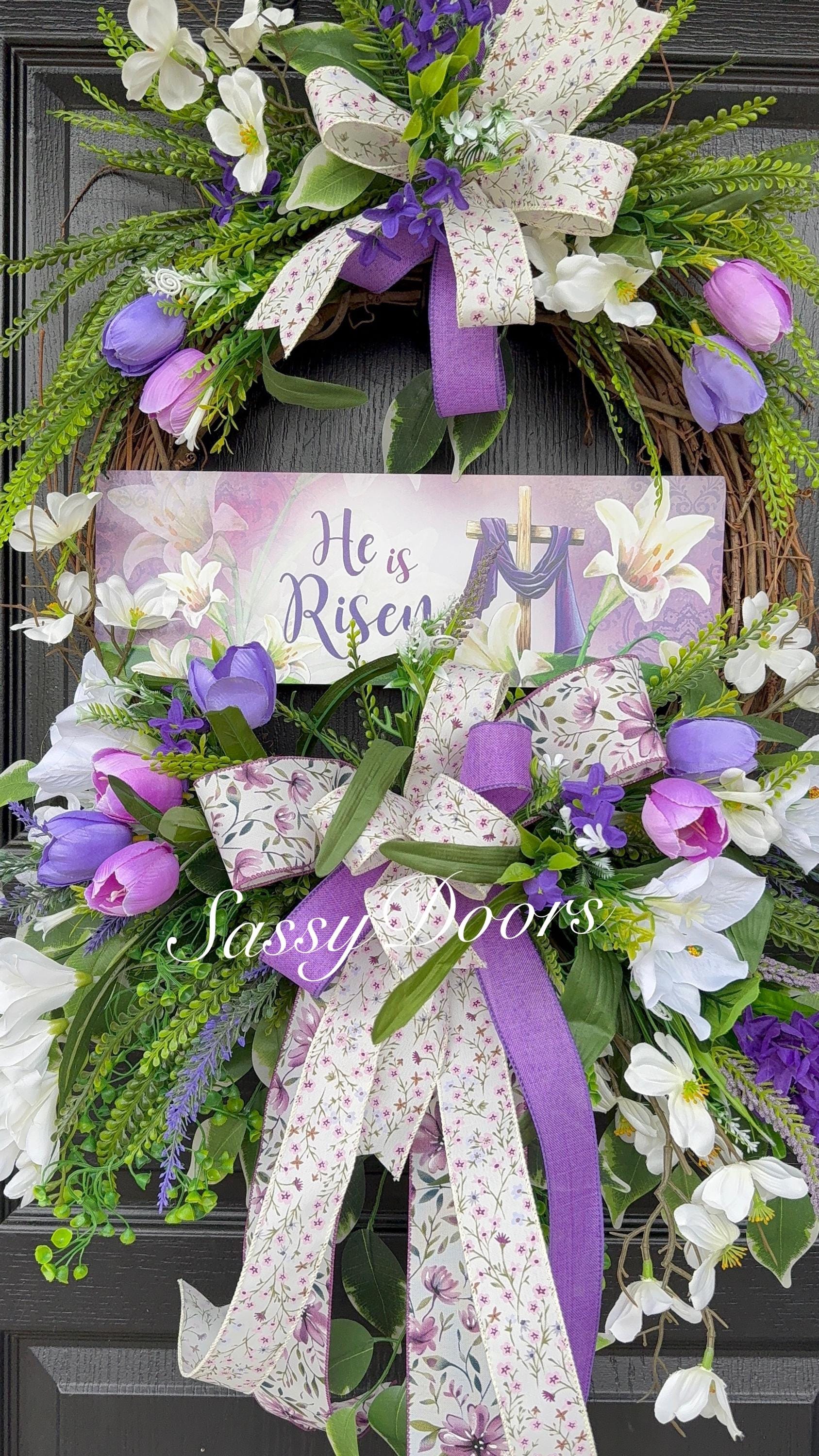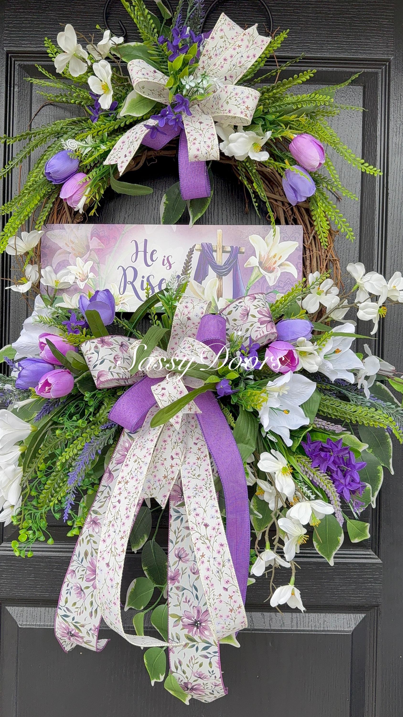 This lovely Religious Easter Wreath was designed on a natural grapevine wreath and adorned with greenery and a variety of purple flowers, Easter lilies, dogwoods and other seasonal flowers. This wreath is stunning!