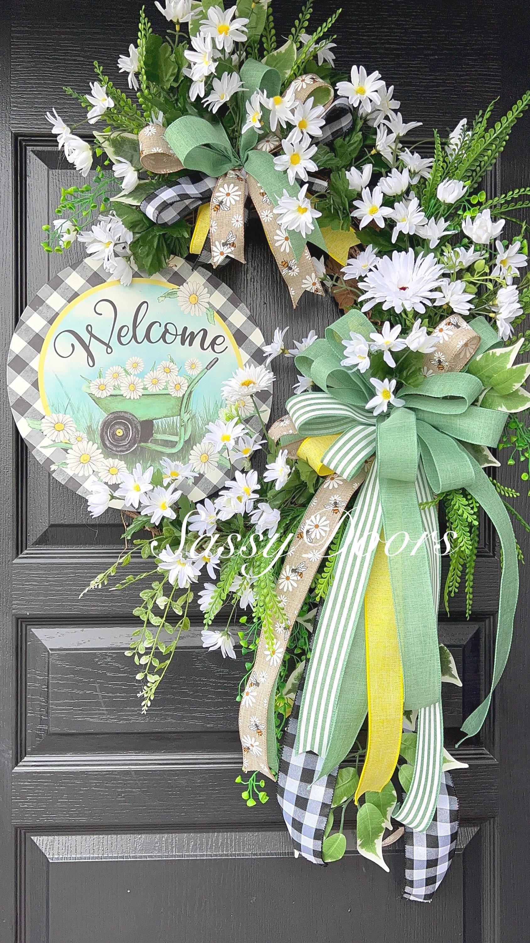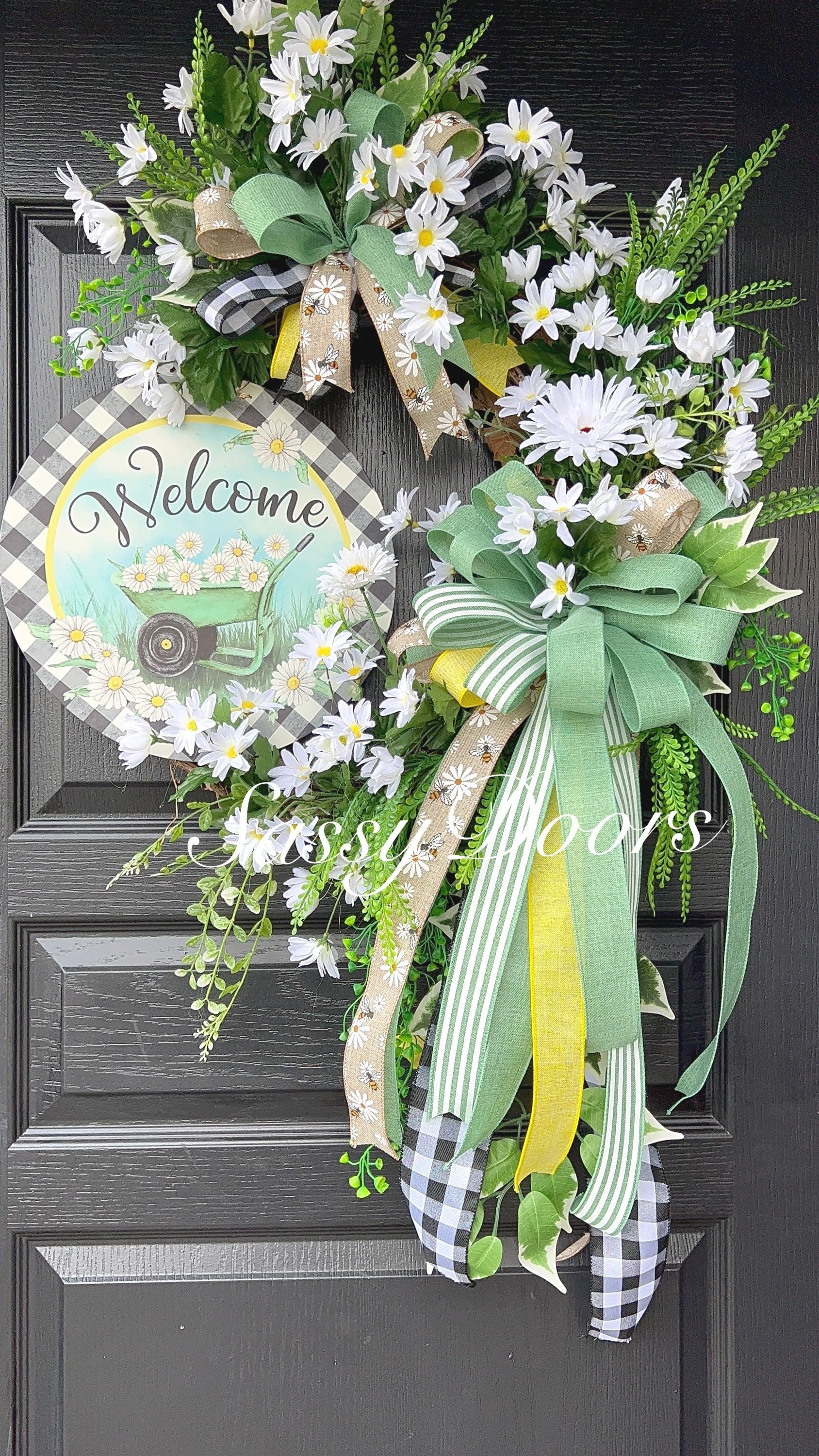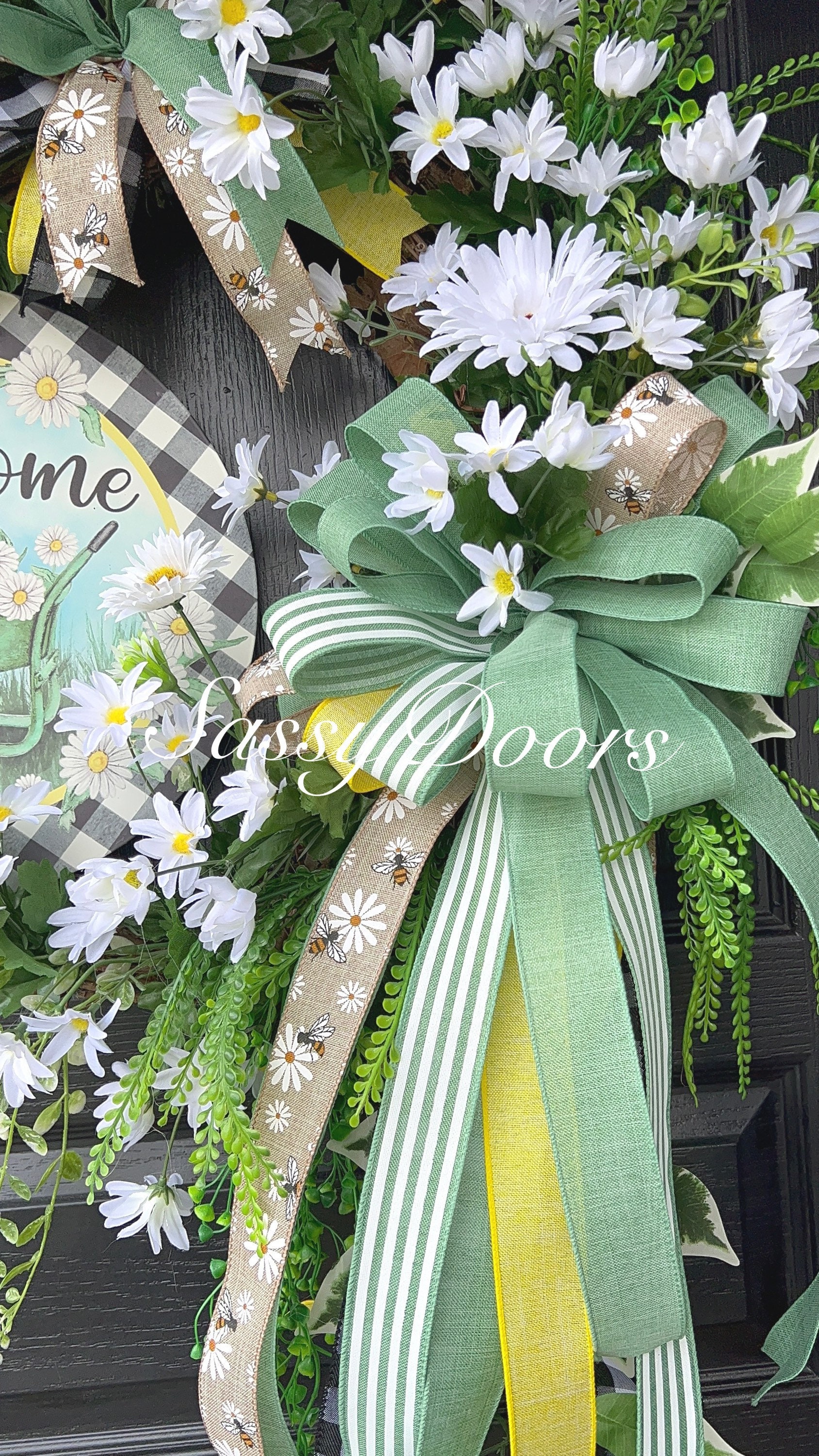 This wreath was designed on a 18” grapevine wreath. What a way to bring your summer garden to your door. Adorned with beautiful daisies and so much more. The lush ribbons and bows adds a pop of color and the finishing touch.