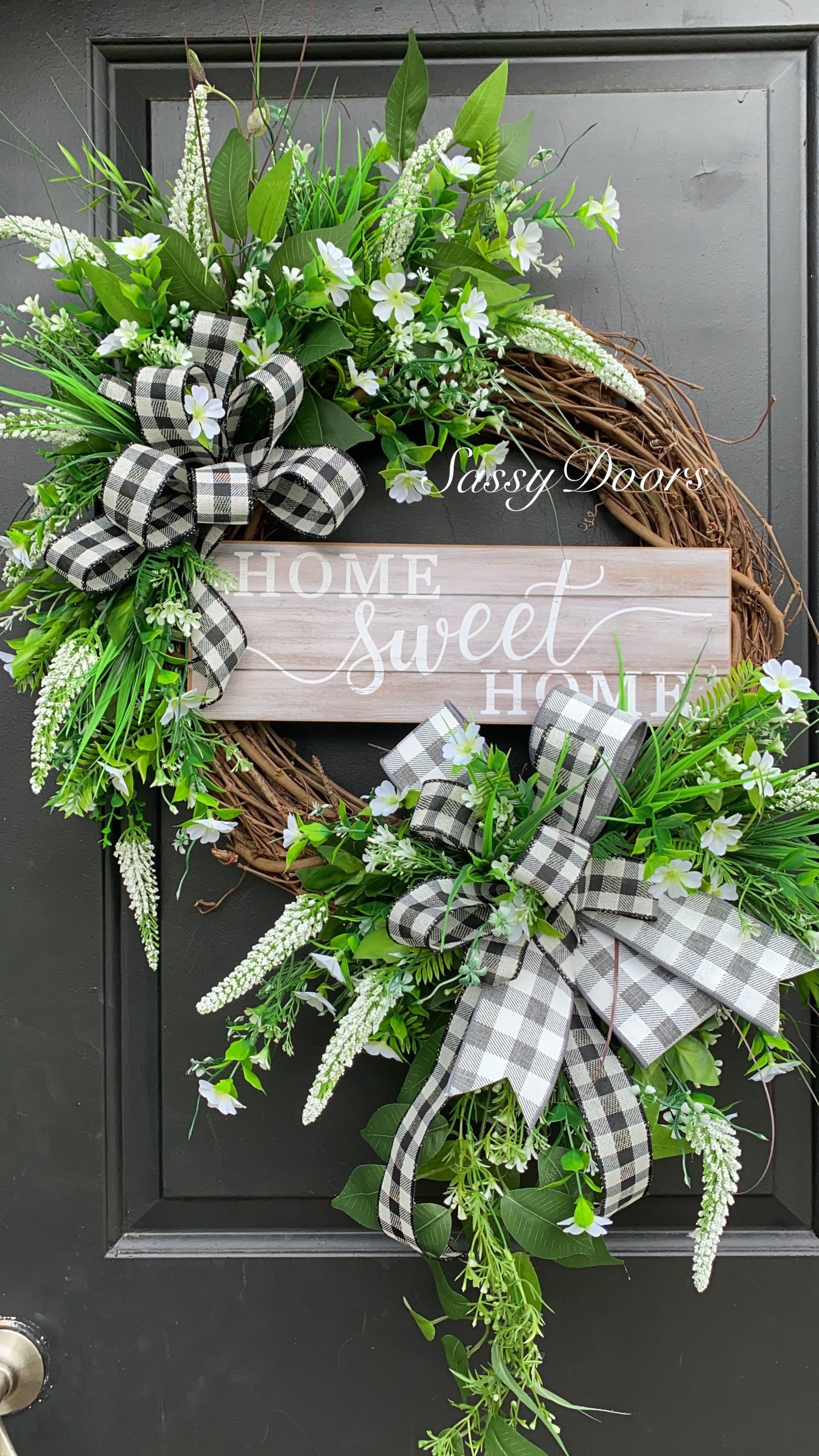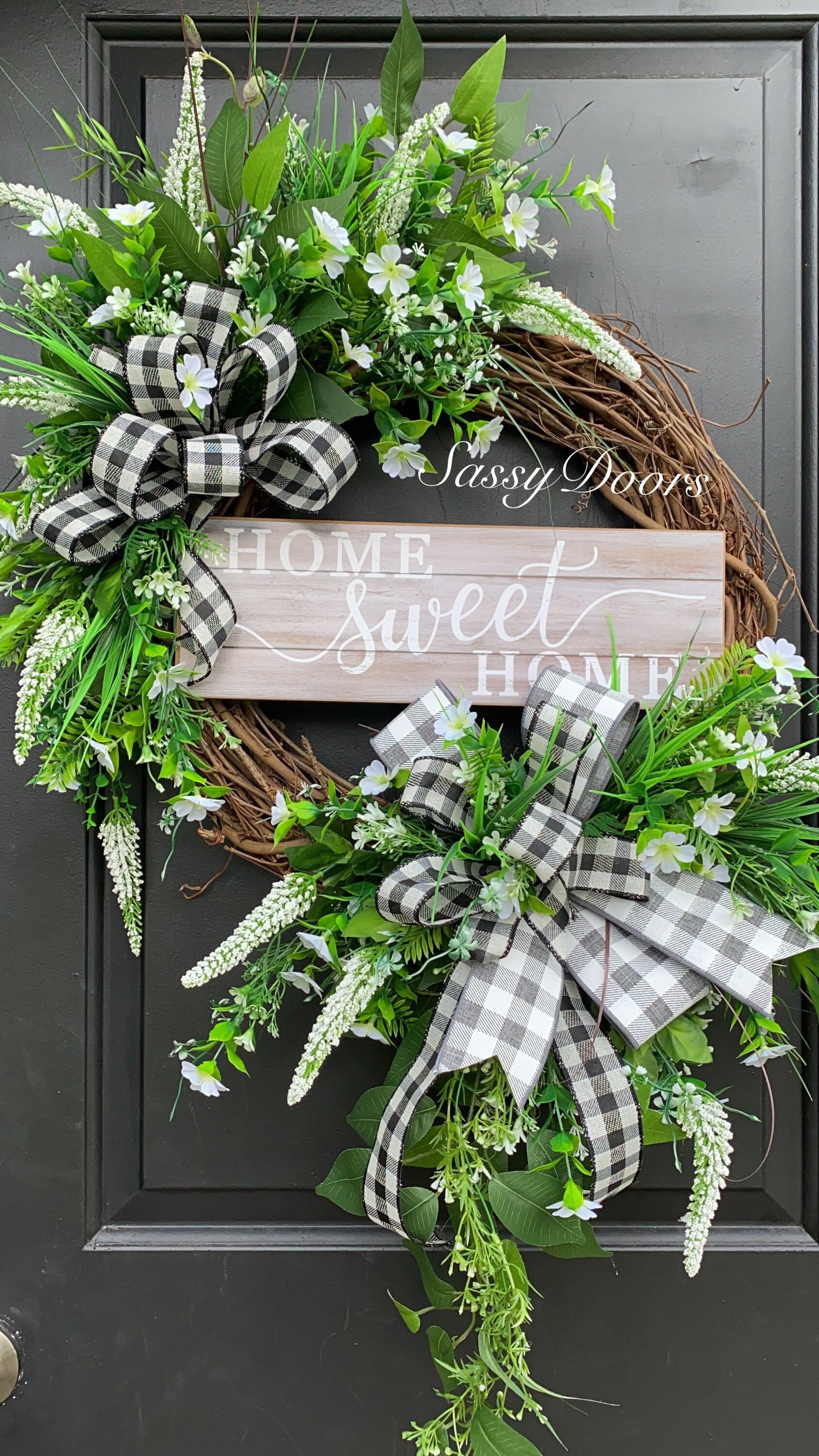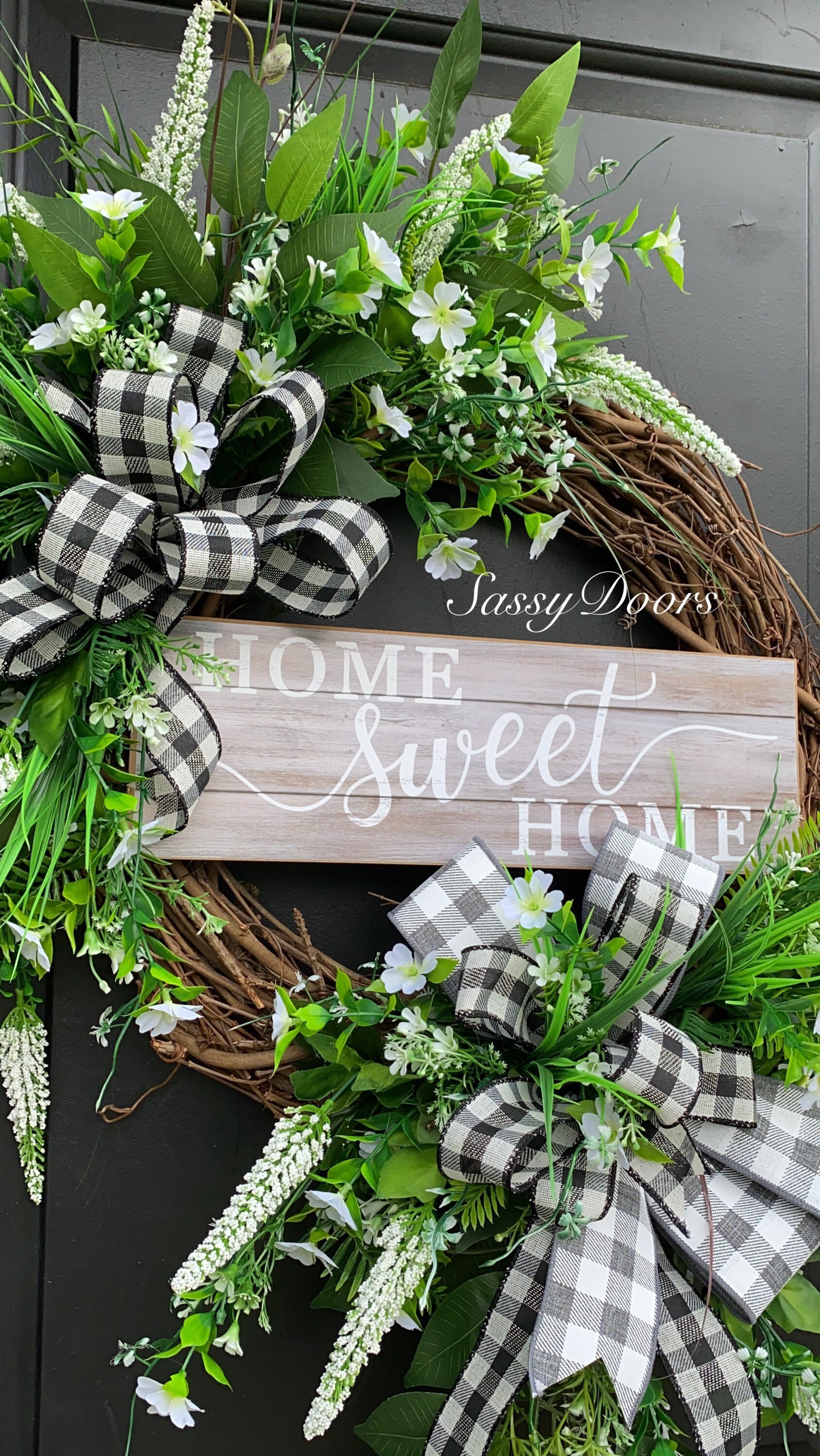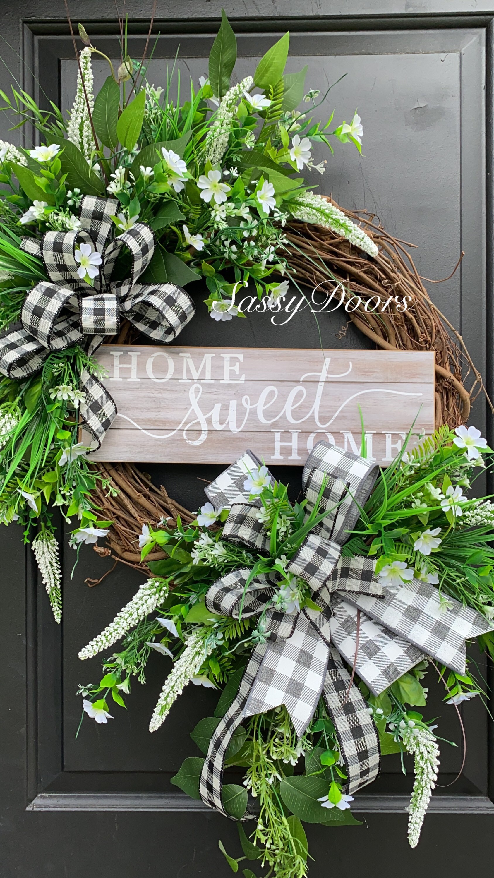 Beautiful wreath to perfect for those trendy color doors. Designed on a 18 inch grapevine wreath and loaded with lovely tiny white flowers, greenery, grasses and so much more. The trendy plaid bows and ribbons really give this wreath a wow pop of color.