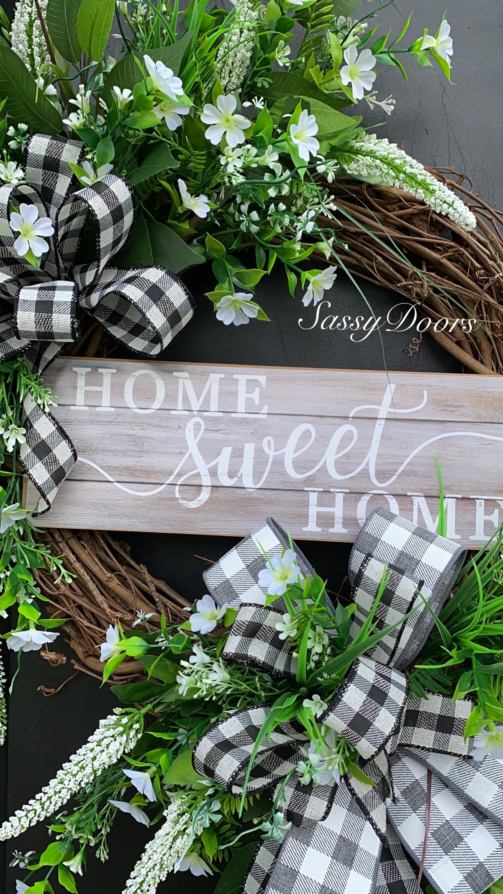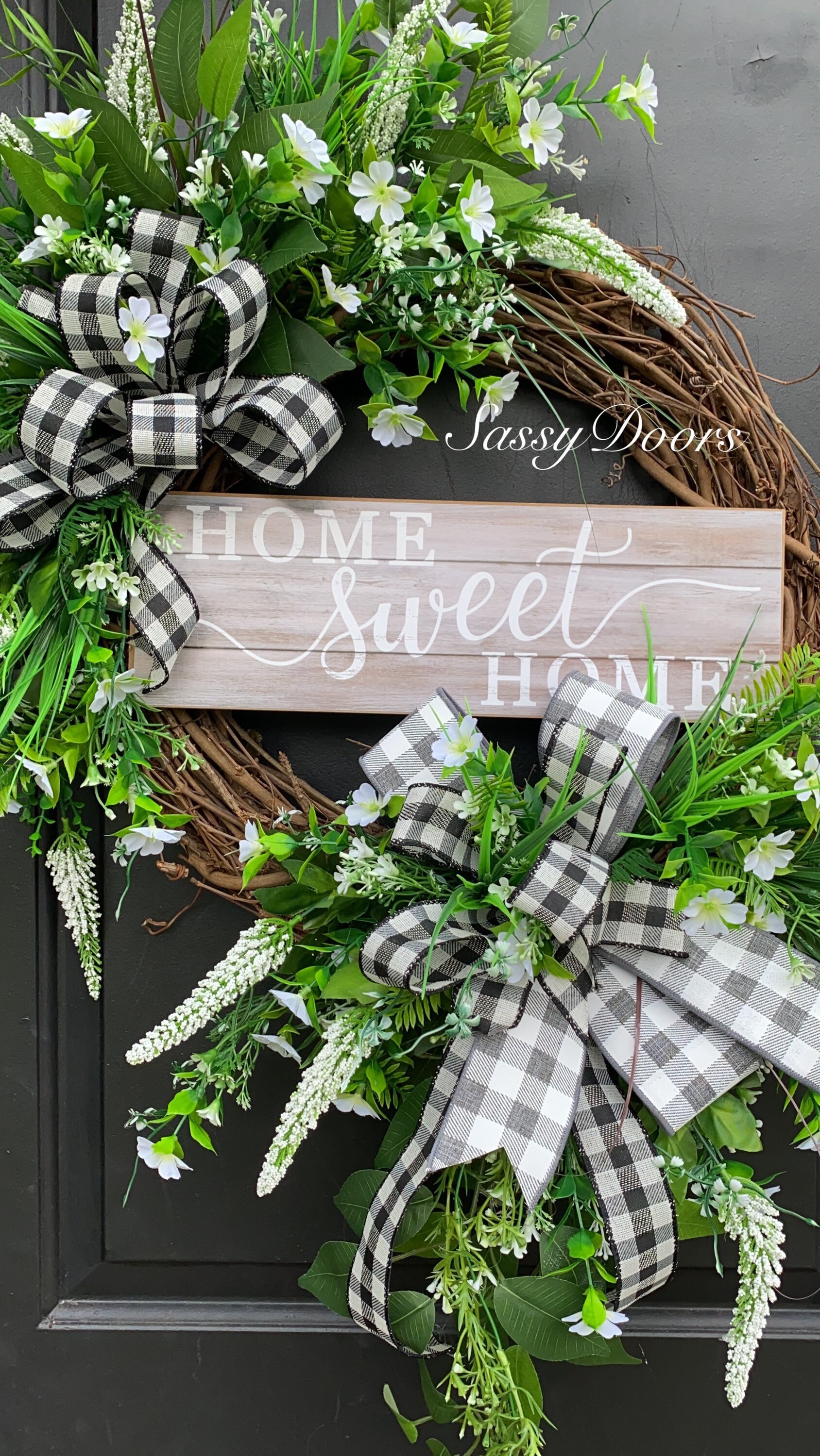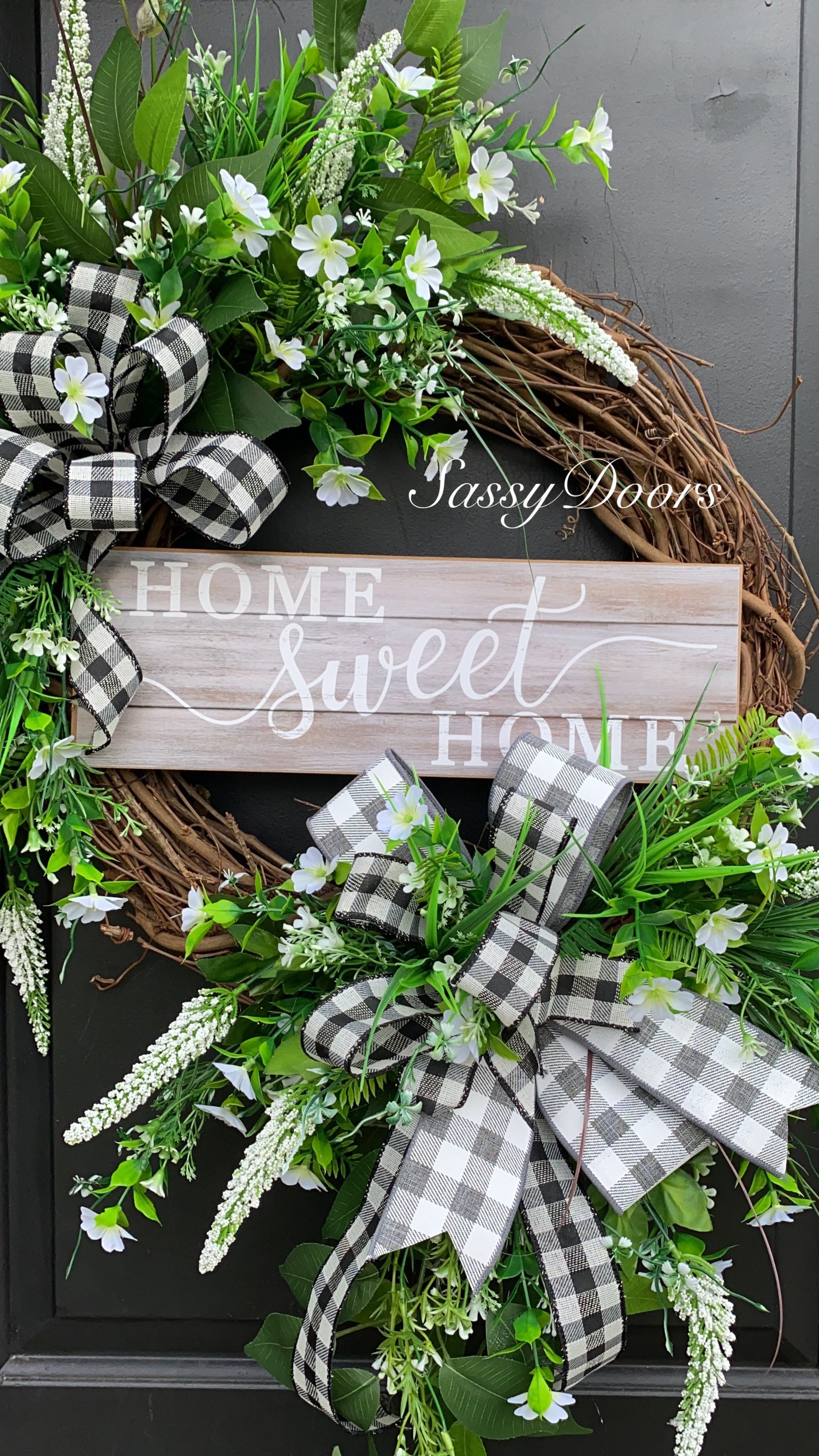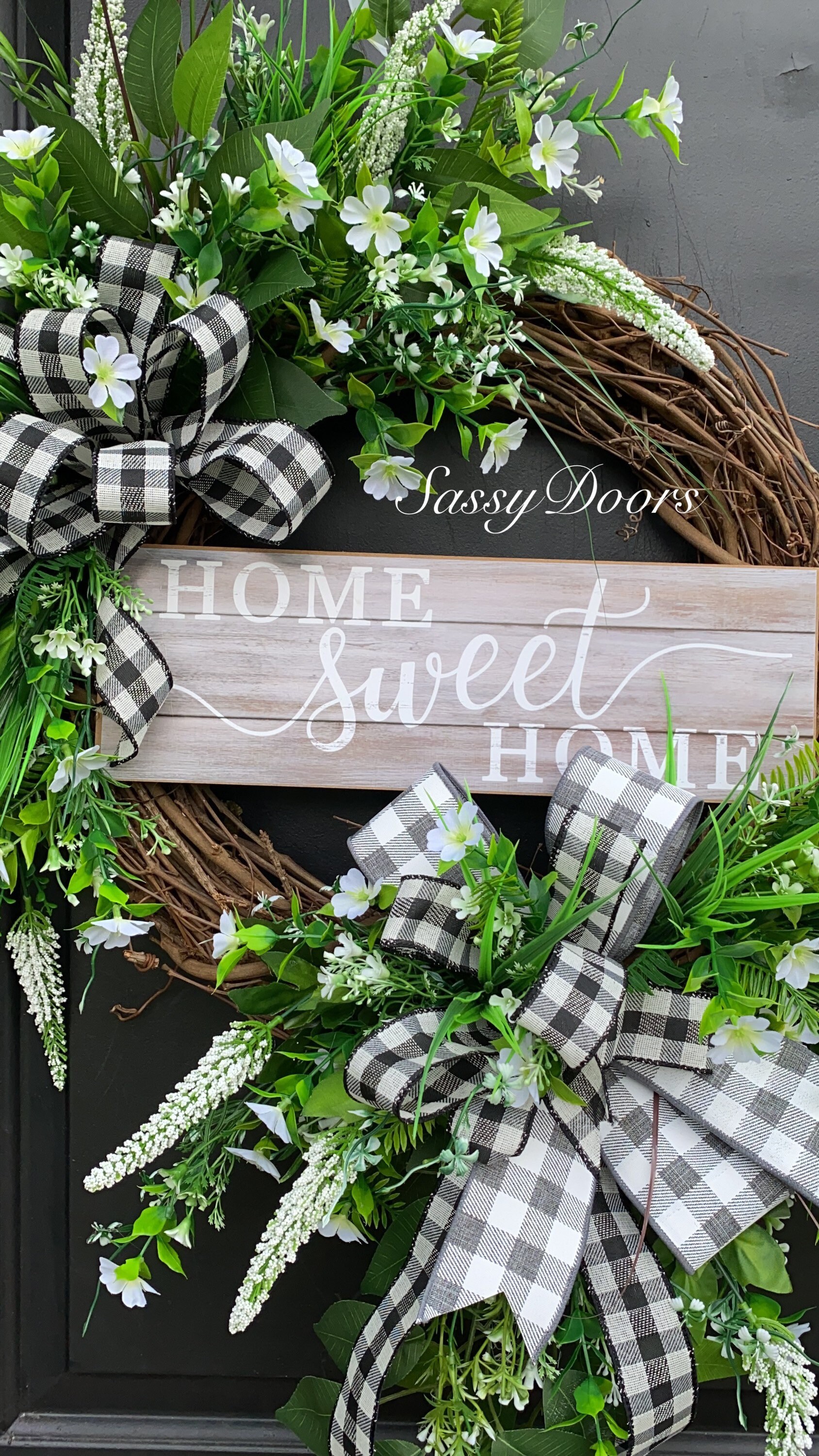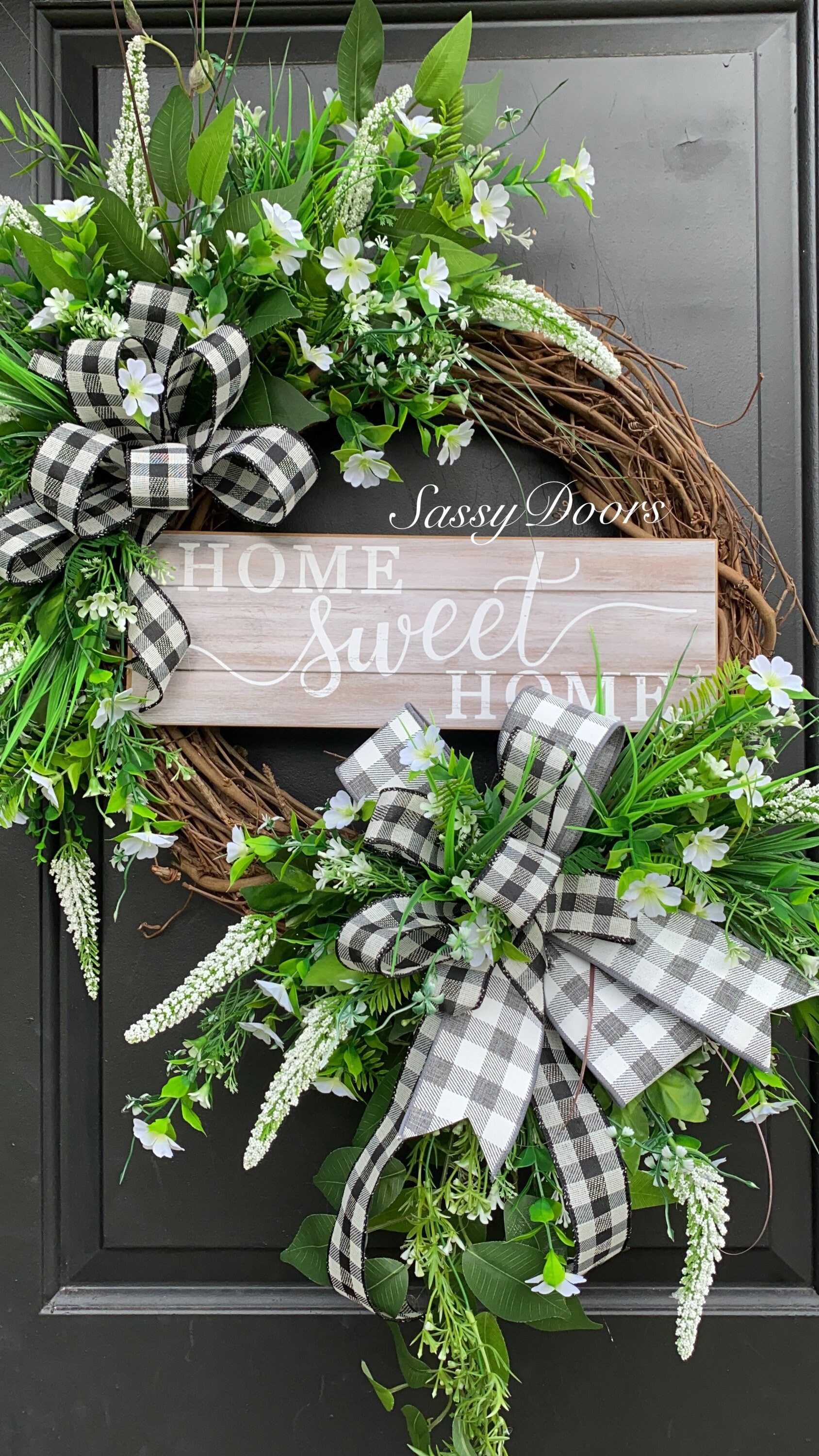 Beautiful wreath to perfect for those trendy color doors. Designed on a 18 inch grapevine wreath and loaded with lovely tiny white flowers, greenery, grasses and so much more. The trendy plaid bows and ribbons really give this wreath a wow pop of color.