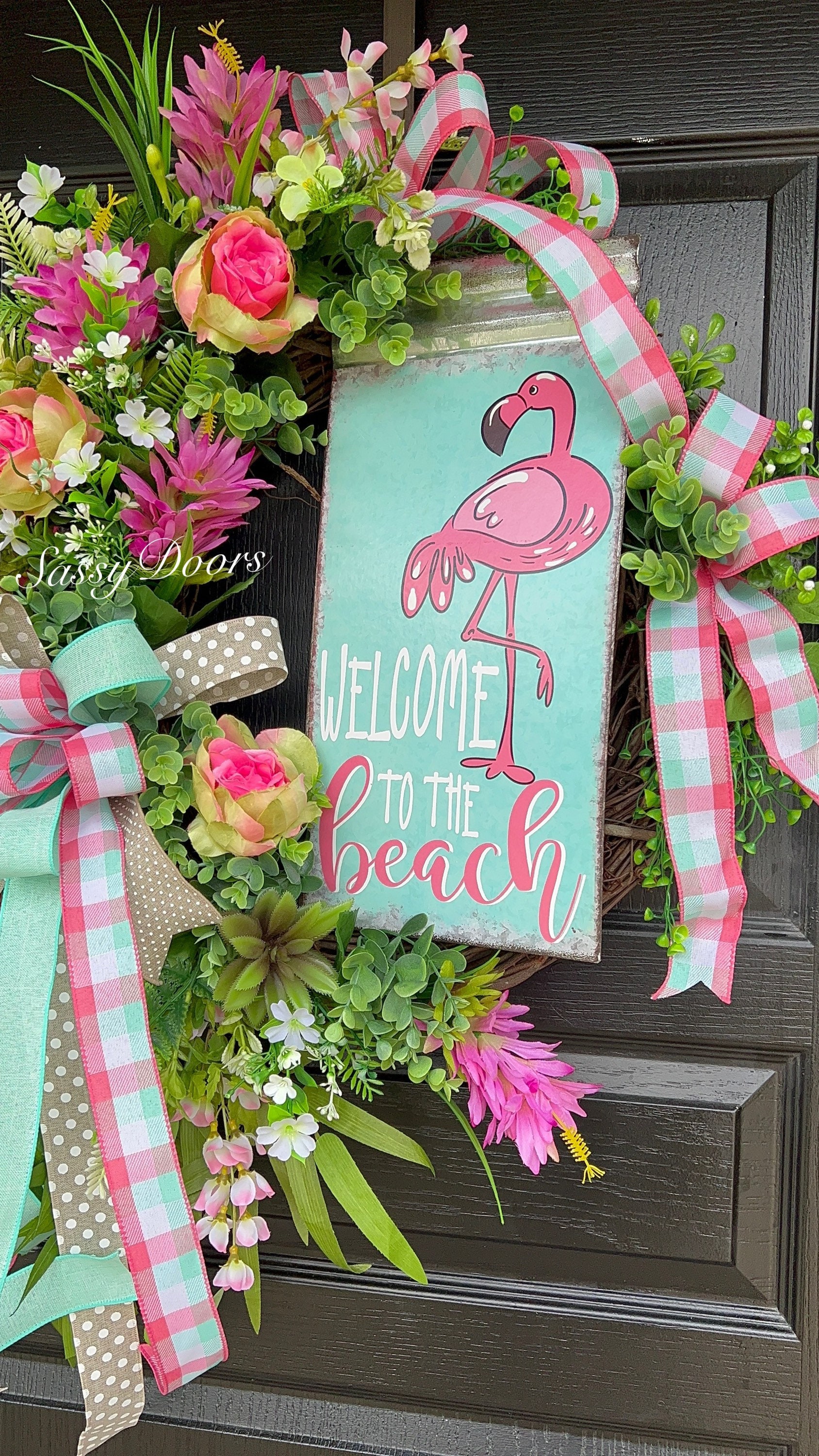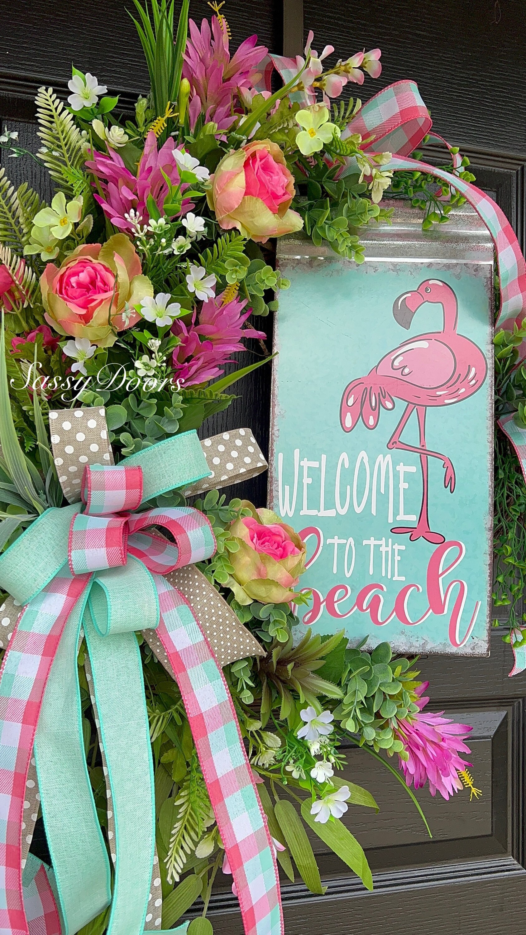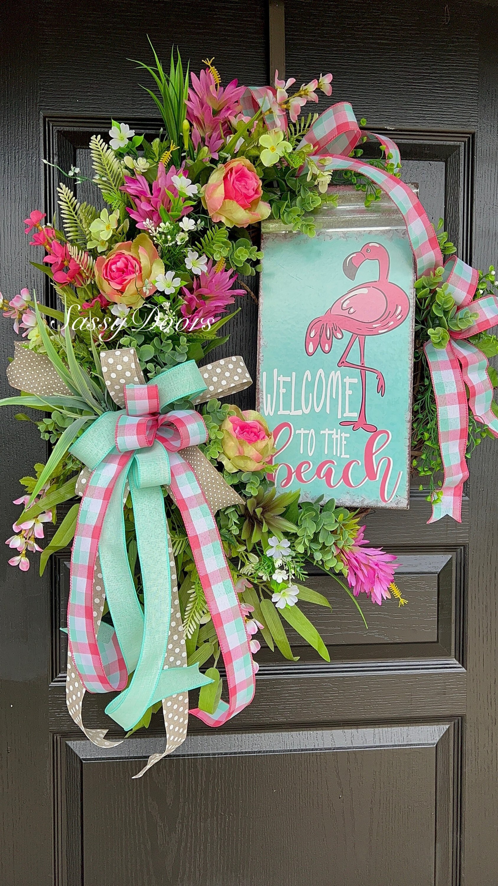 What is Summer without the Pink Flamingo. Don’t have a beach house?? Well, neither do I but I do love to surround myself with a touch of it so a wreath will be perfect! So bring your love for the summertime beaches to your door . Designed to be used indoors as well as outdoors.