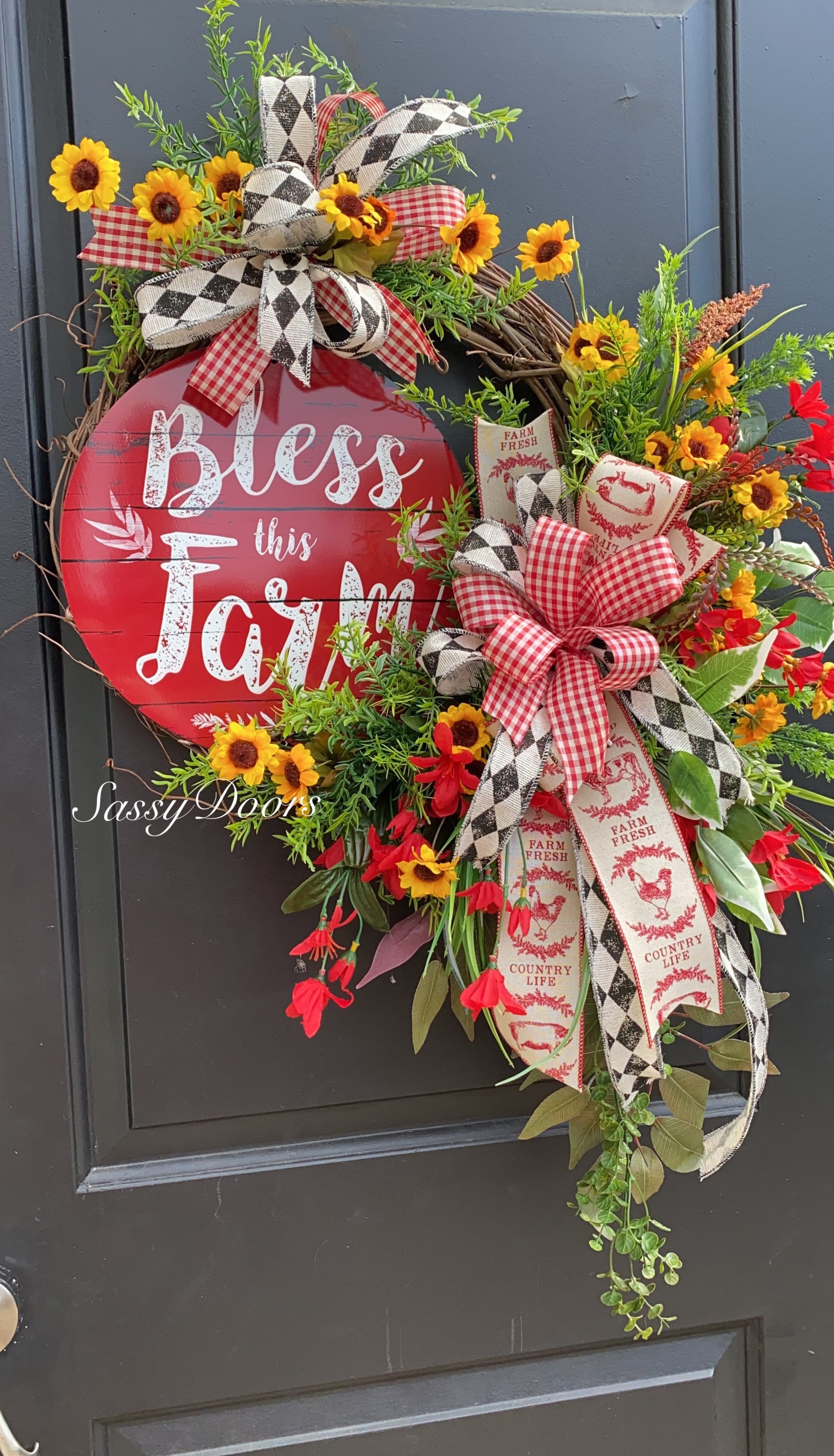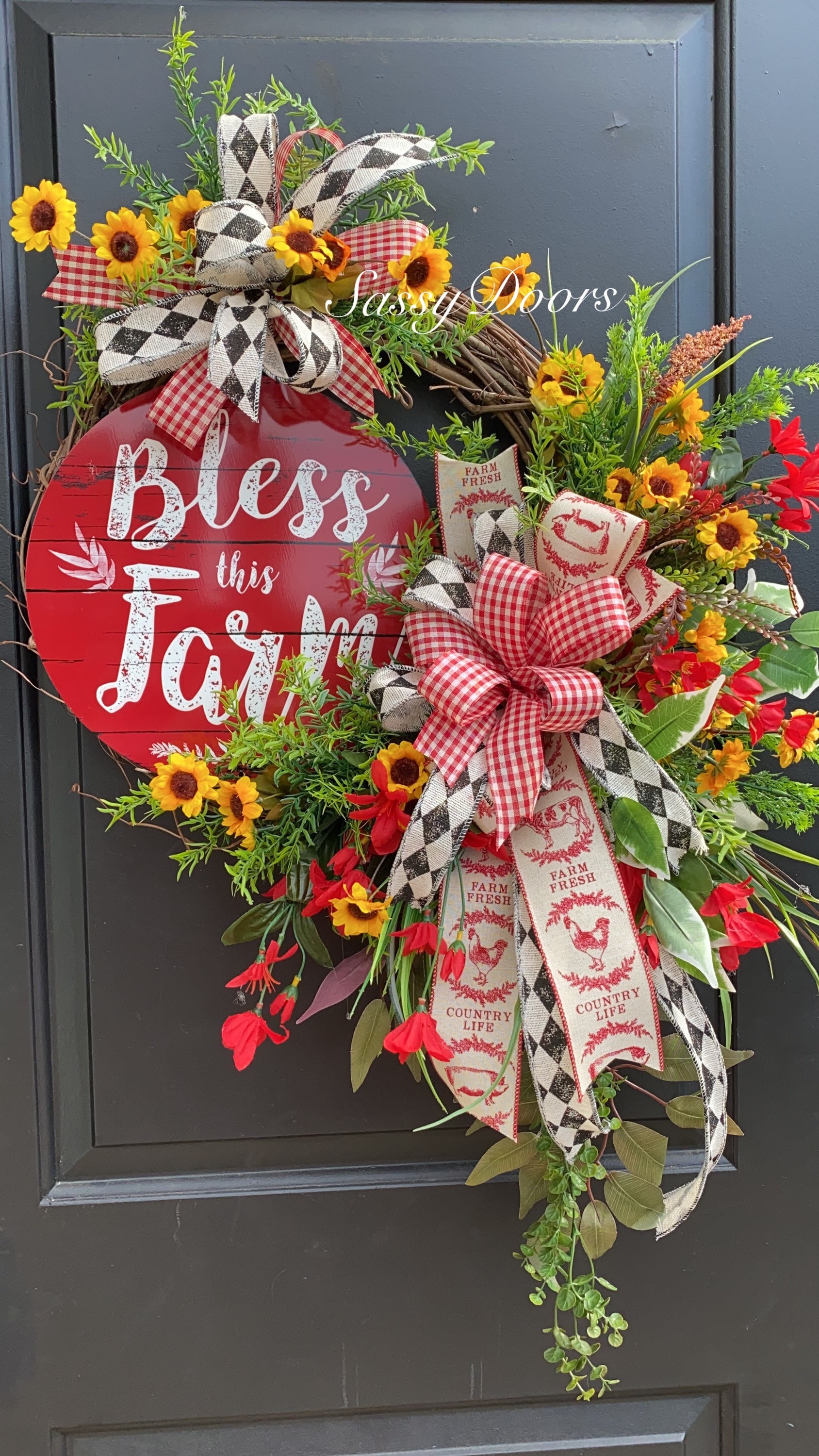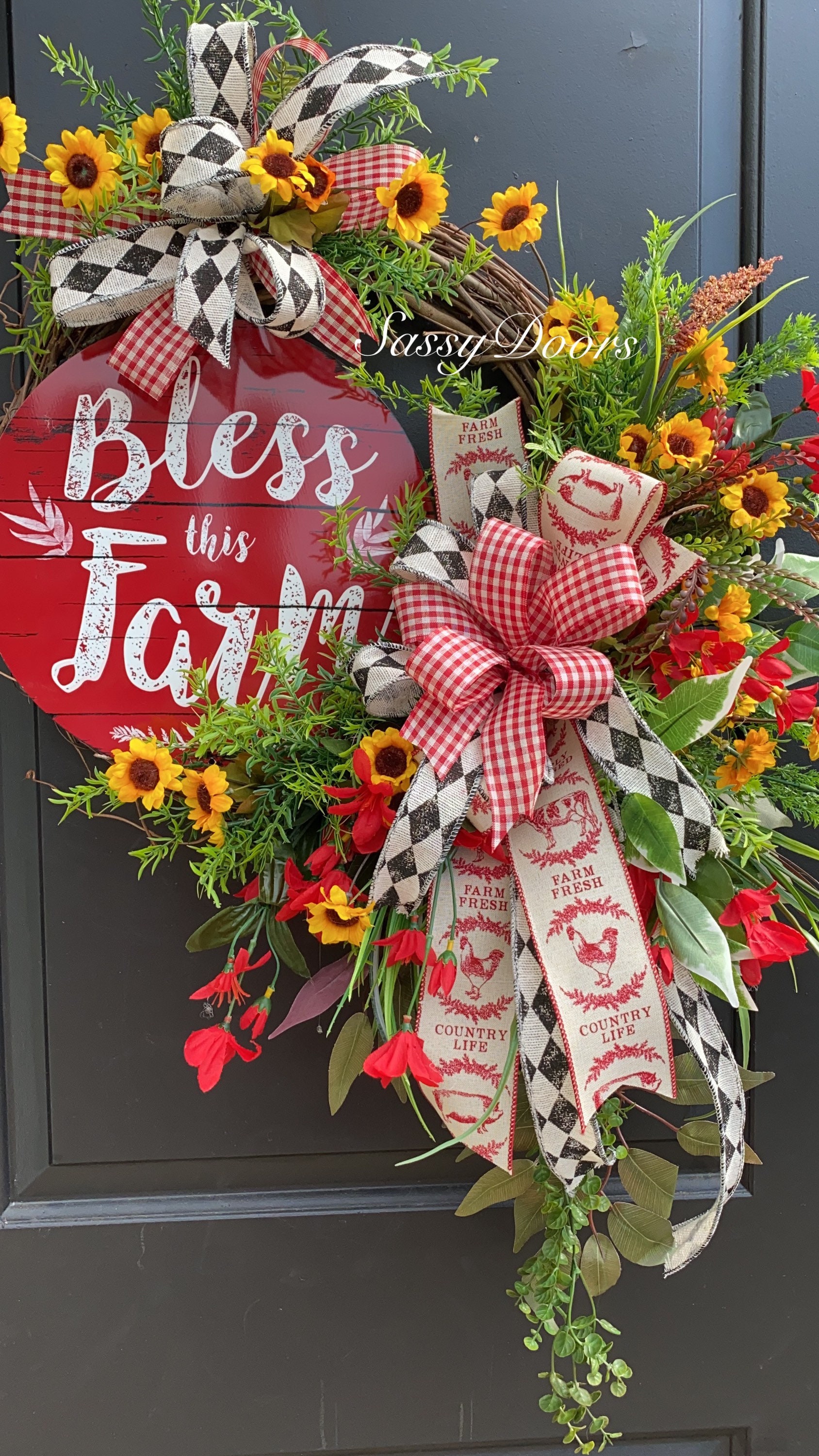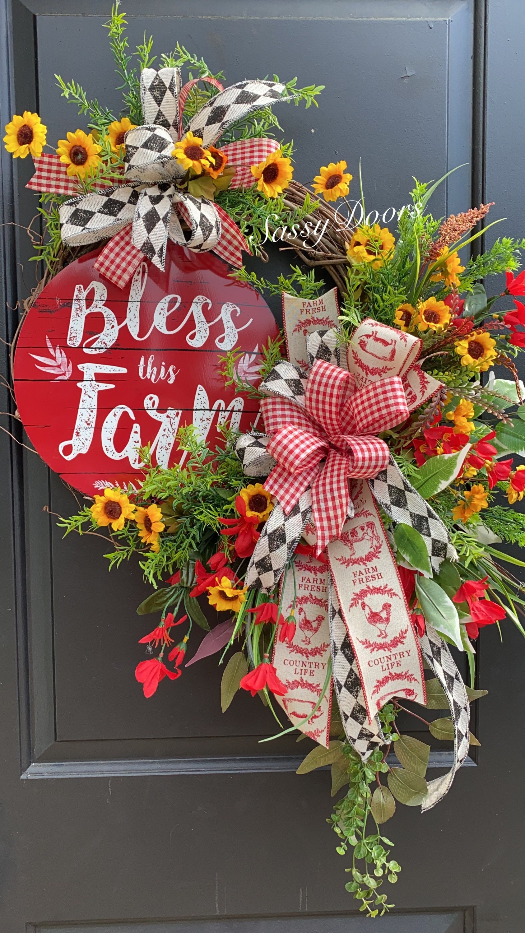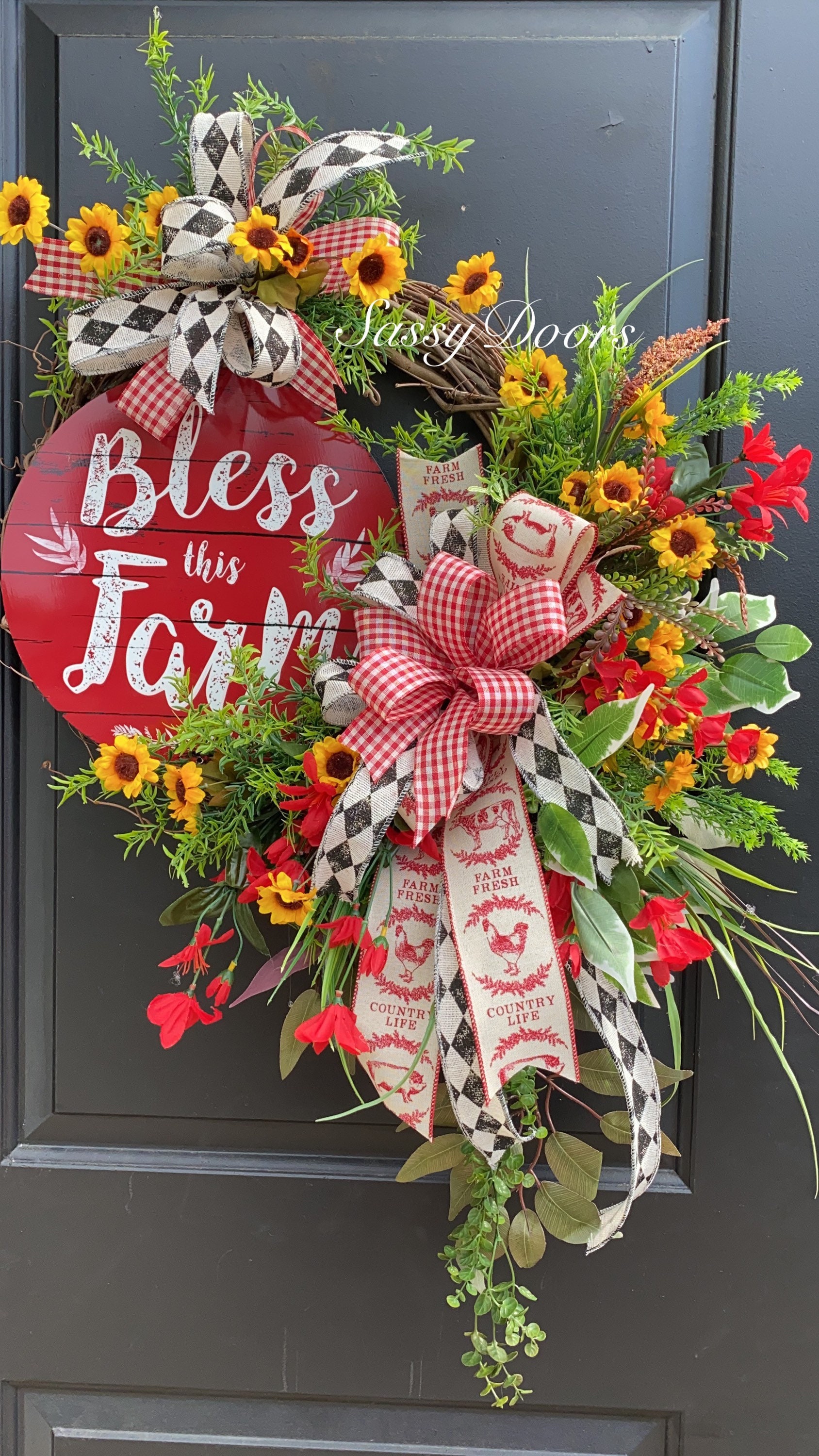 God Bless the American Farmer. This delightful farmhouse wreath is bursting with color and sure to delight your guest. Surrounded in lots of sunflowers, daisies, greenery and grasses, and so much more. Accented perfectly with a variety of ribbons and bows.